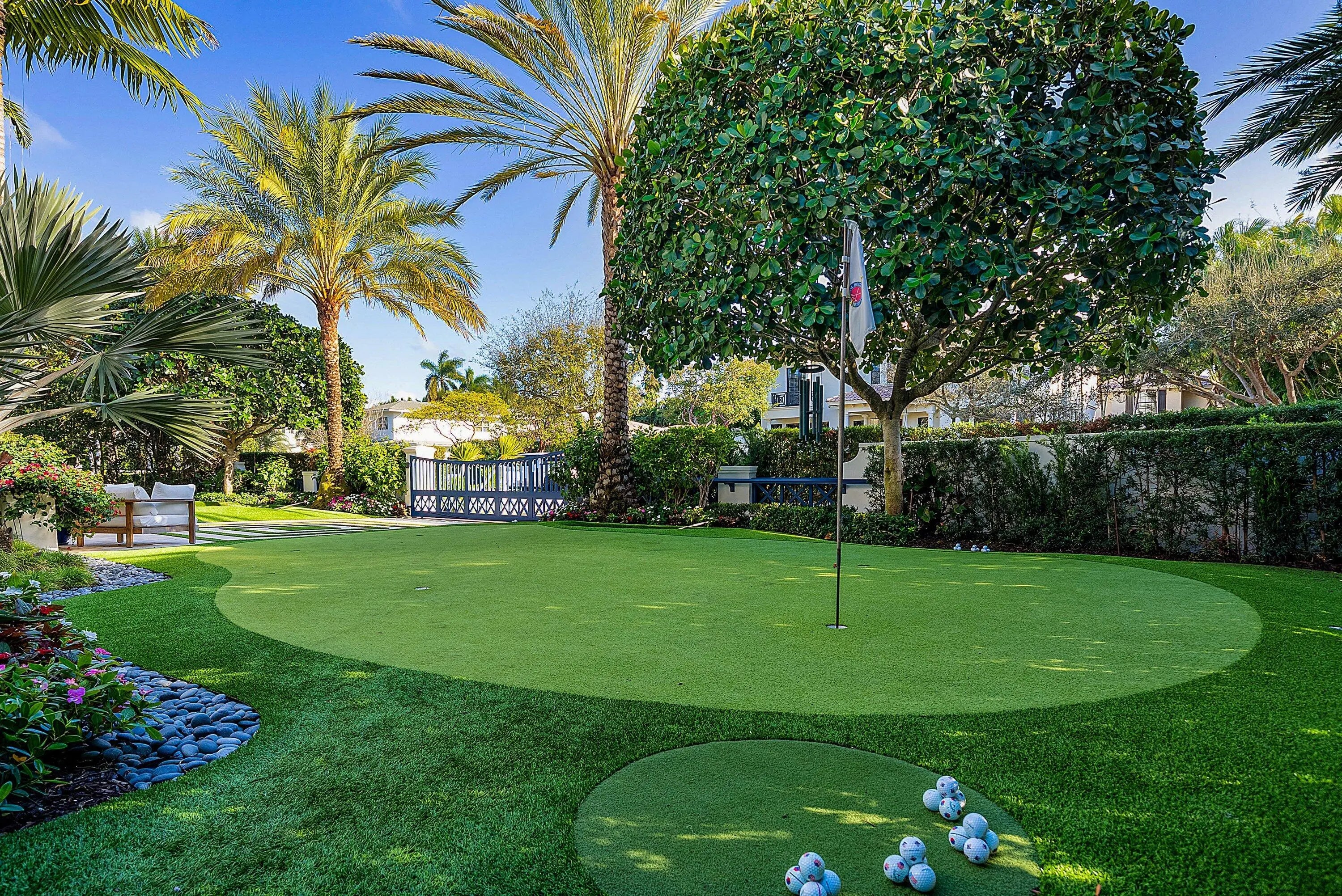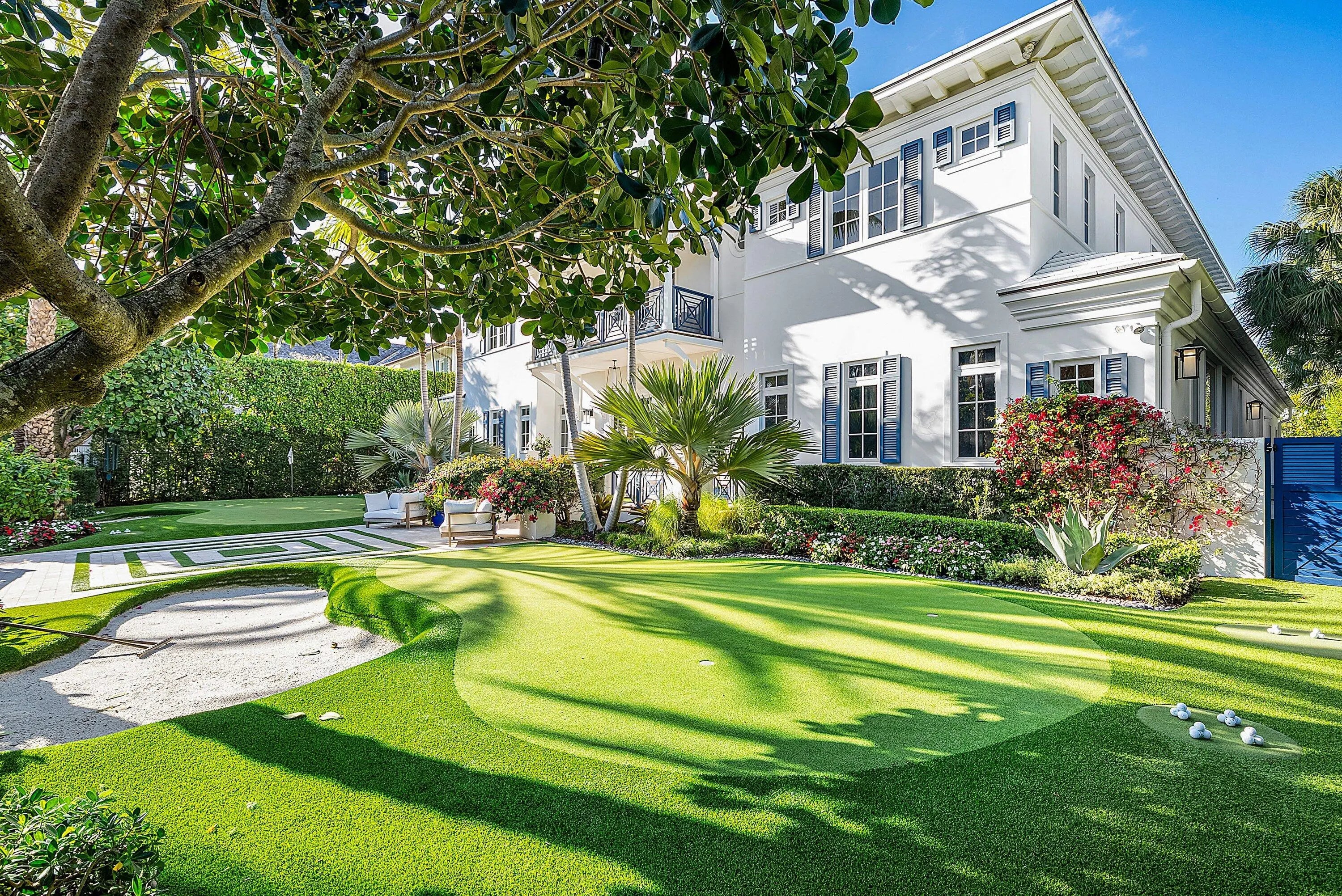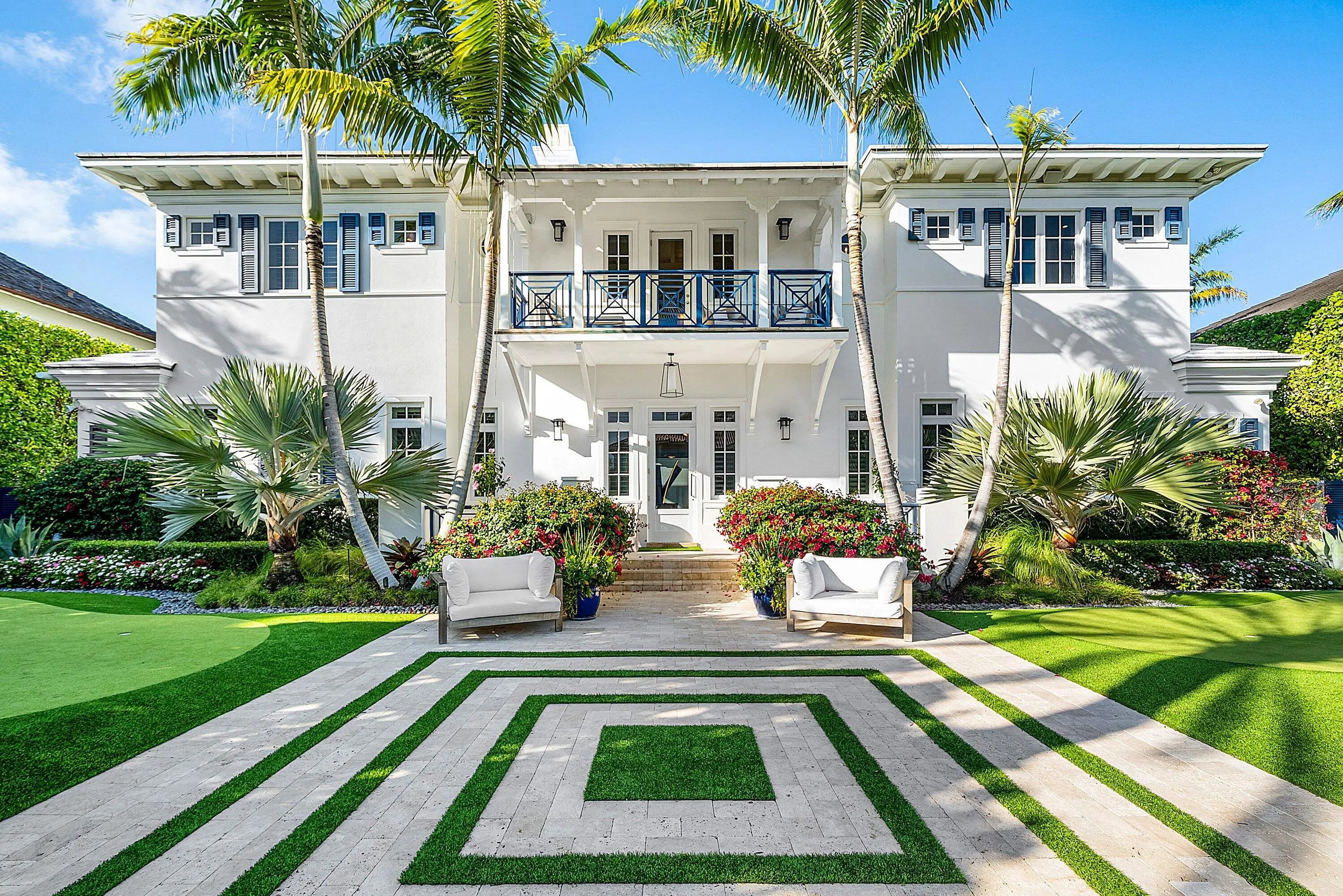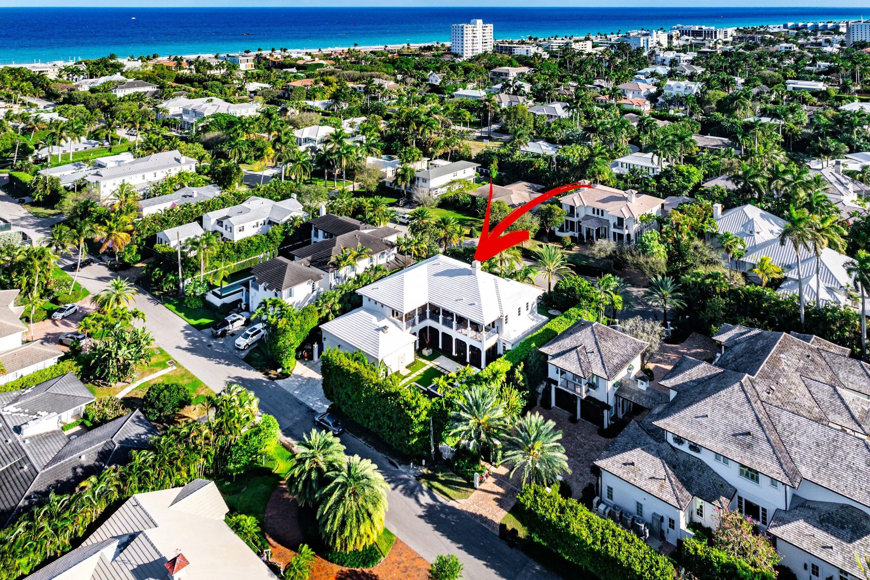Just one block from the Atlantic Ocean and a few blocks from Atlantic Avenue, this gated Bermuda Estate is set within one of Delray Beach's most coveted beachside enclaves. Privately positioned at the end of two quiet cul-de-sacs, the property offers rare dual street frontage with private ingress and egress, a gracious courtyard entry, and a separate rear motor court with a three-car garage. Designed by renowned Affinity Architects, the residence spans 7,716 total square feet and offers five bedrooms, a beautifully designed office featuring a custom built-in motorized desks and French doors that open to the veranda overlooking the resort-style pool. A private elevator provides convenient access to the upper level. Expansive covered loggias and a wraparound veranda create seamless indoor-outdoor living, complemented by soaring beamed ceilings and walls of floor-to-ceiling pocketing glass. The resort-style grounds feature a newly completed pool and spa with a professional stationary swim system, fire feature, putting green, and generous outdoor entertaining areas. The redesigned chef's kitchen showcases Neolith Estatuario surfaces, professional-grade appliances, and two fully equipped butler's kitchens with newly renovated bar and wine storage for effortless hosting. Additional highlights include a dedicated screening room with 7.1 surround sound, a fully independent guest suite with private entrance and security system, custom architectural loggia detailing, and meticulously landscaped grounds with mature trees and premium performance turf. The overall level of exceptional architectural details make this a rare opportunity for refined, walkable beachside living in the heart of Delray Beach.