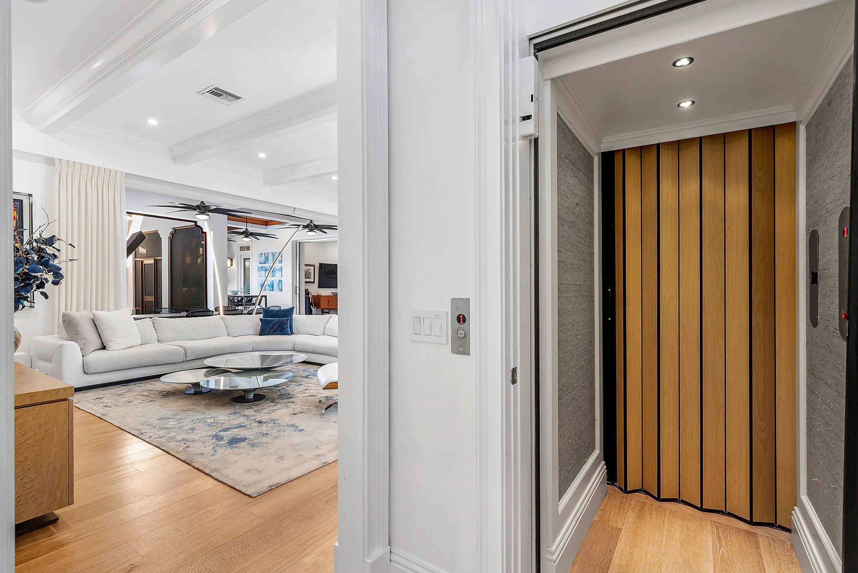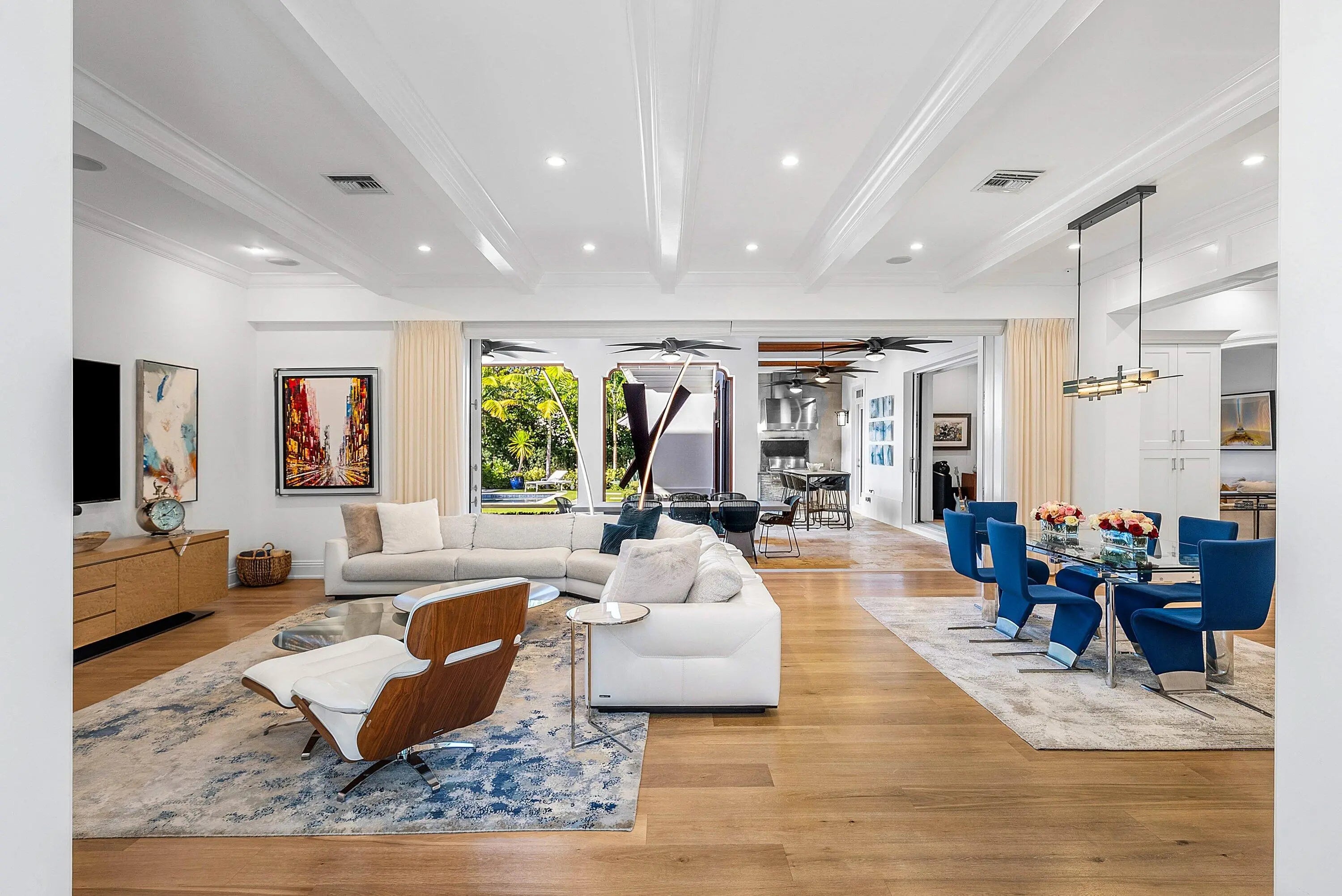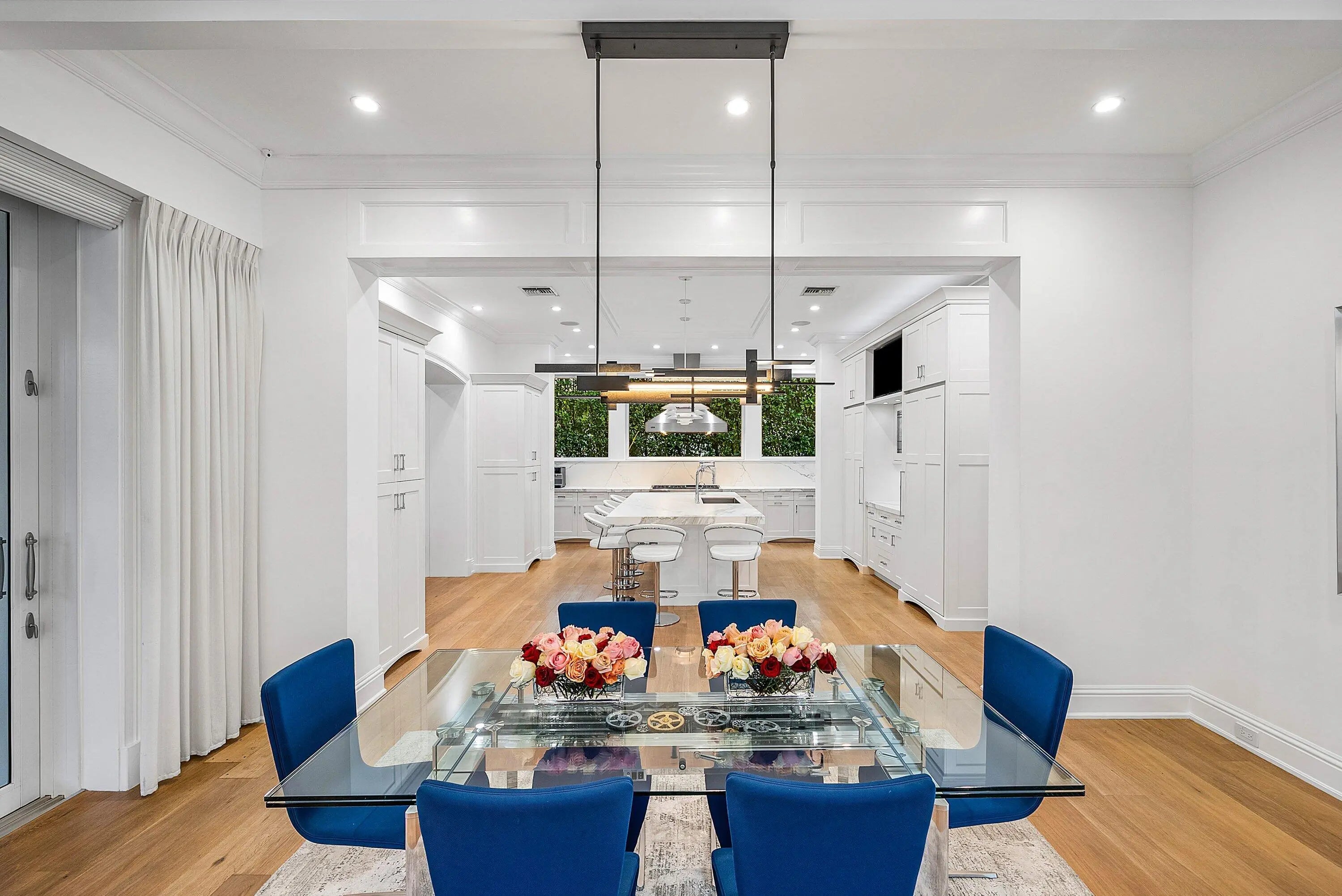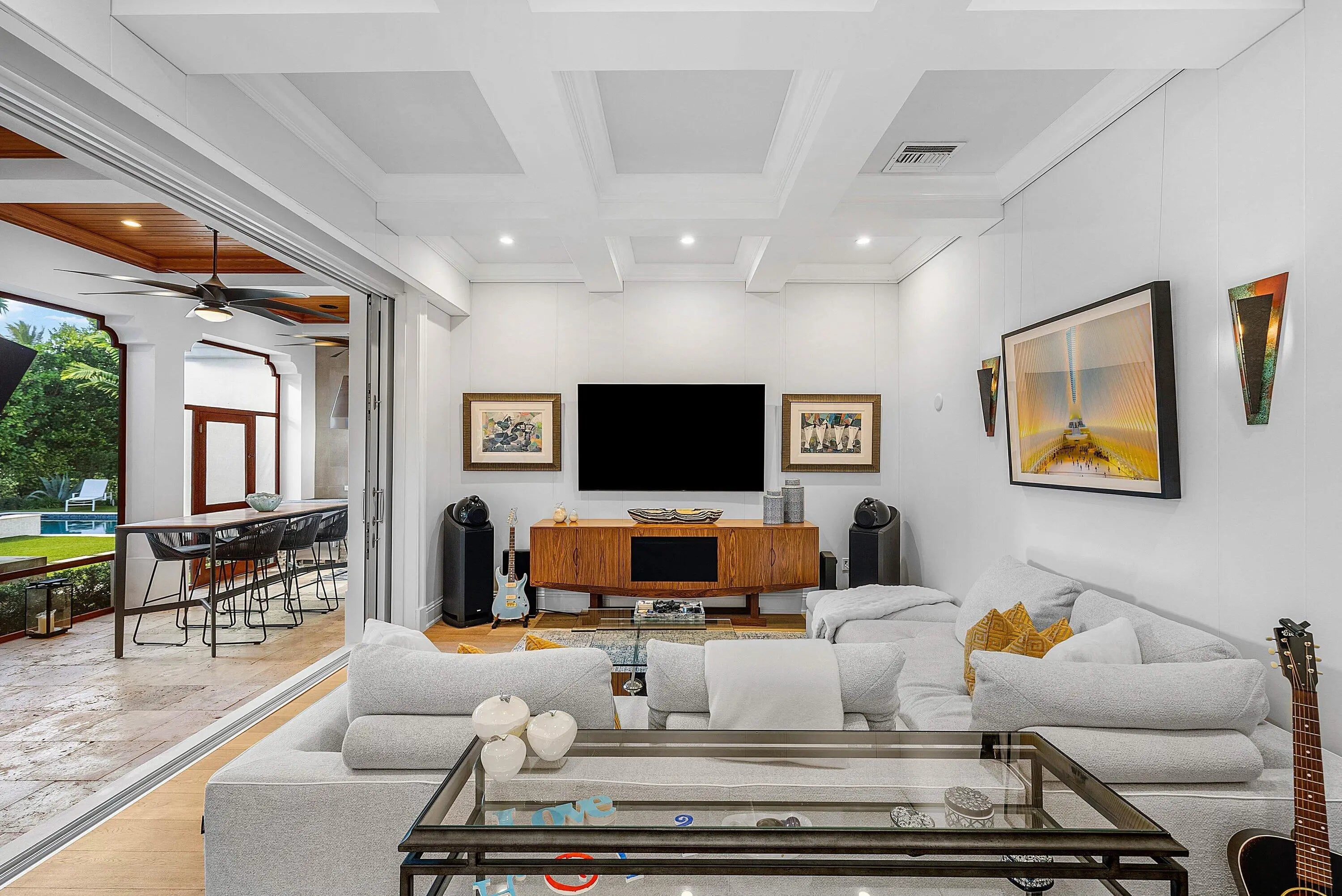 Just one block from the Atlantic Ocean and a few blocks from Atlantic Avenue, this gated Bermuda Estate is set within one of Delray Beach's most coveted beachside enclaves. Privately positioned at the end of two quiet cul-de-sacs, the property offers rare dual street frontage with private ingress and egress, a gracious courtyard entry, and a separate rear motor court with a three-car garage. Designed by renowned Affinity Architects, the residence spans 7,716 total square feet and offers five bedrooms, a beautifully designed office featuring a custom built-in motorized desks and French doors that open to the veranda overlooking the resort-style pool. A private elevator provides convenient access to the upper level. Expansive covered loggias and a wraparound veranda create seamless indoor-outdoor living, complemented by soaring beamed ceilings and walls of floor-to-ceiling pocketing glass. The resort-style grounds feature a newly completed pool and spa with a professional stationary swim system, fire feature, putting green, and generous outdoor entertaining areas. The redesigned chef's kitchen showcases Neolith Estatuario surfaces, professional-grade appliances, and two fully equipped butler's kitchens with newly renovated bar and wine storage for effortless hosting. Additional highlights include a dedicated screening room with 7.1 surround sound, a fully independent guest suite with private entrance and security system, custom architectural loggia detailing, and meticulously landscaped grounds with mature trees and premium performance turf. The overall level of exceptional architectural details make this a rare opportunity for refined, walkable beachside living in the heart of Delray Beach.