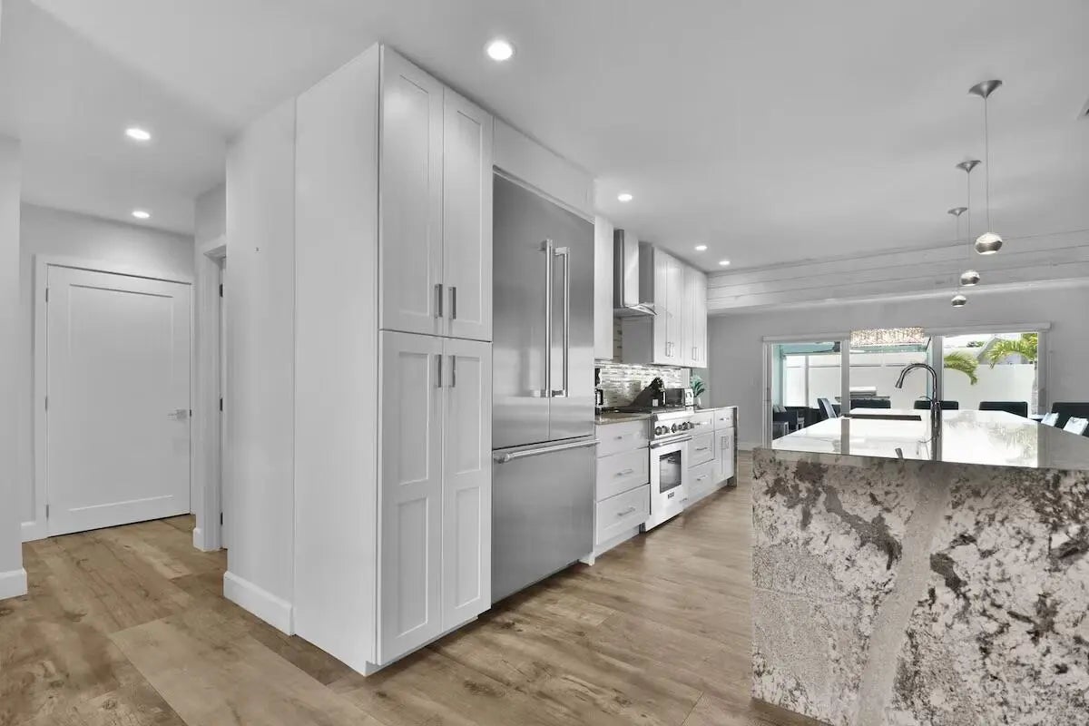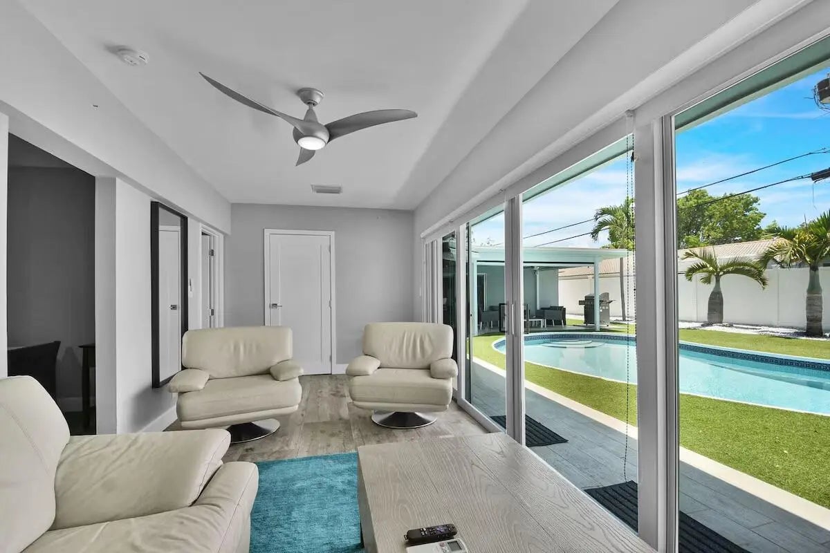 Fully upgraded 4-bedroom, 3-bathroom pool home located just minutes from Lauderdale-by-the-Sea and Fort Lauderdale Beach. This spacious triple split floor plan offers nearly 2,900 square feet of bright open living space, a modern kitchen, a heated pool, and a low-maintenance astroturf backyard designed for effortless outdoor living. The heart of the home is the beautifully renovated kitchen featuring a large center island with waterfall countertops, modern cabinetry, natural gas, and generous seating and prep space. The open layout flows effortlessly into the main living and dining areas, creating the perfect space for entertaining or relaxing with family and guests. The thoughtfully designed floor plan includes four spacious bedrooms, including a private primary suite with its own ensui bathroom and additional flex space ideal for a home office, lounge area, or reading nook. Step outside to a resort-style backyard built for year-round enjoyment. The private outdoor space features a heated pool, covered patio with ceiling fans, and a large backyard finished with modern low-maintenance astroturf that stays green year-round while minimizing upkeep. The outdoor grilling and seating areas create the perfect setting for entertaining. Additional highlights include updated finishes throughout, spacious living areas, a full laundry room with washer and dryer, and a layout that comfortably accommodates family and plenty of guests. Knoll Ridge is a walkable and welcoming Fort Lauderdale neighborhood. Quiet streets, mature trees, and a strong sense of pride make it easy to feel at home. Primarily made up of single-family homes, many with updated interiors and generous lot sizes, its walkable layout encourages everything from morning strolls to evening dog walks. Just half a mile to the local Publix Supermarket and Holy Cross Hospital, just minutes away. Quick access to 2 beaches. Just 2 miles to Lauderdale By The Sea Beach & 2 miles to the New Pompano Beach, fishing pier, new restaurants, and luxury waterfront dining. For travelers and commuters, you'll have easy access to US-1 and I-95. FLL Int'l Airport is 20 minutes away, Miami Int'l Airport is 45 minutes away, and Palm Beach International Airport is 40 minutes away.