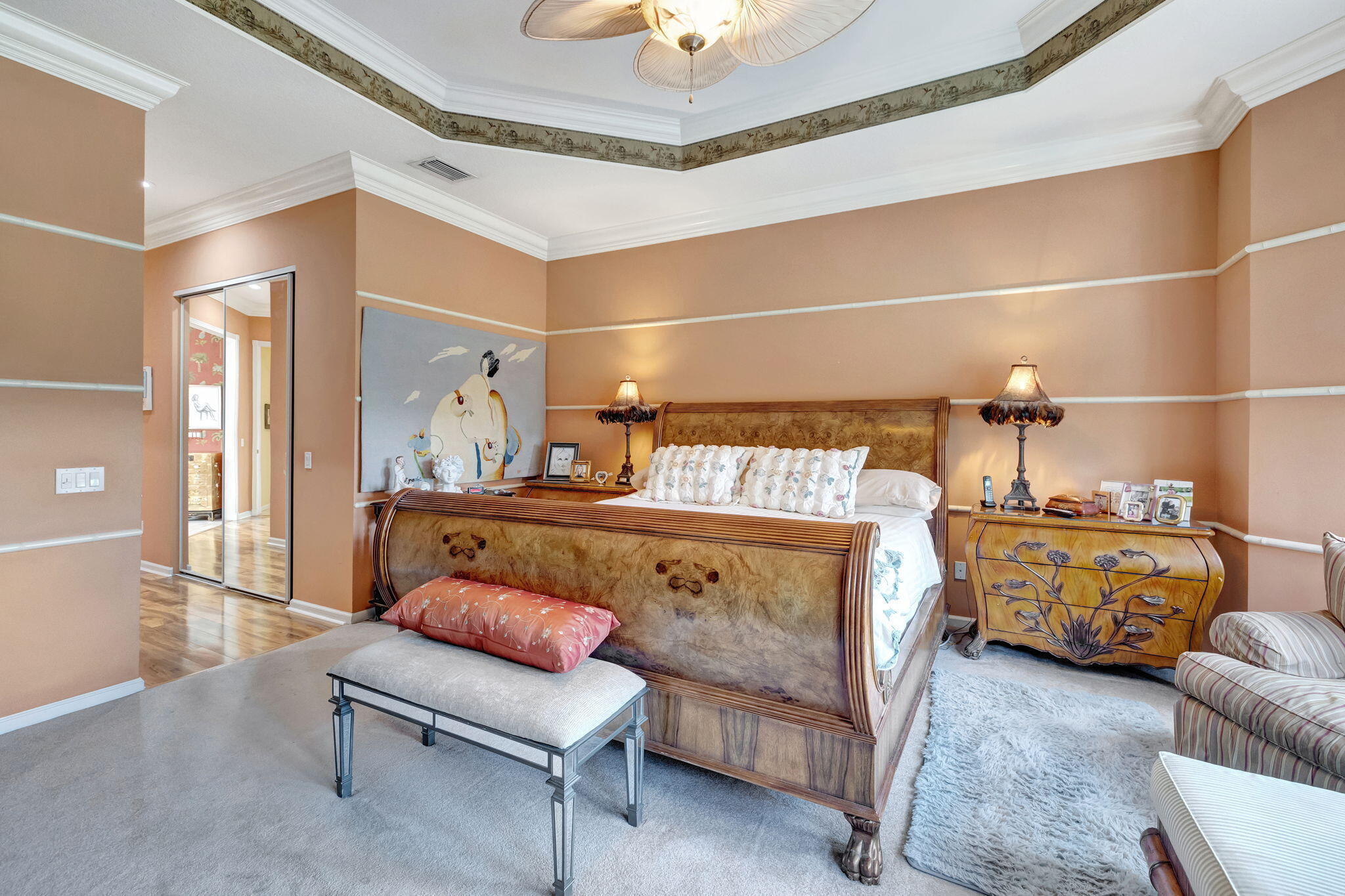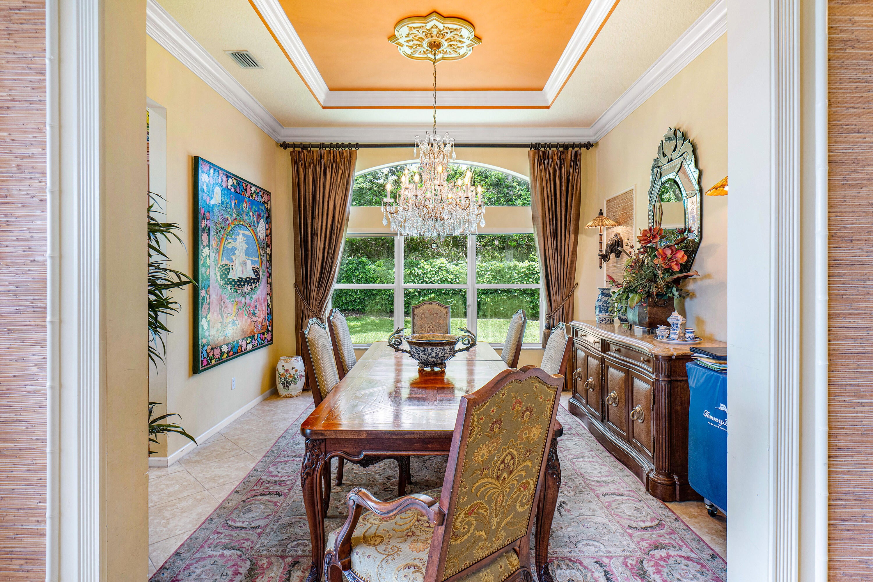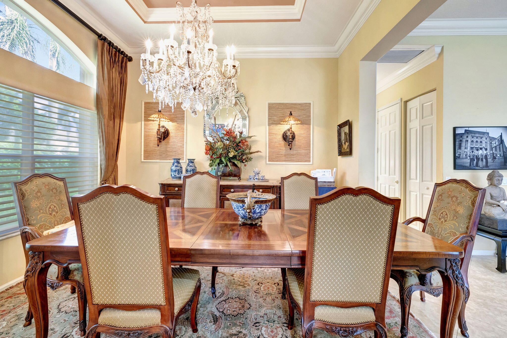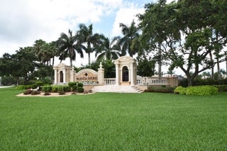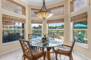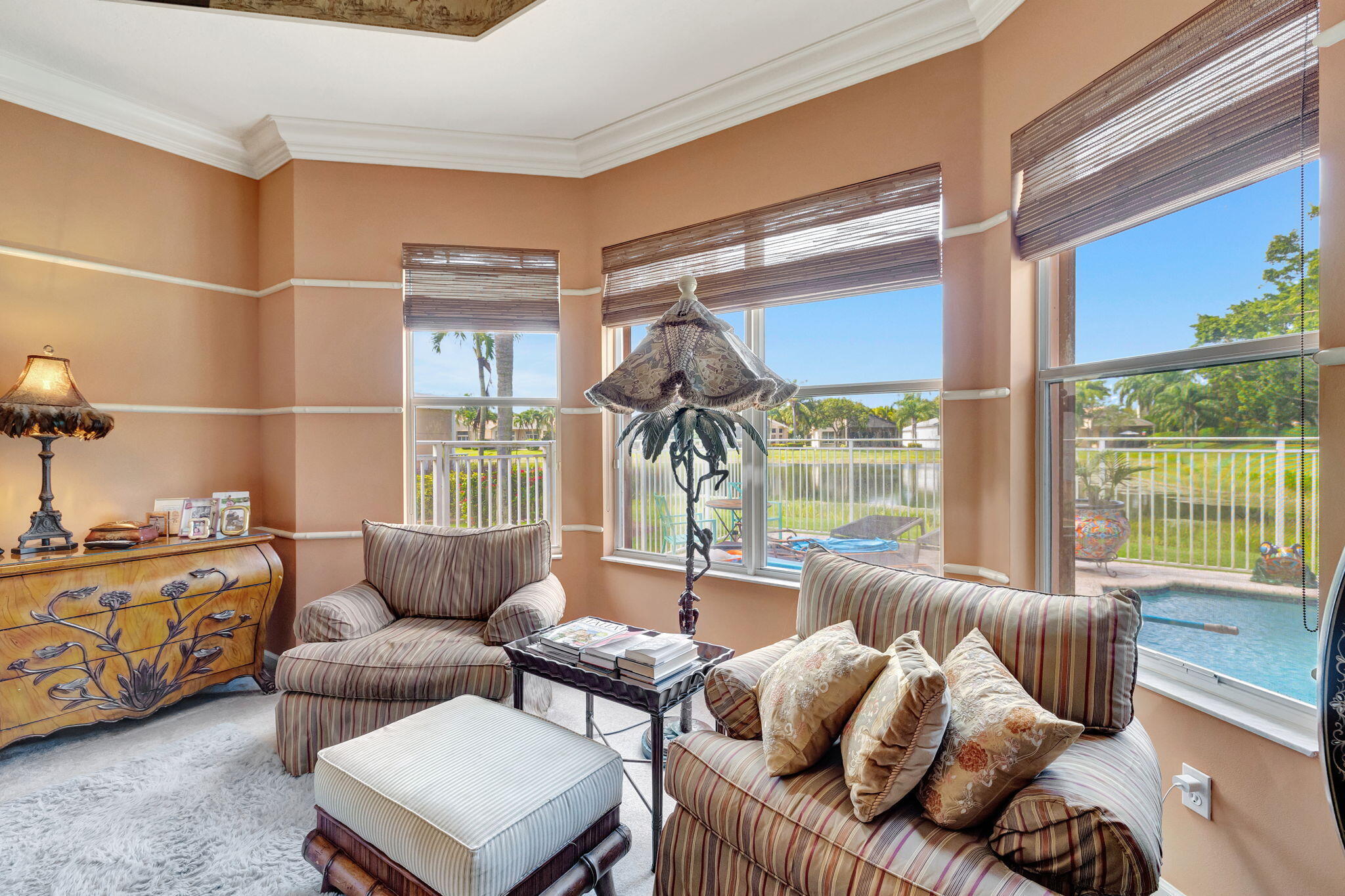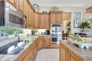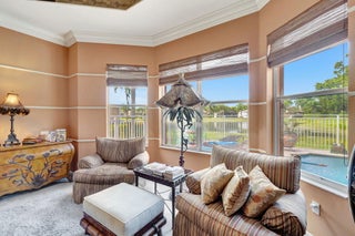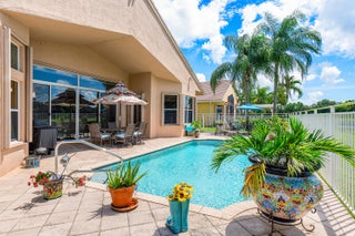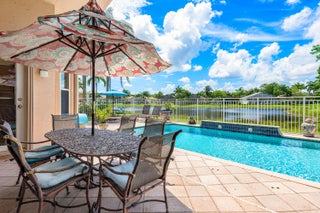 Experience luxurious Florida living in this exquisite Pamplona model home in Valencia Shores. As you enter through the private gate and walk along the courtyard, the oversized double glass doors welcome you into a grand living area with high ceilings, crown moldings, and natural light, all overlooking the serene lake, heated pool, and private patio. Perfectly designed for entertaining, this home features a spacious, comfortable kitchen with granite countertops, stainless steel appliances, a center island, double-door oven, and a Tiffany-style light fixture adding a touch of elegance.The open-concept floor plan includes a split bedroom layout for enhanced privacy, featuring 3 bedrooms, 2.5 baths, and an expansive, air-conditioned laundry room. With two AC units, accordion shutters, and a peaceful cul-de-sac location, this residence is tailored for both relaxation and enjoyment. The attention to detail from the hand-painted ceiling accents to the thoughtfully designed layout makes this home a stunning blend of comfort and sophistication, ready for you to move in and make it your own. Please note: excluded from the sale are 2 chandeliers: on the foyer and dining room area.