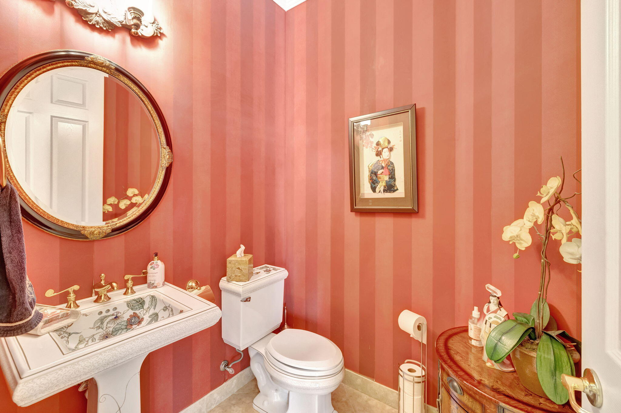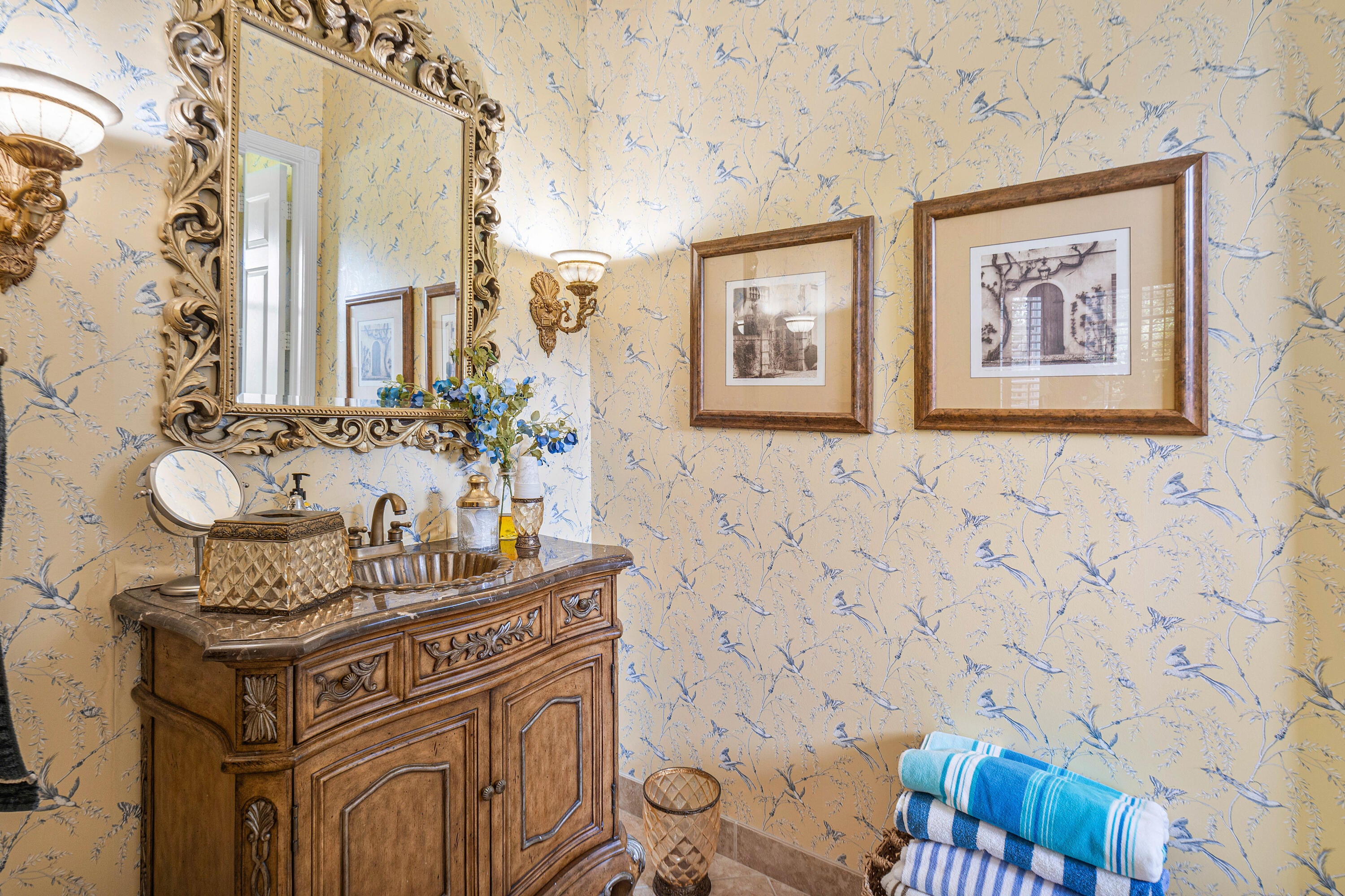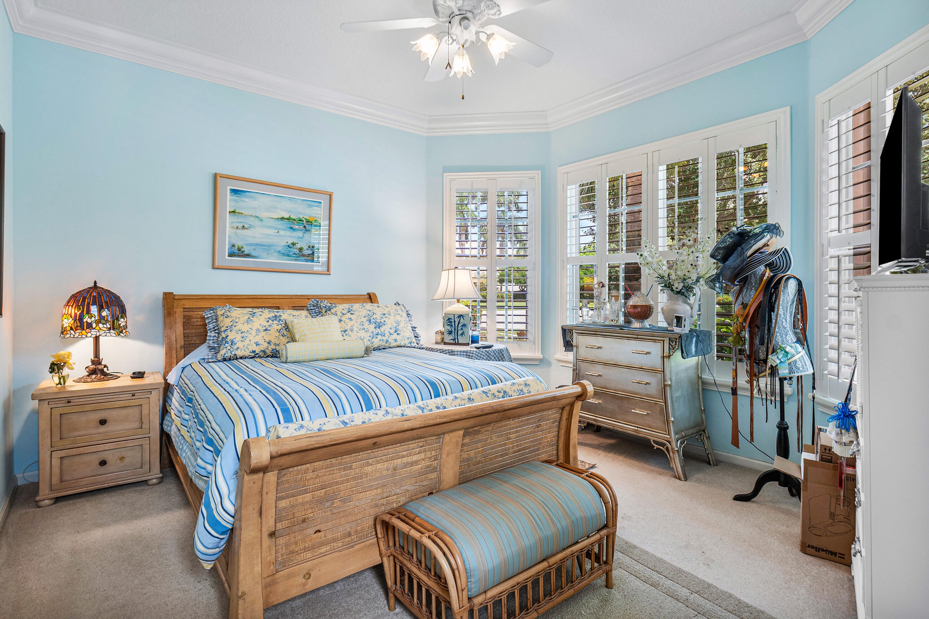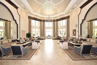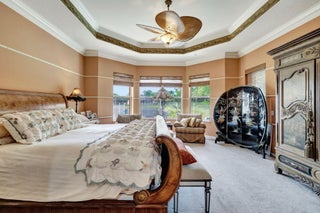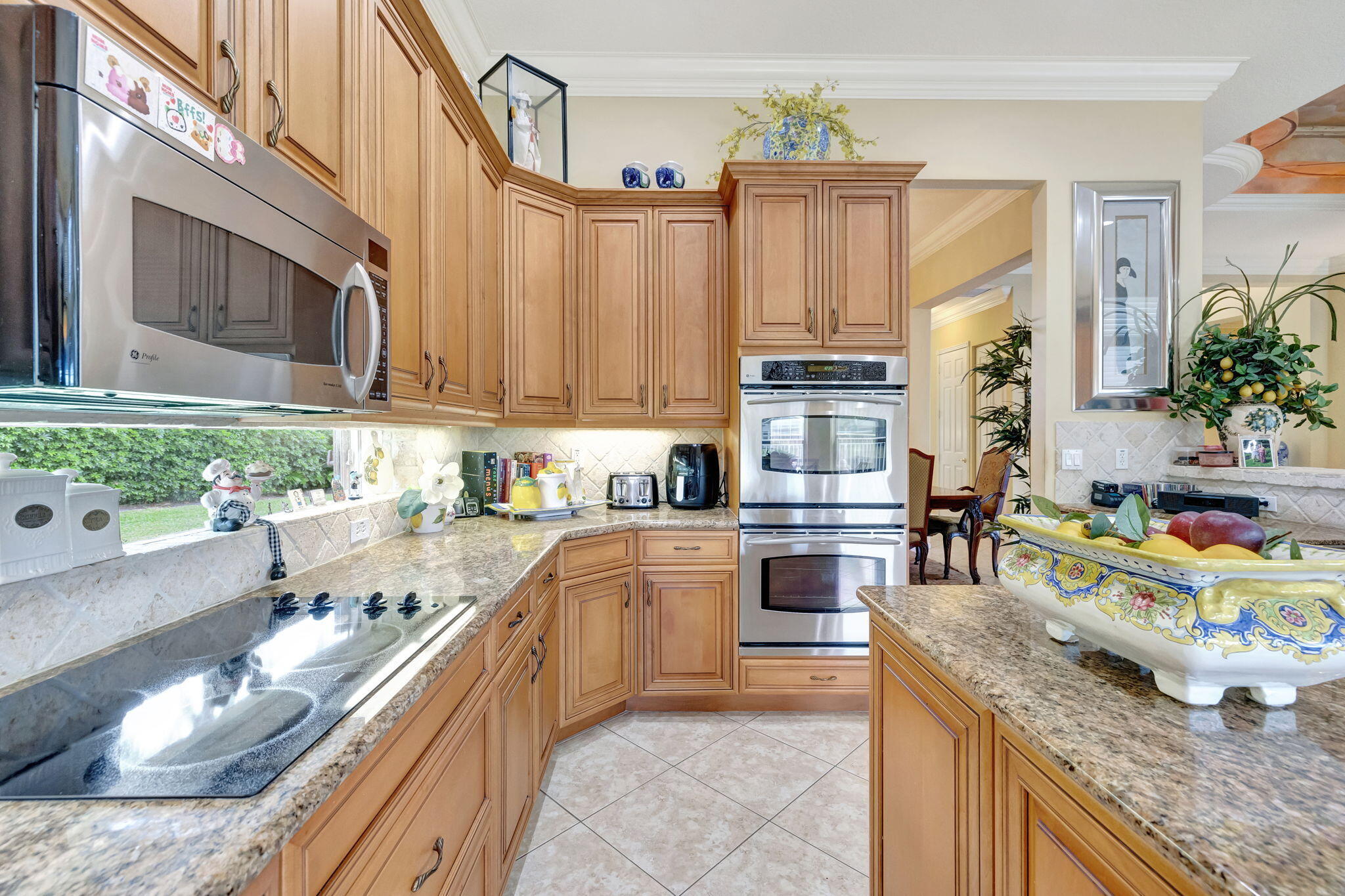 Experience luxurious Florida living in this exquisite Pamplona model home in Valencia Shores. As you enter through the private gate and walk along the courtyard, the oversized double glass doors welcome you into a grand living area with high ceilings, crown moldings, and natural light, all overlooking the serene lake, heated pool, and private patio. Perfectly designed for entertaining, this home features a spacious, comfortable kitchen with granite countertops, stainless steel appliances, a center island, double-door oven, and a Tiffany-style light fixture adding a touch of elegance.The open-concept floor plan includes a split bedroom layout for enhanced privacy, featuring 3 bedrooms, 2.5 baths, and an expansive, air-conditioned laundry room. With two AC units, accordion shutters, and a peaceful cul-de-sac location, this residence is tailored for both relaxation and enjoyment. The attention to detail from the hand-painted ceiling accents to the thoughtfully designed layout makes this home a stunning blend of comfort and sophistication, ready for you to move in and make it your own. Please note: excluded from the sale are 2 chandeliers: on the foyer and dining room area.