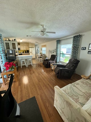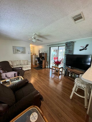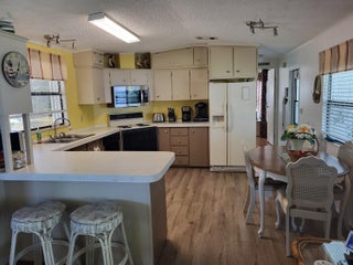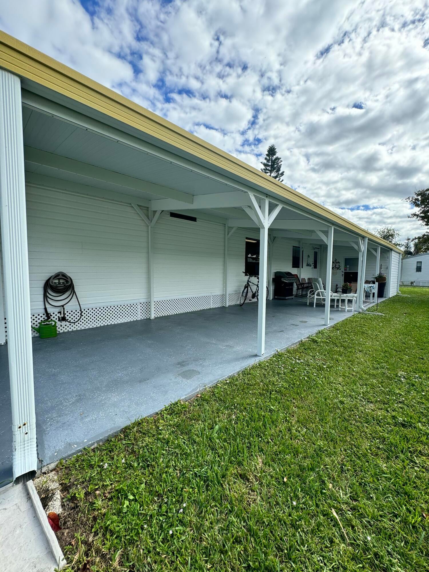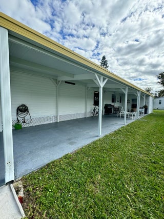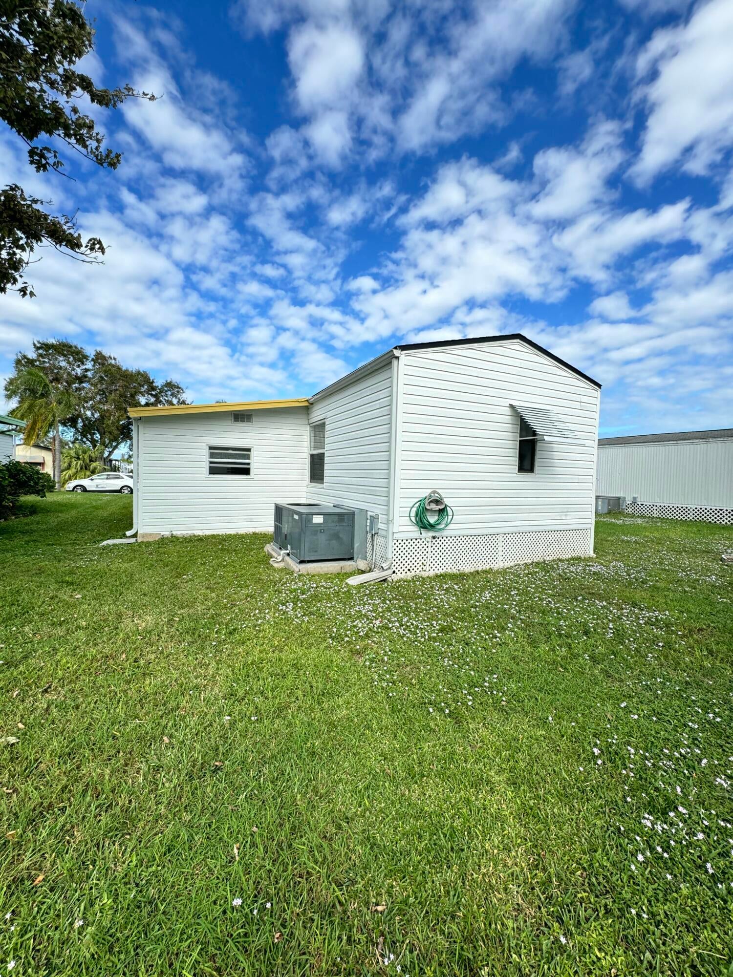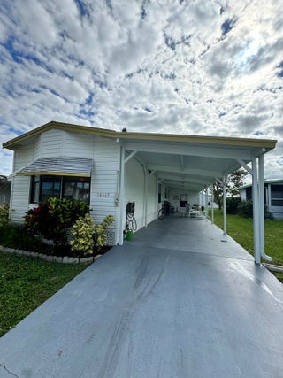 Immaculate 2 bedroom 2 bath home located in the desirable 55 + Spanish Lakes Fairways community. Split floor plan. Home has laminate floors throughout. NO CARPET. Open kitchen, screened in patio with windows off living room. Bathrooms have new vanities and toilets. Large carport space and large 8 X11 shed. Home is being sold FURNISHED. A/C 2015, Water heater is 2022. Washer machine is 2017. Appliances are in great shape. Amenities include Private 18 hole golf course, 2 pools, pickle ball, tennis, shuffleboard, bocce, gym, library, wood workshop and much more. Low Lot Rent. MUST SEE!