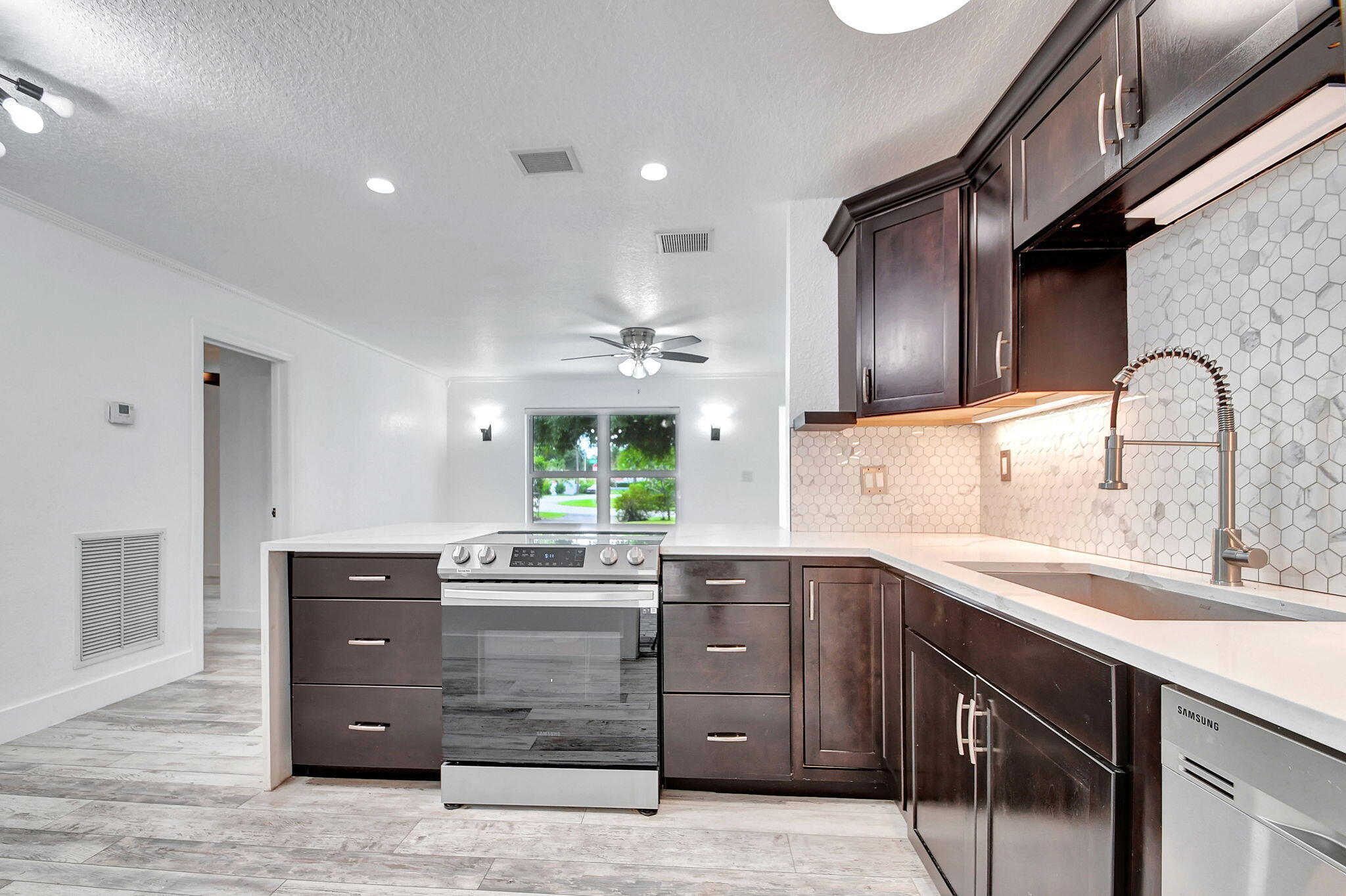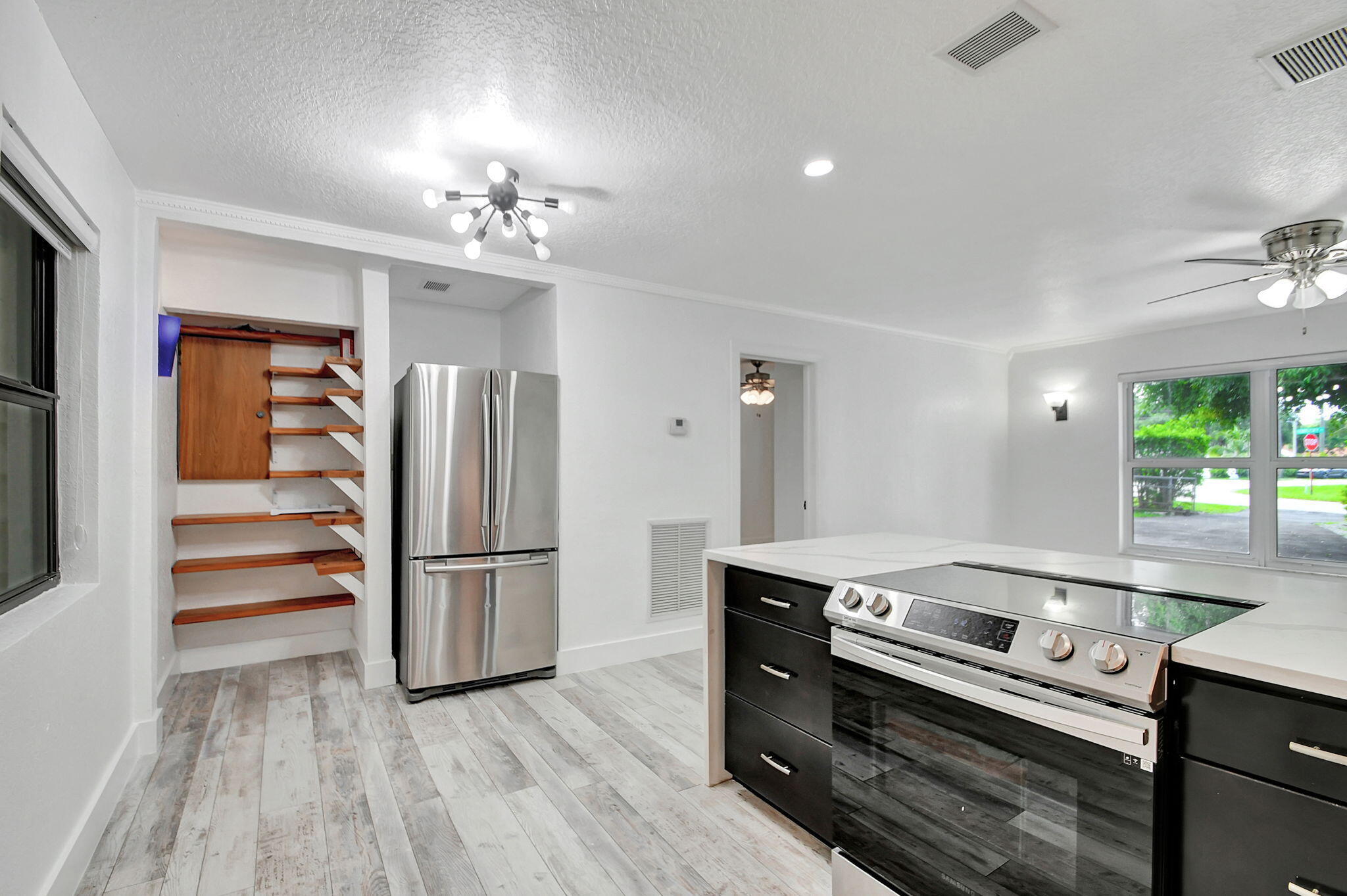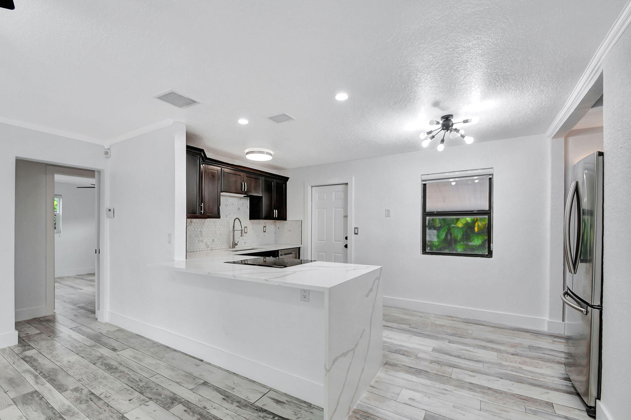 Located minutes to Downtown West Palm Beach, This Turnkey Home is Ideally positioned on an Expansive Corner Lot adorned with mature landscaping and spacious 180-degree driveway. Step inside to find an inviting open-concept layout seamlessly connecting the kitchen, dining, and family room areas. The kitchen is adorned with Calcutta Quartz Countertops and Modern Appliances, creating an ideal setting for culinary creations and gatherings. This thoughtfully designed home boasts a Split-Bedroom floor-plan featuring two en-suites alongside an additional bedroom and bathroom. Outside, a screened-in patio offers a tranquil retreat overlooking the expansive backyard, complete with a sizable pool, lush green spaces, and an outdoor showera''an entertainer's dream.Recent updates include a newHVAC system in 2021, a pool heater added in 2023, as well as refreshed doors, trim, kitchen fixtures, laundry facilities, and upgraded appliances. The roof and partial impact windows were also updated in 2017, ensuring both style and efficiency throughout the home.