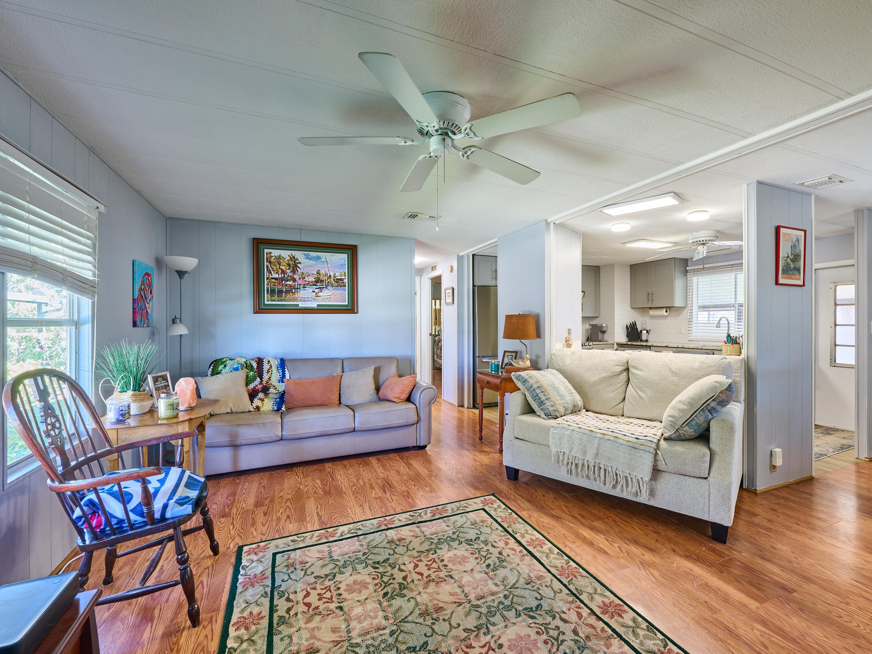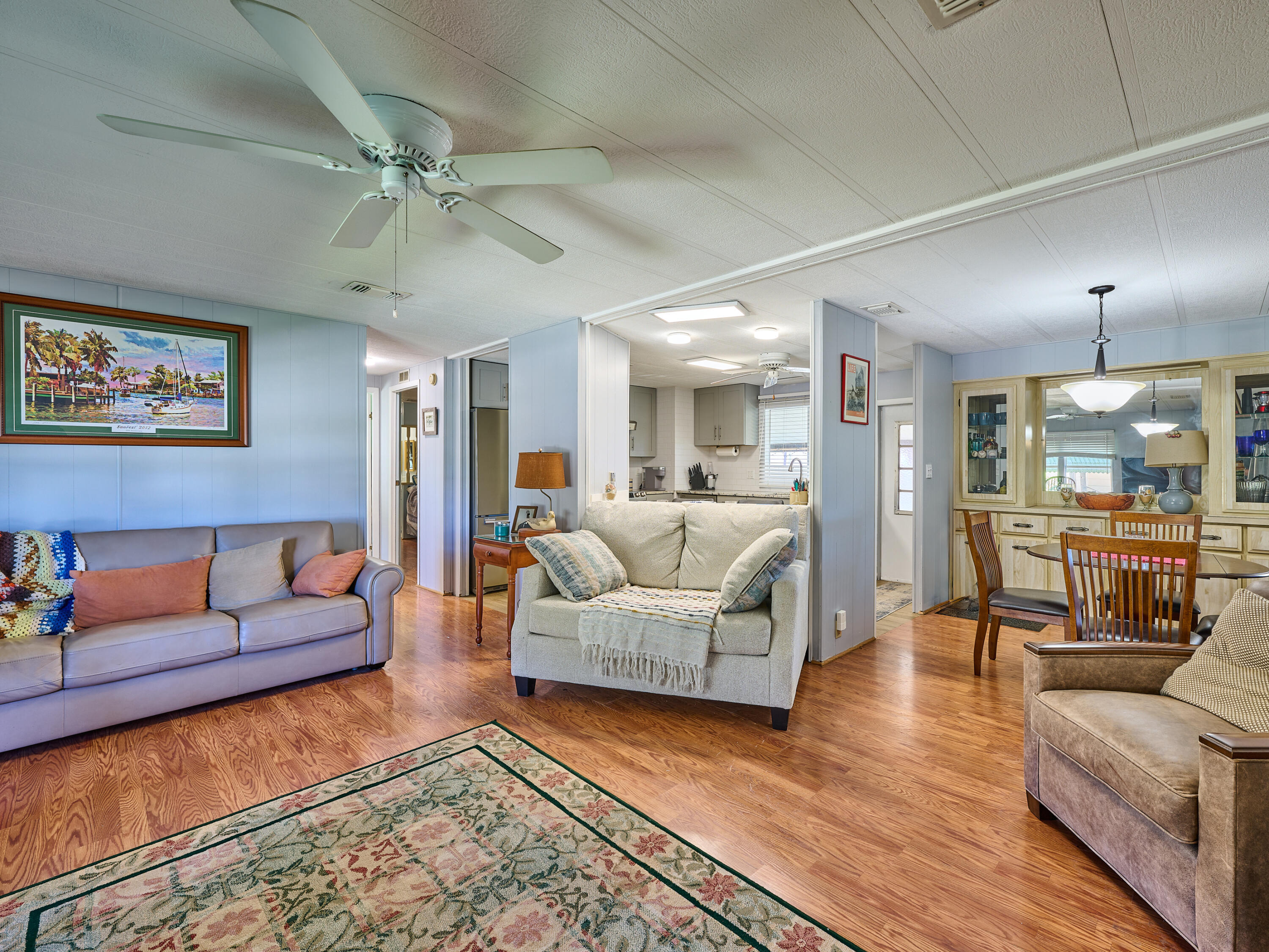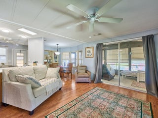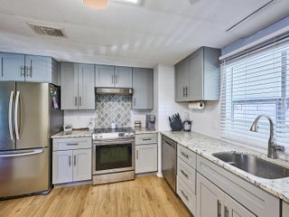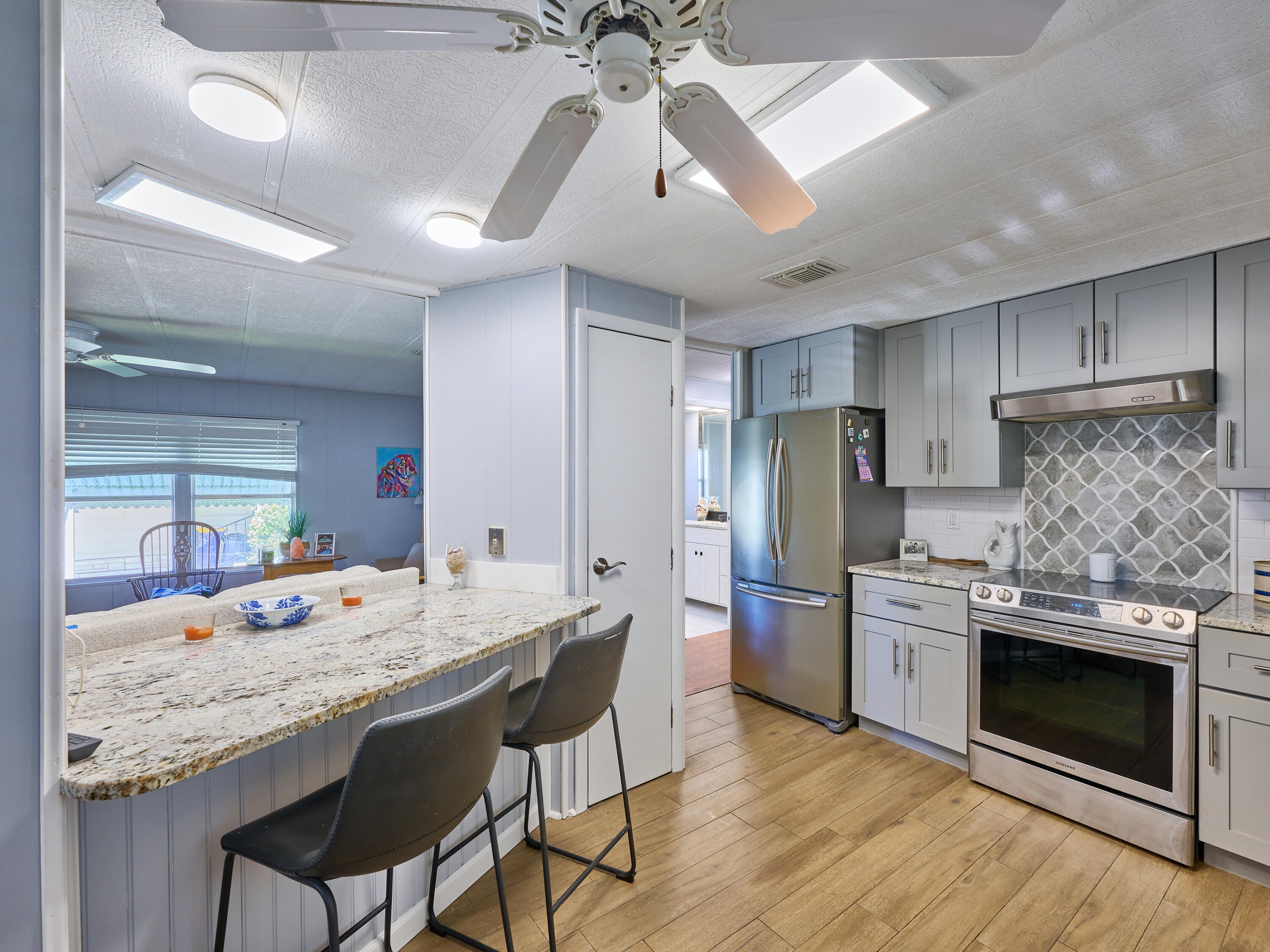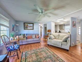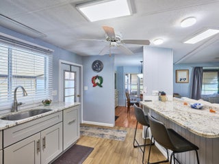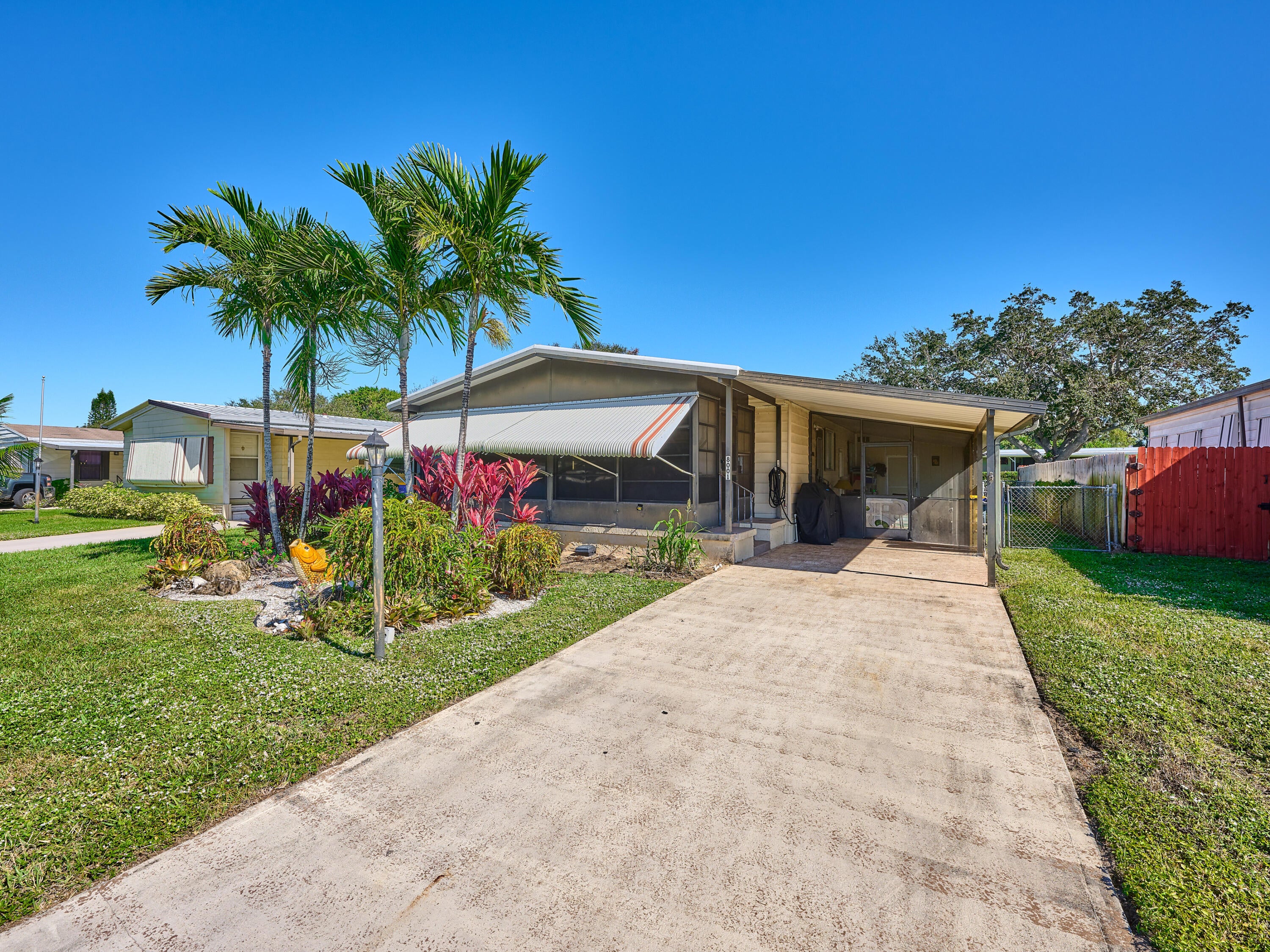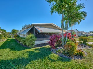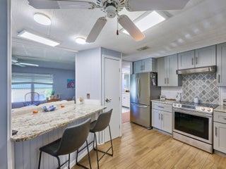 2 Bedr/2 Bath Manuf Home in Cambridge 55+ Community in Hobe Sound. Stunning, New Kitchen 2021 w light grey shaker cabinets, granite countertops, stainless steel appliances, undermount sink, new flooring, & LED lighting. The kitchen was opened up to the living room w a convenient breakfast bar. Freshly painted throughout w tropical hues so popular in FL. Redone guest bathroom in 2023 w tile shower, frameless shower enclosure, new tile floor, vanity, toilet & granite counter. The Master bedrm is large w ensuite bath. This bath awaits your personal upgrades. The 2nd bedrm is a good size. Laminate flooring throughout. THIS HOME HAS 2 LANAIS for extra living space. Doggie door to fenced backyard. New AMS Aluminum roof 2021 w lifetime warranty. New A/C ductwork! YOU OWN THE LAND- ALL PETS WELCO