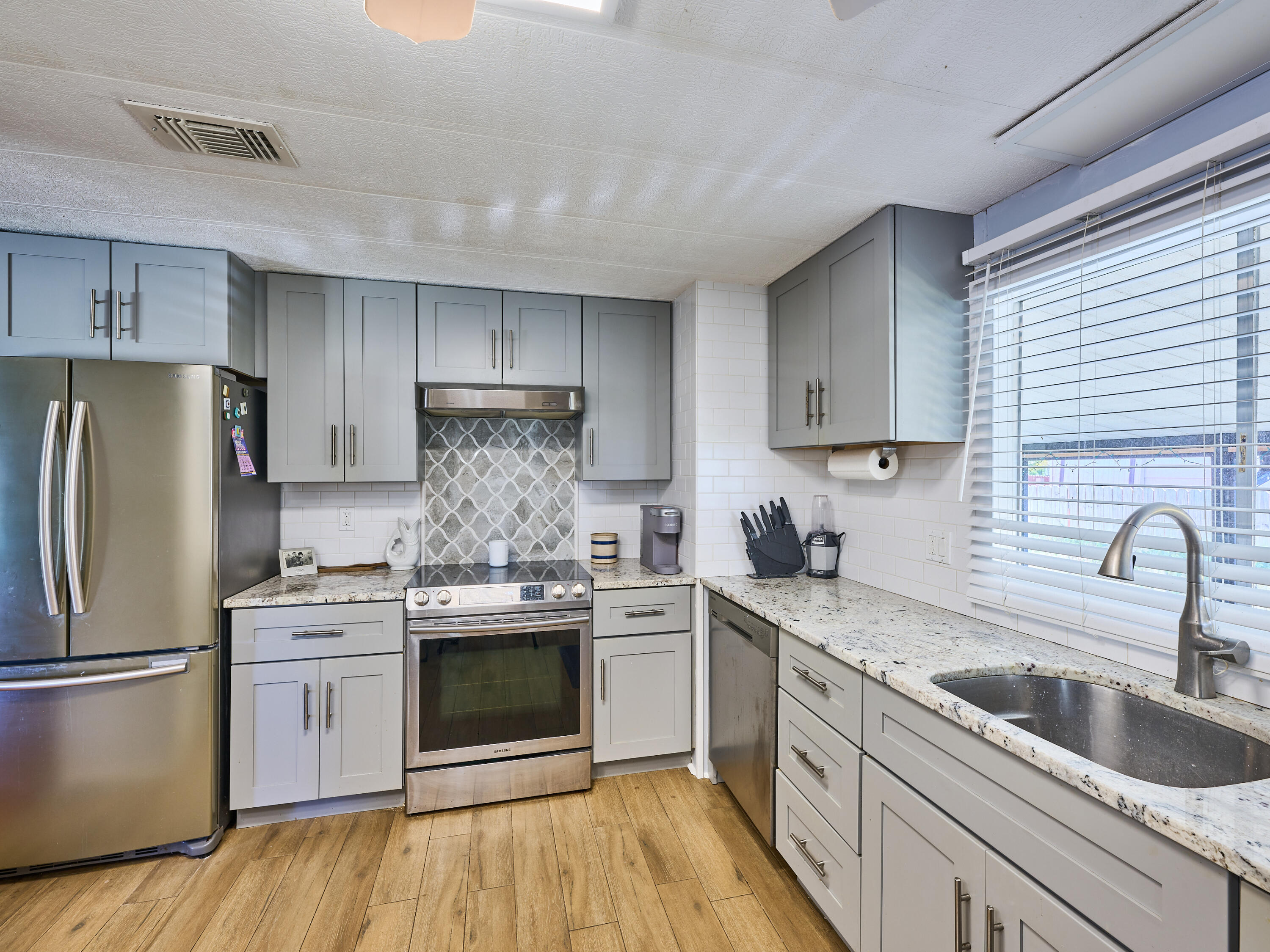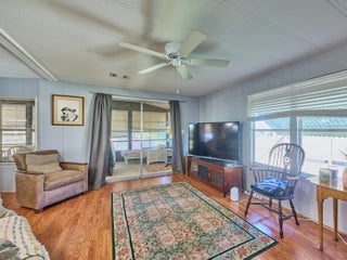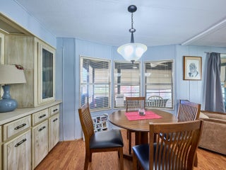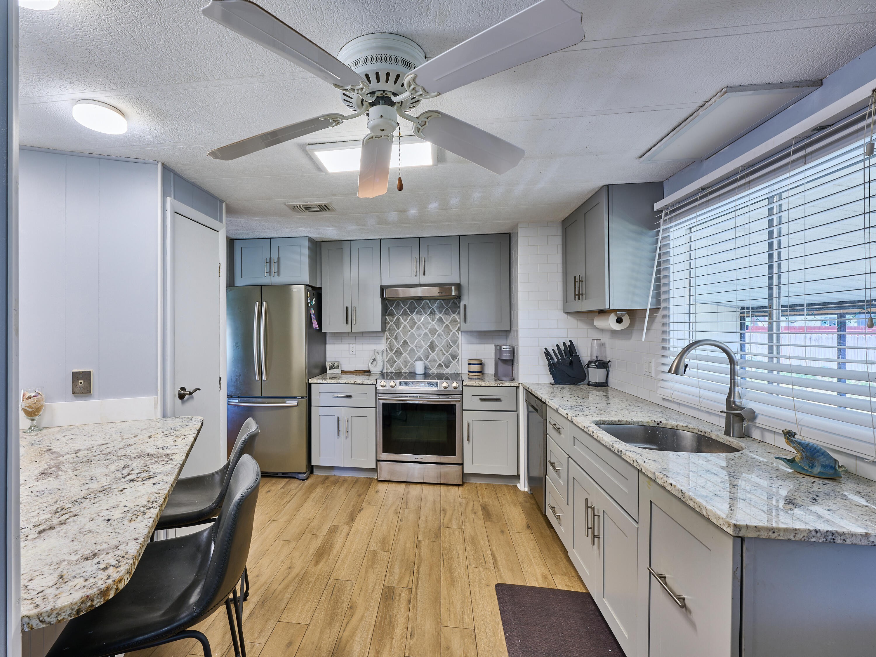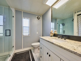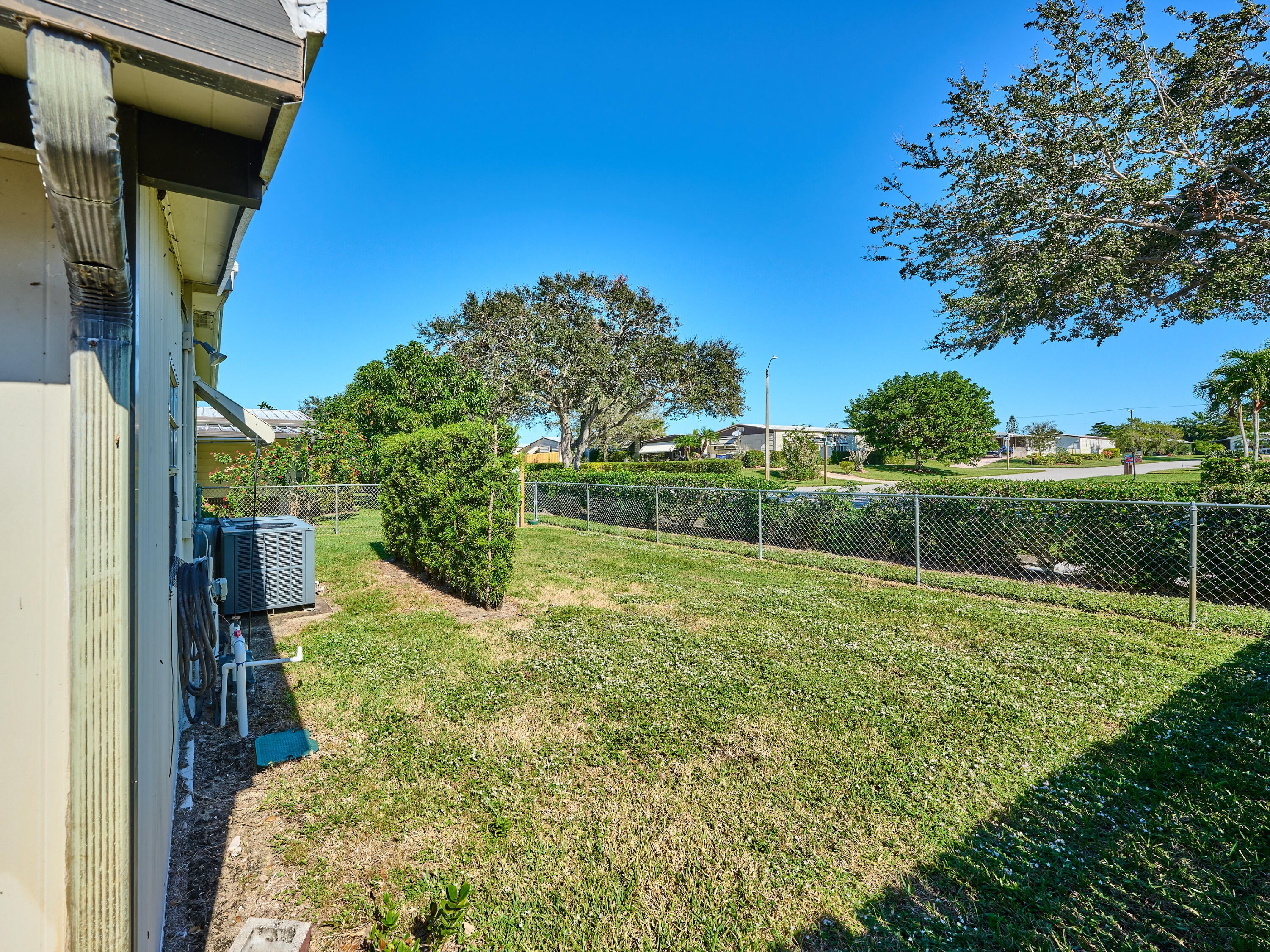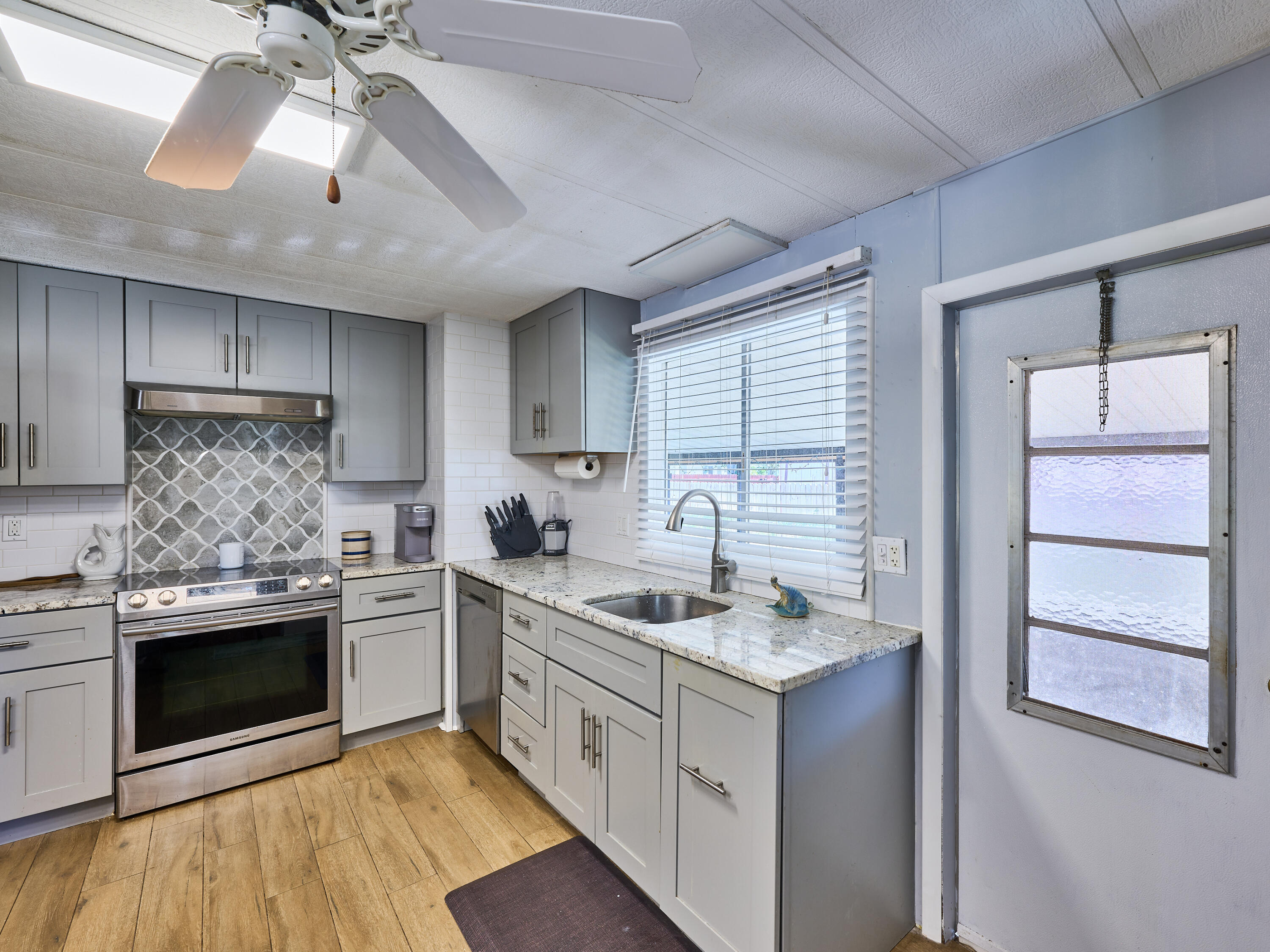 2 Bedr/2 Bath Manuf Home in Cambridge 55+ Community in Hobe Sound. Stunning, New Kitchen 2021 w light grey shaker cabinets, granite countertops, stainless steel appliances, undermount sink, new flooring, & LED lighting. The kitchen was opened up to the living room w a convenient breakfast bar. Freshly painted throughout w tropical hues so popular in FL. Redone guest bathroom in 2023 w tile shower, frameless shower enclosure, new tile floor, vanity, toilet & granite counter. The Master bedrm is large w ensuite bath. This bath awaits your personal upgrades. The 2nd bedrm is a good size. Laminate flooring throughout. THIS HOME HAS 2 LANAIS for extra living space. Doggie door to fenced backyard. New AMS Aluminum roof 2021 w lifetime warranty. New A/C ductwork! YOU OWN THE LAND- ALL PETS WELCO