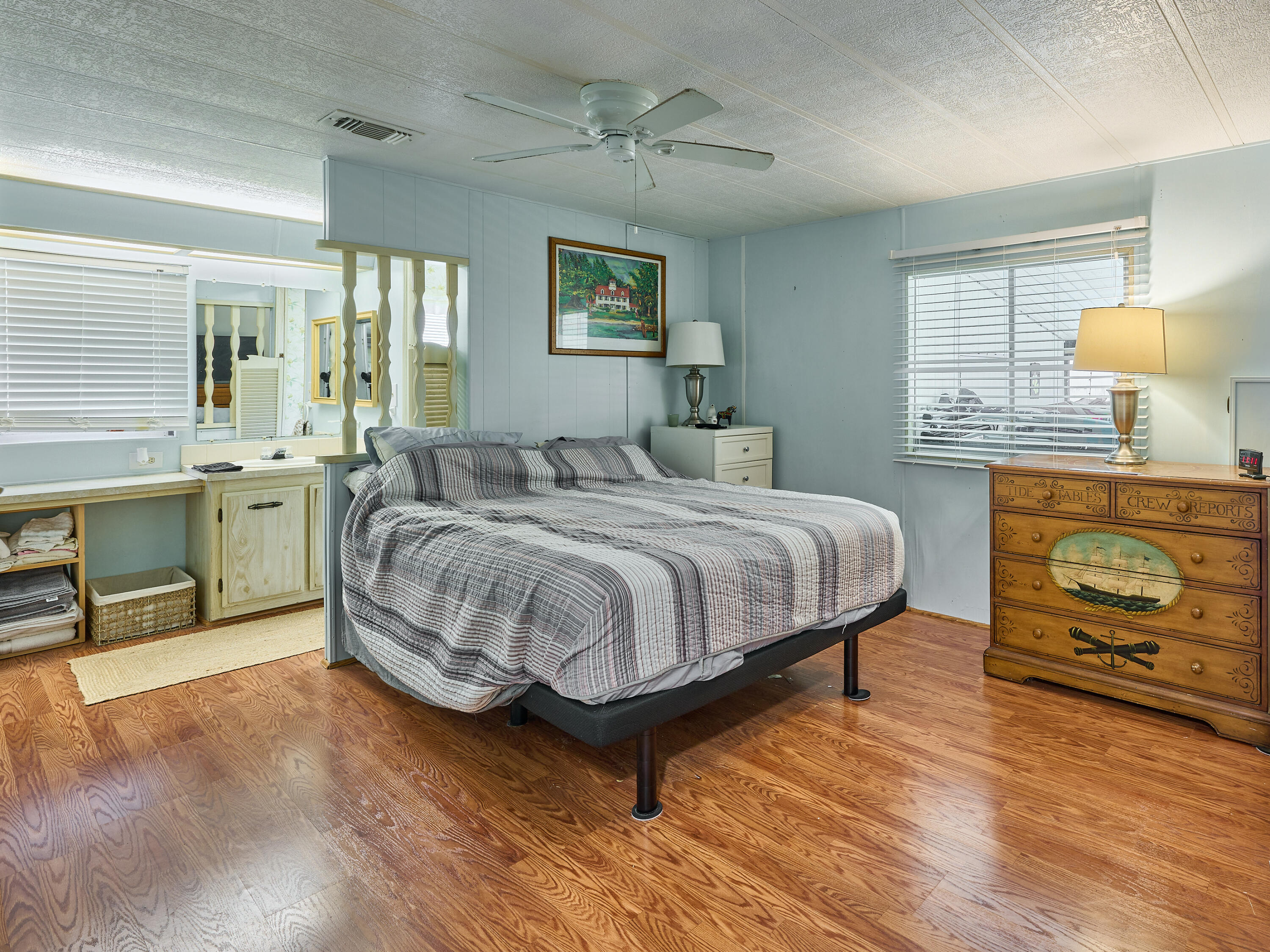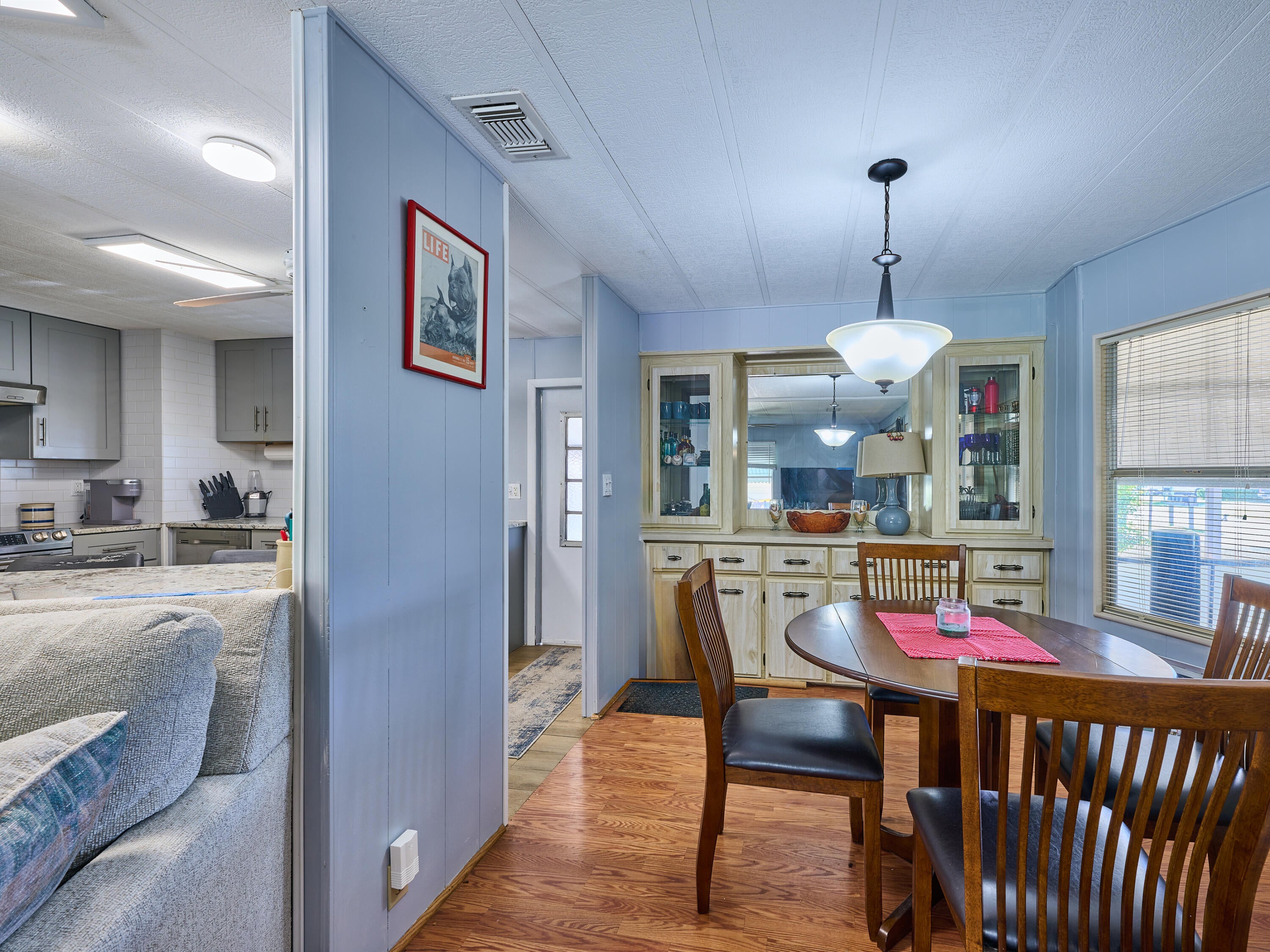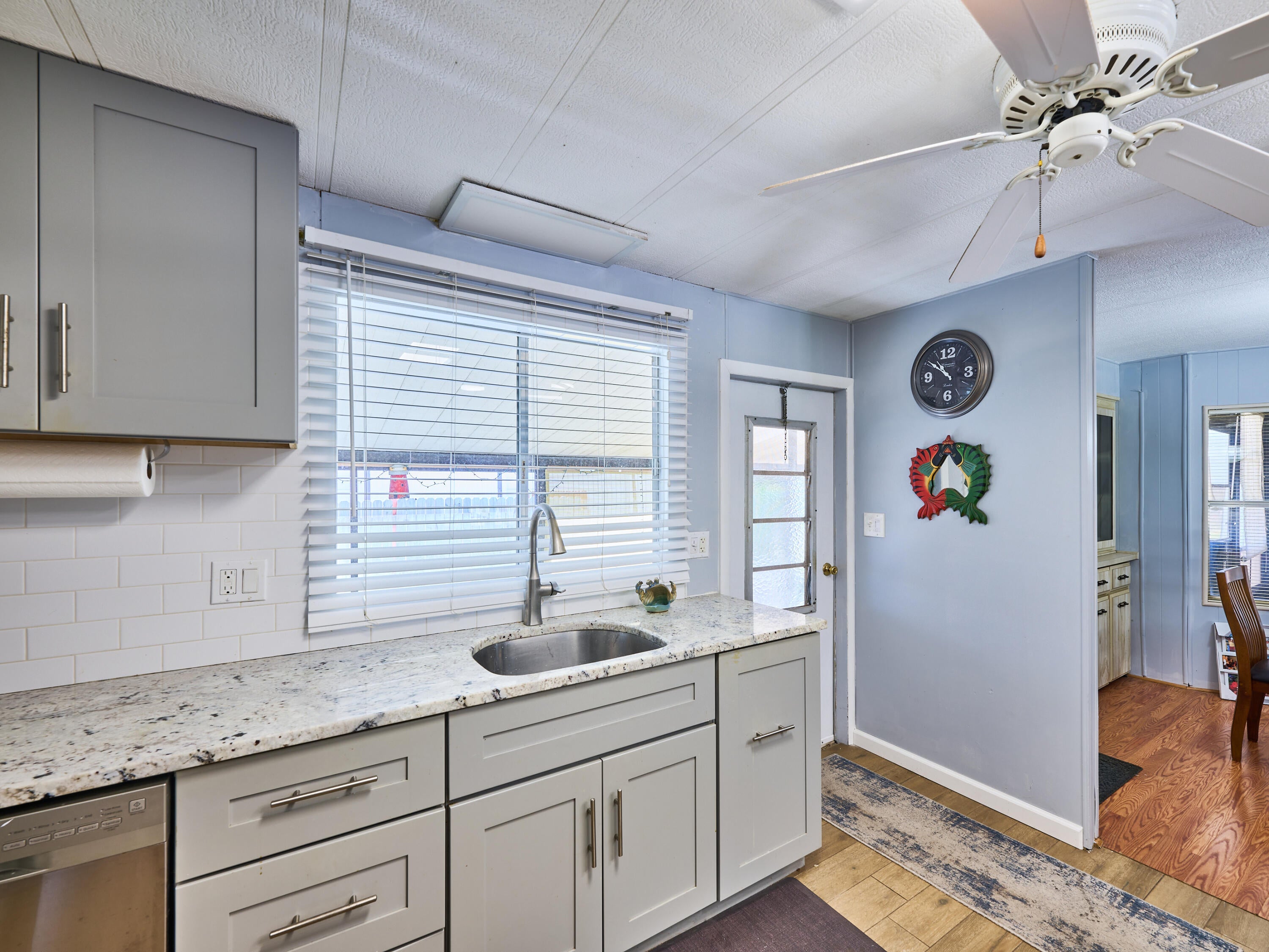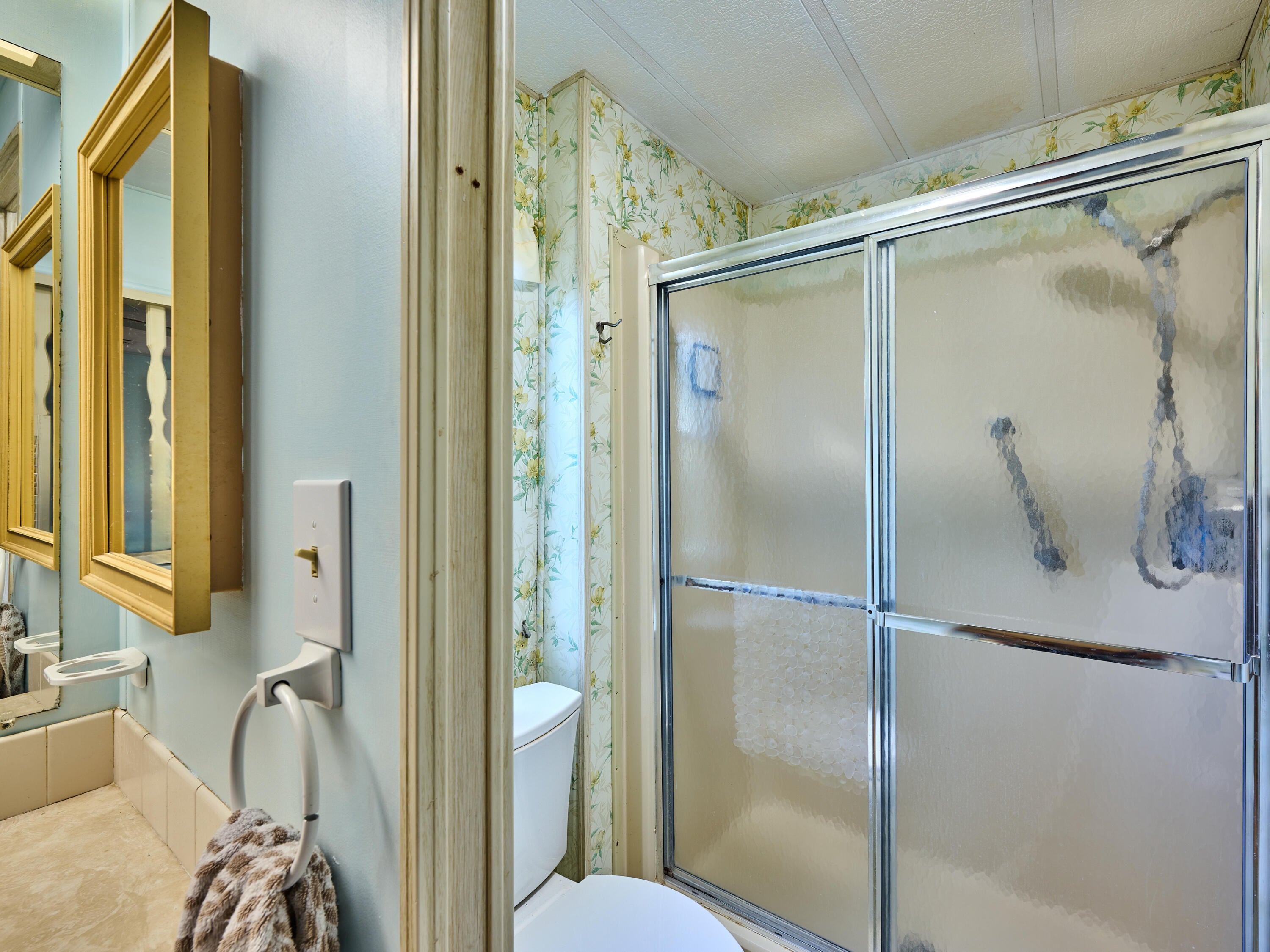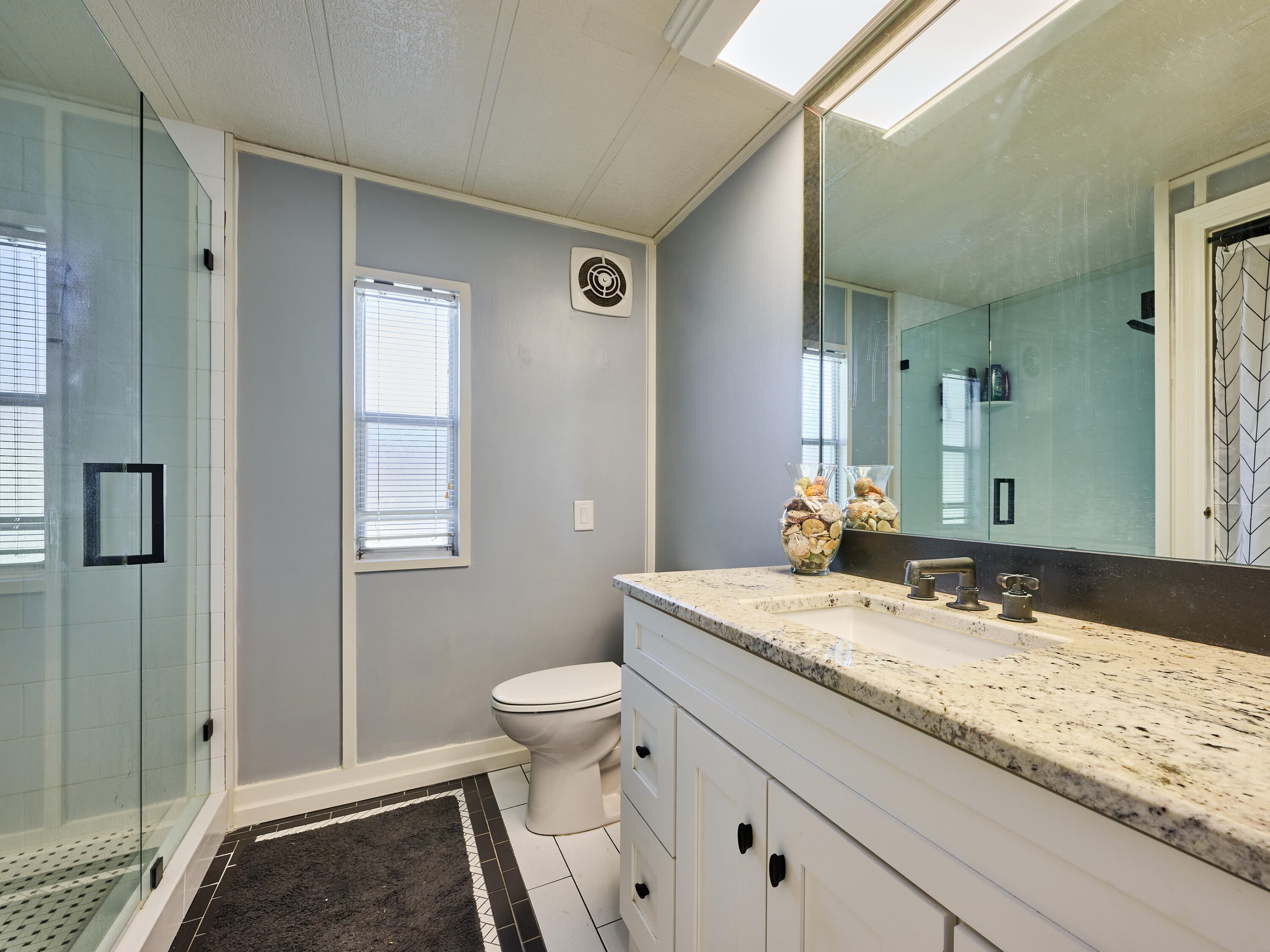 2 Bedr/2 Bath Manuf Home in Cambridge 55+ Community in Hobe Sound. Stunning, New Kitchen 2021 w light grey shaker cabinets, granite countertops, stainless steel appliances, undermount sink, new flooring, & LED lighting. The kitchen was opened up to the living room w a convenient breakfast bar. Freshly painted throughout w tropical hues so popular in FL. Redone guest bathroom in 2023 w tile shower, frameless shower enclosure, new tile floor, vanity, toilet & granite counter. The Master bedrm is large w ensuite bath. This bath awaits your personal upgrades. The 2nd bedrm is a good size. Laminate flooring throughout. THIS HOME HAS 2 LANAIS for extra living space. Doggie door to fenced backyard. New AMS Aluminum roof 2021 w lifetime warranty. New A/C ductwork! YOU OWN THE LAND- ALL PETS WELCO
