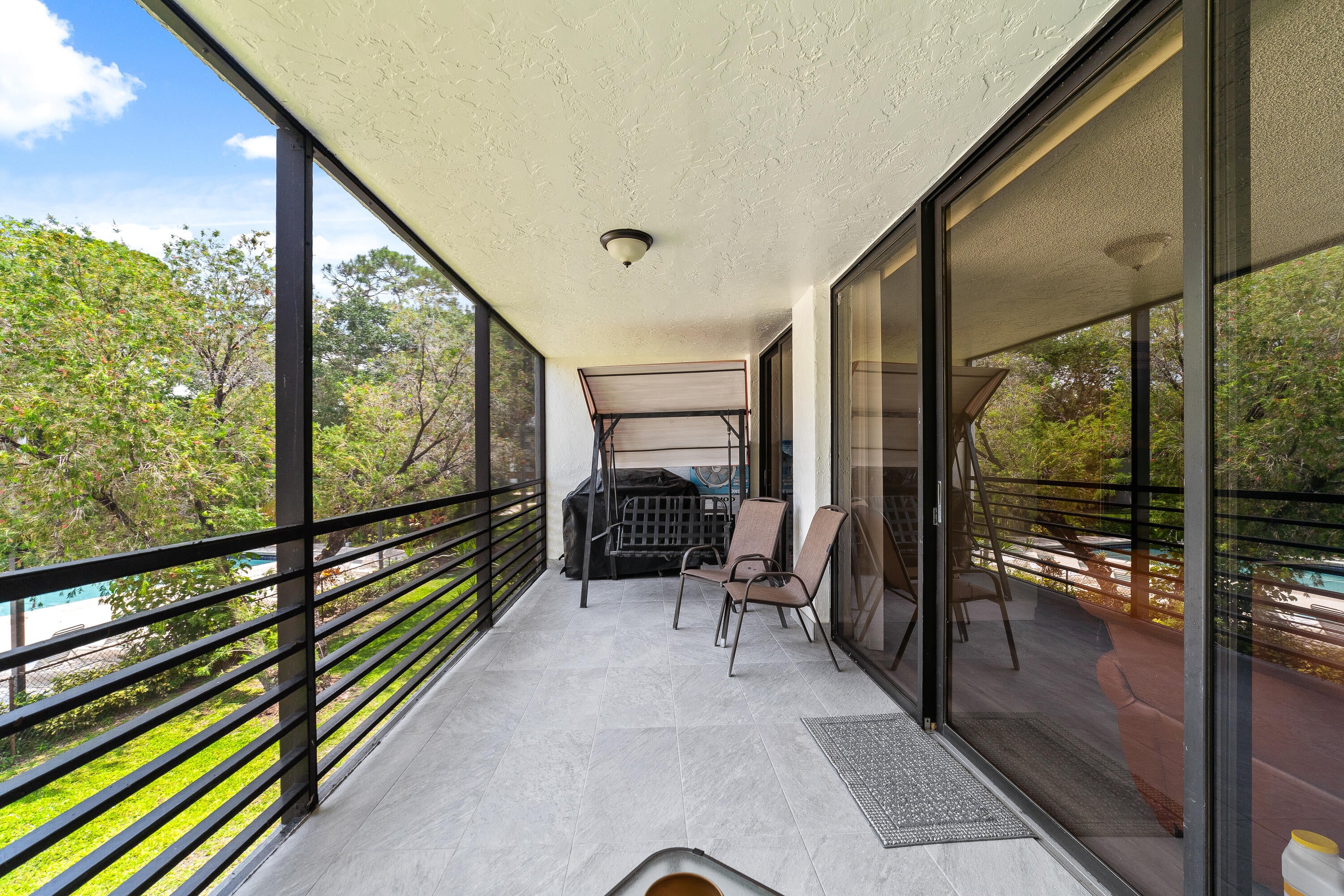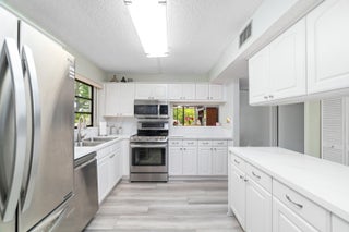 Welcome to this spacious corner unit, the largest model in the building, located in the sought-after gated community of Bonaire Woodmont. This beautifully updated home boasts abundant natural light, luxury vinyl flooring (2022) in the living areas and bedrooms (2025), a modern kitchen with quartz countertops (2022) and stainless steel appliances, two living areas, and two spacious bedrooms. Enjoy the screened back patio with new tiles (2023) and a balcony overlooking the pool, as well as a front porch/veranda. Additional updates include a new water heater and AC (2022). Conveniently situated near major shopping and dining. Seller will assist with the required 12-month HOA escrow. Escrow held and refunded according to association policy.