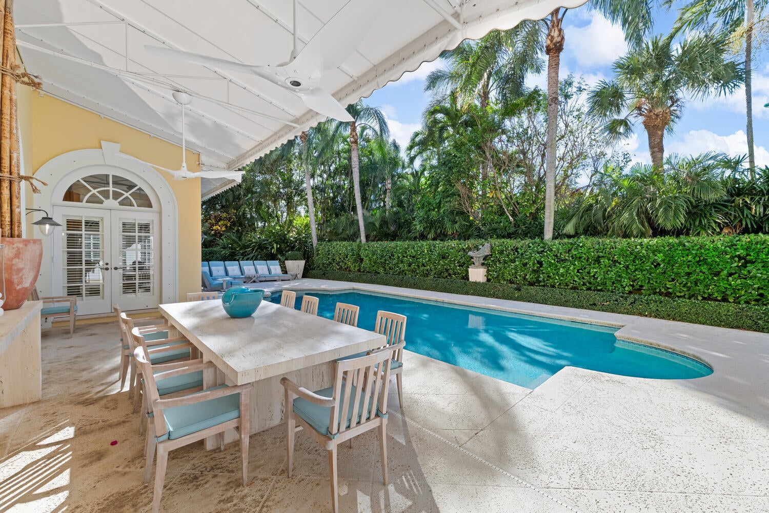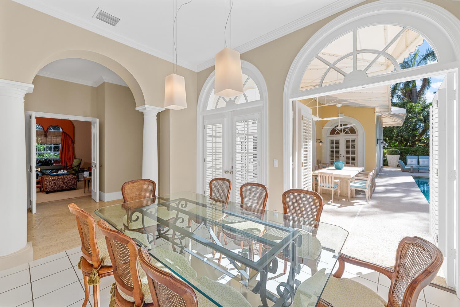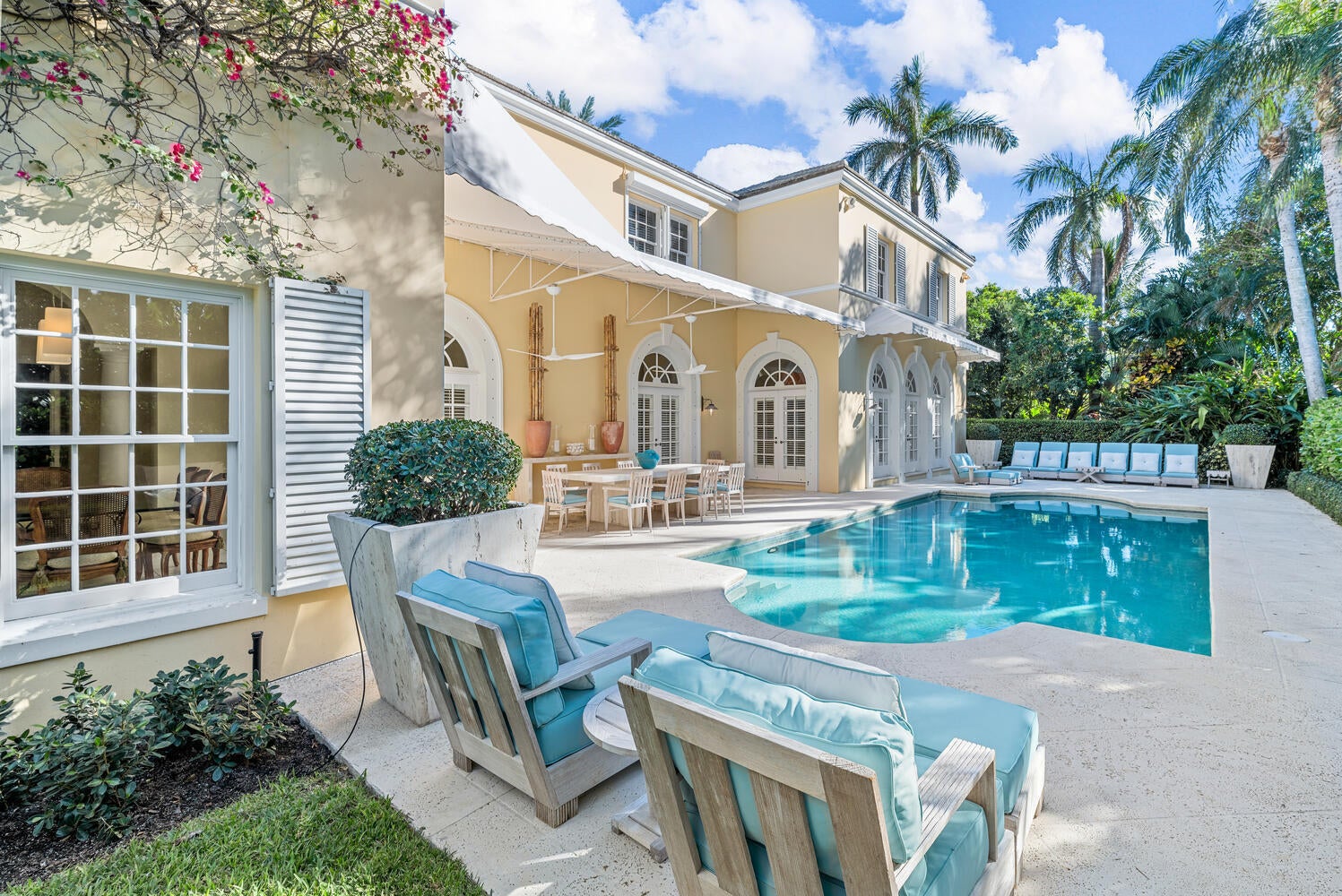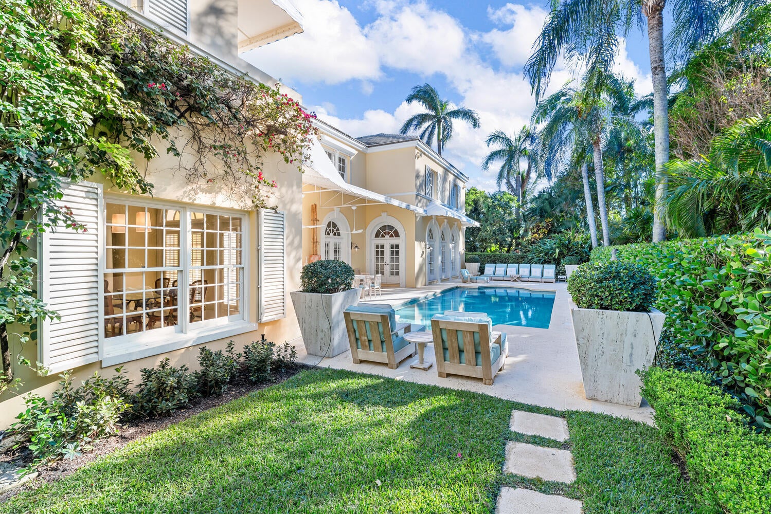 This British Colonial residence offers 6,922+/- total square feet with five bedrooms and six and a half bathrooms. Set on a 100' x 172' lot at the corner of Tangier Avenue and North Lake Way, the property features a large pool, covered loggia, and beautifully maintained grounds.The spacious foyer opens to the formal living room and a central gallery hall that connects the main living areas. The family room, located on the south side, opens through French doors to the covered loggia and pool. On the north side, the gallery leads to the formal dining room, library, and kitchen with adjoining dining area--an ideal layout for both everyday living and entertaining.Two guest bedrooms are located on the first floor, each with en suite baths and walk-in closets--one currently serving as alibrary. Additional first-floor features include a powder room, laundry room, and a two-car garage with separate service drive. Upstairs, the primary suite offers exceptional space and privacy with four walk-in closets, separate his-and-her bathrooms, and ample storage. Two additional guest bedrooms on this level each include en suite baths and walk-in closets. Ideally situated on Palm Beach's North End, the residence is just moments from the Lake Trail, beaches, restaurants, and world-class shopping.
