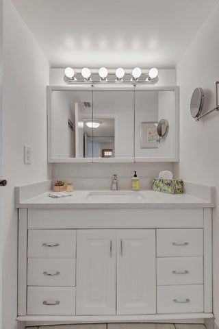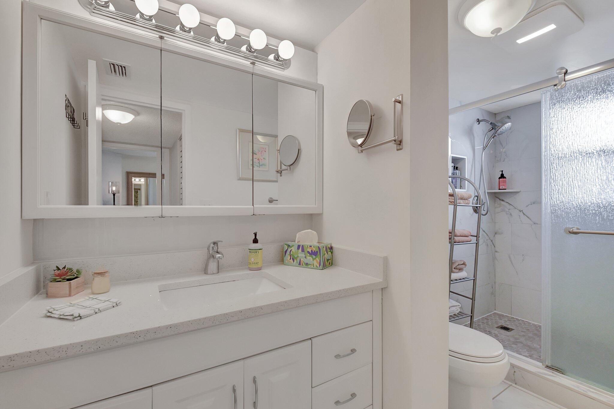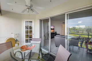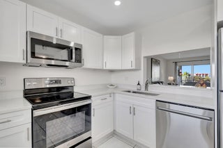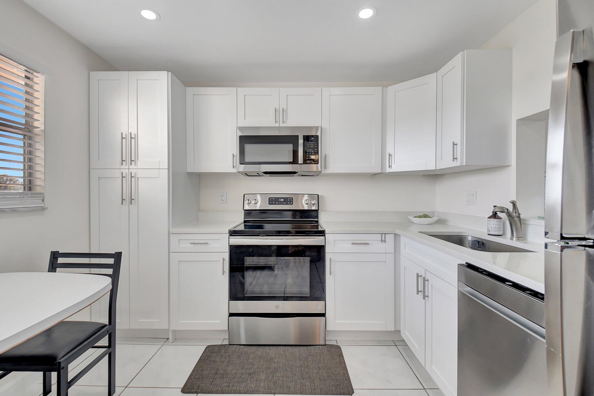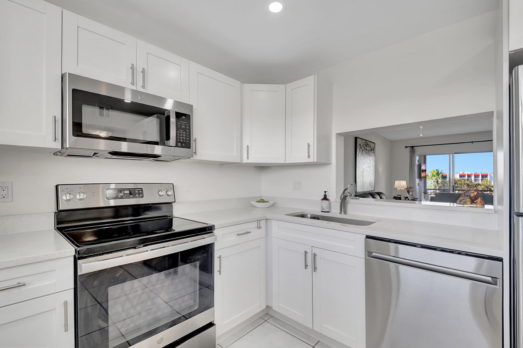 Enjoy the elegance of this fully renovated, spacious 1-bedroom, 1.5-bath condo nestled in the prestigious Poinciana Country Club. The kitchen boasts white shaker cabinets, quartz countertops, stainless steel appliances, and LED recessed lighting, creating a modern and sleek environment. The bathroom is beautifully updated with a tiled walk-in shower and an oversized vanity. The generously sized bedroom offers his and hers walk-in closets with organizers. Convenience is at your fingertips with a front-load washer and dryer in the utility closet, plus a storage closet on the balcony. Step out onto the balcony and relish views of the golf course and lagoon. You're just steps away from the clubhouse which features: A bar/restaurant offering lunch, dinner, and entertainment, A fitness center,A golf course, A sauna, A heated swimming pool, A ballroom with various activities. Embrace the beautiful views and be part of a vibrant community.