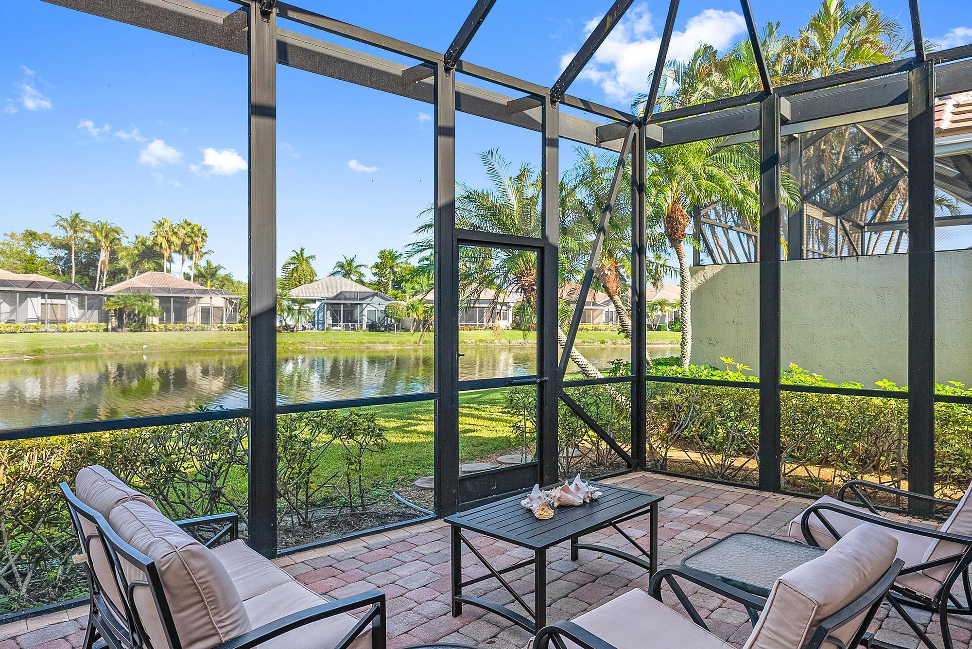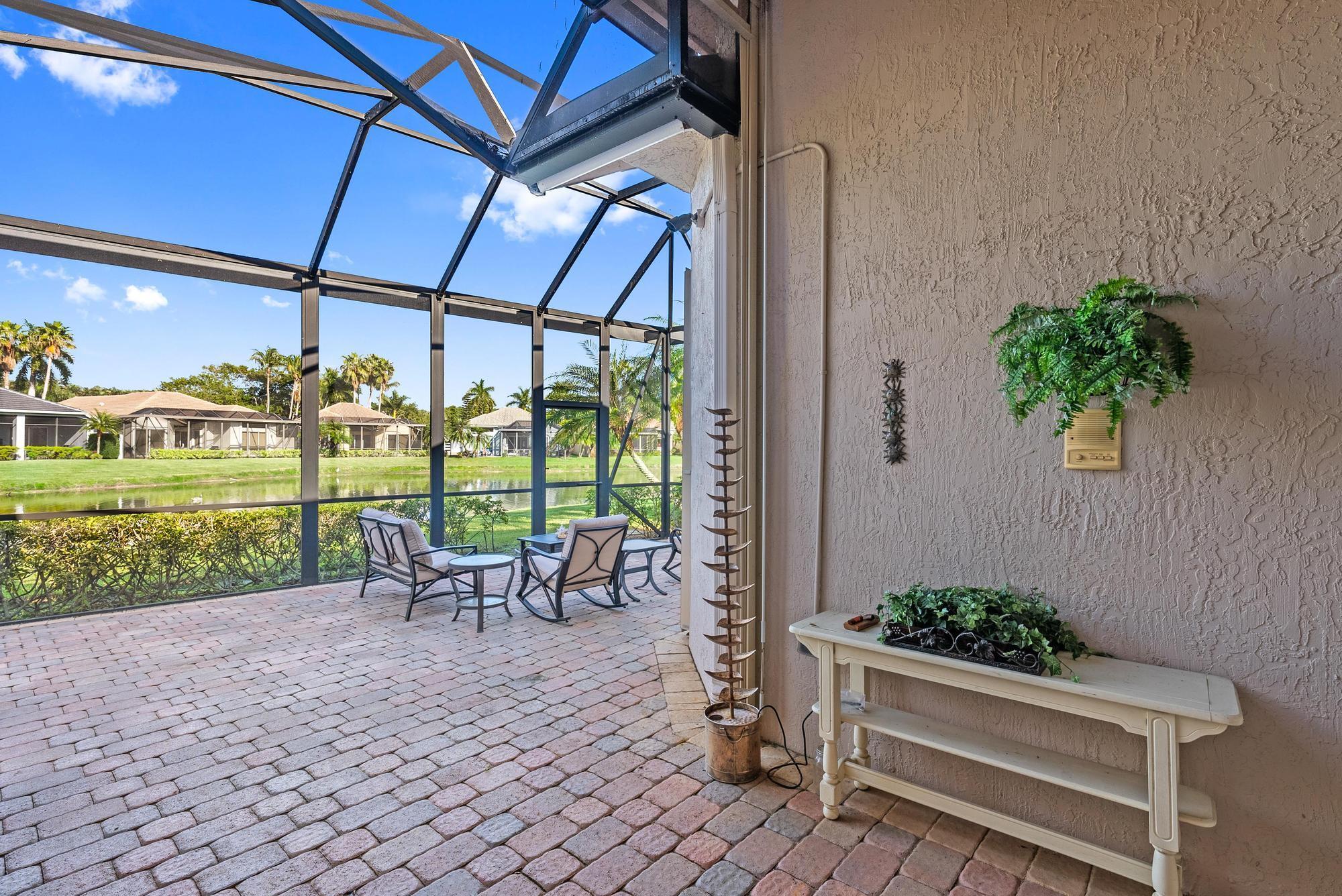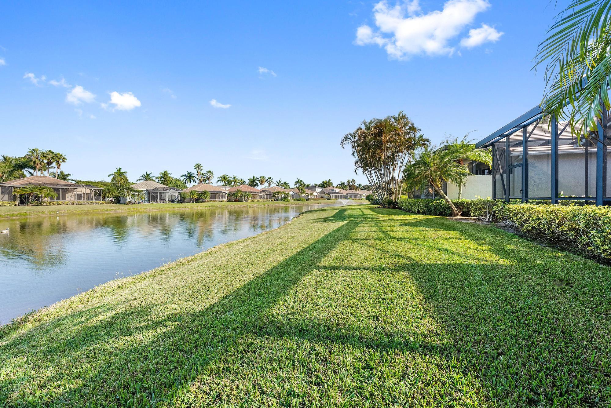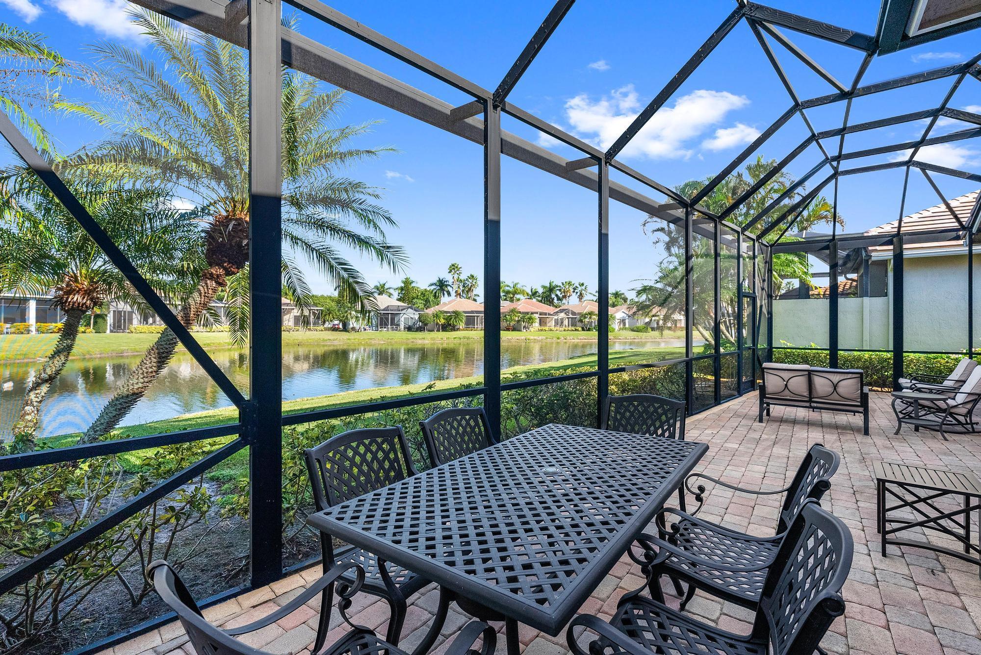 BRAND NEW 2025 ROOF! With 50 FEET OF WATER FRONTAGE, this 3BR/2.5BA upgraded home expands beautifully to the outdoors. Enjoy serene water views from this 2200 SF single-family home. The popular Hamilton floor plan offers soaring ceilings, and generous space. Accordian shutters and Impact Glass double front doors provide ample hurricane protection. Light, bright, and neutral, this immaculate home boasts a redone primary bath, upgraded kitchen with stainless appliances, granite counters, and elegant subway tile backsplash. The large screened enclosure provides fabulous outdoor living space, overlooking the premium lake view. Many upgrades throughout the property:Garage storage units with shelving, Water heater replaced in 2022, High Boy commodes, designer light fixtures and window treatments, built-in desk in third bedroom, closet built-ins, replaced flooring in primary and guest bedroom, frameless shower doors, new garbage disposal (2024), and more! The Club at Ibis is a Platinum Club of America community that boasts a 90,000 sq. ft. clubhouse, three 18-hole Nicklaus-family Championship golf courses, five restaurants, a world-class fitness complex and spa, and incredible tennis and pickleball facility.