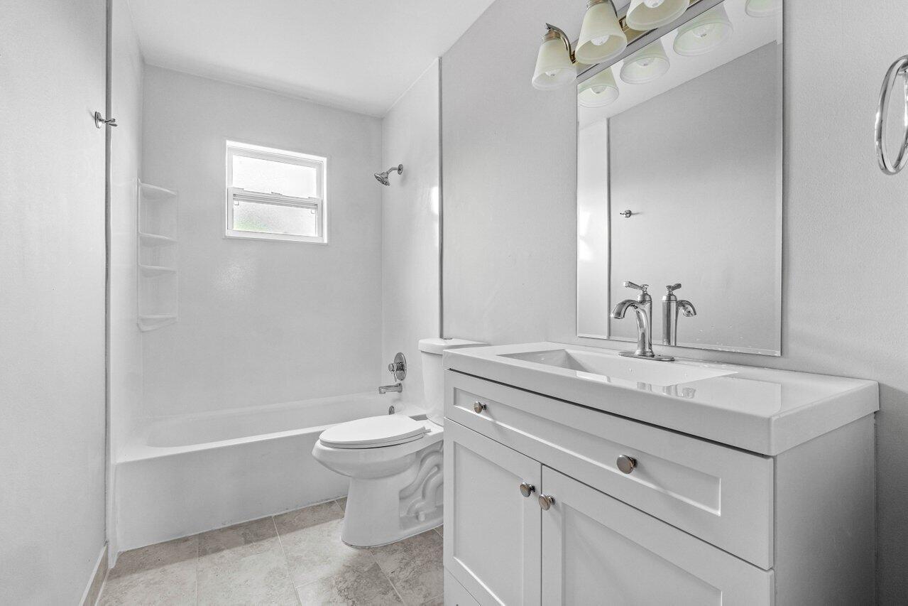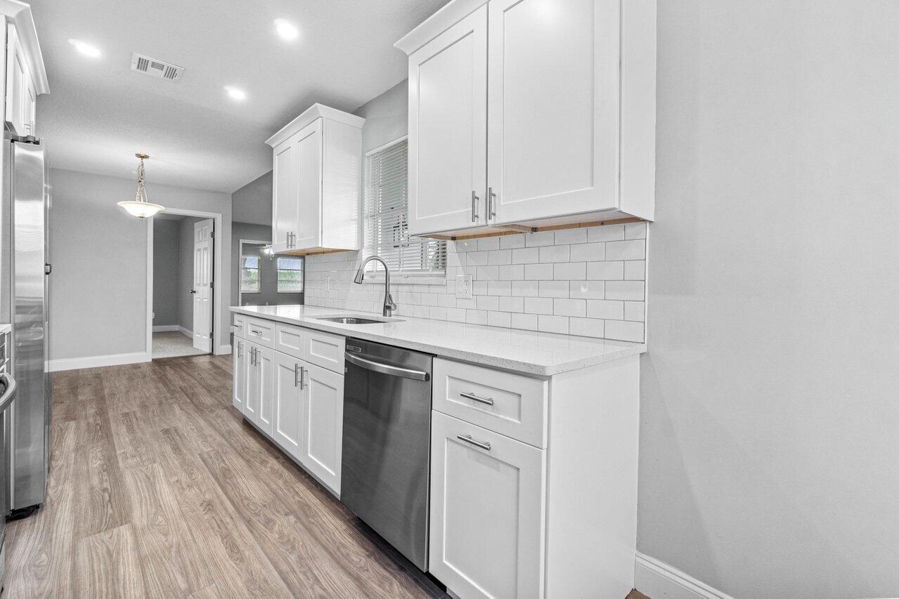 3/2 Single Family. Beautifully updated 3 bedroom, 2 bath home in the heart of Port St Lucie! New, eat-in kitchen featuring white, shaker cabinets, quartz counters and new stainless steel appliances. Bright, updated bathrooms. This home boasts both a living room and spacious family room with tons of light. French doors off the family room and master lead to a large screened patio to enjoy the outdoors. Beautiful, new laminate flooring throughout living areas and new carpet in bedrooms. Freshly painted inside and out. Huge back yard with storage shed. Beautiful, new paver driveway. Home has been converted from septic to sewer. Wonderful neighborhood close to shopping, entertainment, great schools and all Port St Lucie has to offer! Do not miss this beautiful home!