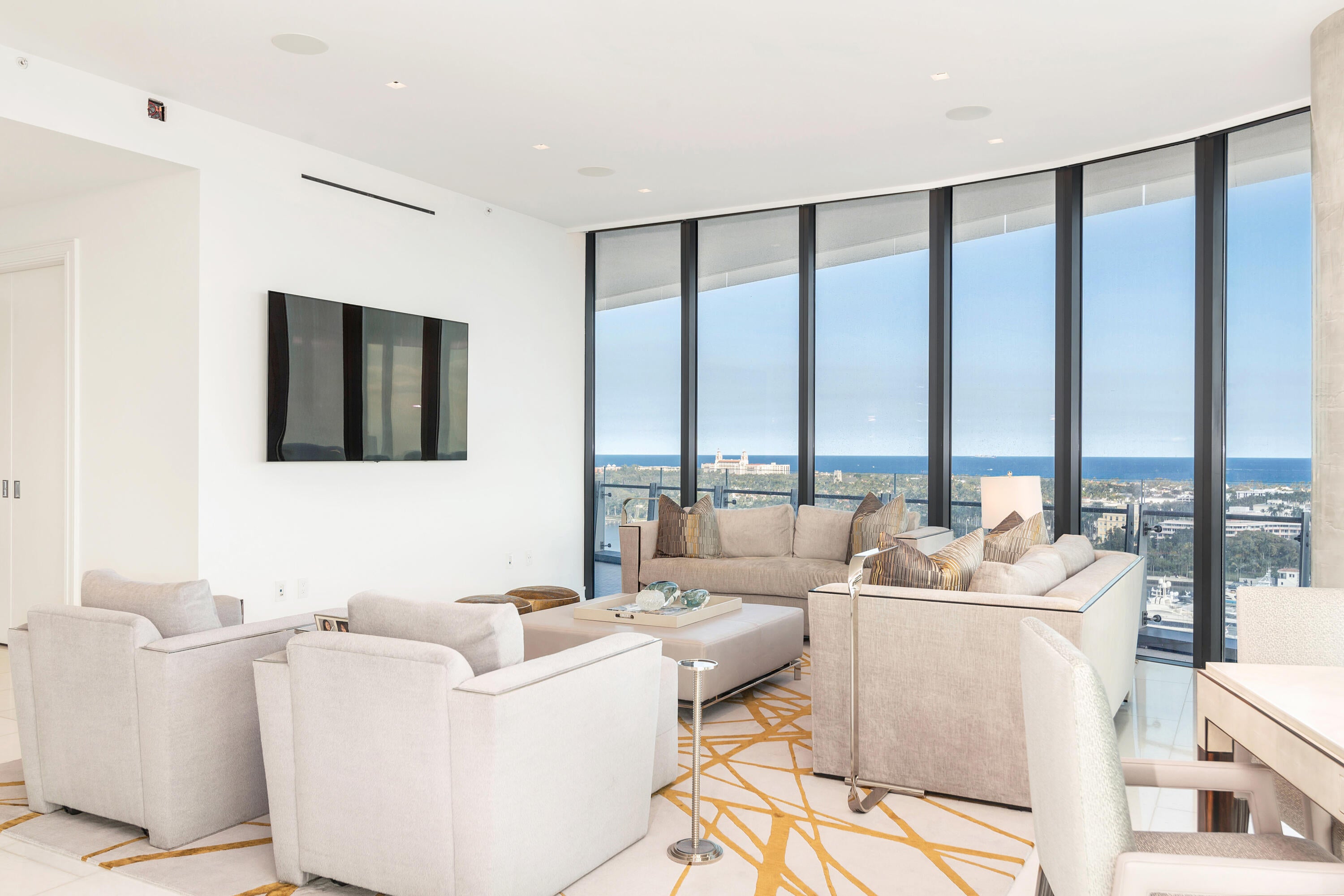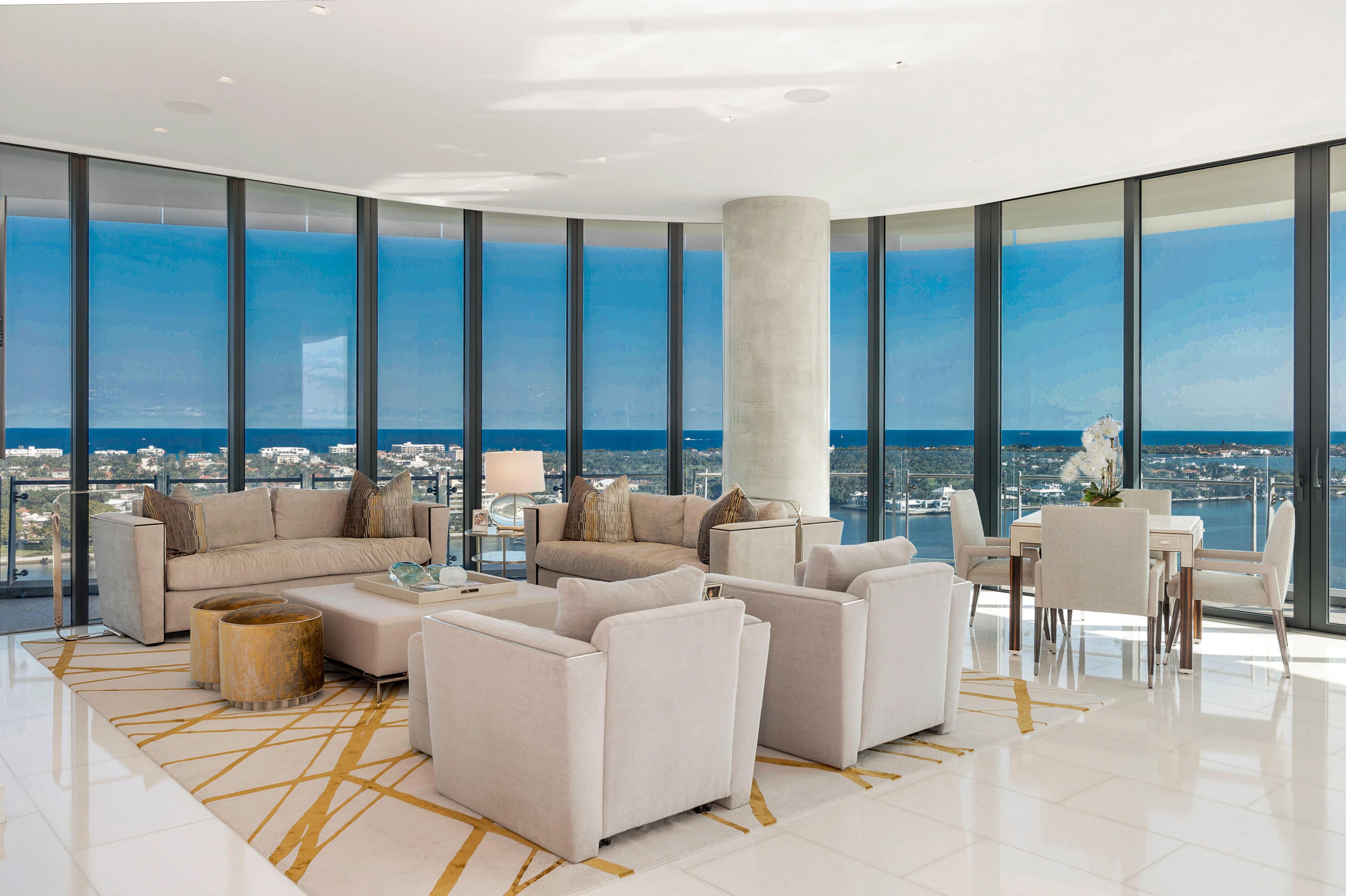 The coveted 04 Line at the Bristol is truly remarkable. As you enter this stunning high floor residence through a private foyer, you are greeted by breathtaking eastern and southern water views. This meticulously designed condominium features four bedrooms, five full bathrooms, and one half bath, seamlessly combining style and practicality. Created with sophistication in mind, this property boasts the finest finishes and top-tier upgrades and 10-ft ceilings throughout. It's an exceptional home in the sky. The Bristol is unparalleled when it comes to amenities in Palm Beach County, offering an array of five-star services and attention to detail. Amenities include a waterfront fitness center, men's and women's beauty salon, spas, steam rooms, saunas, and massage treatment rooms.Residents enjoy a 75-foot resort-style pool, indoor/outdoor Jacuzzis and the convenience of on-site professional concierge and front desk service. Additional features include a spacious outdoor entertainment terrace, a club lounge, a private dining area, a card room, a dog park, and a full-building generator for added peace of mind. This condominium includes two garage parking spaces and one valet space.