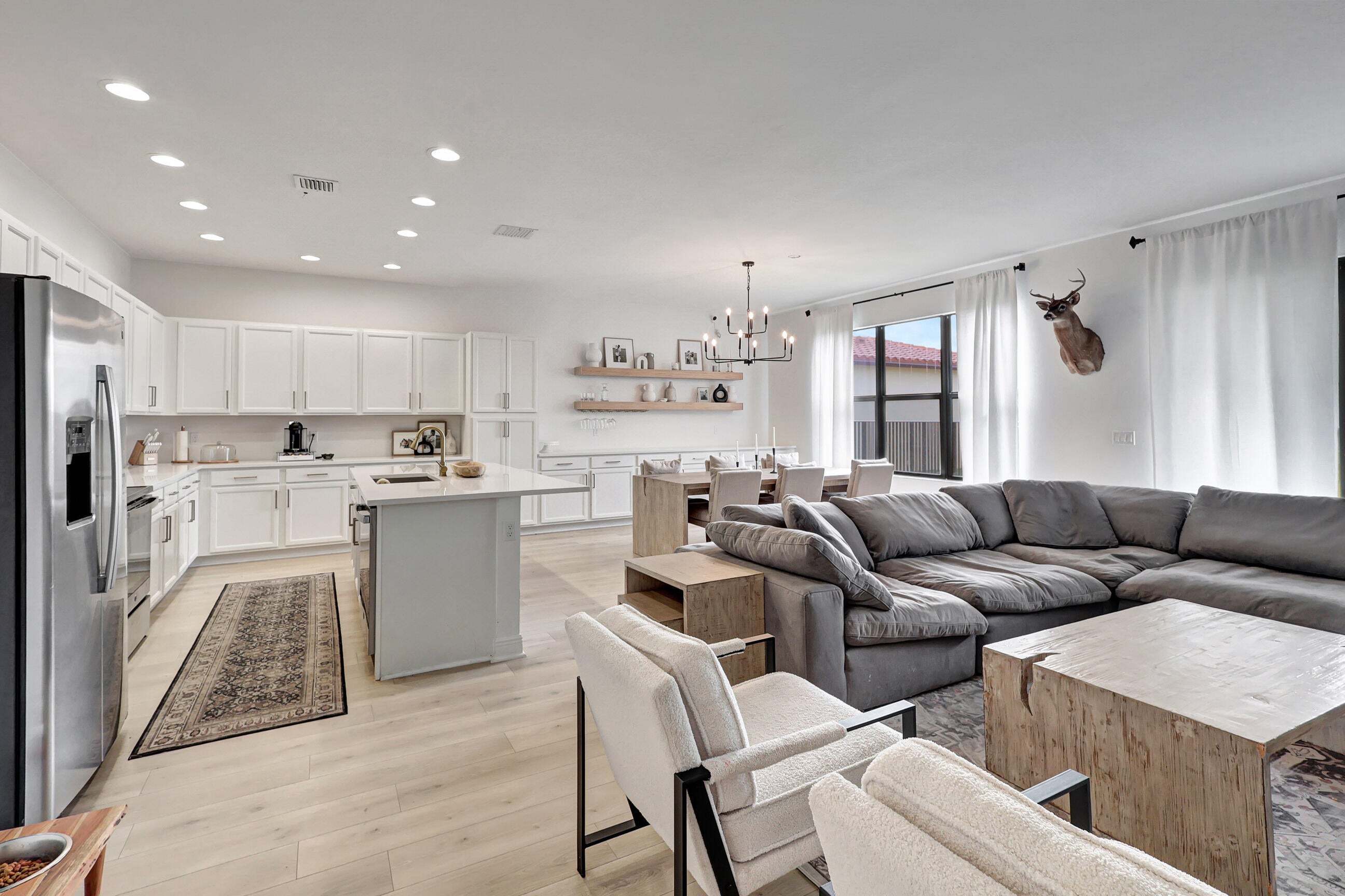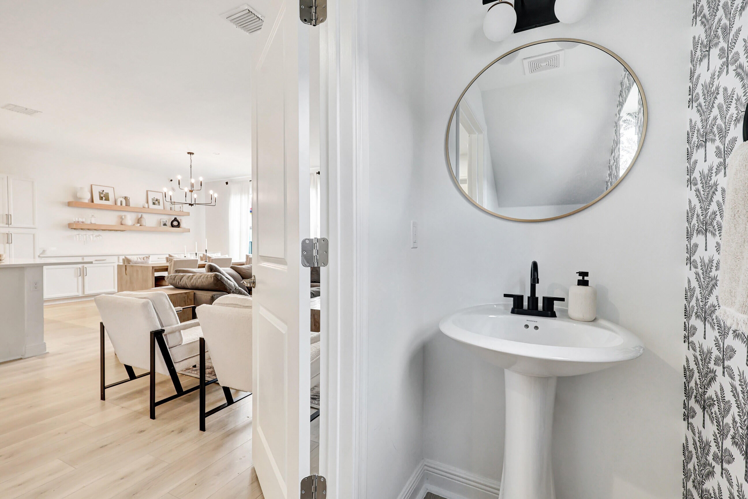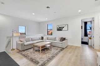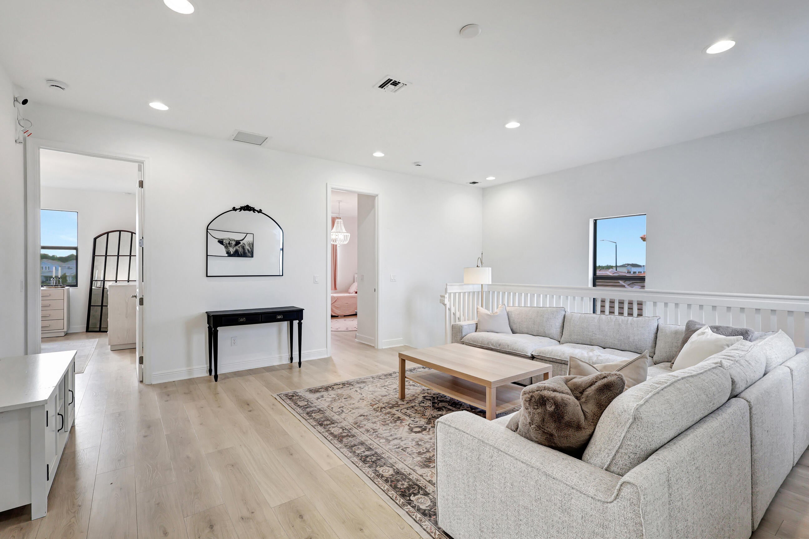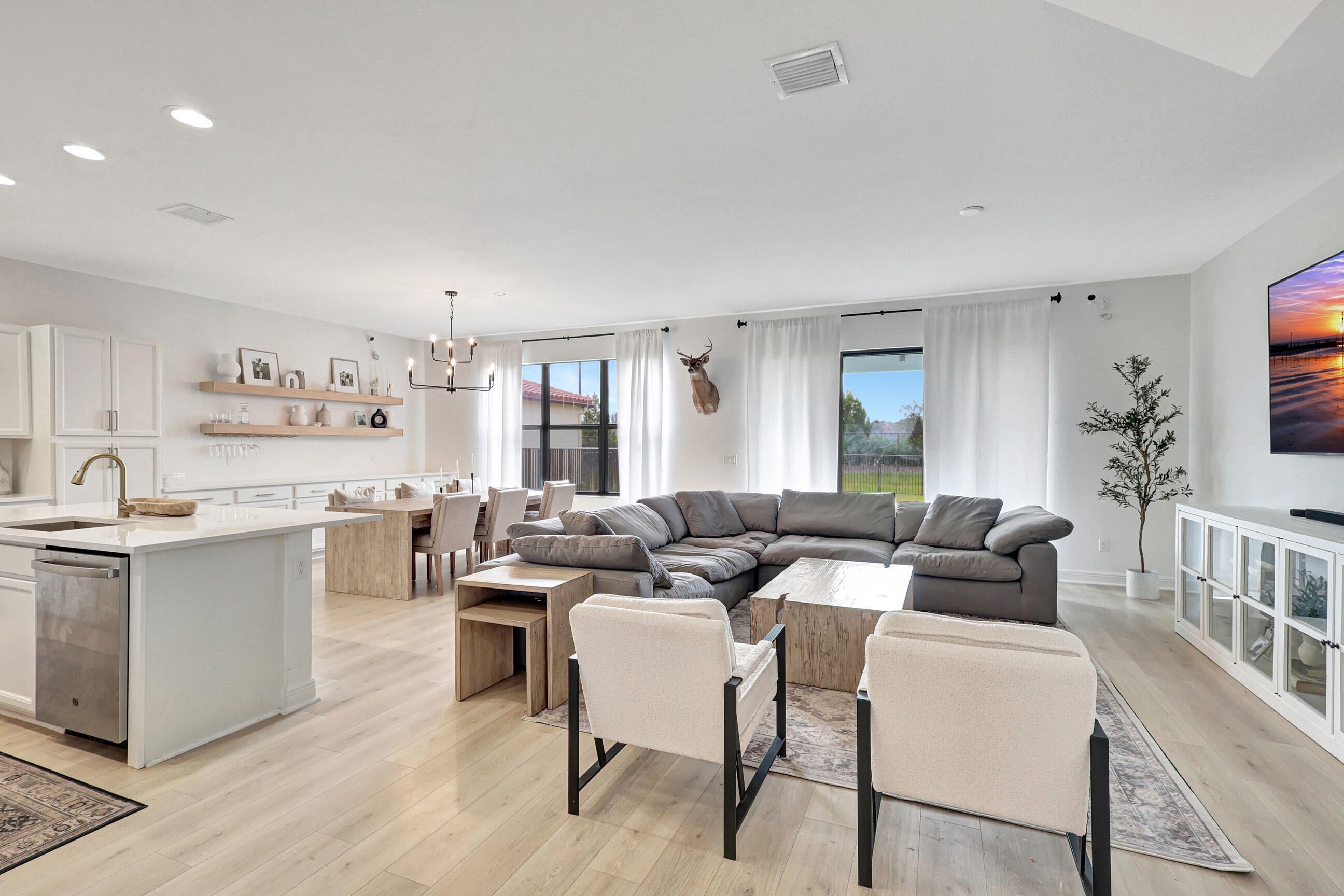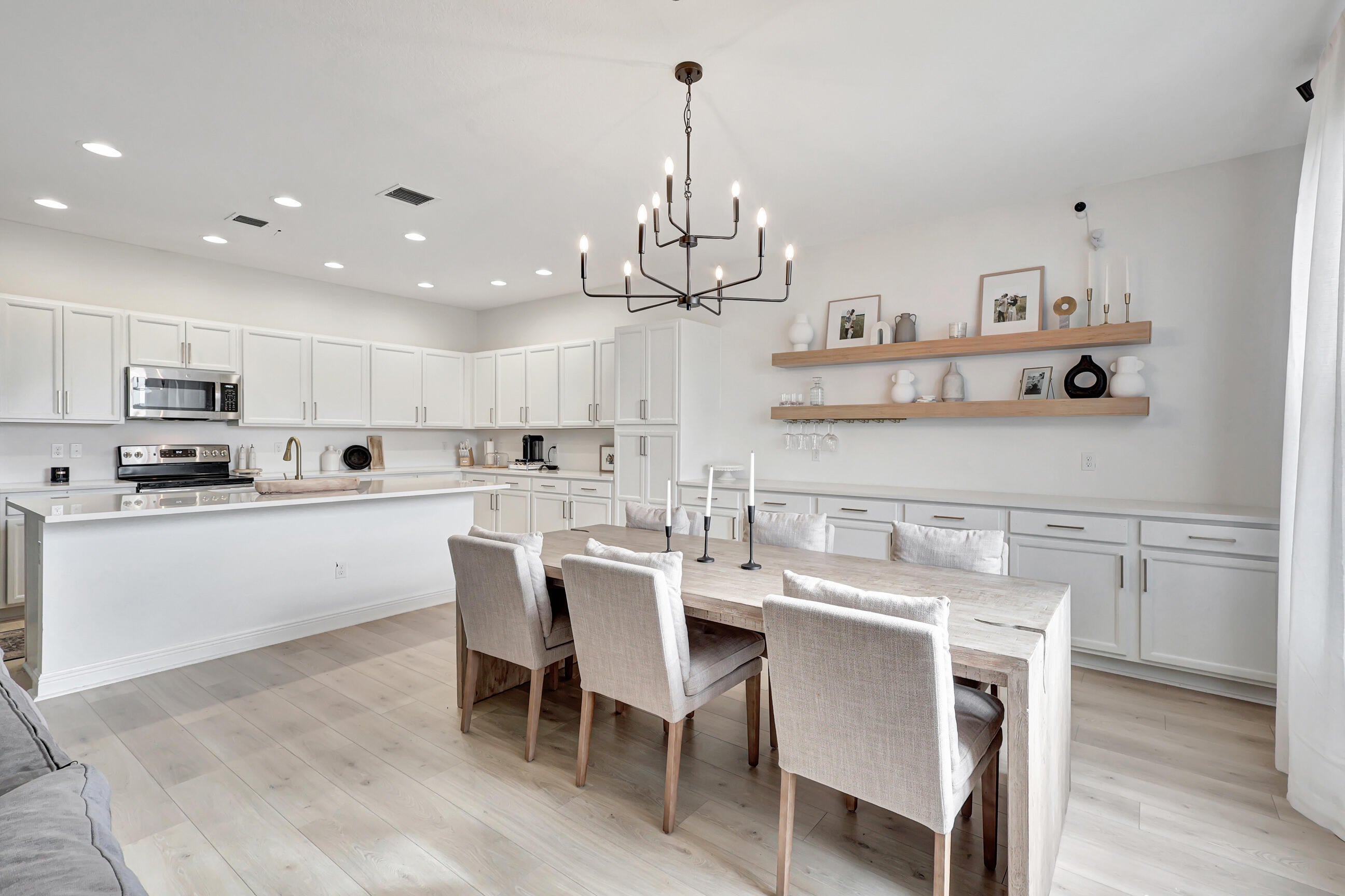 A modern, bright home awaits you. This sleek home boasts bleached linen vinyl flooring throughout, accented by black elements for a chic aesthetic. With 3 beds plus den and 2.5 baths, the open-concept downstairs features a spacious kitchen with extended cabinetry, seamlessly flowing into the dining and living areas flooded with natural light. Upstairs, the primary bedroom offers a two-sink primary bath, while two additional bedrooms share a bathroom. A bright and airy den perfect for lounging. Outside, the fenced-in grass backyard invites relaxation and outdoor gatherings. #1 rated schools district! Experience contemporary living at its finest - schedule a showing today!