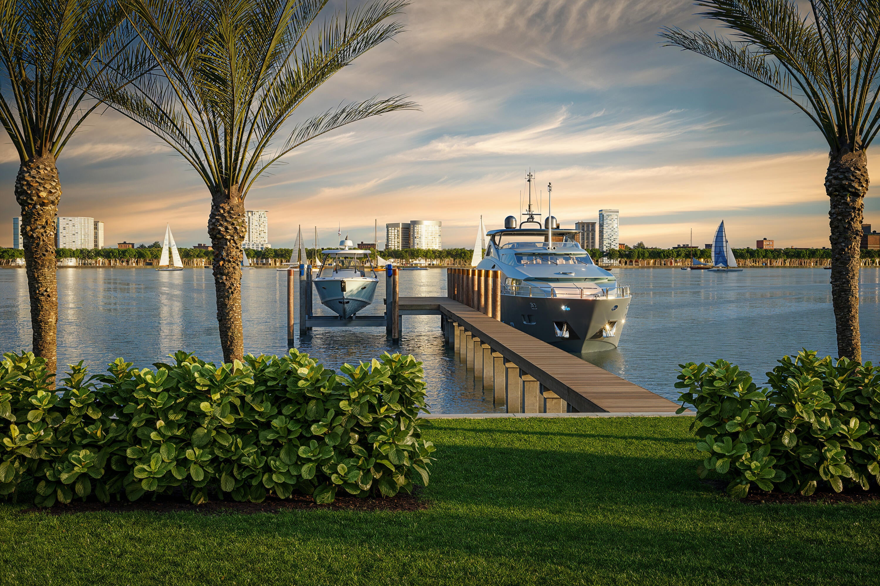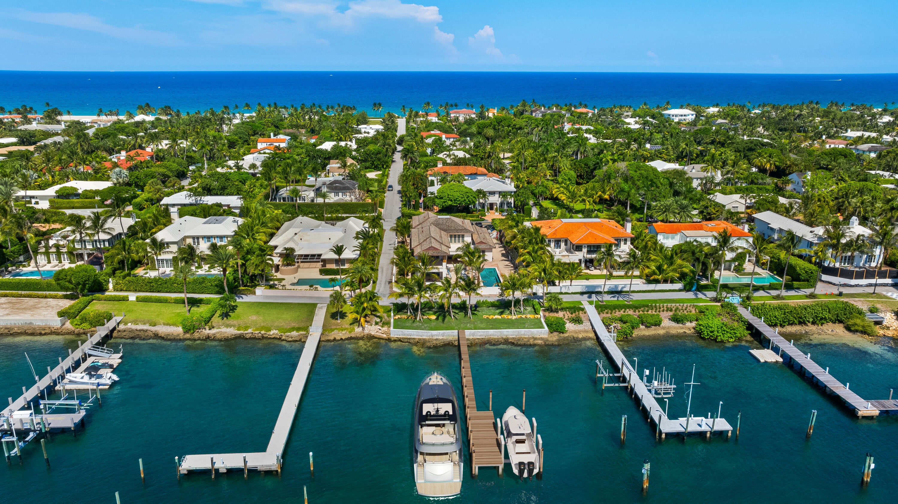 Brand-new construction on North Lake Way built by Wildes Builders and LaBerge and Menard Architect's. Featuring 90 feet of waterfront, a new dock, and luxurious interiors. Upon entering, you are greeted by a grand foyer with Jerusalem Gold limestone flooring that leads into the spacious living areas. The main floor boasts an open kitchen equipped with Gaggenau and Sub-Zero appliances, Taj Mahal stone countertops, an island with seating, and a breakfast area. This space seamlessly flows into the family room, which opens to a covered outdoor loggia overlooking the large pool. Adjacent to the kitchen is a butler's pantry, also outfitted with Taj Mahal stone countertops, and a private dining room for formal gatherings. The separate living room provides additional space for relaxation oror hosting guests. This level also features two powder rooms, a downstairs laundry room, and access to the two-car garage. The home is further enhanced by a whole-house generator for added convenience and security. In addition, this home has a two-car garage with height for car lifts. An elevator or staircase takes you to the second floor, where a beautiful landing area opens to an oversized terrace. The crown jewel of this level is the primary suite, which includes two large walk-in closets and two luxurious bathrooms one with a separate soaking tub and Vanilla Onyx stone finishes, and the other with Grigio Collemandina marble. The primary suite's private terrace faces west, offering breathtaking sunset views over the Intracoastal. This home includes four additional guest bedrooms, each with its own en-suite bathroom. Two are located on the main floor, while the other two are upstairs, one of which features a private terrace. A private office with its own balcony provides a serene retreat for work or relaxation. Deeded beach access on Kenlyn Road.