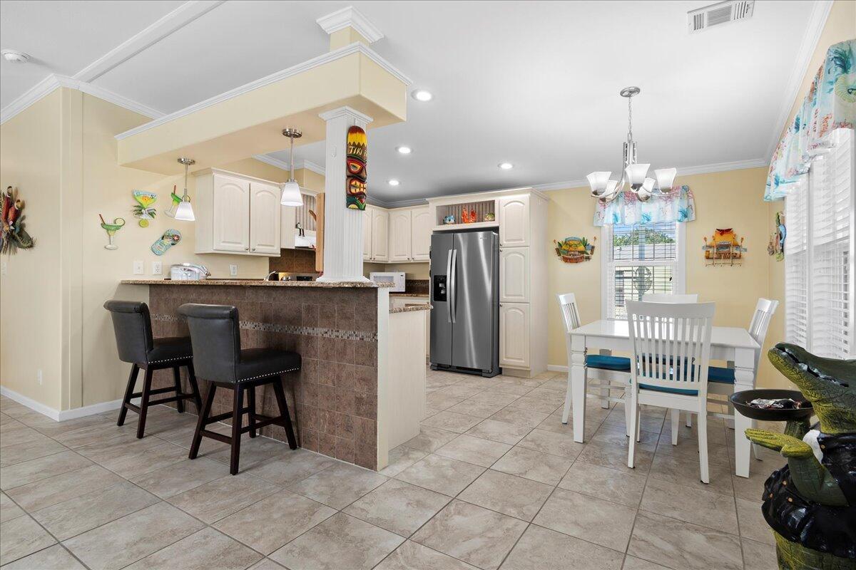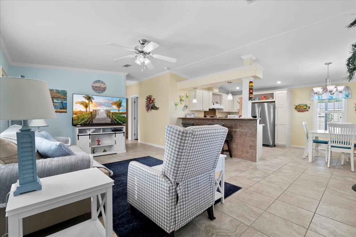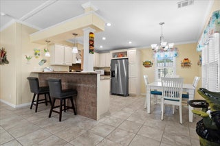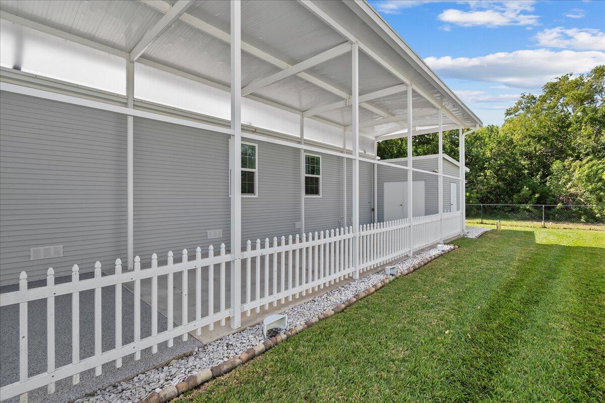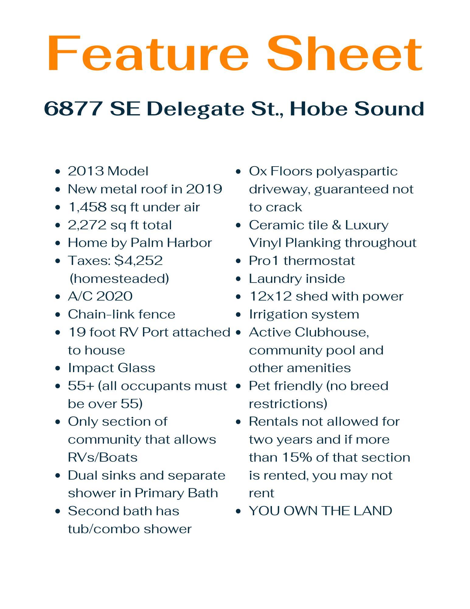 Step onto the breezy peaceful front porch & imagine morning coffee or evening relaxation. Located in the only section of 55+ Cambridge at Hobe Sound permitting RVs/boats is a charming Key West-style home with thoughtful upgrades & curb appeal. 19-foot RV port offers shaded parking, while the beautifully landscaped & irrigated yard adds tropical flair. Polyaspartic driveway reinforced for RVs with a no-crack guarantee. Walk inside to a bright, open kitchen with updated appliances, breakfast bar & cozy dining nook plus spacious living area. This is one of the newer builds with impact windows, a 2019 metal roof, 2020 A/C, Pro1 smart thermo, full-size washer/dryer, 12x12 powered shed & fully fenced backyard. Vibrant community offers a clubhouse, pool & more. Pets welcome & you own the land!
