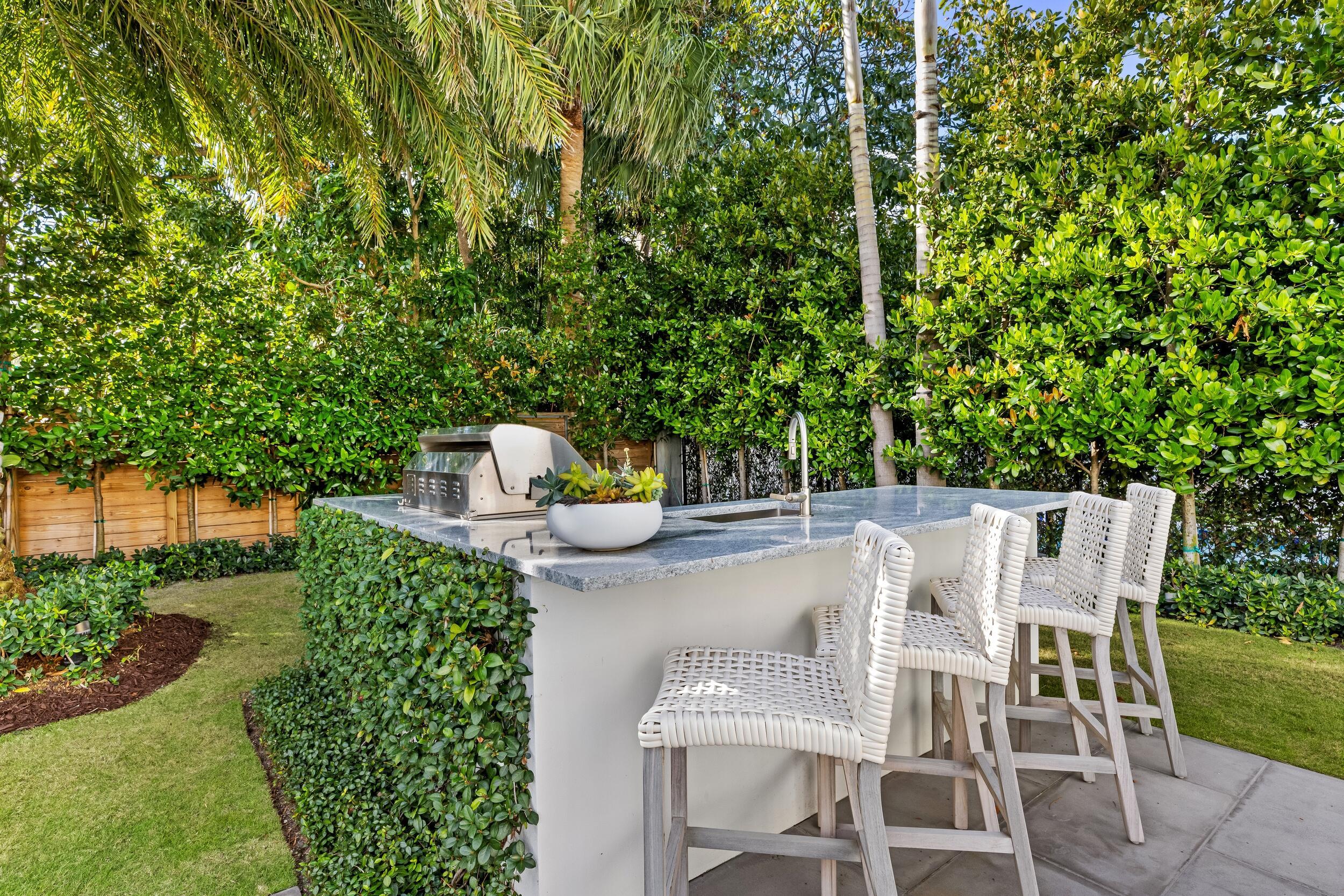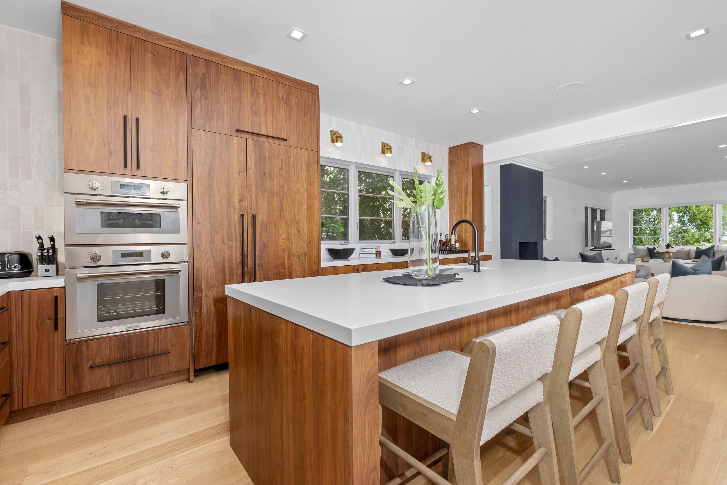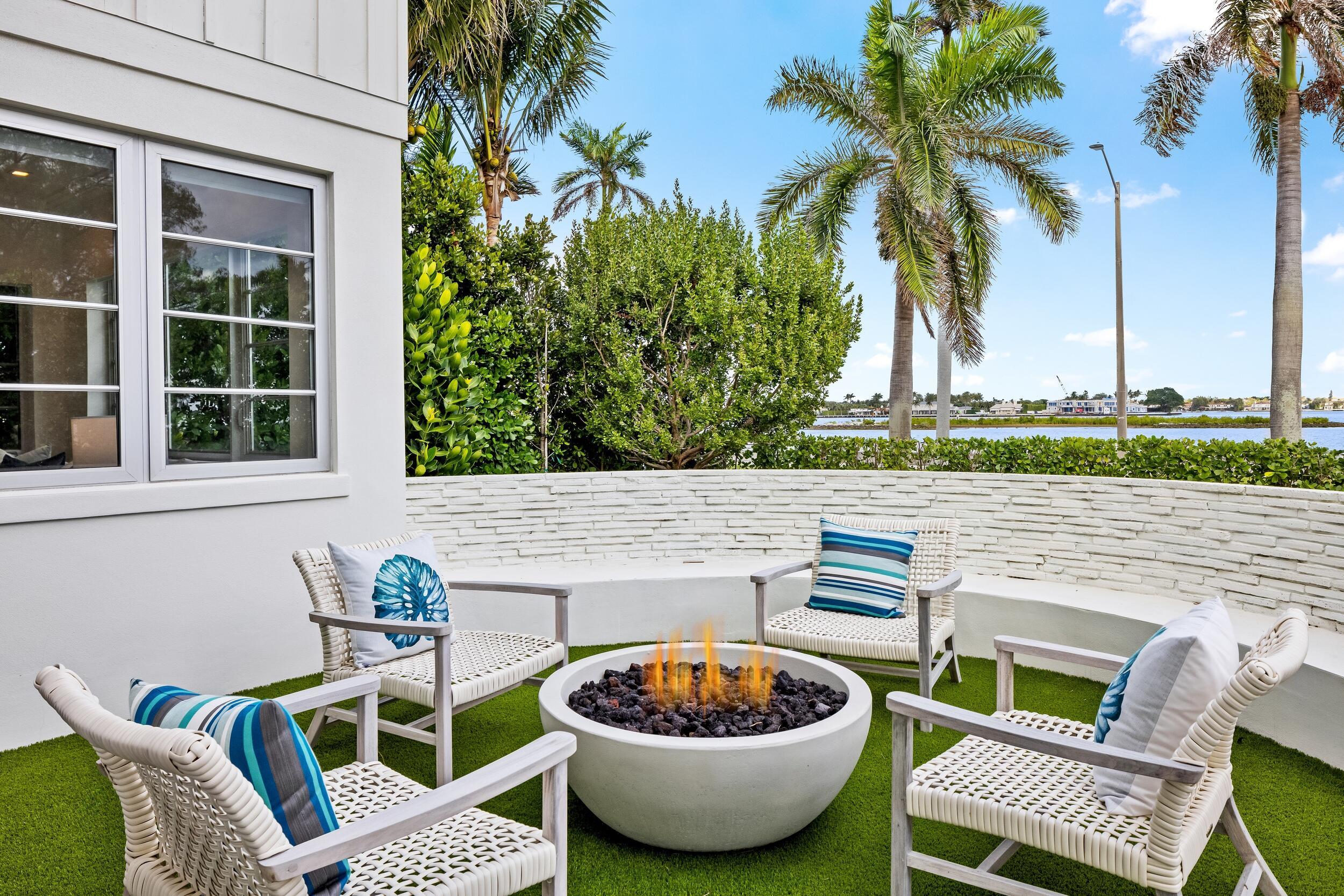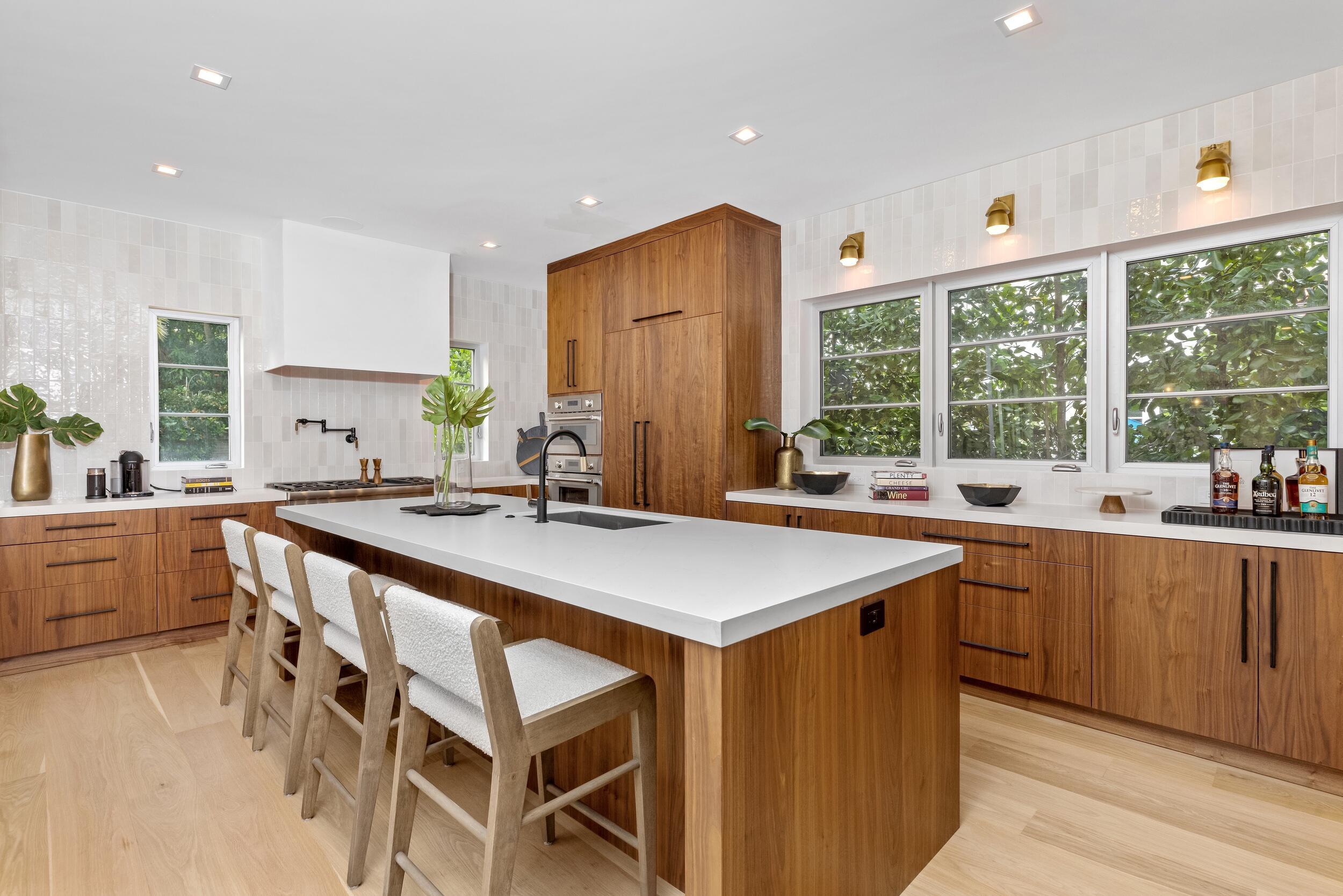 Waterfront 4BR/5.1BA Mid-Century home recently remodeled with beautiful finishes. Fantastic lakefront seating area. Light-filled living room with fireplace and views of the Intracoastal. Gorgeous kitchen with Thermador appliances, custom cabinetry, and oversized island with breakfast bar. Beautiful hardwood flooring and finishes throughout. Stunning resort-style backyard with built-in summer kitchen, covered lounge area, open dining patio, and large pool.