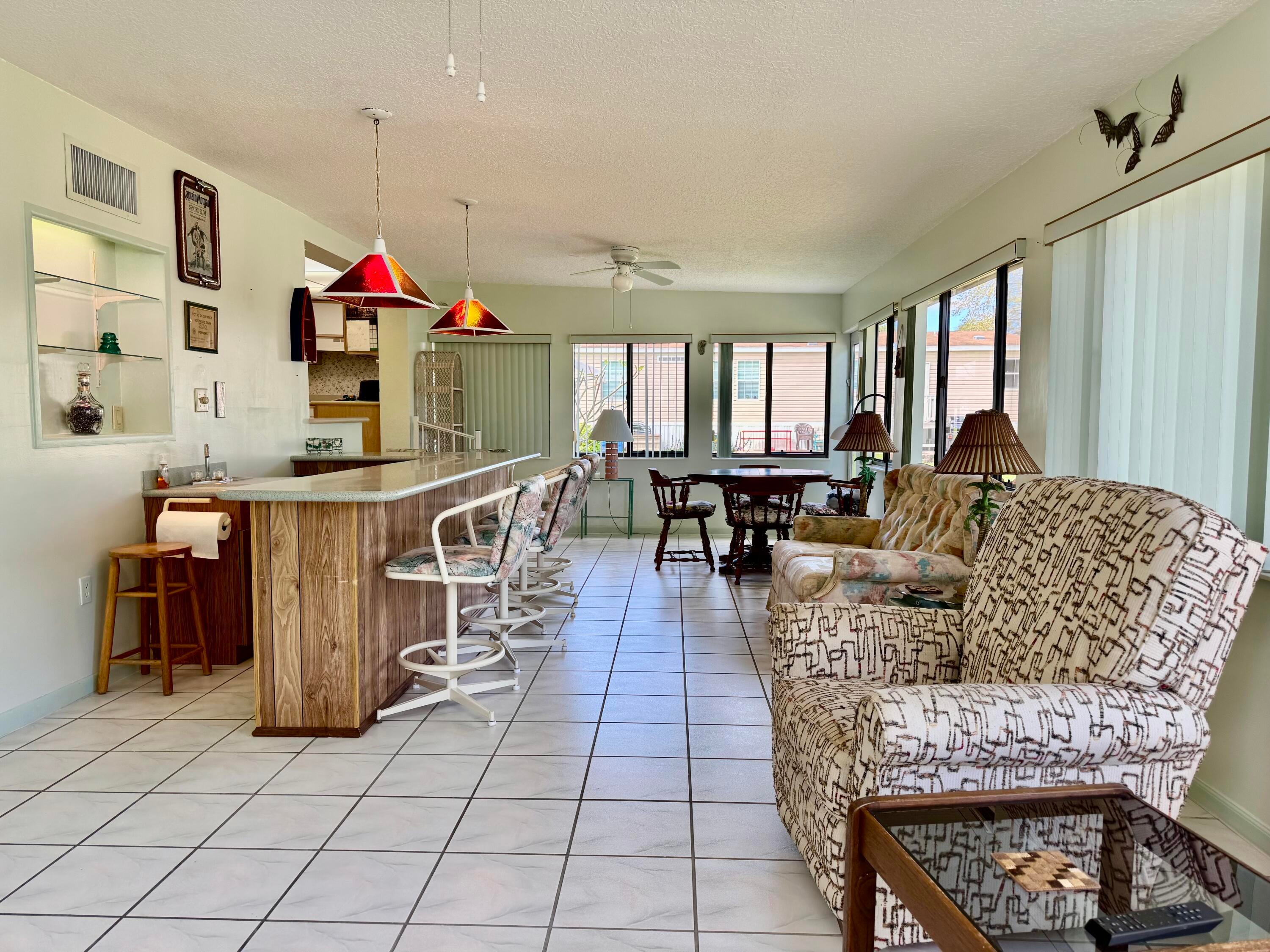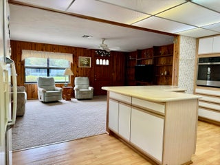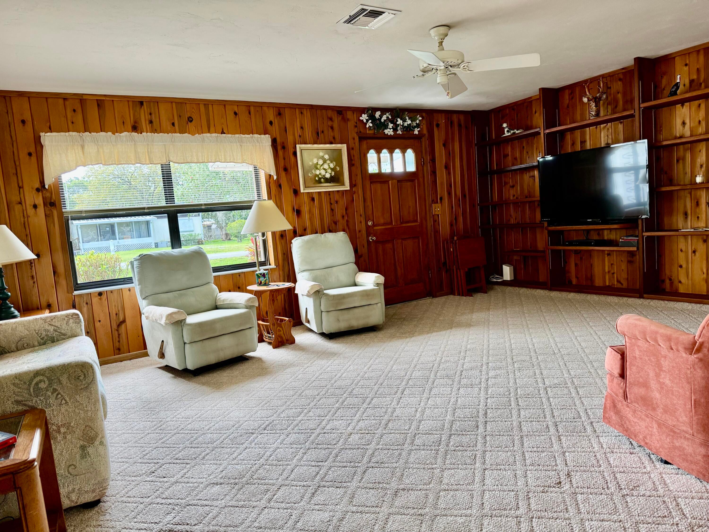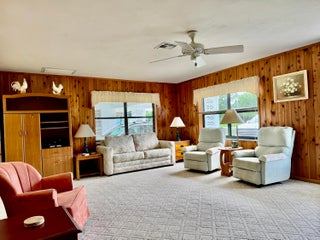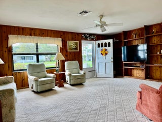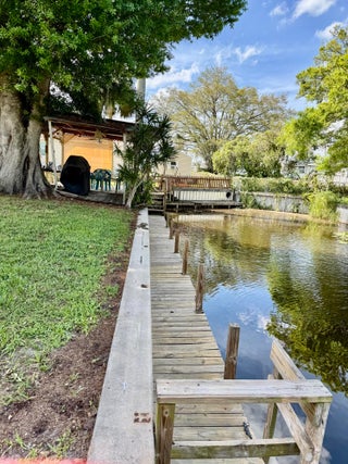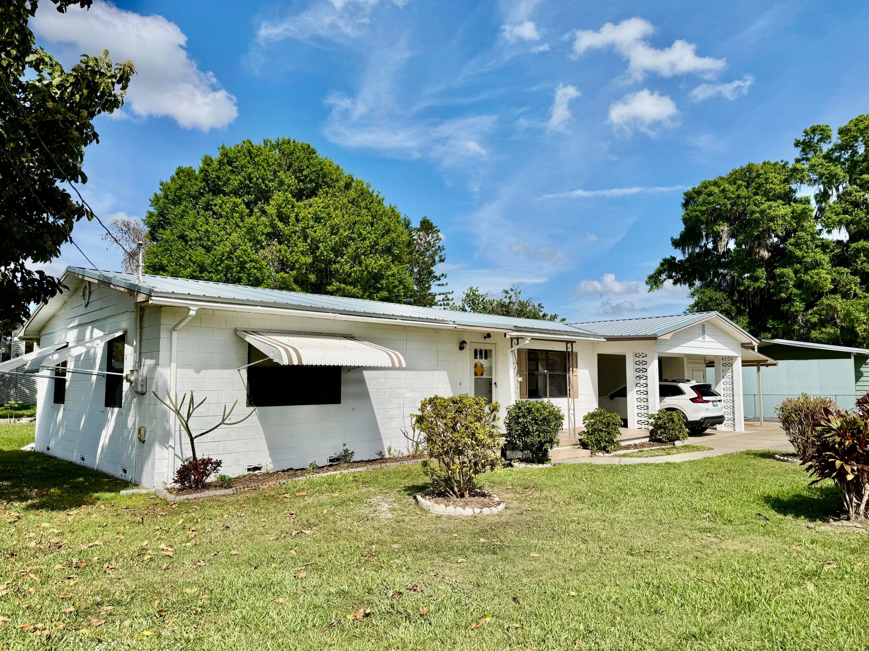 SERENITY with TAYLOR CREEK and Lake ''O''access! CBS home. Bright and cheery 2 Bd/ 2 Ba/ double carport and exceptional storage. Beautiful tongue and groove pine accent walls. Open concept, newer kitchen, corian counters, library pantry, built in desk. New wall oven and DW. This home is made for entertaining with the 14x32 Florida room with built in bar w/ seating for 5-6 w/ panoramic view of the water. Water softener. Bocce Ball court. (What FUN!) 19x10 covered party dock. Solid seawall. Metal roof 2023, AC 2017. Beautifully maintained! DON'T LET THIS ONE GET AWAY! Dimensions are approximate, must measure for exact.