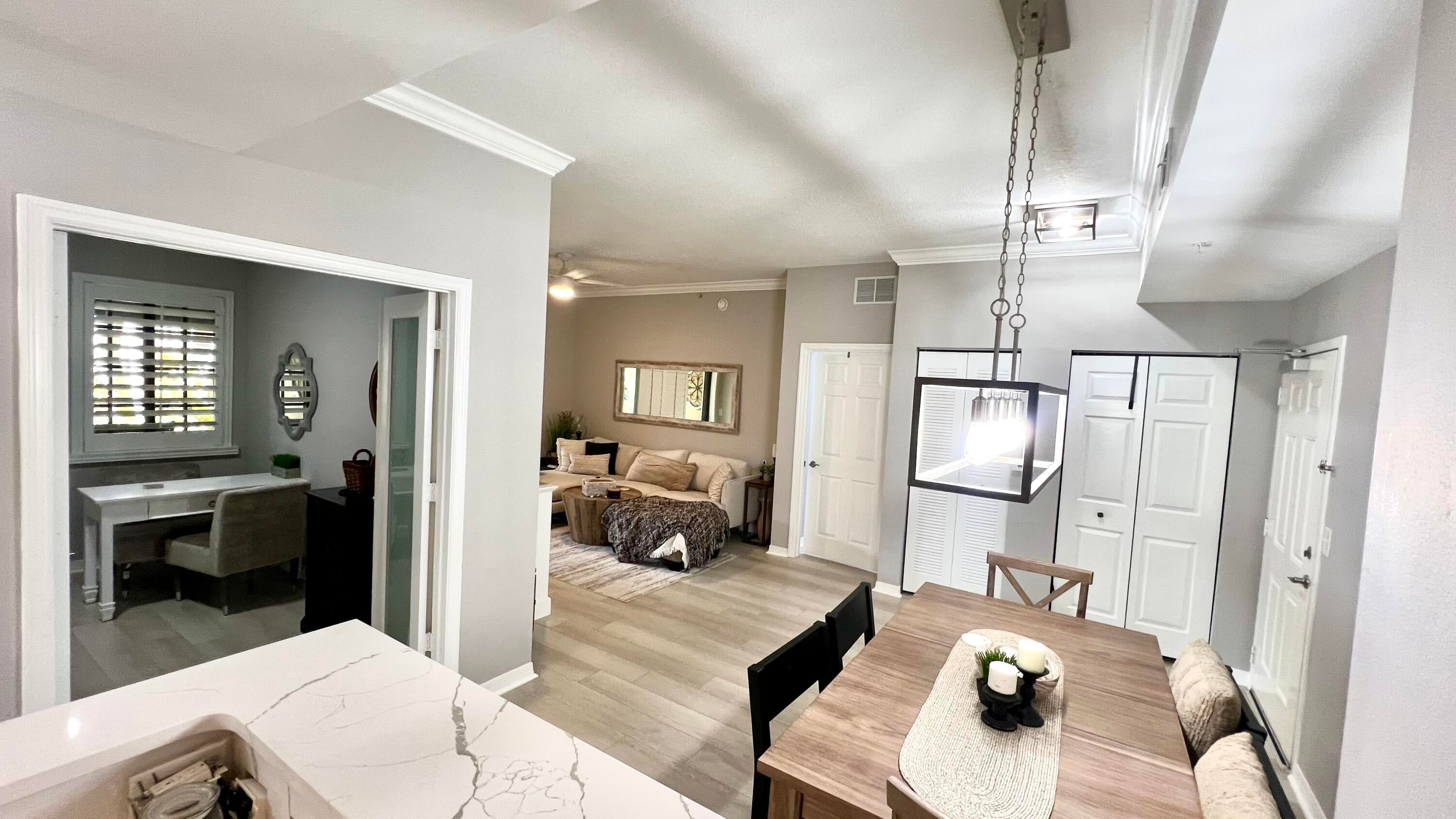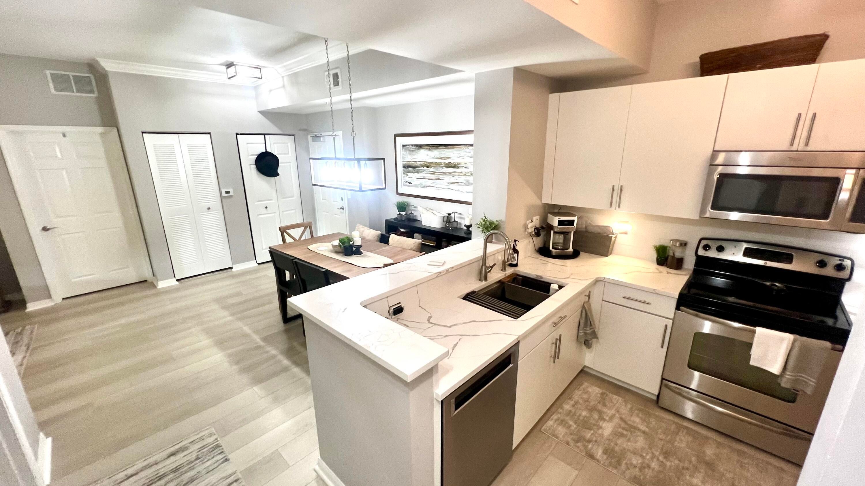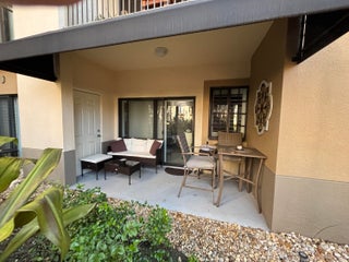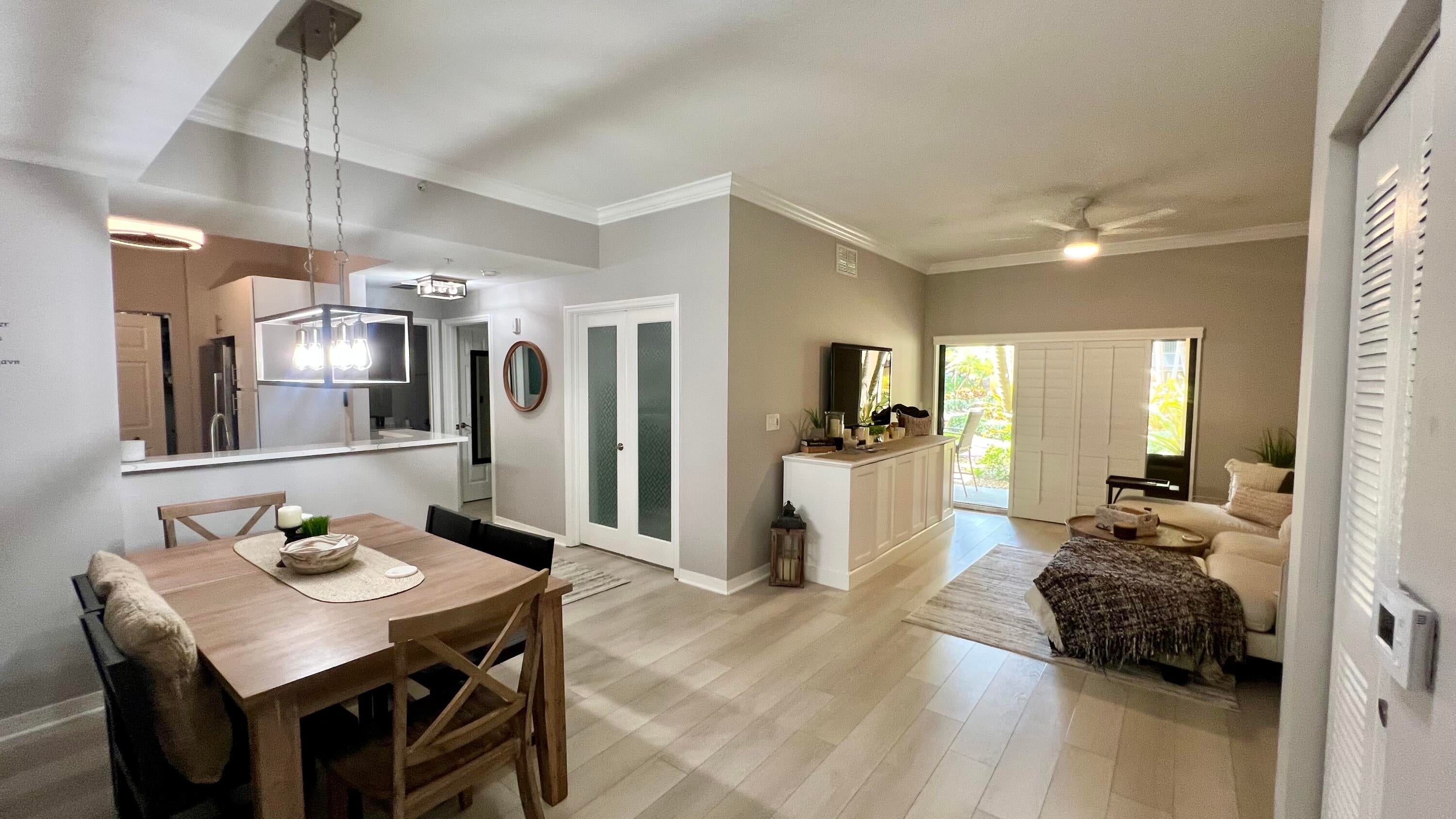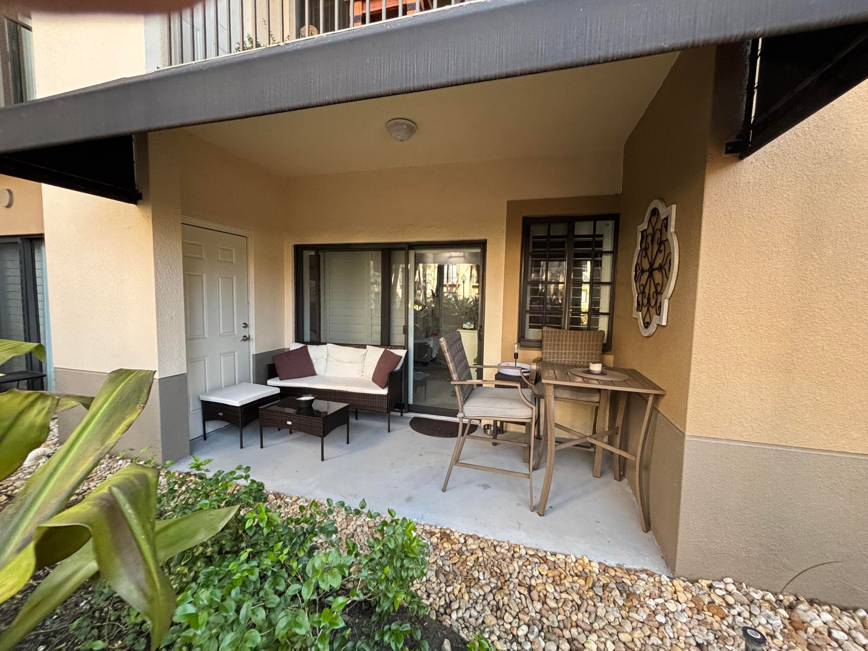 Rarely available 1st floor 3 BEDROOM end unit Move-in Ready with brand new quartz counter tops, kitchen pantry, refrigerator, APEC UV-PH water system, Light fixtures, Fans, HVAC and flooring. NO CARPET! Enjoy easy living lifestyle with your first floor location by skipping the need to take an elevator/stairs and long hallways! This home includes a large covered private patio overlooking lushly landscaped courtyard and 2 garage parking spots. Amenities include gym, clubhouse, pool, spa, tennis and a lakefront dog walk. Water & Sewer included in HOA fee. Impact windows & doors. Short walk to shops, dining, entertainment & Fresh Market. Furniture negotiable. Quick access to Beach, Golf, PGA National resort & I95 *Owner-Agent.