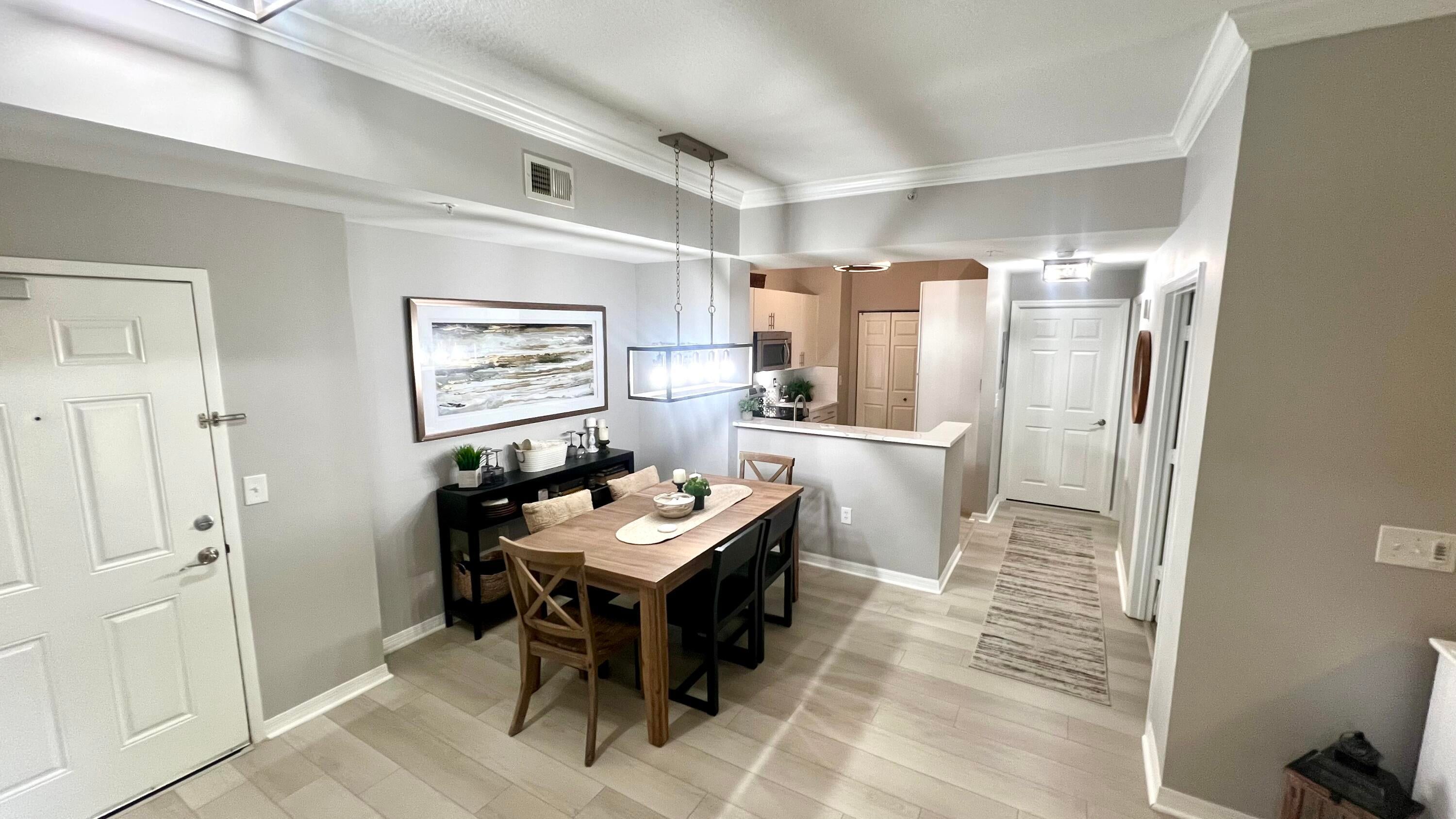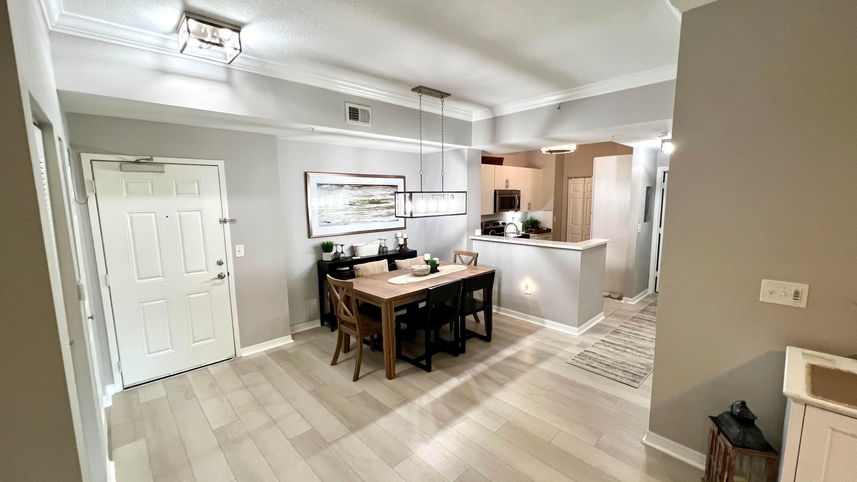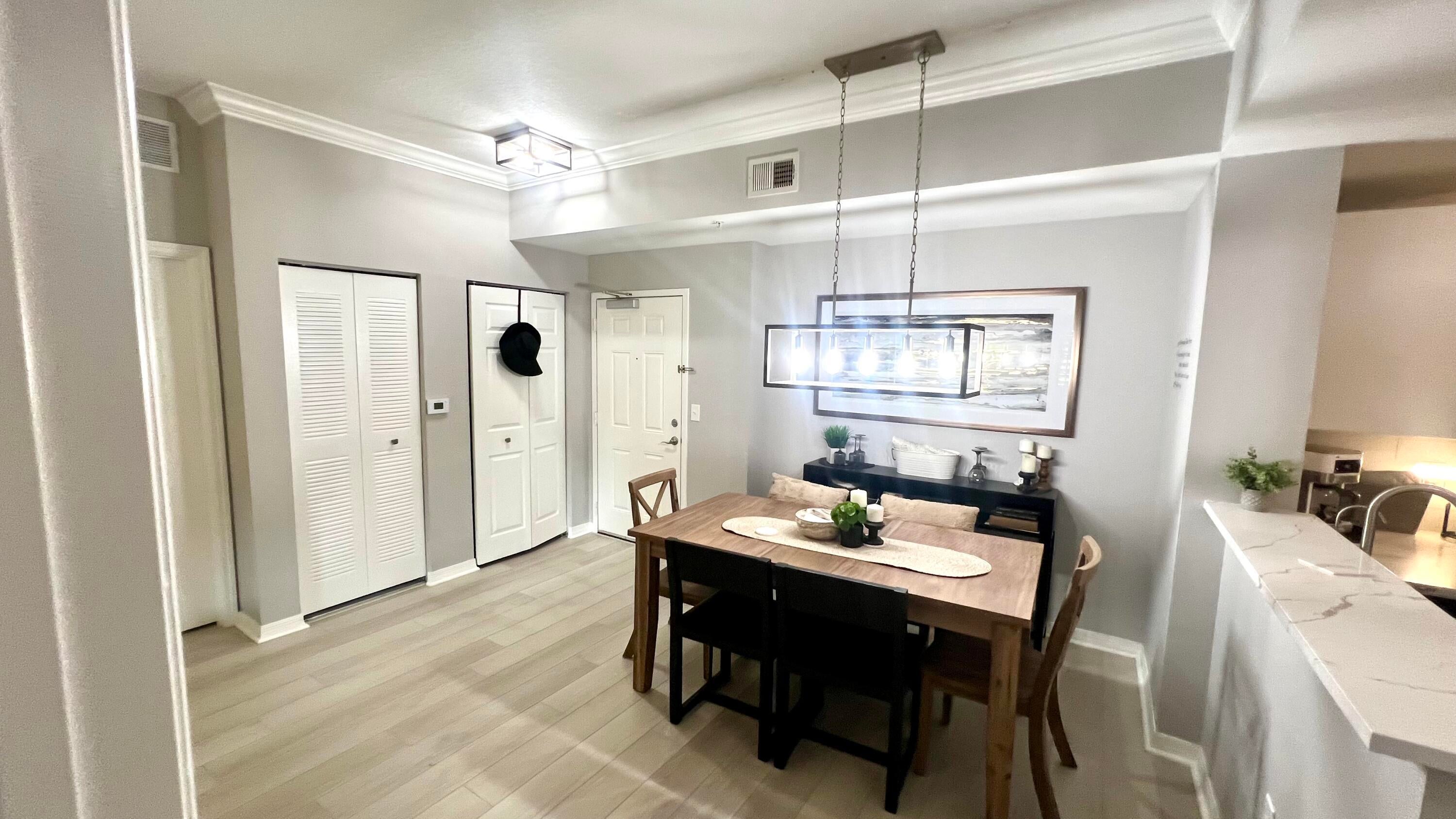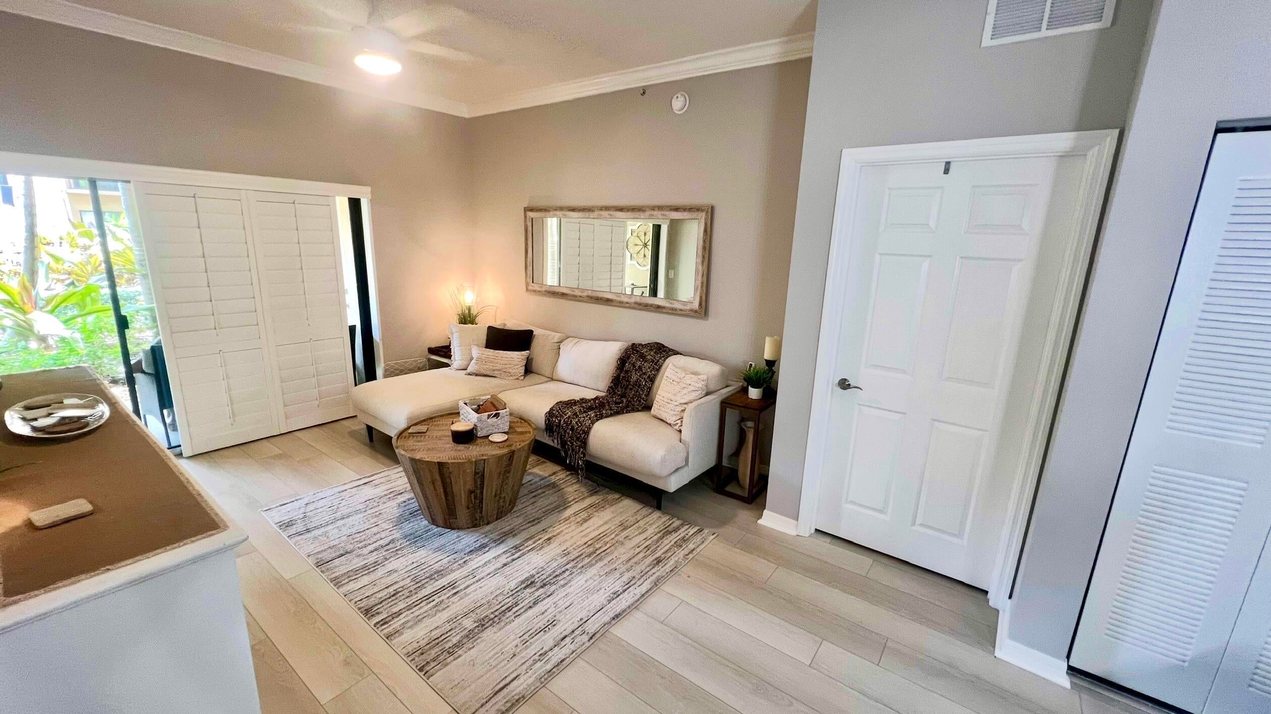 Rarely available 1st floor 3 BEDROOM end unit Move-in Ready with brand new quartz counter tops, kitchen pantry, refrigerator, APEC UV-PH water system, Light fixtures, Fans, HVAC and flooring. NO CARPET! Enjoy easy living lifestyle with your first floor location by skipping the need to take an elevator/stairs and long hallways! This home includes a large covered private patio overlooking lushly landscaped courtyard and 2 garage parking spots. Amenities include gym, clubhouse, pool, spa, tennis and a lakefront dog walk. Water & Sewer included in HOA fee. Impact windows & doors. Short walk to shops, dining, entertainment & Fresh Market. Furniture negotiable. Quick access to Beach, Golf, PGA National resort & I95 *Owner-Agent.
