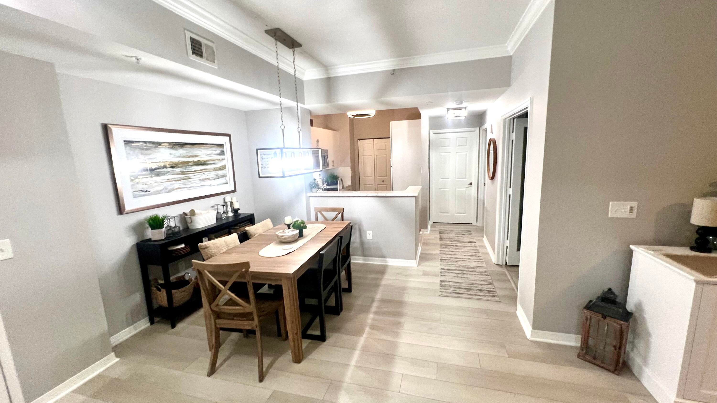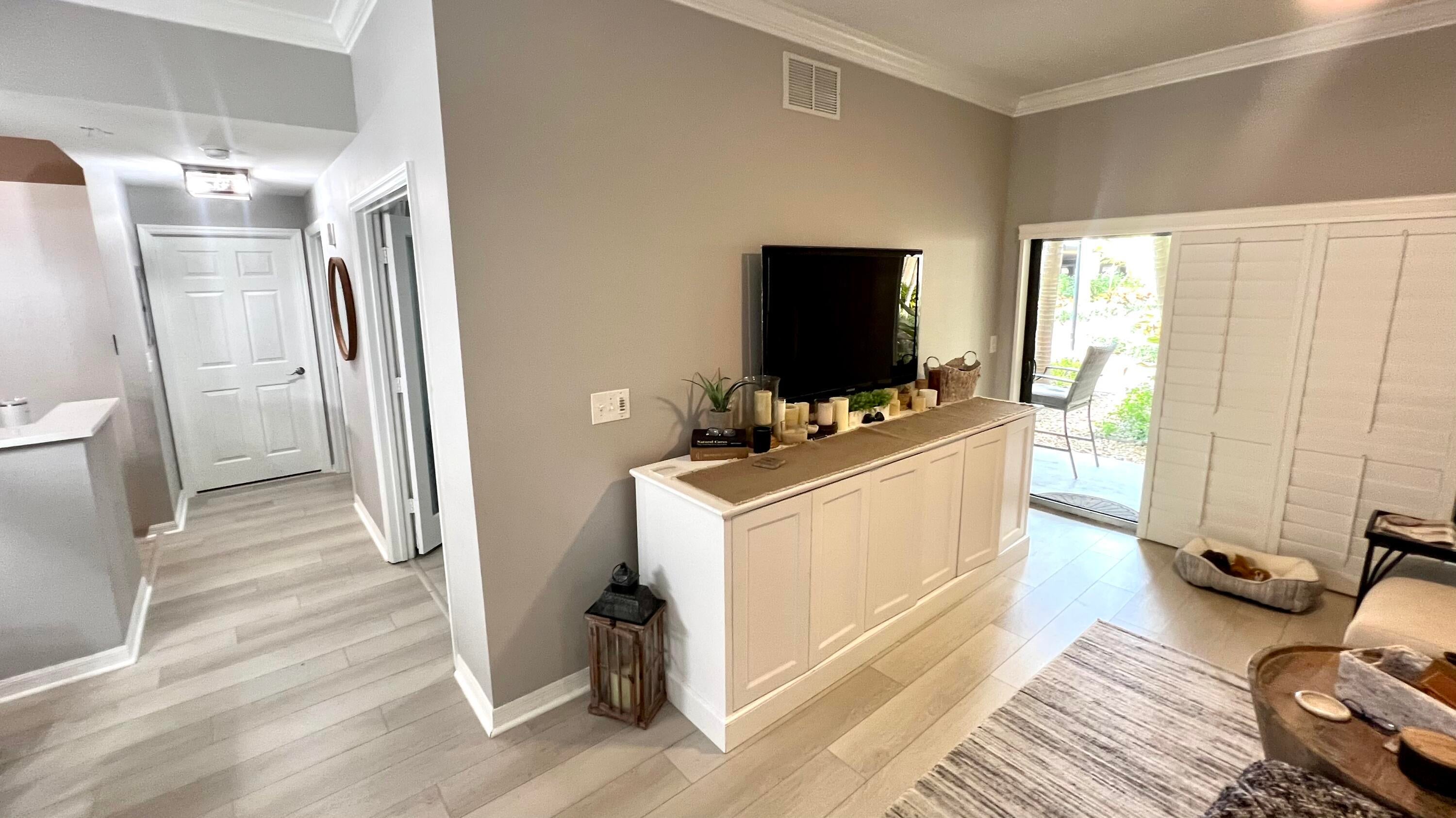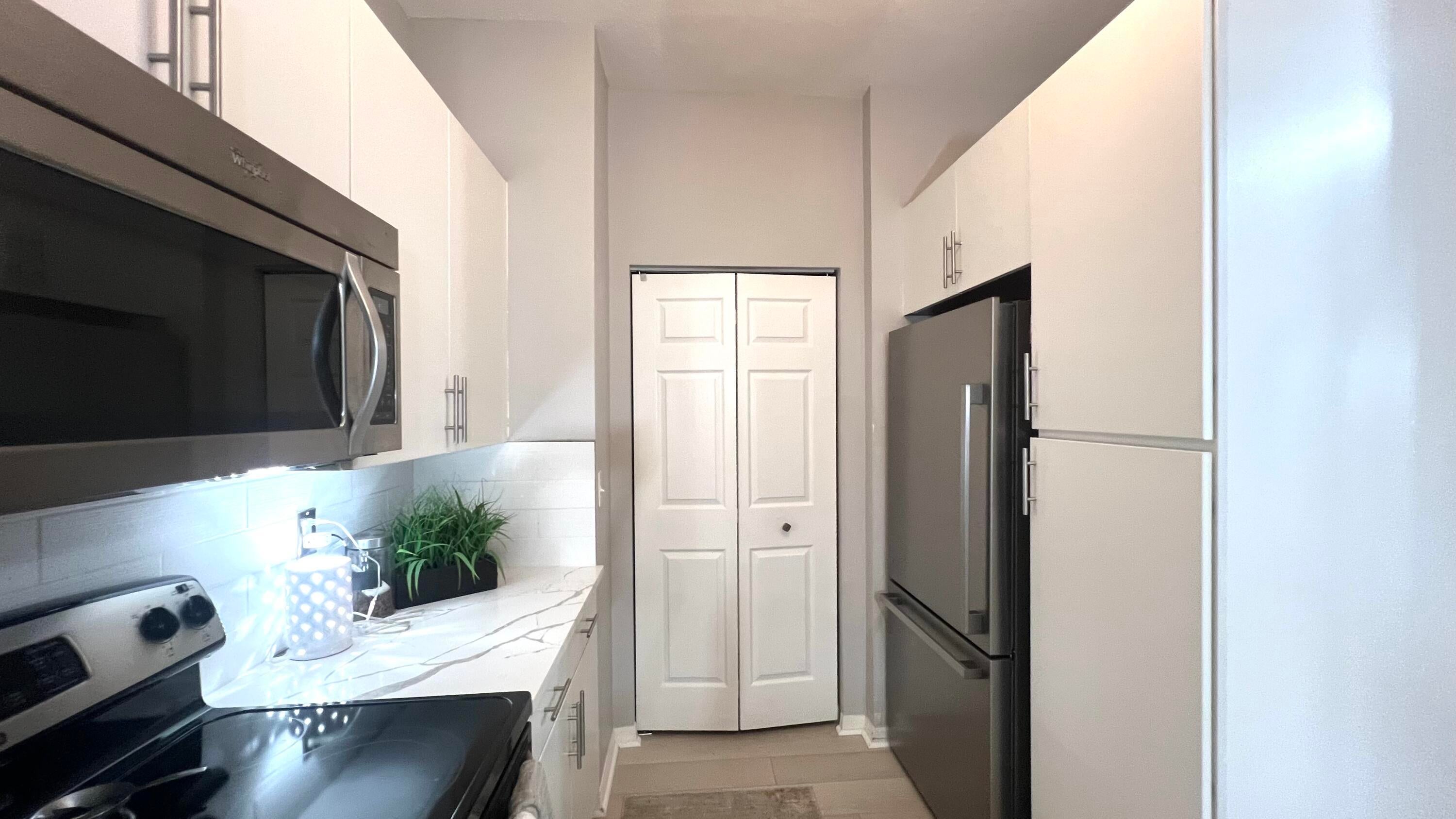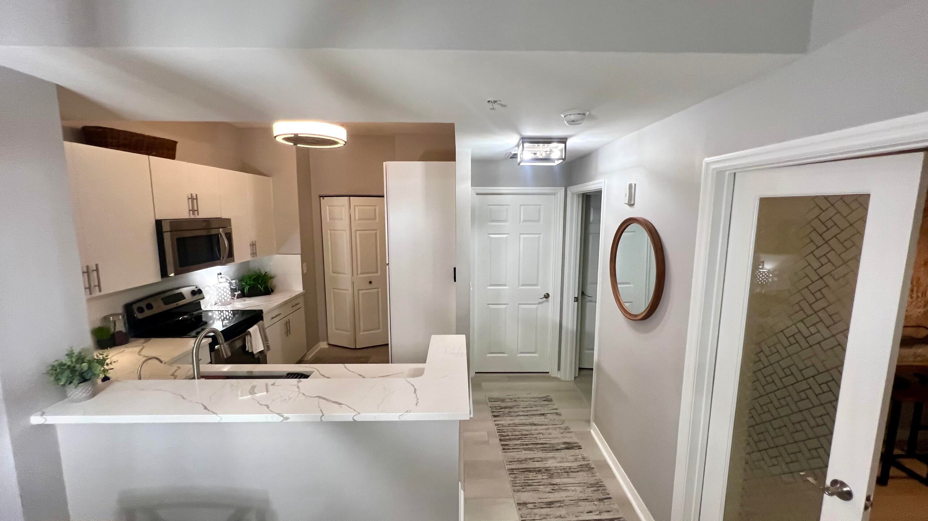 Rarely available 1st floor 3 BEDROOM end unit Move-in Ready with brand new quartz counter tops, kitchen pantry, refrigerator, APEC UV-PH water system, Light fixtures, Fans, HVAC and flooring. NO CARPET! Enjoy easy living lifestyle with your first floor location by skipping the need to take an elevator/stairs and long hallways! This home includes a large covered private patio overlooking lushly landscaped courtyard and 2 garage parking spots. Amenities include gym, clubhouse, pool, spa, tennis and a lakefront dog walk. Water & Sewer included in HOA fee. Impact windows & doors. Short walk to shops, dining, entertainment & Fresh Market. Furniture negotiable. Quick access to Beach, Golf, PGA National resort & I95 *Owner-Agent.