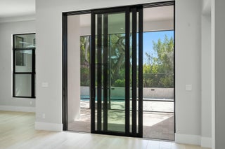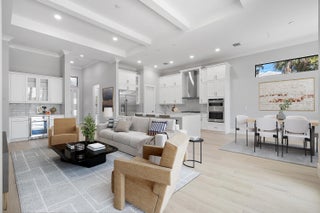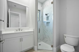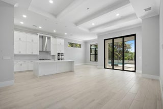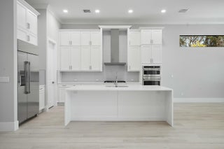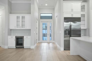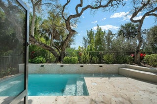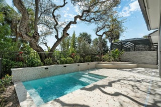 The Seabreeze Grande, a 4-bedroom, 3-bath villa with over 2366 finished square feet, offering the ultimate in-island living. Nestled in a charming Florida setting surrounded by lush landscaping, this home boasts an exquisite pool including 3-24'' sheer descent waterfalls and a built-in wrap-around bench surrounded by lush landscaping, perfect for embracing the carefree island lifestyle. The covered patio is screened in with rail fencing around the pool area. And a retractable screen on patio. Exceptional finishes include solid core interior doors, Arhus Classic Blanco wood-look tile flooring, volume ceilings, bay window in bedroom 2, quartz countertops, under-cabinet lighting, high-end Cafe appliances, Bar area with a beverage refrigerator. With the added option of a 4th bedroom or den