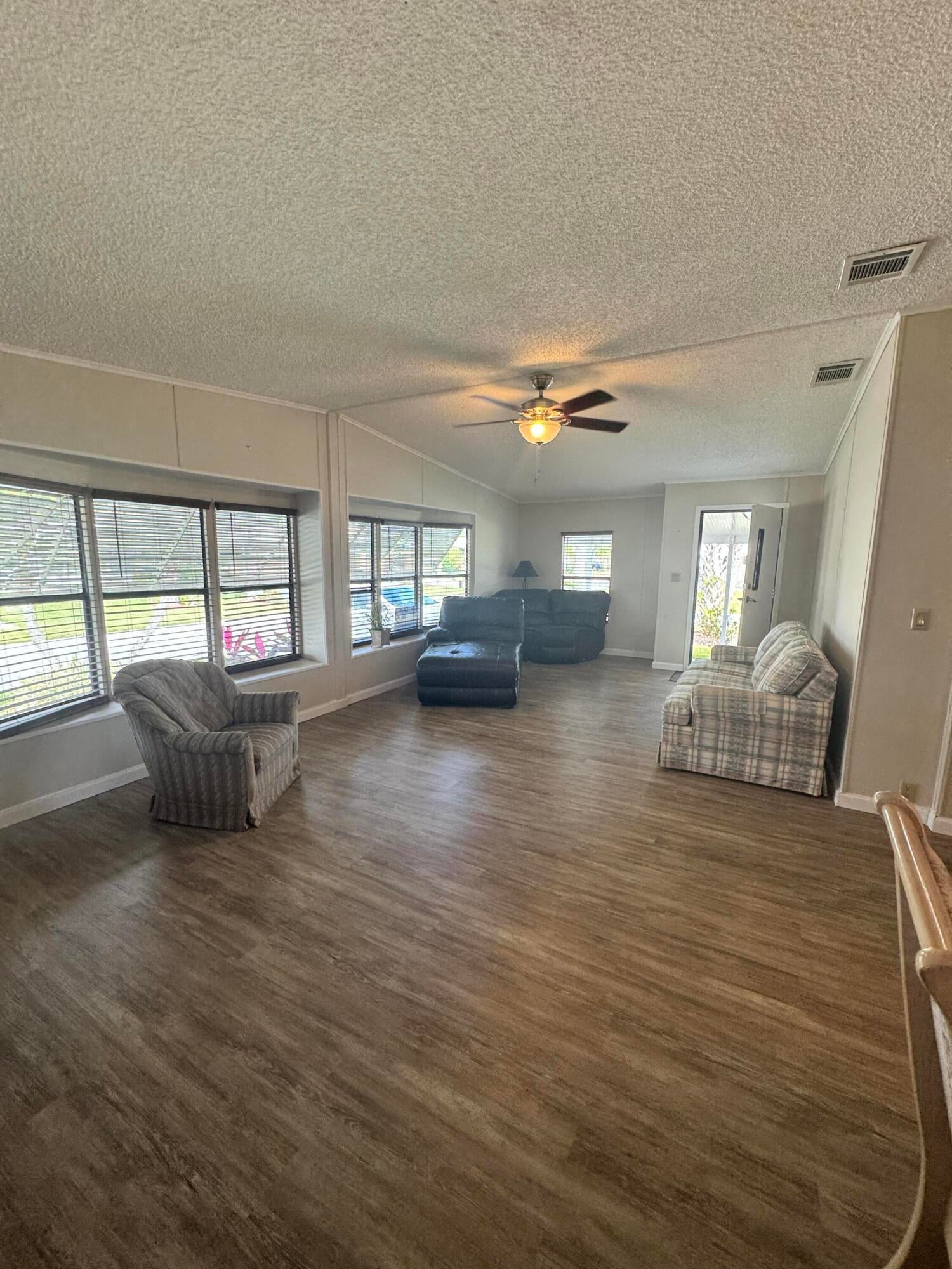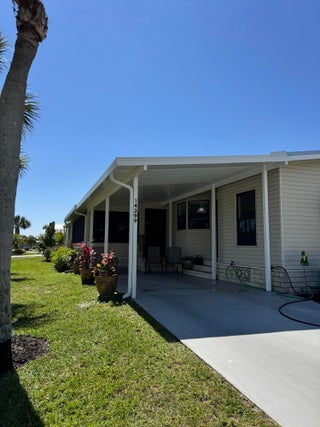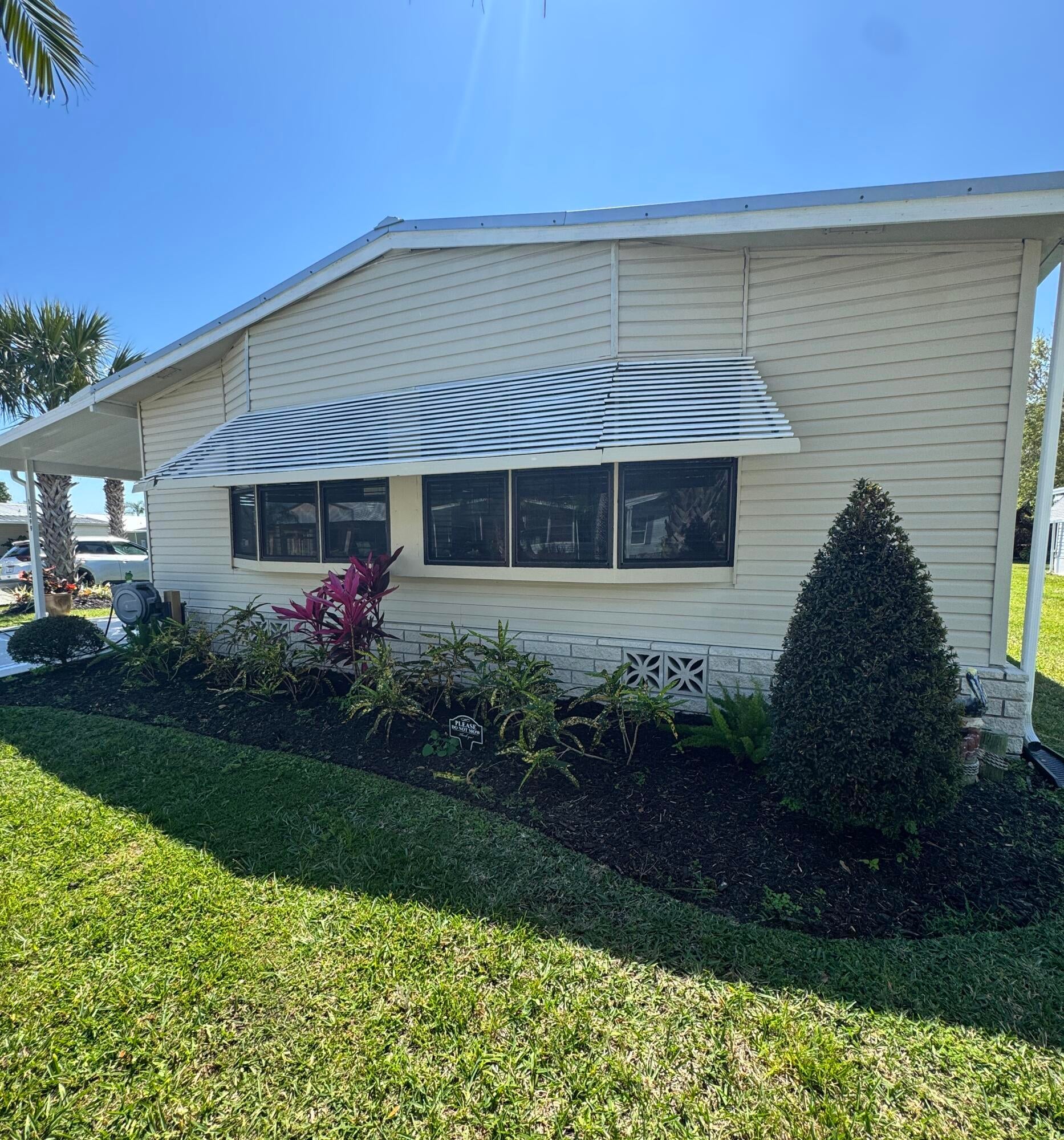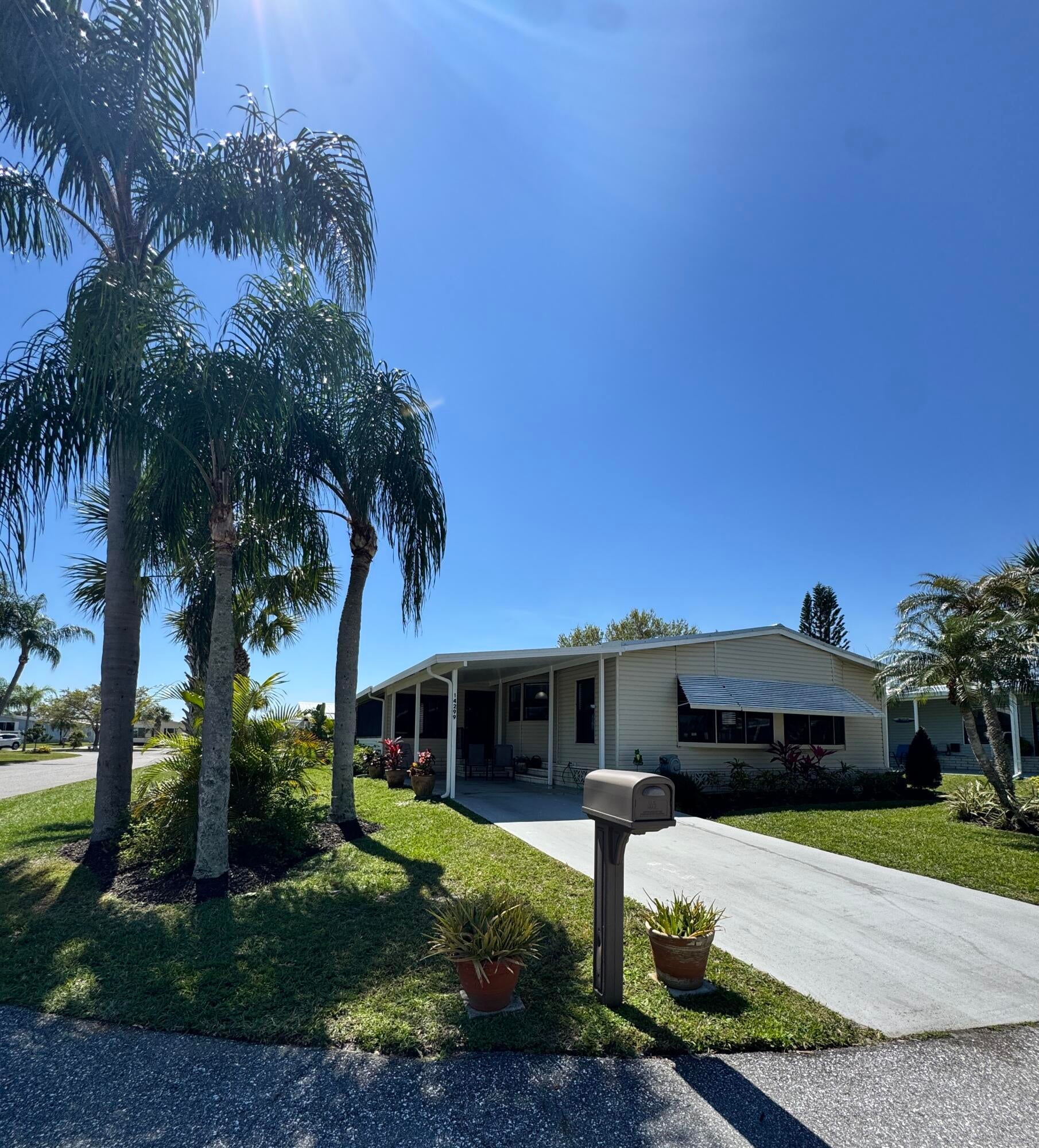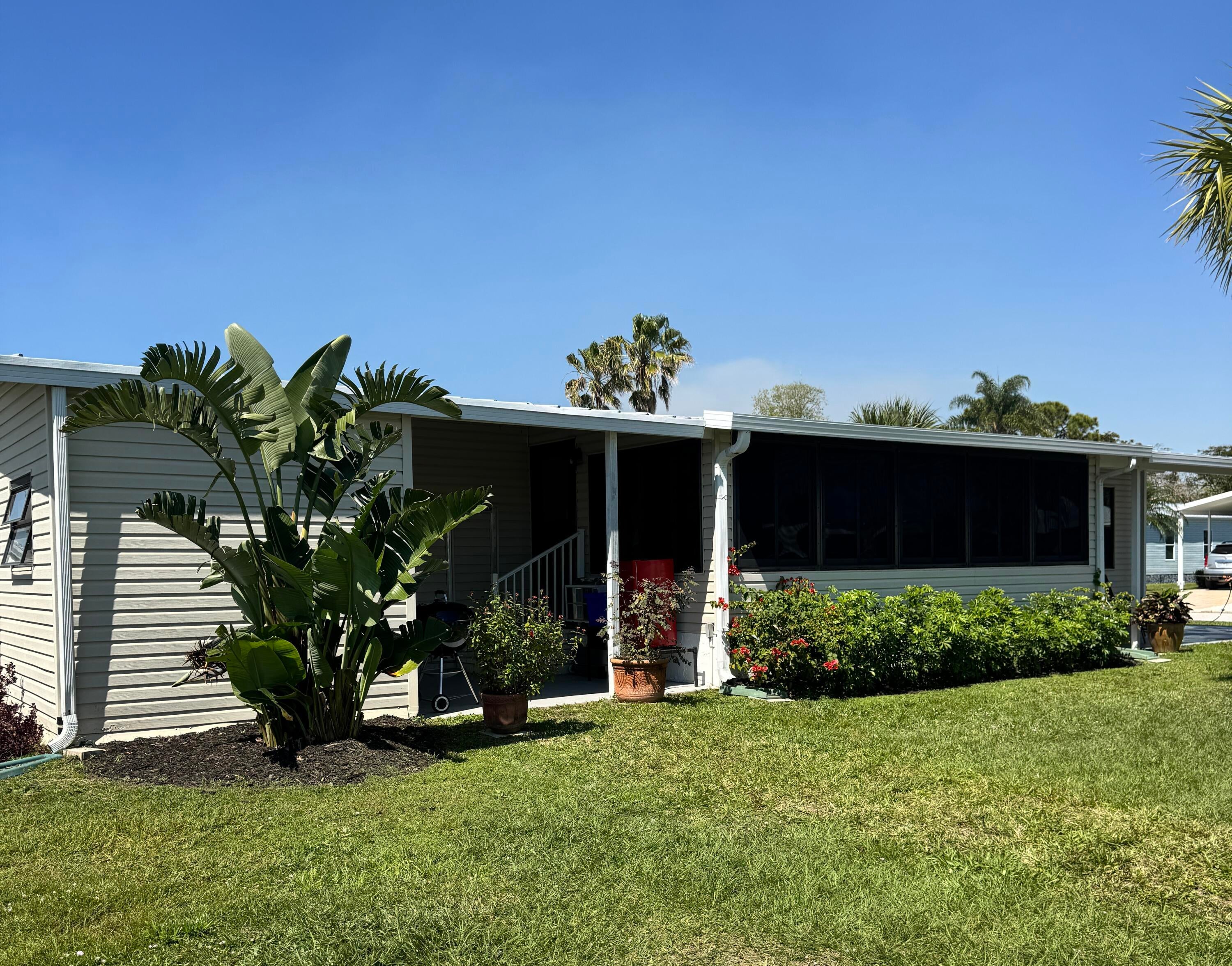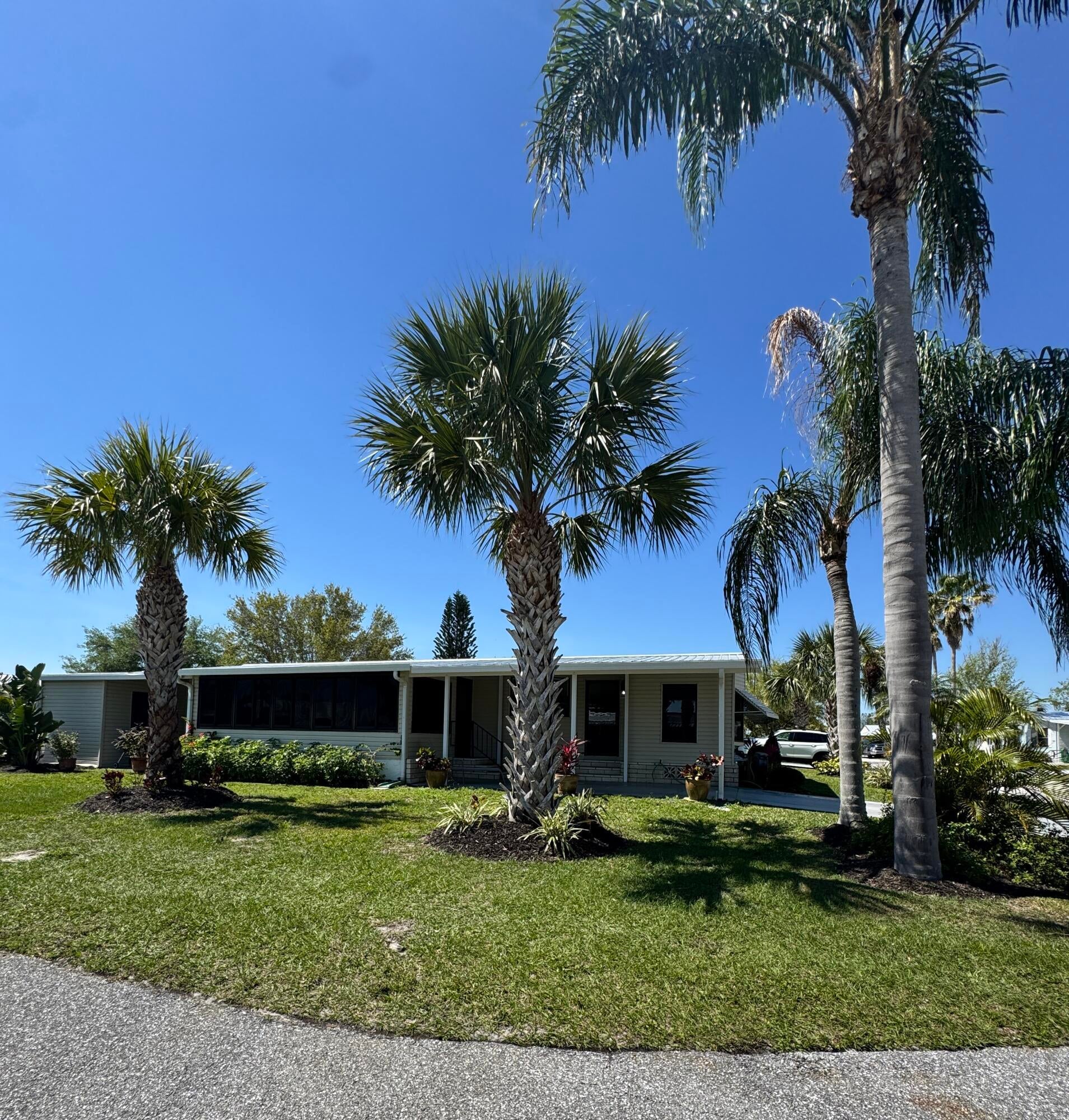Lovely 2 bedroom 2 bath home in the desirable 55+ Spanish Lakes Fairways community. Home sits on a corner lot with beautiful landscaping. Home is an open floor plan with open kitchen. Living room and family room. Screened in patio with wall A/C for enjoying morning coffee or evening cocktails No carpet in home. New ceiling fans, new sink in kitchen. Updated cabinets. Appliances refrigerator and dishwasher 2024. Built in shelves for added storage. Metal roof 2022. new motor in A/C. Tie downs under home have been replaced. Home is being sold unfurnished. Lawn care and trash removal included in lot rent. 2 pools, tennis, pickleball, bocceball, shuffle board, golf 18 hole golf course. club house and much more. MUST SEE!