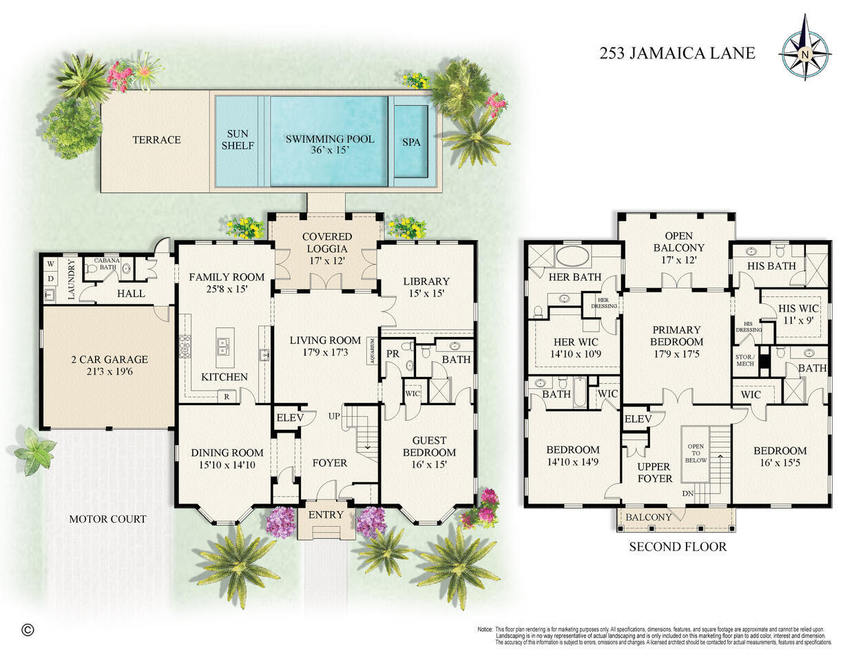 Welcome to 253 Jamaica Lane, a like-new Colonial residence on the North End of Palm Beach Island. Built in 2016 by Shapiro Pertnoy Companies and designed beautifully by Hive, this property offers 4 bedrooms, 5.2 bathrooms, a top-of-the-line Chef's kitchen, an elevator, fish tank, impact glass, a 2 car garage, and heated pool/spa. Boasting a vast outdoor pool loggia accessible through French doors in all the main level rooms, this pristine tropical residence also features a Gourmet chef's kitchen which opens into the family room, a gorgeous library or office. The primary suite includes a balcony, dual baths, and custom walk-in closets.Situated at a truly prime North End location only steps to the Beach Club, the Palm Beach Country Club, and the Sailfish Club of Florida, 253 Jamaica Lane additionally provides same-street access to the Lake Trail. This coastal oasis, which exemplifies the quintessential, idyllic lifestyle that Palm Beach Island has become known for, is all just a few short minutes to town. DISCLAIMER: Information published or otherwise provided by the listing company and its representatives including but not limited to prices, measurements, square footages, lot sizes, calculations, statistics, and videos are deemed reliable but are not guaranteed and are subject to errors, omissions or changes without notice. All such information should be independently verified by any prospective purchaser or seller. Parties should perform their own due diligence to verify such information prior to a sale or listing. Listing company expressly disclaims any warranty or representation regarding such information. Prices published are either list price, sold price, and/or last asking price. The listing company participates in the Multiple Listing Service and IDX. The properties published as listed and sold are not necessarily exclusive to listing company and may be listed or have sold with other members of the Multiple Listing Service. Transactions where listing company represented both buyers and sellers are calculated as two sales. "No payments made until title passes" Some affiliations may not be applicable to certain geographic areas. If your property is currently listed with another broker, please disregard any solicitation for services. Information published or otherwise provided by seller, listing company or its representatives is deemed reliable but are not guaranteed and subject to errors, omissions, or changes without notice. Copyright 2025 by the listing company. All Rights Reserved.