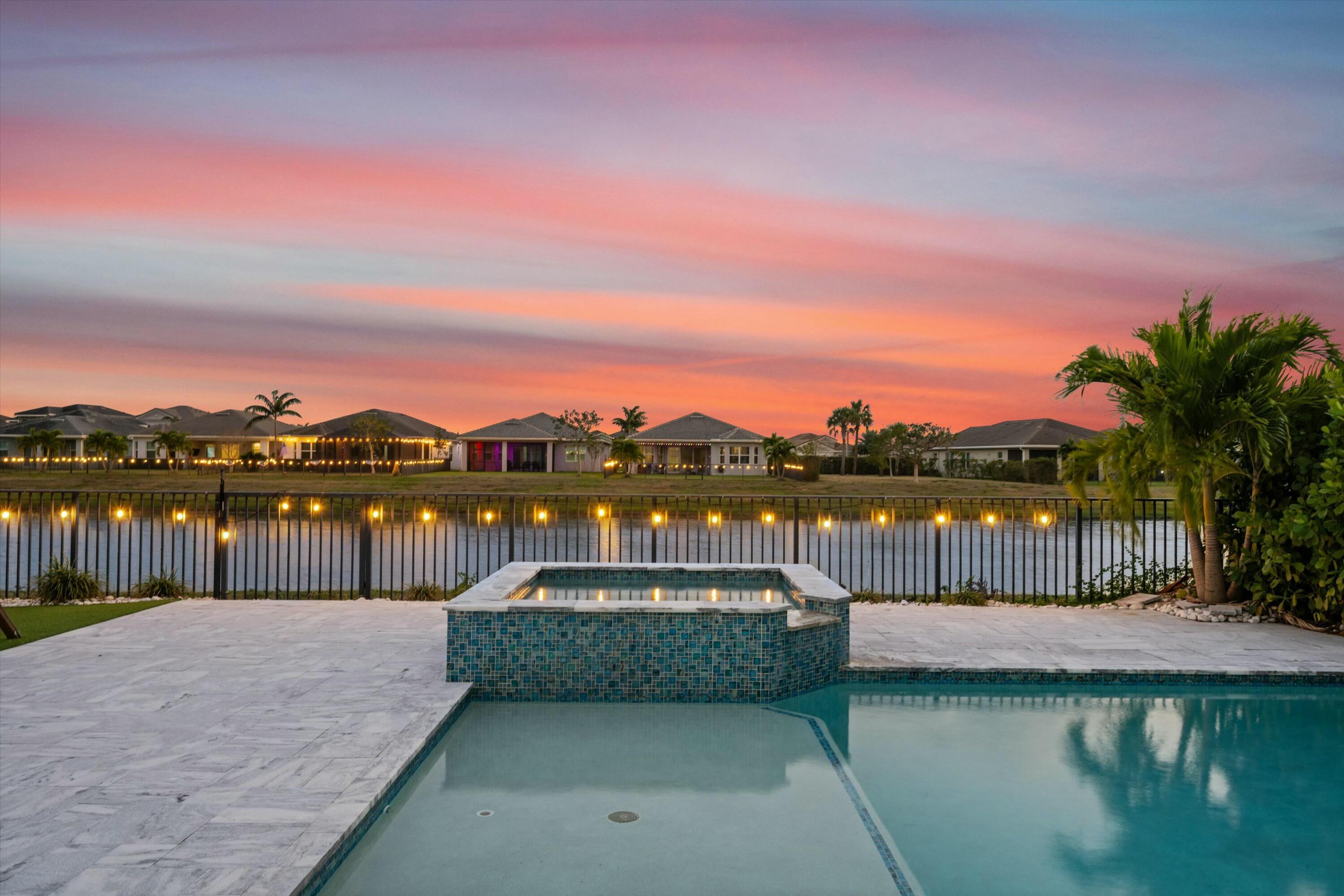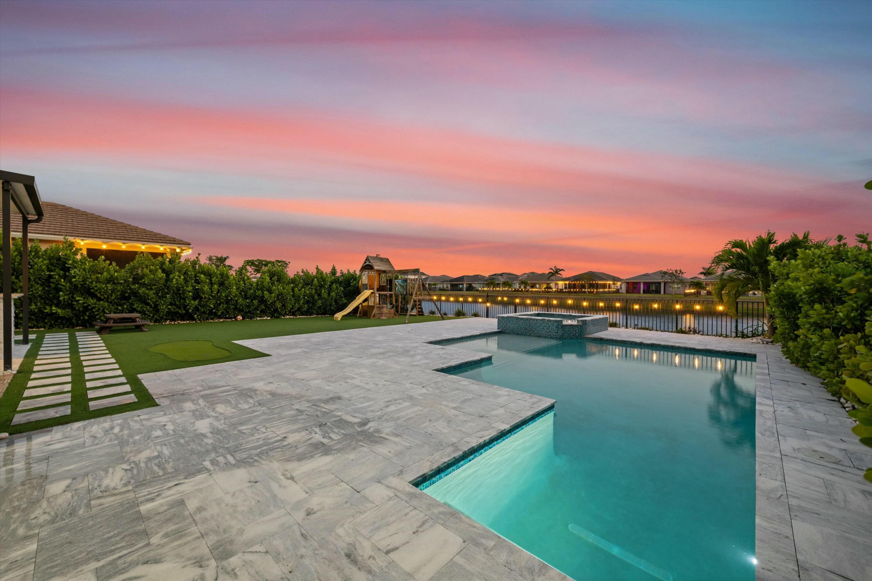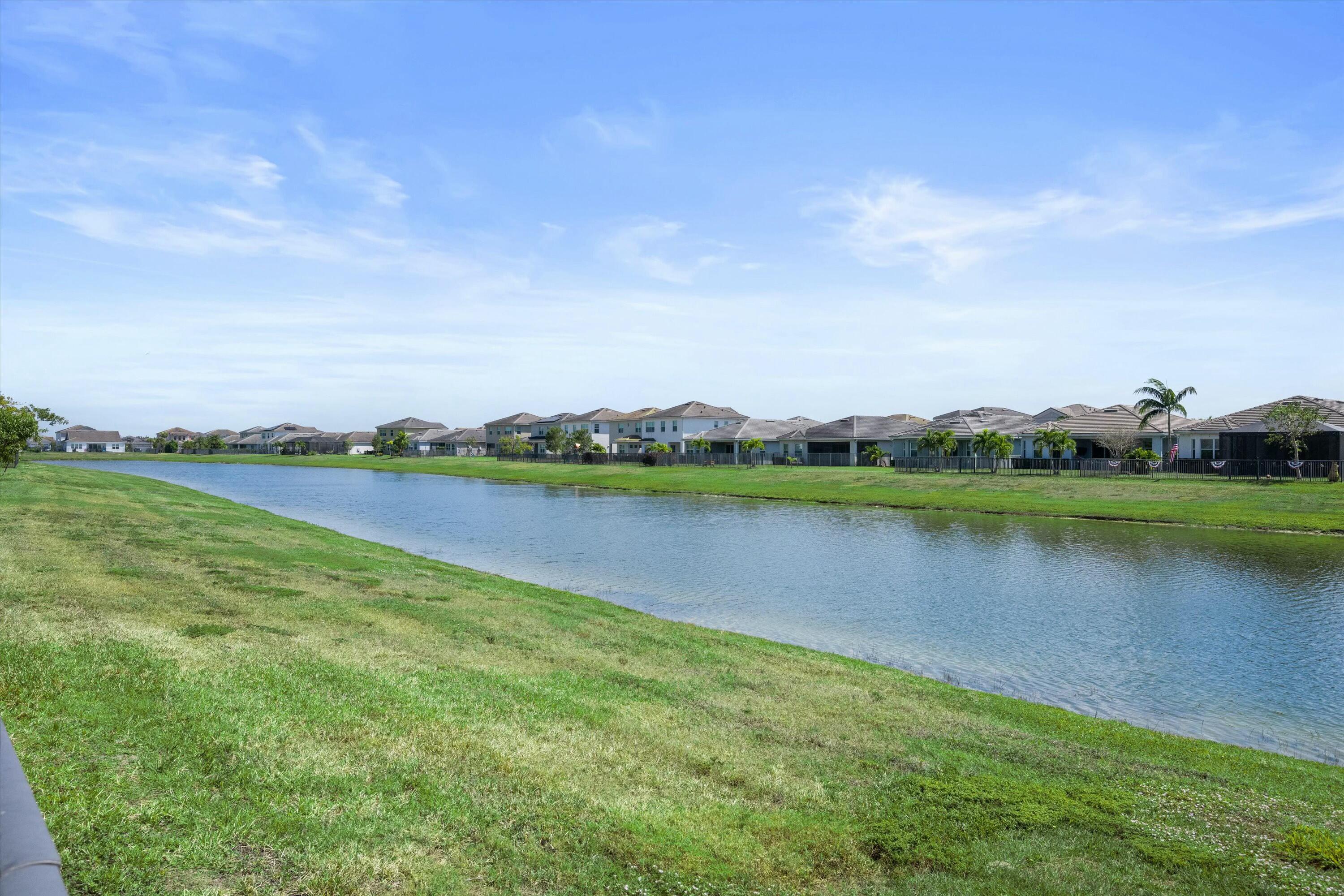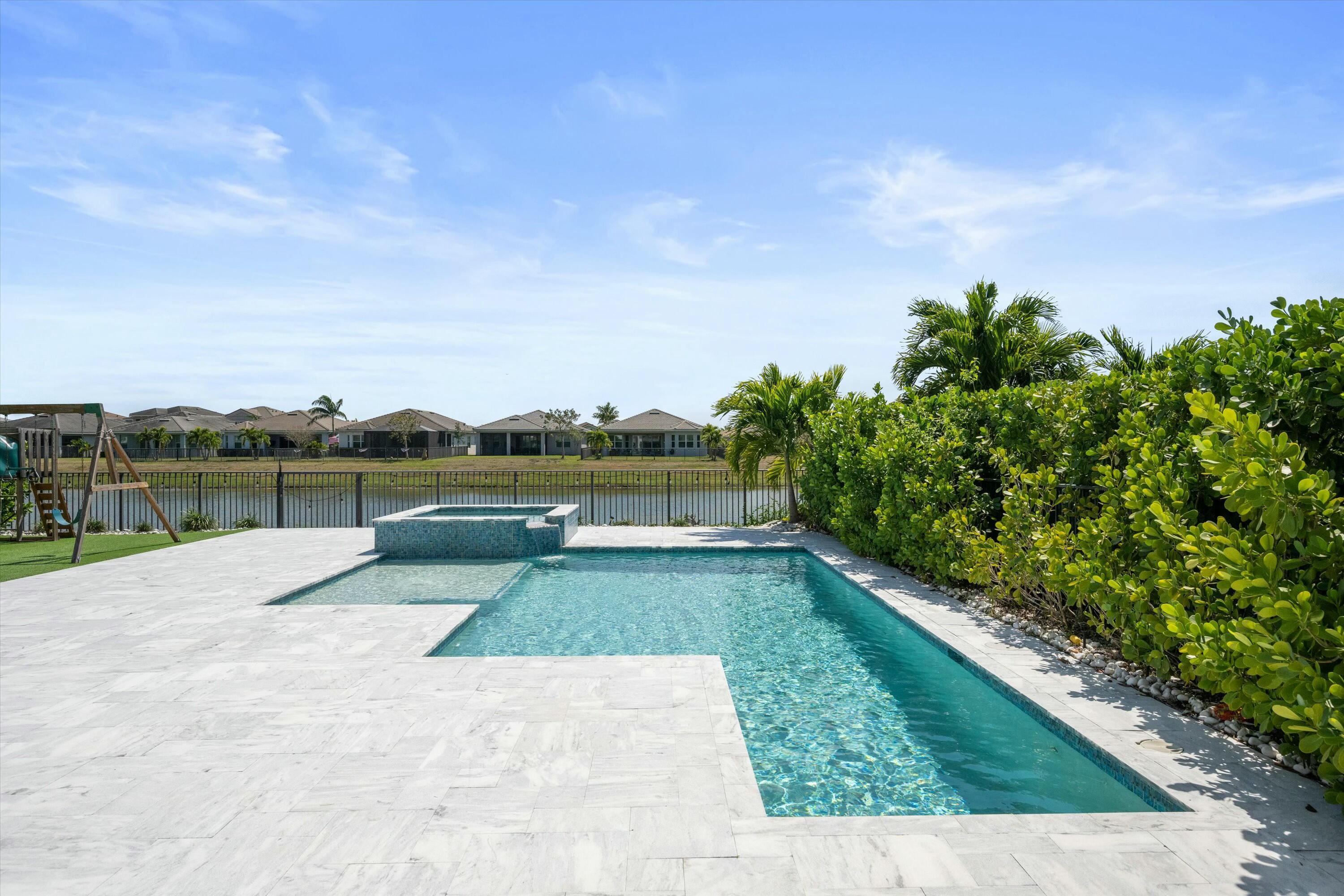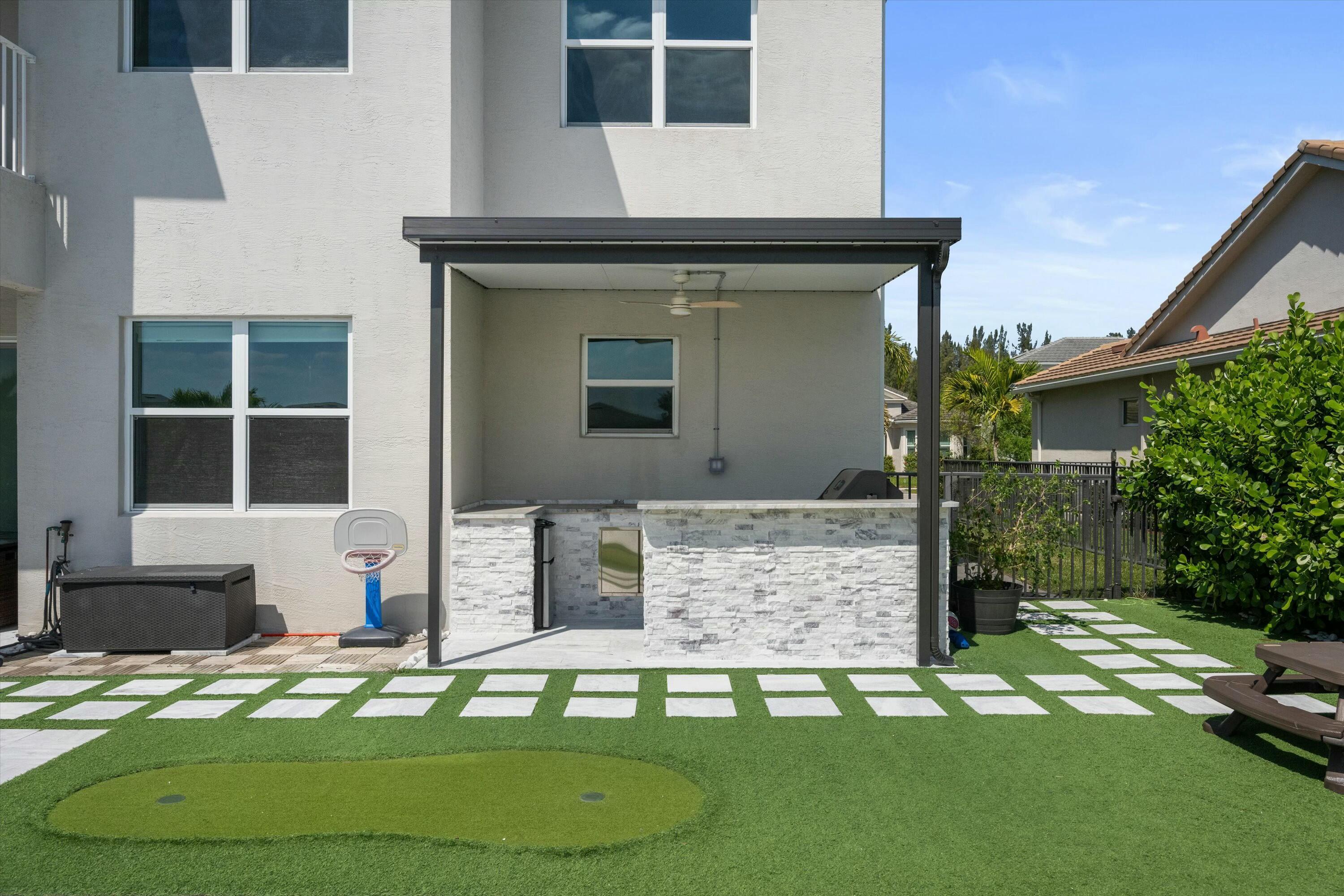 Experience luxury living in this stunning Laurel Model home, located in the prestigious Meadows community of Westlake, FL. This 5-bedroom, 3-bathroom, 2-story residence boasts impact windows throughout, ensuring safety and energy efficiency,complemented by 33 solar panels for exceptional sustainability and reduced energy costs. With 3,071 sq. ft. of living space, a 3-car garage, and a salted and heated pool and spa, this home offers an unparalleled blend of elegance and functionality. The backyard was meticulously designed to ensure maximum yard space, outdoor kitchen and still plenty of yard space for entertaining and playing.As you step inside, you're greeted by soaring ceilings, sleek porcelain tile flooring, and custom designer finishes. The heart of the home is the gourmet kitchen, which showcases black quartz countertops, white shaker-style cabinetry, and a striking marble mosaic backsplash. The oversized island with additional seating is perfect for entertaining, while modern pendant lighting enhances the space. Additional upgrades include a hood exhaust, upgraded refrigerator and dishwasher, and a hidden bookshelf door leading to a spacious pantry. The open-concept living area is anchored by a stunning faux feature wall with a built-in electric fireplace and TV, adding warmth and sophistication. Expansive sliding glass doors lead to the resort-style backyard, creating the ideal indoor-outdoor living experience. The sprawling master suite is a true retreat, complete with a separate sitting area, plush carpeting, and private access to the premium covered balcony overlooking the serene water views. The spa-inspired en-suite bathroom boasts dual granite vanities, espresso-toned cabinetry, a deep soaking tub, and a frameless glass-enclosed shower with floor-to-ceiling tiles. The massive walk-in closet provides ample storage. The additional bedrooms feature carpeted flooring and generous closet space, with one bedroom offering an en-suite bathroom. Step outside to the fully fenced backyard oasis, featuring approximately 1,000 sq. ft. of lush artificial turf, a playground, and stunning landscape enhancements such as backyard clusias, a palm tree, a critter fence, and white stone decor. Enjoy the salted and heated resort-style pool with a raised spa and sun shelf. The expansive travertine deck, stone pathway alongside the house, and breathtaking water views create an idyllic outdoor escape. The covered patio with a built-in gas fire pit and a spectacular custom outdoor kitchen, featuring an expensive infrared grill, custom U-shaped island with decor stones, multiple storage doors, drawer cabinet, sink provision, refrigerator, and bar area, makes outdoor dining a breeze. Additional highlights include concrete flooring between floors for noise reduction, garage floor epoxy, garage ceiling racks, ceiling fans, designer ceiling light fixtures, window shades, smart light switches, faux wall decors, solar panels (33 total), and a gas line. The laundry room boasts black granite counters, wood cabinetry, and a deep utility sink. Located in Westlake's premier community, The Meadows, residents enjoy resort-style amenities, parks, and top-rated schools. Don't miss this exceptional luxury homeschedule your private tour today!