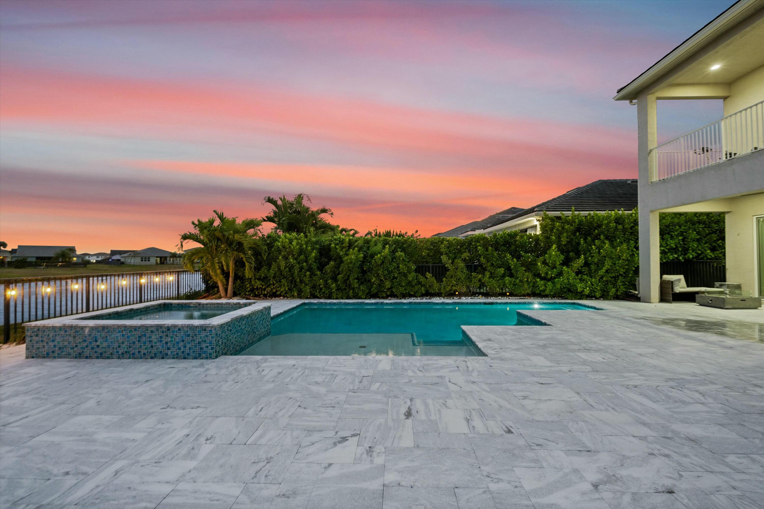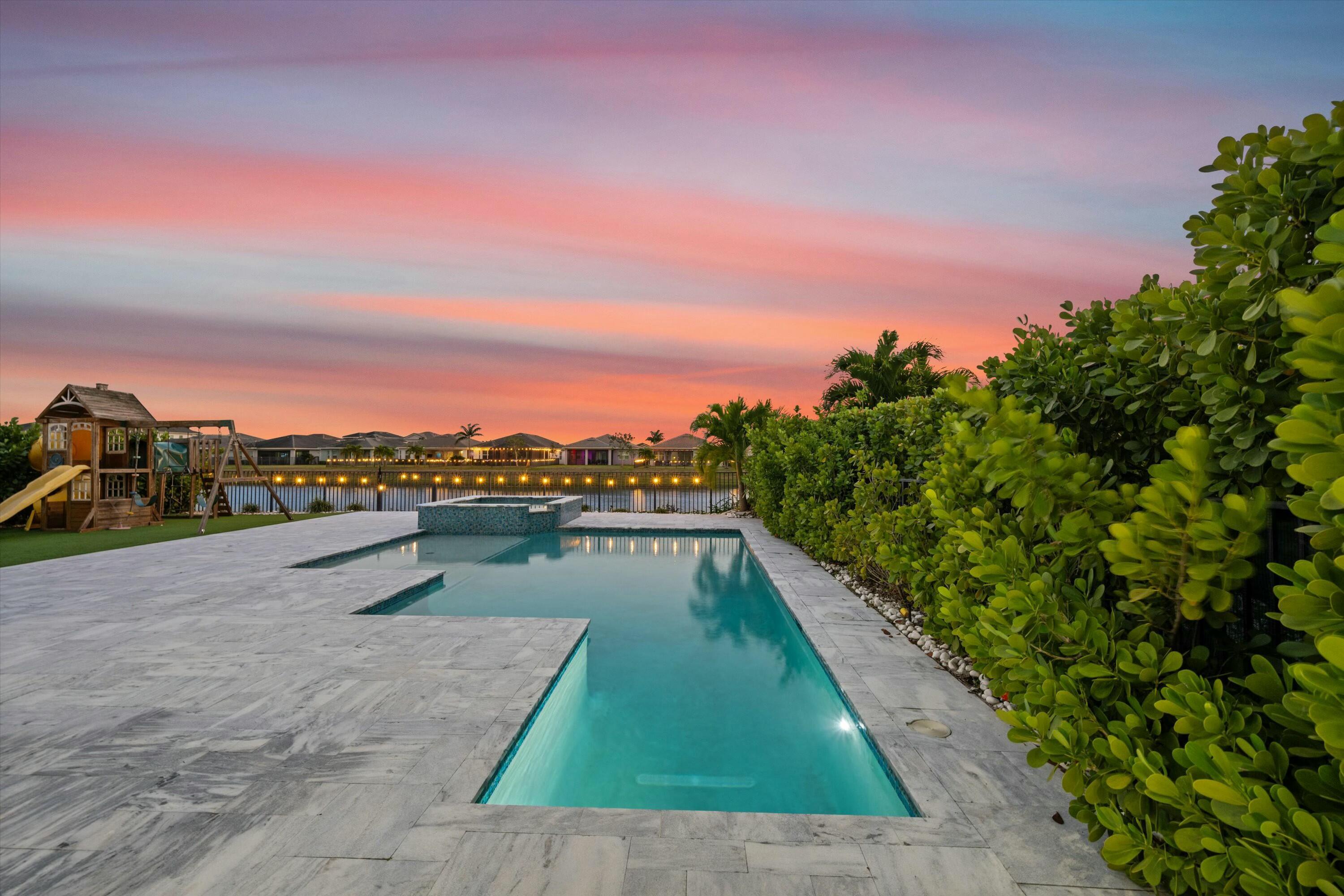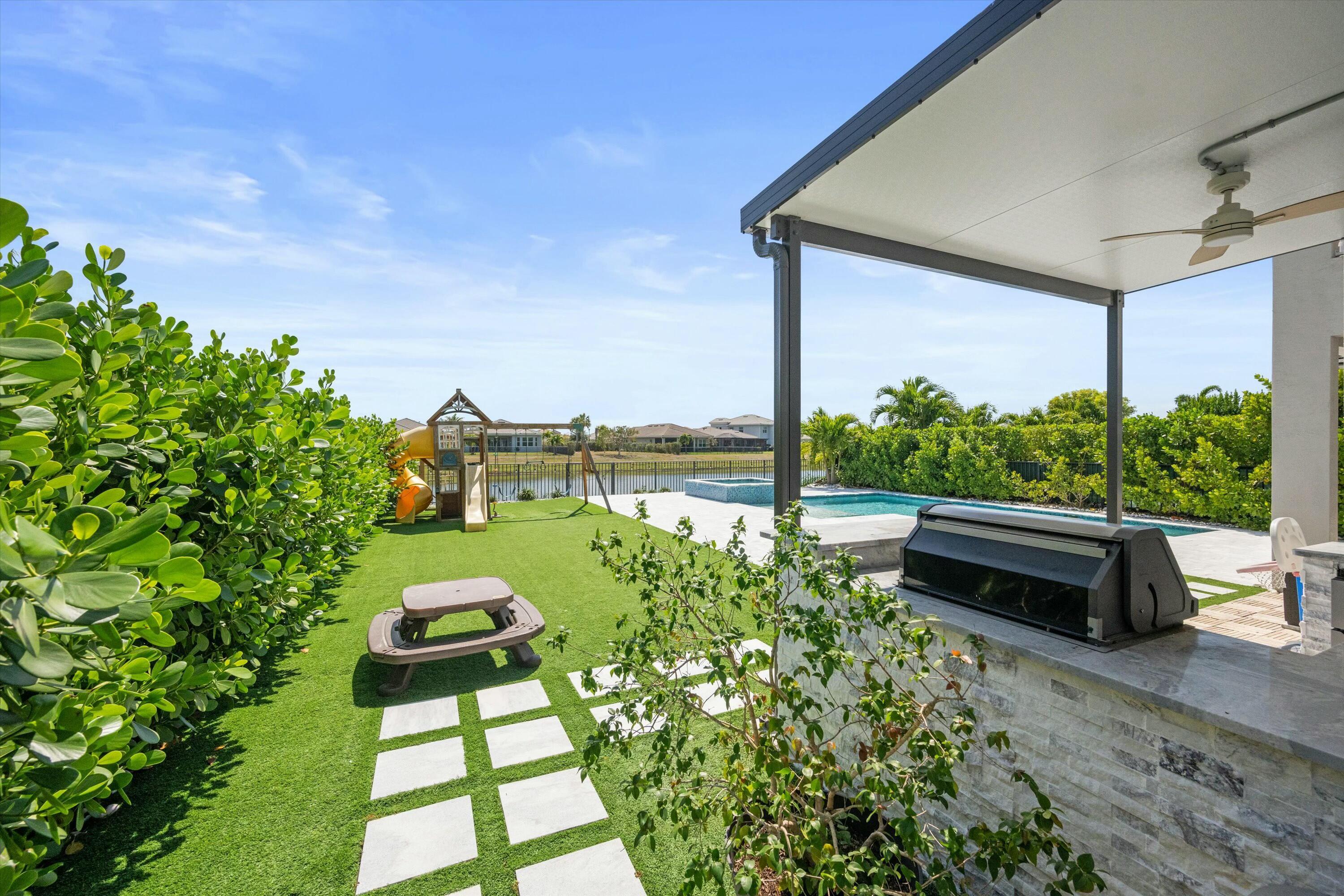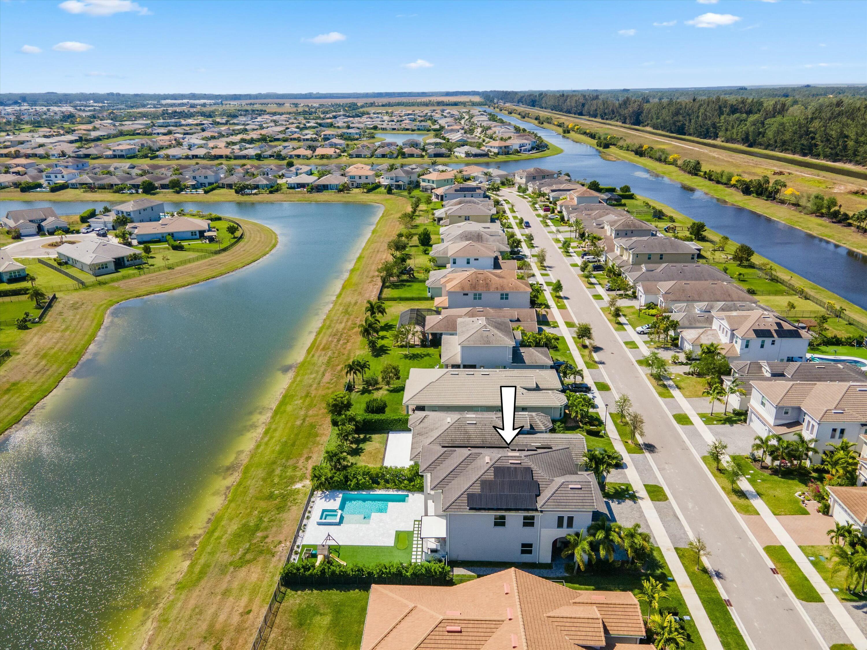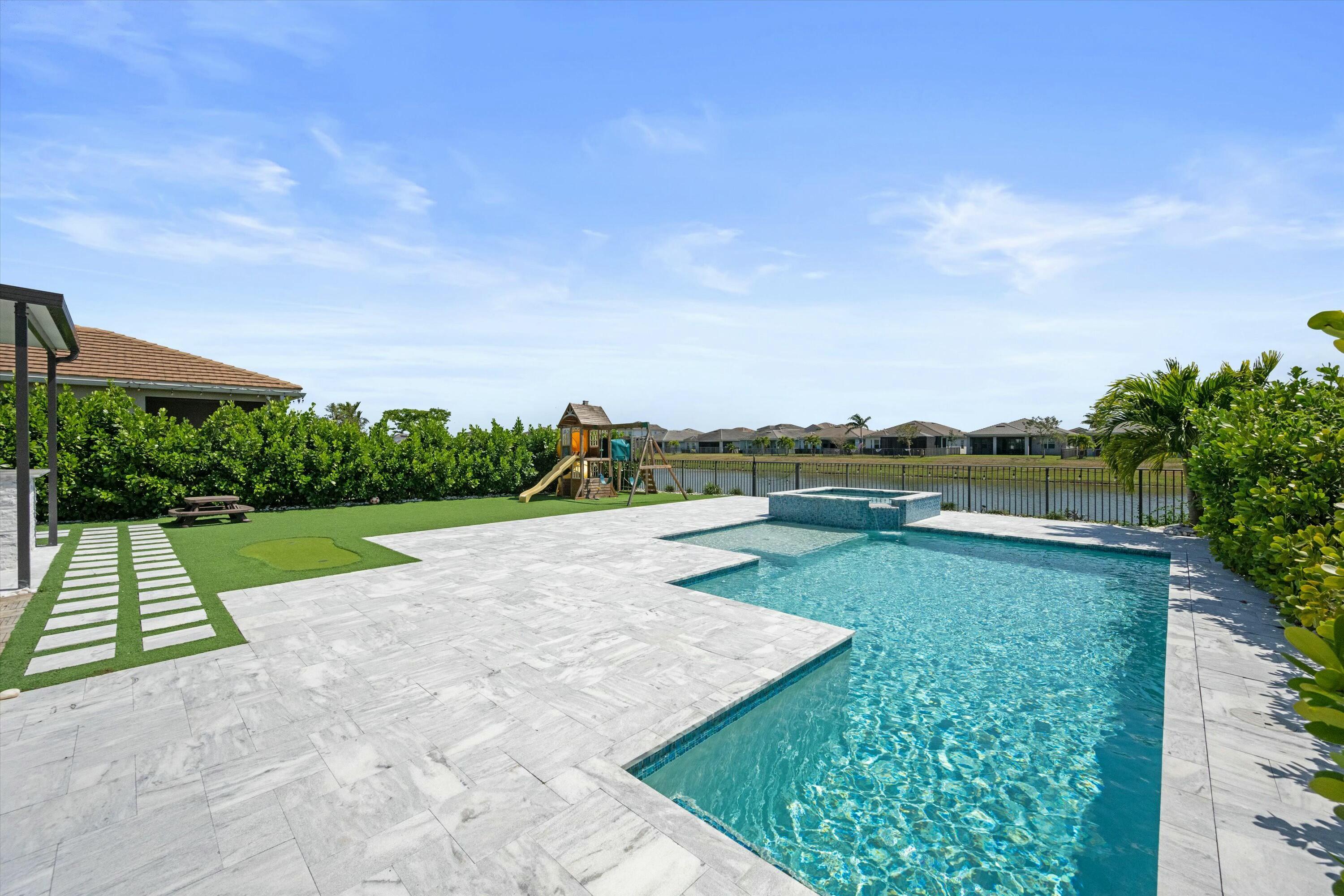 Experience luxury living in this stunning Laurel Model home, located in the prestigious Meadows community of Westlake, FL. This 5-bedroom, 3-bathroom, 2-story residence boasts impact windows throughout, ensuring safety and energy efficiency,complemented by 33 solar panels for exceptional sustainability and reduced energy costs. With 3,071 sq. ft. of living space, a 3-car garage, and a salted and heated pool and spa, this home offers an unparalleled blend of elegance and functionality. The backyard was meticulously designed to ensure maximum yard space, outdoor kitchen and still plenty of yard space for entertaining and playing.As you step inside, you're greeted by soaring ceilings, sleek porcelain tile flooring, and custom designer finishes. The heart of the home is the gourmet kitchen, which showcases black quartz countertops, white shaker-style cabinetry, and a striking marble mosaic backsplash. The oversized island with additional seating is perfect for entertaining, while modern pendant lighting enhances the space. Additional upgrades include a hood exhaust, upgraded refrigerator and dishwasher, and a hidden bookshelf door leading to a spacious pantry. The open-concept living area is anchored by a stunning faux feature wall with a built-in electric fireplace and TV, adding warmth and sophistication. Expansive sliding glass doors lead to the resort-style backyard, creating the ideal indoor-outdoor living experience. The sprawling master suite is a true retreat, complete with a separate sitting area, plush carpeting, and private access to the premium covered balcony overlooking the serene water views. The spa-inspired en-suite bathroom boasts dual granite vanities, espresso-toned cabinetry, a deep soaking tub, and a frameless glass-enclosed shower with floor-to-ceiling tiles. The massive walk-in closet provides ample storage. The additional bedrooms feature carpeted flooring and generous closet space, with one bedroom offering an en-suite bathroom. Step outside to the fully fenced backyard oasis, featuring approximately 1,000 sq. ft. of lush artificial turf, a playground, and stunning landscape enhancements such as backyard clusias, a palm tree, a critter fence, and white stone decor. Enjoy the salted and heated resort-style pool with a raised spa and sun shelf. The expansive travertine deck, stone pathway alongside the house, and breathtaking water views create an idyllic outdoor escape. The covered patio with a built-in gas fire pit and a spectacular custom outdoor kitchen, featuring an expensive infrared grill, custom U-shaped island with decor stones, multiple storage doors, drawer cabinet, sink provision, refrigerator, and bar area, makes outdoor dining a breeze. Additional highlights include concrete flooring between floors for noise reduction, garage floor epoxy, garage ceiling racks, ceiling fans, designer ceiling light fixtures, window shades, smart light switches, faux wall decors, solar panels (33 total), and a gas line. The laundry room boasts black granite counters, wood cabinetry, and a deep utility sink. Located in Westlake's premier community, The Meadows, residents enjoy resort-style amenities, parks, and top-rated schools. Don't miss this exceptional luxury homeschedule your private tour today!