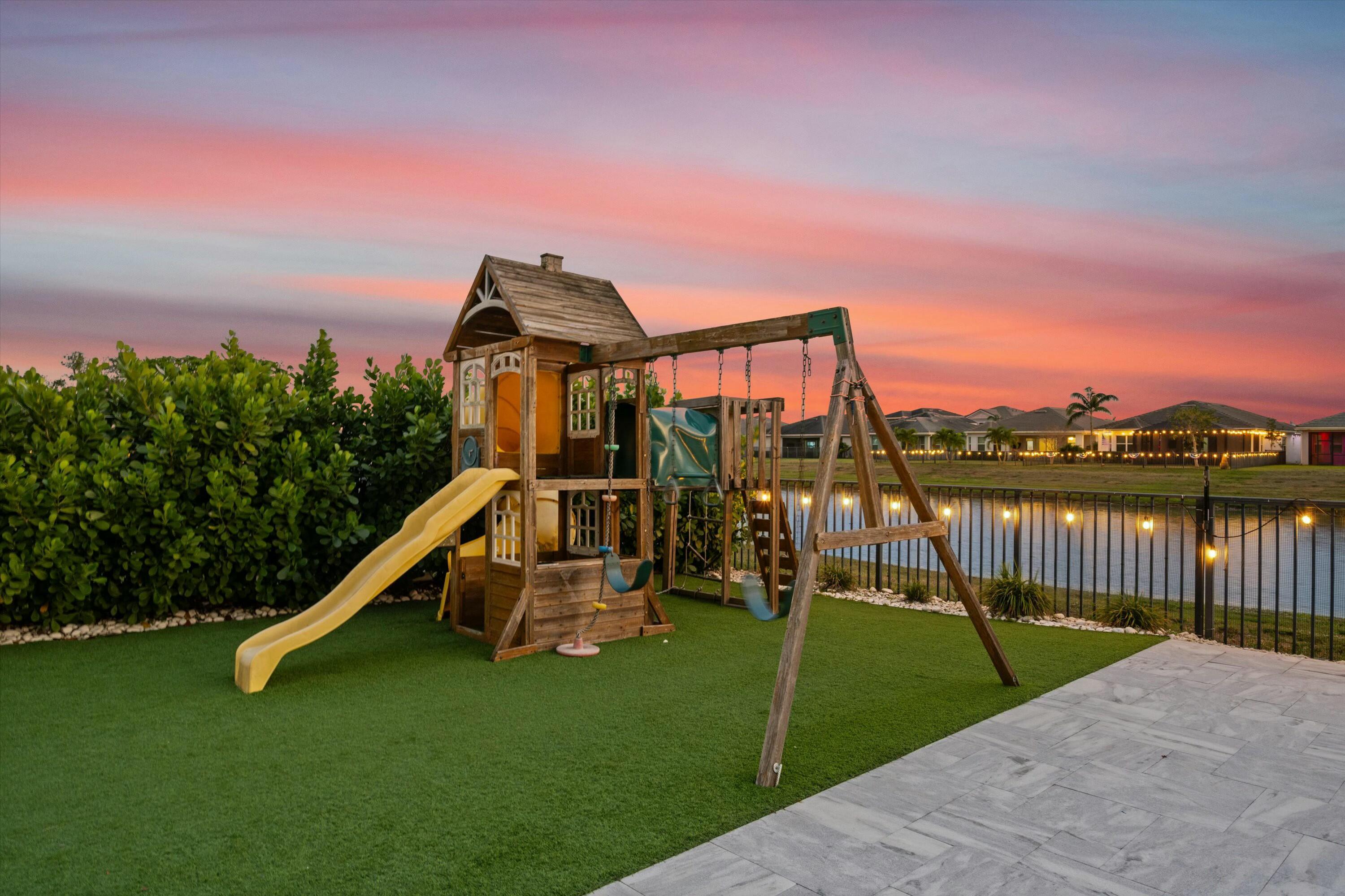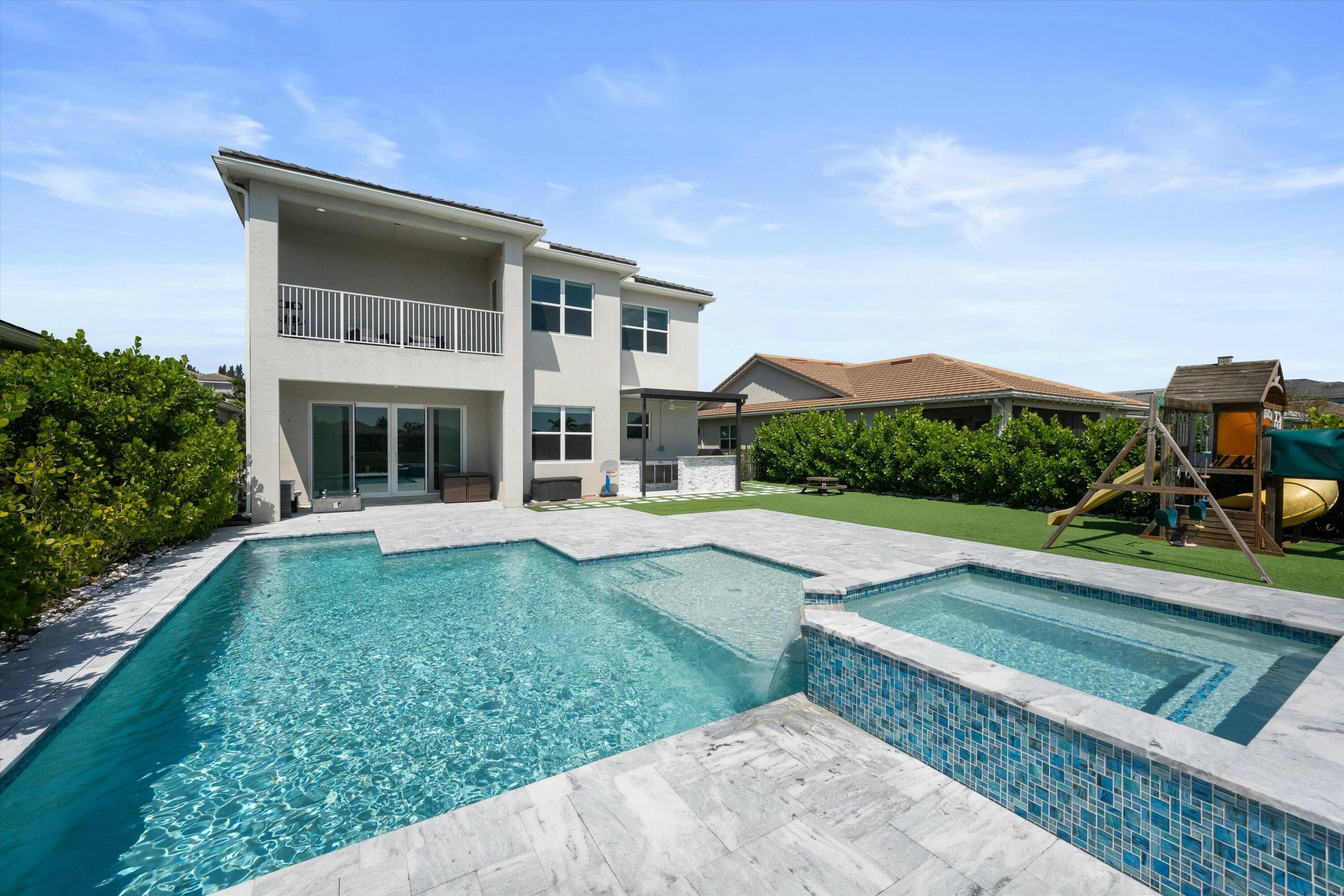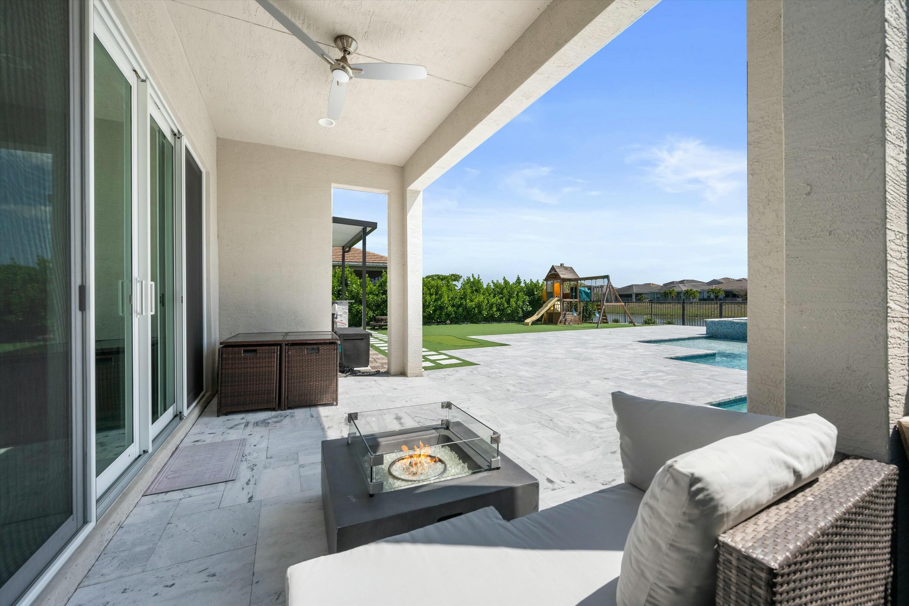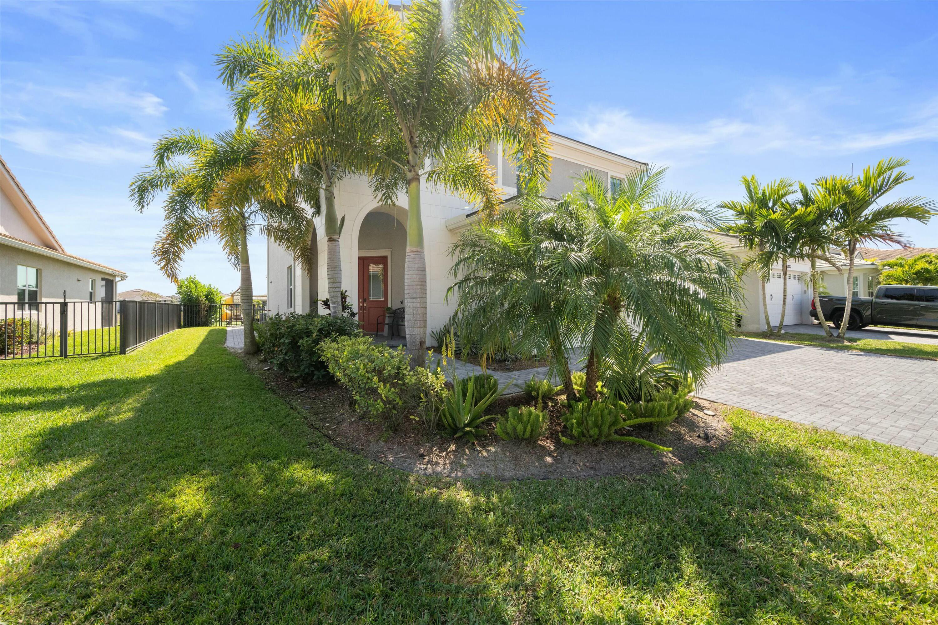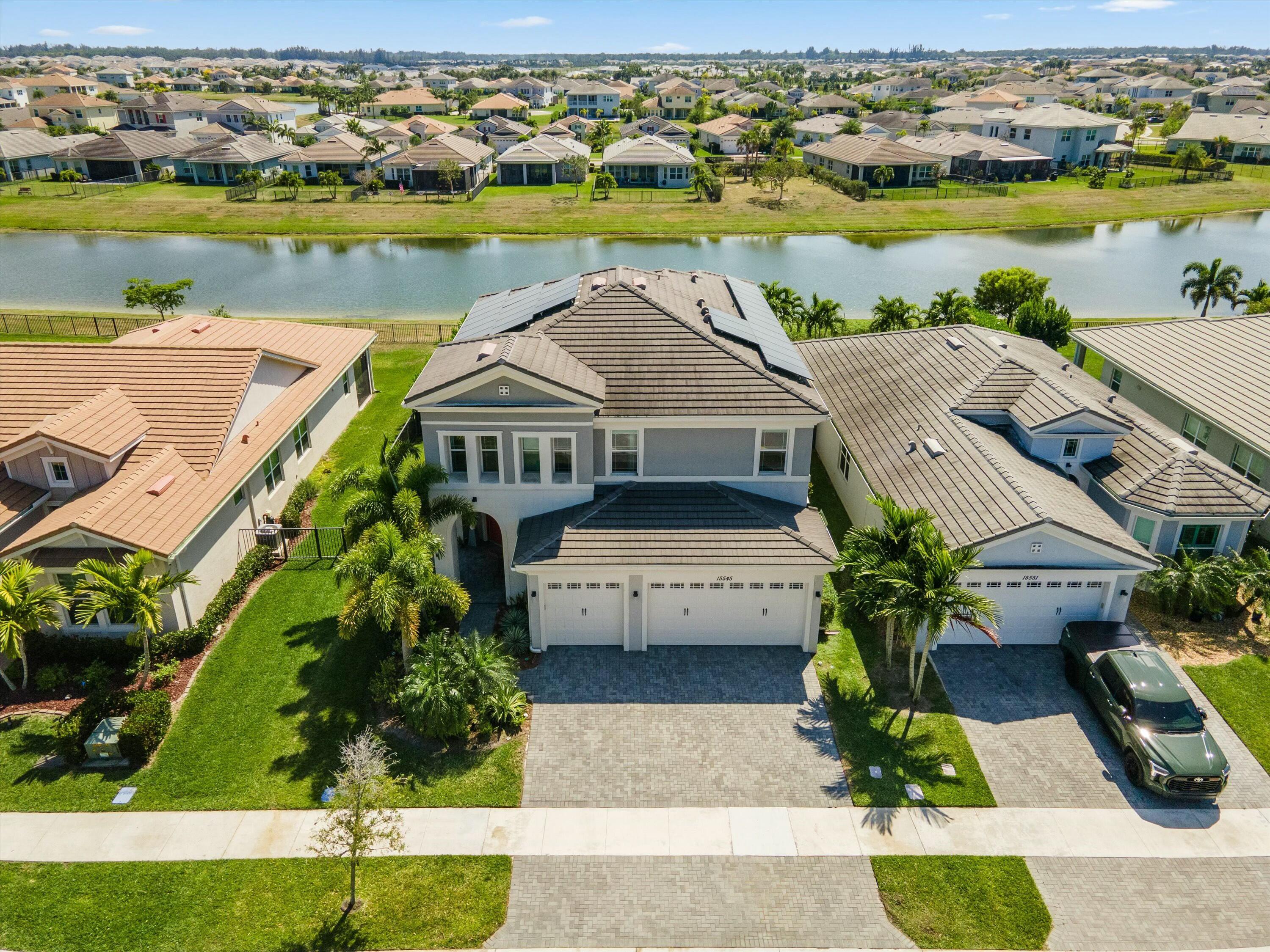 Experience luxury living in this stunning Laurel Model home, located in the prestigious Meadows community of Westlake, FL. This 5-bedroom, 3-bathroom, 2-story residence boasts impact windows throughout, ensuring safety and energy efficiency,complemented by 33 solar panels for exceptional sustainability and reduced energy costs. With 3,071 sq. ft. of living space, a 3-car garage, and a salted and heated pool and spa, this home offers an unparalleled blend of elegance and functionality. The backyard was meticulously designed to ensure maximum yard space, outdoor kitchen and still plenty of yard space for entertaining and playing.As you step inside, you're greeted by soaring ceilings, sleek porcelain tile flooring, and custom designer finishes. The heart of the home is the gourmet kitchen, which showcases black quartz countertops, white shaker-style cabinetry, and a striking marble mosaic backsplash. The oversized island with additional seating is perfect for entertaining, while modern pendant lighting enhances the space. Additional upgrades include a hood exhaust, upgraded refrigerator and dishwasher, and a hidden bookshelf door leading to a spacious pantry. The open-concept living area is anchored by a stunning faux feature wall with a built-in electric fireplace and TV, adding warmth and sophistication. Expansive sliding glass doors lead to the resort-style backyard, creating the ideal indoor-outdoor living experience. The sprawling master suite is a true retreat, complete with a separate sitting area, plush carpeting, and private access to the premium covered balcony overlooking the serene water views. The spa-inspired en-suite bathroom boasts dual granite vanities, espresso-toned cabinetry, a deep soaking tub, and a frameless glass-enclosed shower with floor-to-ceiling tiles. The massive walk-in closet provides ample storage. The additional bedrooms feature carpeted flooring and generous closet space, with one bedroom offering an en-suite bathroom. Step outside to the fully fenced backyard oasis, featuring approximately 1,000 sq. ft. of lush artificial turf, a playground, and stunning landscape enhancements such as backyard clusias, a palm tree, a critter fence, and white stone decor. Enjoy the salted and heated resort-style pool with a raised spa and sun shelf. The expansive travertine deck, stone pathway alongside the house, and breathtaking water views create an idyllic outdoor escape. The covered patio with a built-in gas fire pit and a spectacular custom outdoor kitchen, featuring an expensive infrared grill, custom U-shaped island with decor stones, multiple storage doors, drawer cabinet, sink provision, refrigerator, and bar area, makes outdoor dining a breeze. Additional highlights include concrete flooring between floors for noise reduction, garage floor epoxy, garage ceiling racks, ceiling fans, designer ceiling light fixtures, window shades, smart light switches, faux wall decors, solar panels (33 total), and a gas line. The laundry room boasts black granite counters, wood cabinetry, and a deep utility sink. Located in Westlake's premier community, The Meadows, residents enjoy resort-style amenities, parks, and top-rated schools. Don't miss this exceptional luxury homeschedule your private tour today!