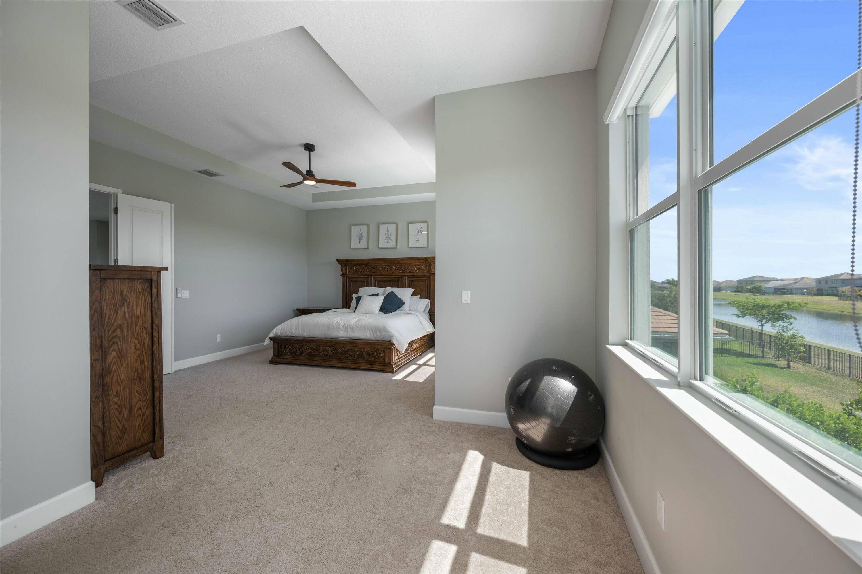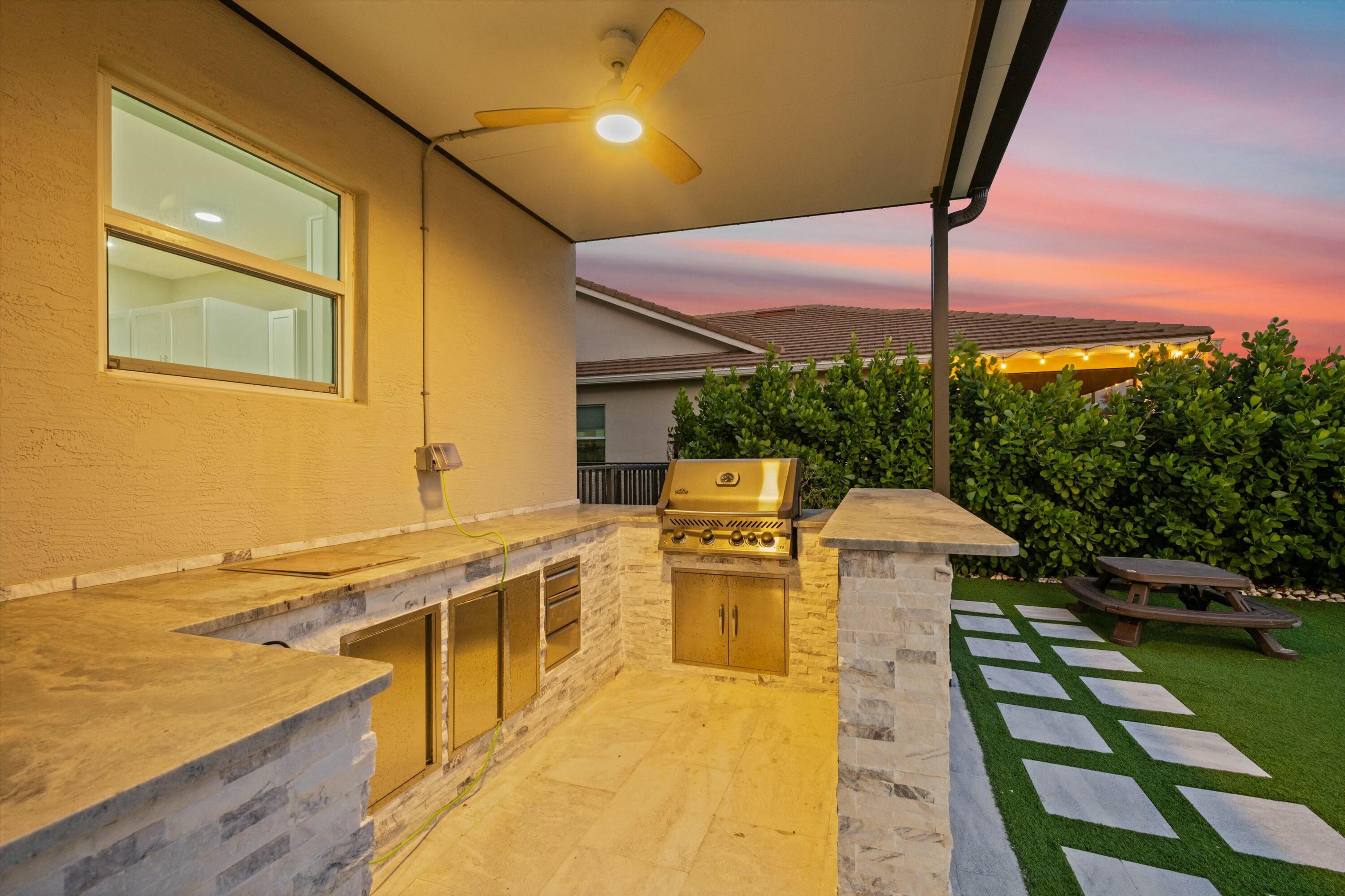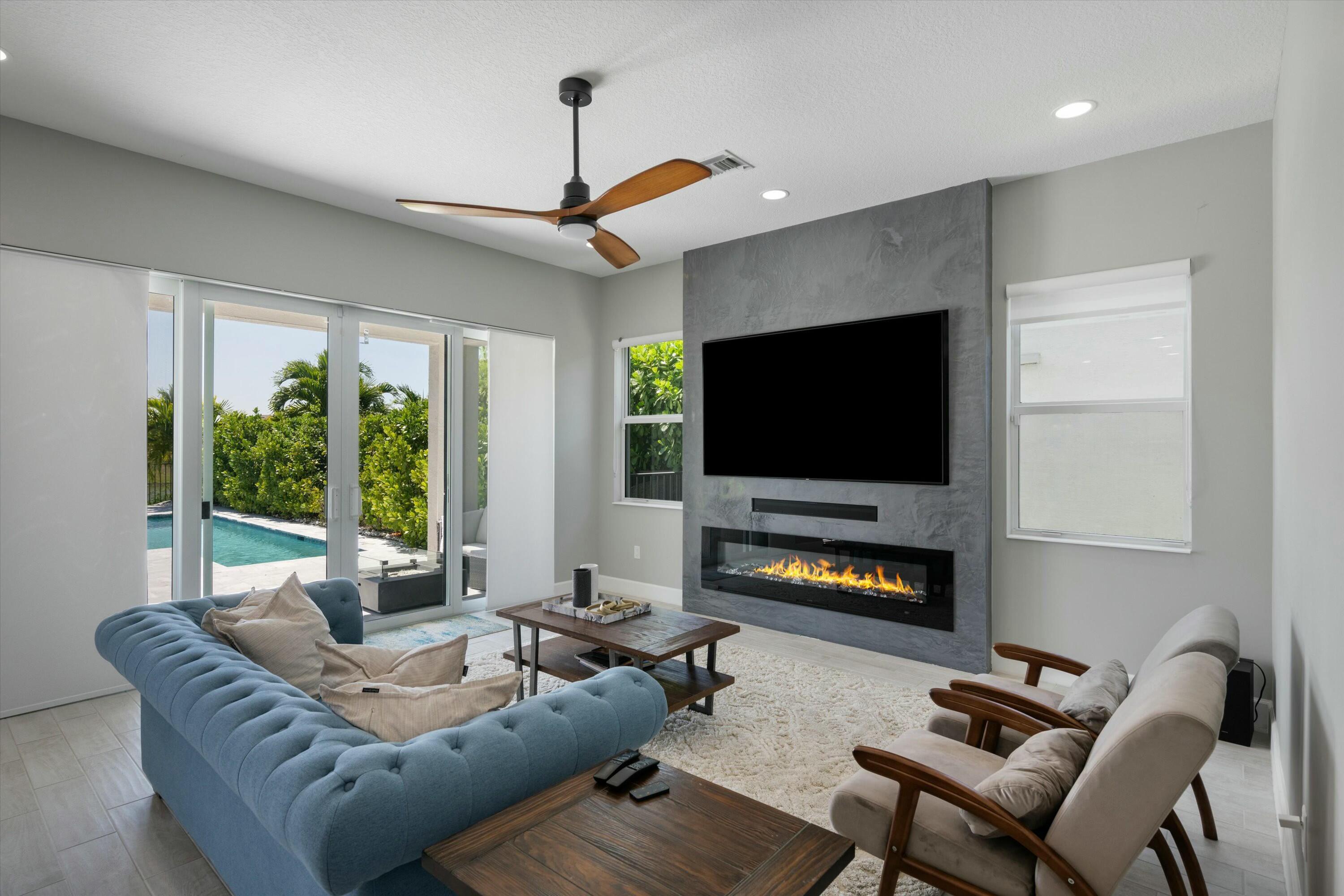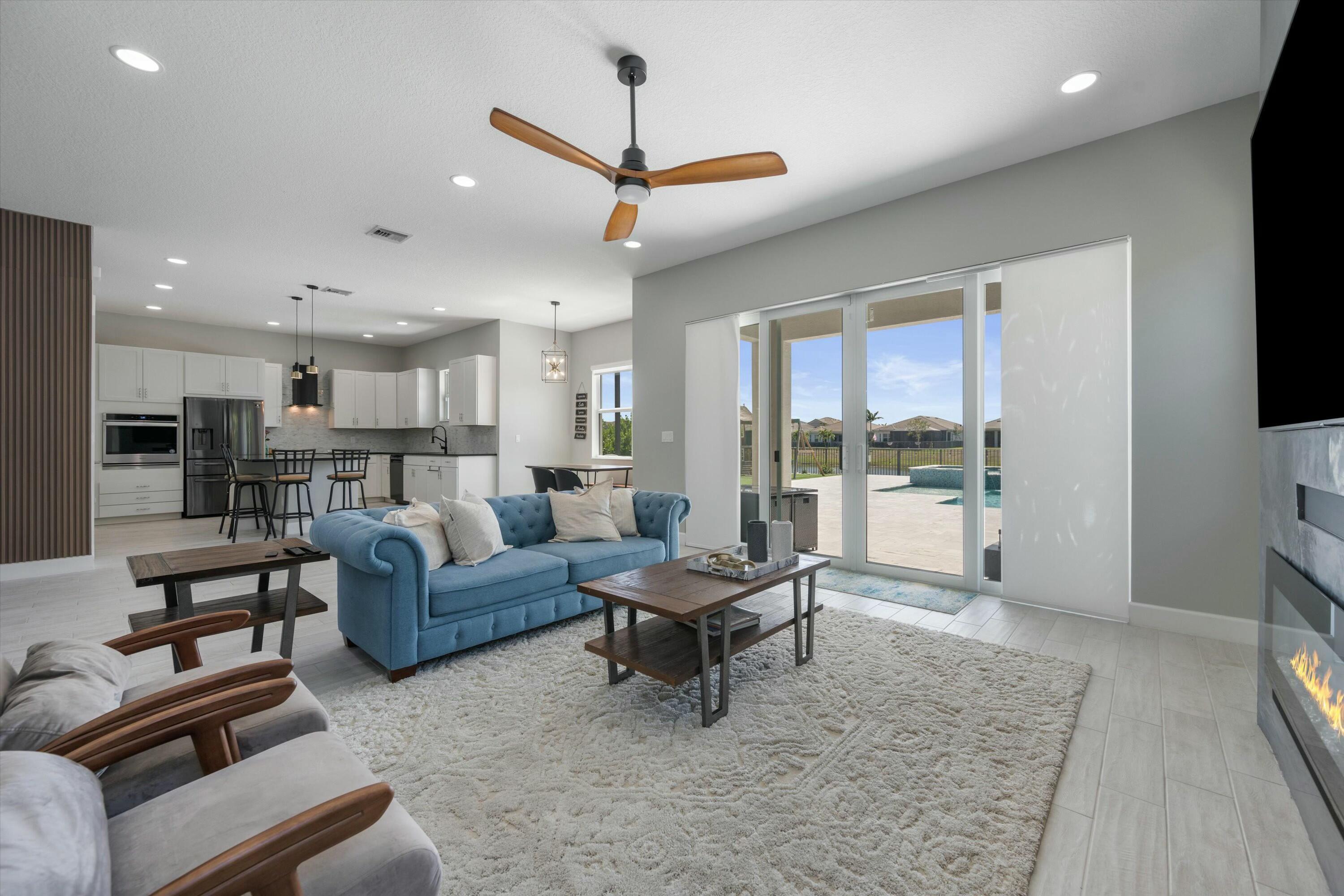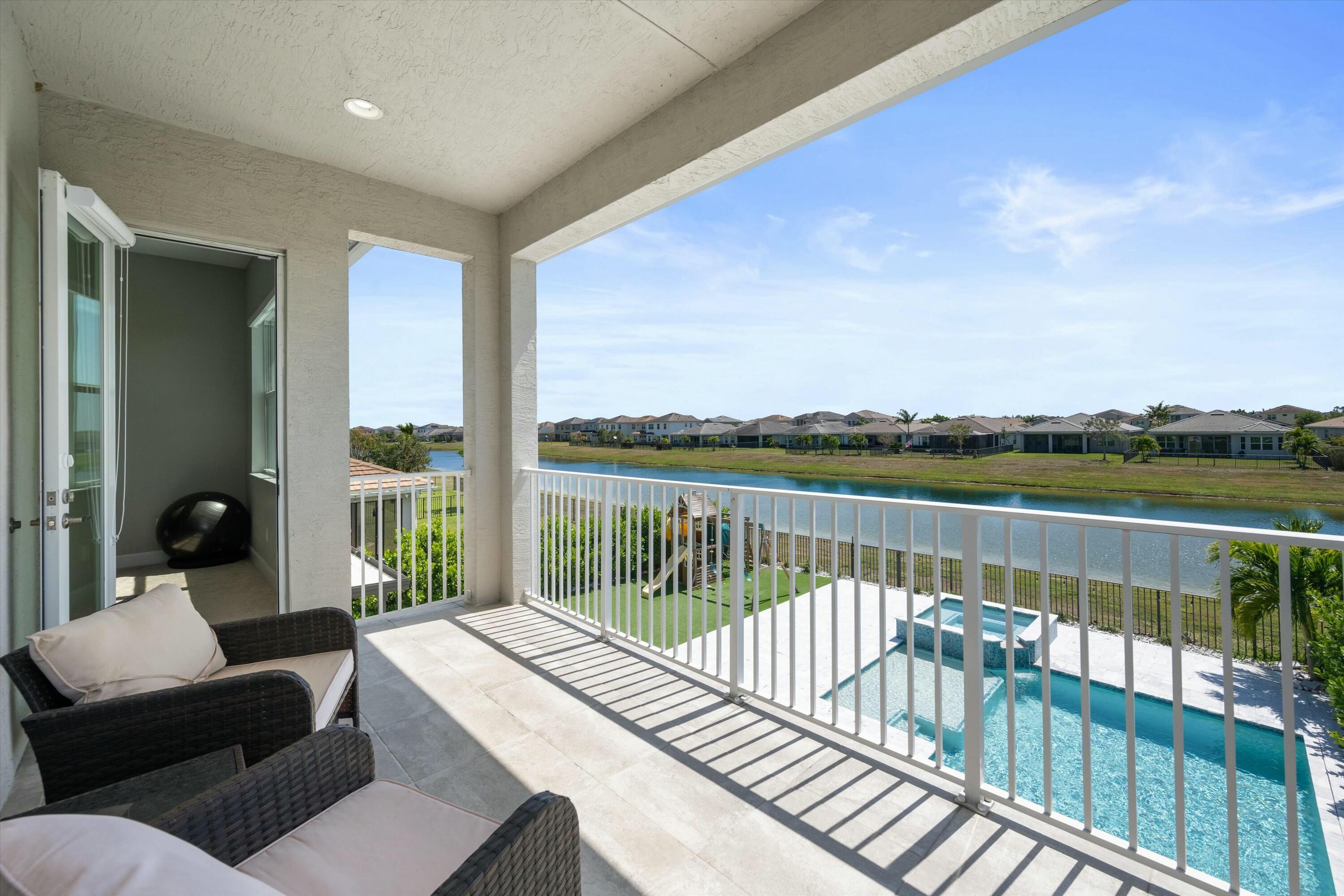 Experience luxury living in this stunning Laurel Model home, located in the prestigious Meadows community of Westlake, FL. This 5-bedroom, 3-bathroom, 2-story residence boasts impact windows throughout, ensuring safety and energy efficiency,complemented by 33 solar panels for exceptional sustainability and reduced energy costs. With 3,071 sq. ft. of living space, a 3-car garage, and a salted and heated pool and spa, this home offers an unparalleled blend of elegance and functionality. The backyard was meticulously designed to ensure maximum yard space, outdoor kitchen and still plenty of yard space for entertaining and playing.As you step inside, you're greeted by soaring ceilings, sleek porcelain tile flooring, and custom designer finishes. The heart of the home is the gourmet kitchen, which showcases black quartz countertops, white shaker-style cabinetry, and a striking marble mosaic backsplash. The oversized island with additional seating is perfect for entertaining, while modern pendant lighting enhances the space. Additional upgrades include a hood exhaust, upgraded refrigerator and dishwasher, and a hidden bookshelf door leading to a spacious pantry. The open-concept living area is anchored by a stunning faux feature wall with a built-in electric fireplace and TV, adding warmth and sophistication. Expansive sliding glass doors lead to the resort-style backyard, creating the ideal indoor-outdoor living experience. The sprawling master suite is a true retreat, complete with a separate sitting area, plush carpeting, and private access to the premium covered balcony overlooking the serene water views. The spa-inspired en-suite bathroom boasts dual granite vanities, espresso-toned cabinetry, a deep soaking tub, and a frameless glass-enclosed shower with floor-to-ceiling tiles. The massive walk-in closet provides ample storage. The additional bedrooms feature carpeted flooring and generous closet space, with one bedroom offering an en-suite bathroom. Step outside to the fully fenced backyard oasis, featuring approximately 1,000 sq. ft. of lush artificial turf, a playground, and stunning landscape enhancements such as backyard clusias, a palm tree, a critter fence, and white stone decor. Enjoy the salted and heated resort-style pool with a raised spa and sun shelf. The expansive travertine deck, stone pathway alongside the house, and breathtaking water views create an idyllic outdoor escape. The covered patio with a built-in gas fire pit and a spectacular custom outdoor kitchen, featuring an expensive infrared grill, custom U-shaped island with decor stones, multiple storage doors, drawer cabinet, sink provision, refrigerator, and bar area, makes outdoor dining a breeze. Additional highlights include concrete flooring between floors for noise reduction, garage floor epoxy, garage ceiling racks, ceiling fans, designer ceiling light fixtures, window shades, smart light switches, faux wall decors, solar panels (33 total), and a gas line. The laundry room boasts black granite counters, wood cabinetry, and a deep utility sink. Located in Westlake's premier community, The Meadows, residents enjoy resort-style amenities, parks, and top-rated schools. Don't miss this exceptional luxury homeschedule your private tour today!