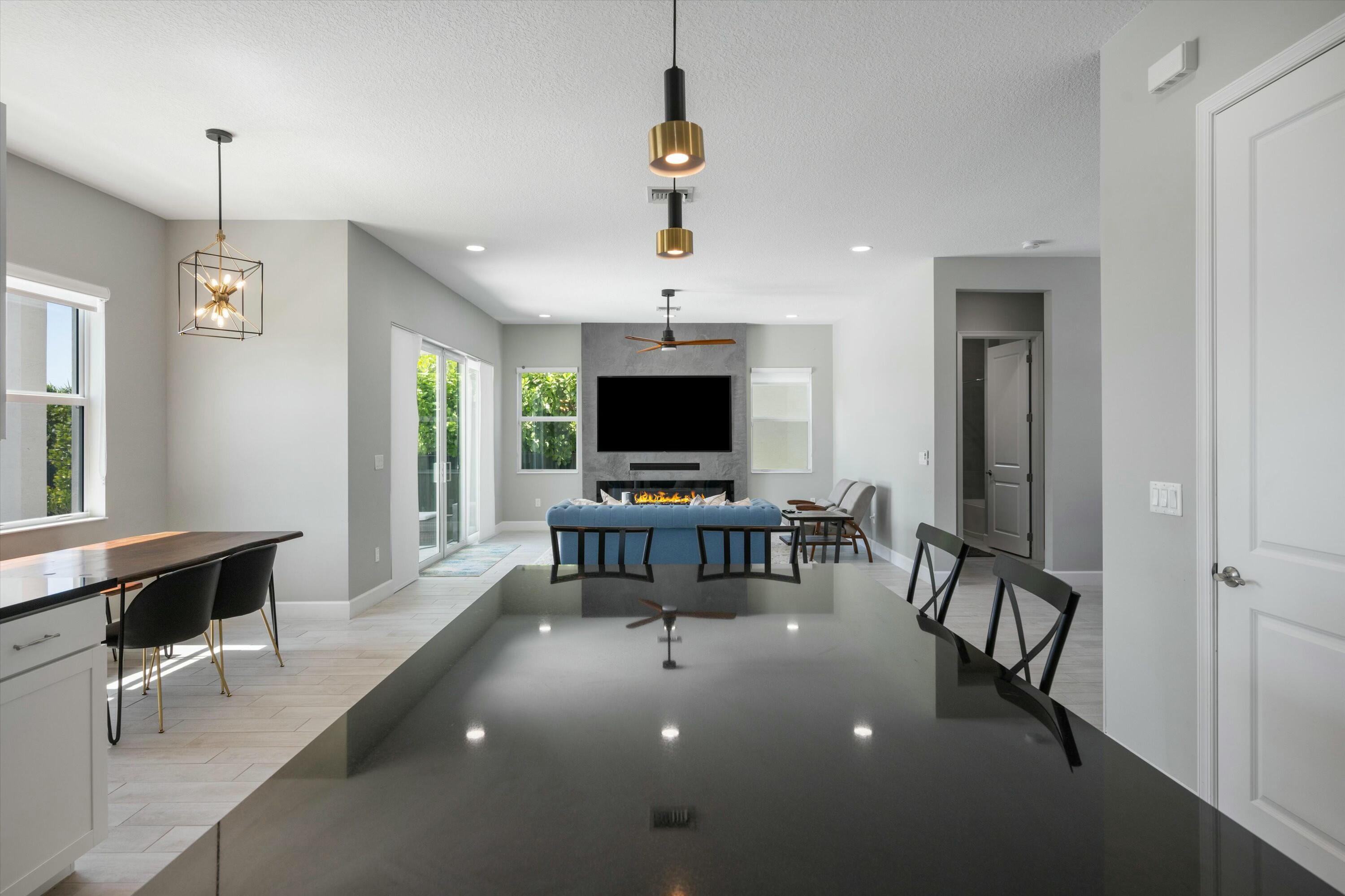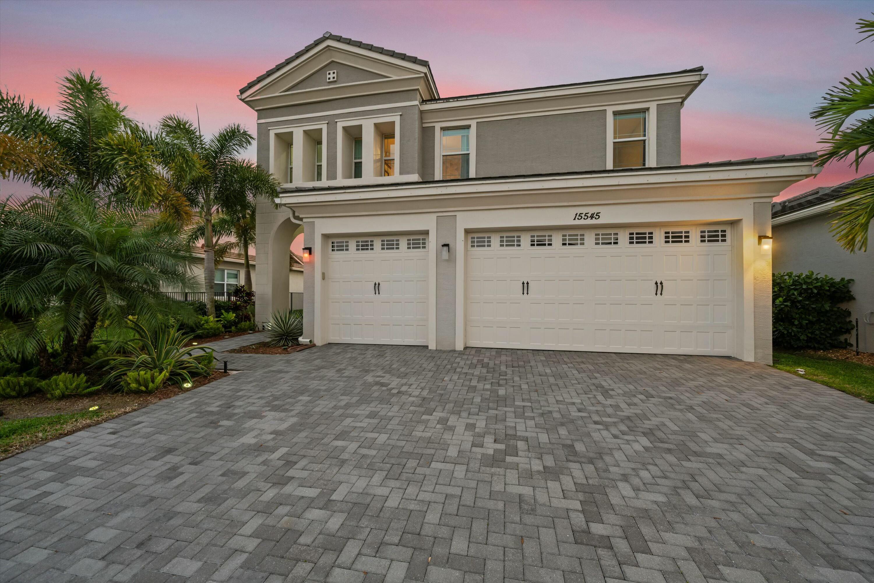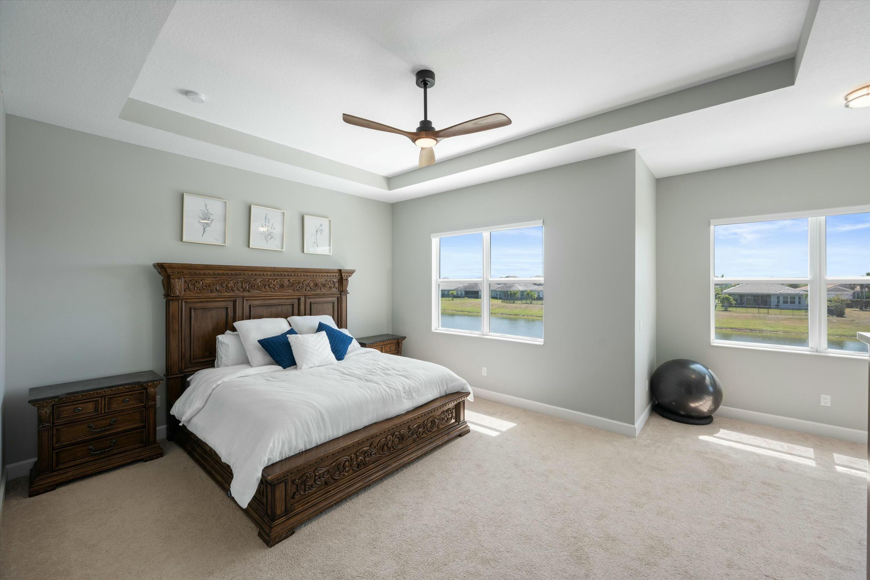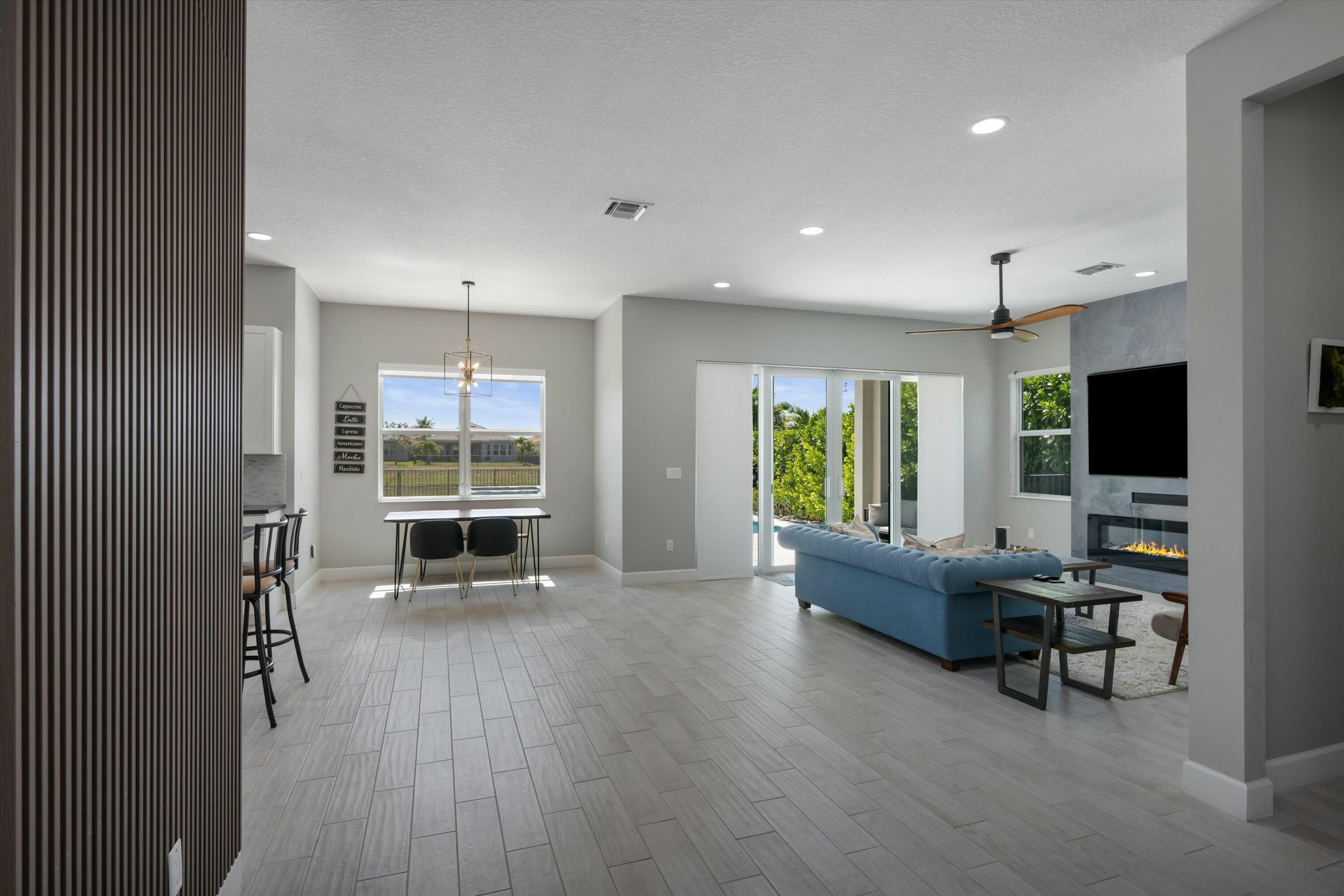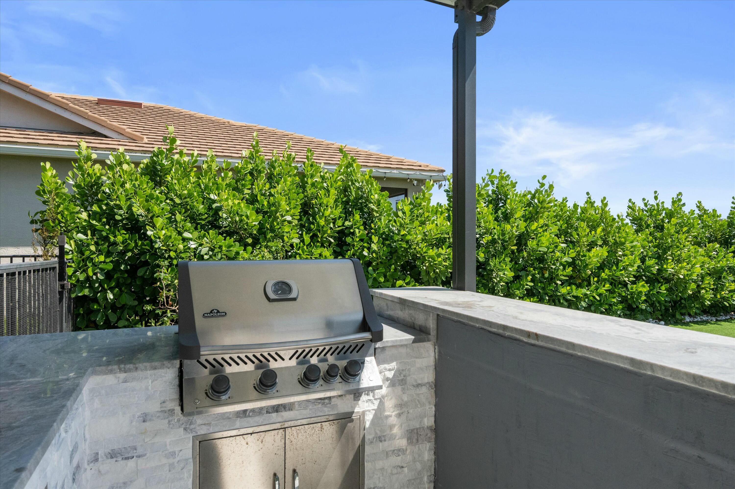 Experience luxury living in this stunning Laurel Model home, located in the prestigious Meadows community of Westlake, FL. This 5-bedroom, 3-bathroom, 2-story residence boasts impact windows throughout, ensuring safety and energy efficiency,complemented by 33 solar panels for exceptional sustainability and reduced energy costs. With 3,071 sq. ft. of living space, a 3-car garage, and a salted and heated pool and spa, this home offers an unparalleled blend of elegance and functionality. The backyard was meticulously designed to ensure maximum yard space, outdoor kitchen and still plenty of yard space for entertaining and playing.As you step inside, you're greeted by soaring ceilings, sleek porcelain tile flooring, and custom designer finishes. The heart of the home is the gourmet kitchen, which showcases black quartz countertops, white shaker-style cabinetry, and a striking marble mosaic backsplash. The oversized island with additional seating is perfect for entertaining, while modern pendant lighting enhances the space. Additional upgrades include a hood exhaust, upgraded refrigerator and dishwasher, and a hidden bookshelf door leading to a spacious pantry. The open-concept living area is anchored by a stunning faux feature wall with a built-in electric fireplace and TV, adding warmth and sophistication. Expansive sliding glass doors lead to the resort-style backyard, creating the ideal indoor-outdoor living experience. The sprawling master suite is a true retreat, complete with a separate sitting area, plush carpeting, and private access to the premium covered balcony overlooking the serene water views. The spa-inspired en-suite bathroom boasts dual granite vanities, espresso-toned cabinetry, a deep soaking tub, and a frameless glass-enclosed shower with floor-to-ceiling tiles. The massive walk-in closet provides ample storage. The additional bedrooms feature carpeted flooring and generous closet space, with one bedroom offering an en-suite bathroom. Step outside to the fully fenced backyard oasis, featuring approximately 1,000 sq. ft. of lush artificial turf, a playground, and stunning landscape enhancements such as backyard clusias, a palm tree, a critter fence, and white stone decor. Enjoy the salted and heated resort-style pool with a raised spa and sun shelf. The expansive travertine deck, stone pathway alongside the house, and breathtaking water views create an idyllic outdoor escape. The covered patio with a built-in gas fire pit and a spectacular custom outdoor kitchen, featuring an expensive infrared grill, custom U-shaped island with decor stones, multiple storage doors, drawer cabinet, sink provision, refrigerator, and bar area, makes outdoor dining a breeze. Additional highlights include concrete flooring between floors for noise reduction, garage floor epoxy, garage ceiling racks, ceiling fans, designer ceiling light fixtures, window shades, smart light switches, faux wall decors, solar panels (33 total), and a gas line. The laundry room boasts black granite counters, wood cabinetry, and a deep utility sink. Located in Westlake's premier community, The Meadows, residents enjoy resort-style amenities, parks, and top-rated schools. Don't miss this exceptional luxury homeschedule your private tour today!