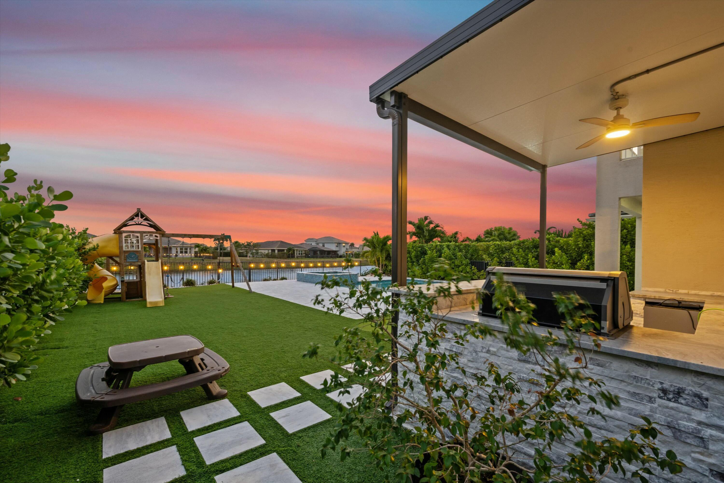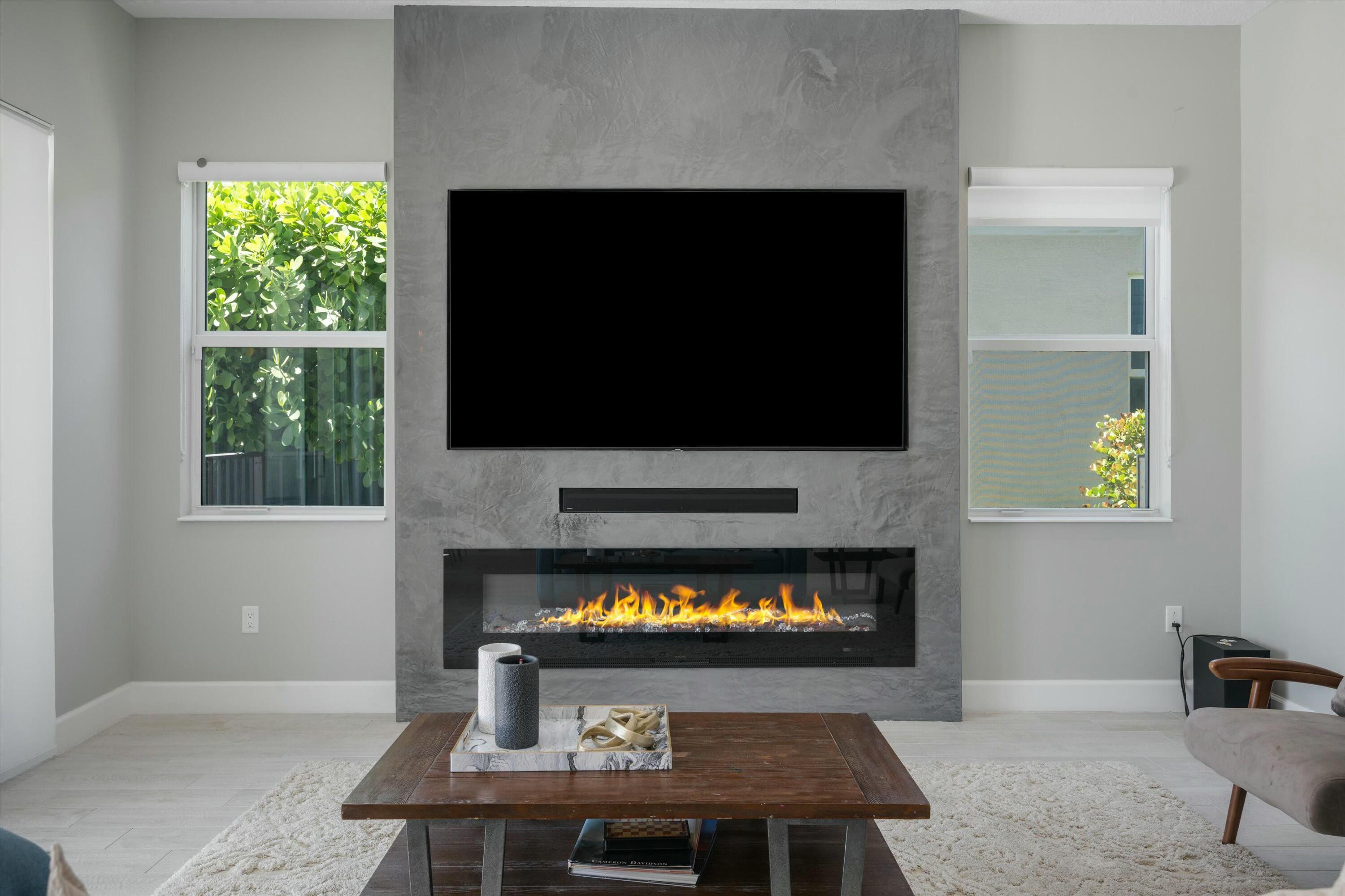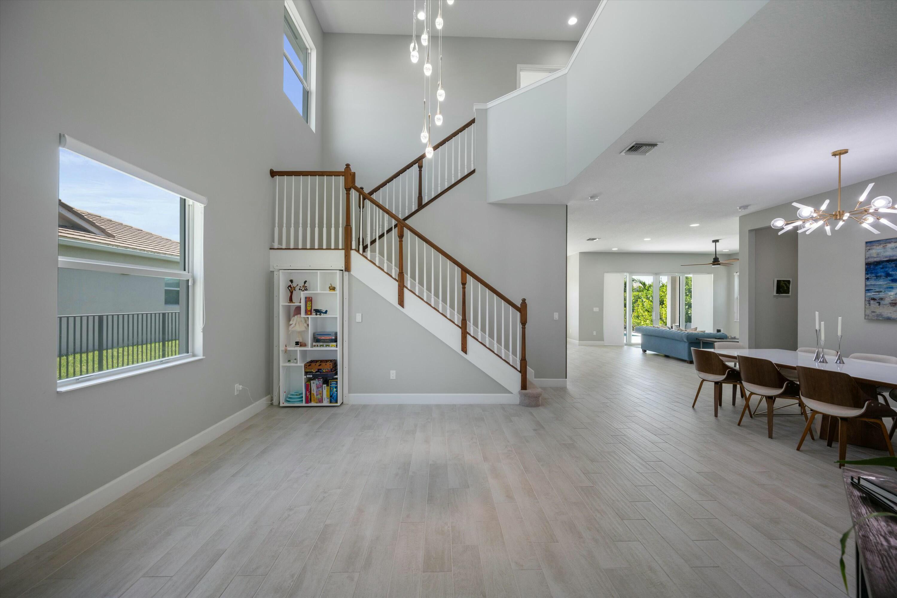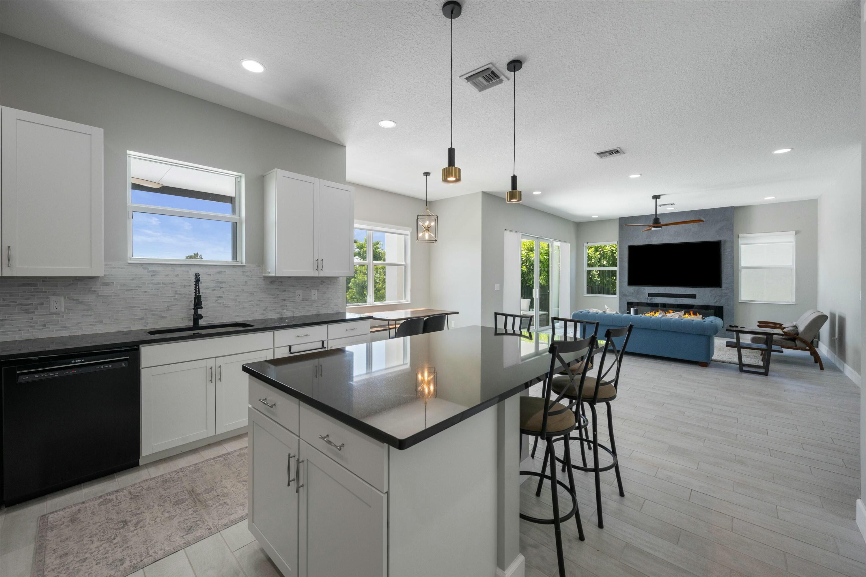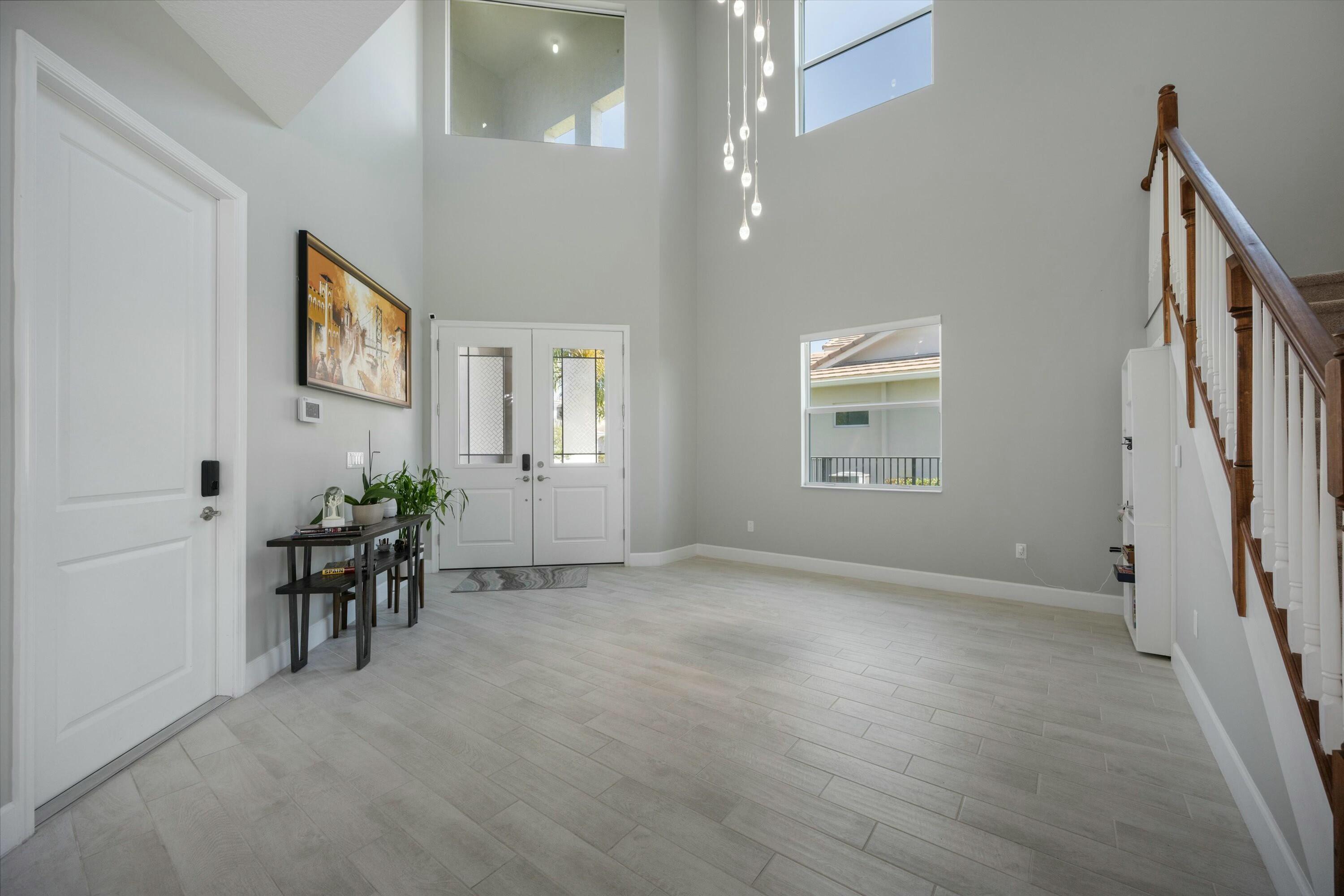Experience luxury living in this stunning Laurel Model home, located in the prestigious Meadows community of Westlake, FL. This 5-bedroom, 3-bathroom, 2-story residence boasts impact windows throughout, ensuring safety and energy efficiency,complemented by 33 solar panels for exceptional sustainability and reduced energy costs. With 3,071 sq. ft. of living space, a 3-car garage, and a salted and heated pool and spa, this home offers an unparalleled blend of elegance and functionality. The backyard was meticulously designed to ensure maximum yard space, outdoor kitchen and still plenty of yard space for entertaining and playing.As you step inside, you're greeted by soaring ceilings, sleek porcelain tile flooring, and custom designer finishes. The heart of the home is the gourmet kitchen, which showcases black quartz countertops, white shaker-style cabinetry, and a striking marble mosaic backsplash. The oversized island with additional seating is perfect for entertaining, while modern pendant lighting enhances the space. Additional upgrades include a hood exhaust, upgraded refrigerator and dishwasher, and a hidden bookshelf door leading to a spacious pantry. The open-concept living area is anchored by a stunning faux feature wall with a built-in electric fireplace and TV, adding warmth and sophistication. Expansive sliding glass doors lead to the resort-style backyard, creating the ideal indoor-outdoor living experience. The sprawling master suite is a true retreat, complete with a separate sitting area, plush carpeting, and private access to the premium covered balcony overlooking the serene water views. The spa-inspired en-suite bathroom boasts dual granite vanities, espresso-toned cabinetry, a deep soaking tub, and a frameless glass-enclosed shower with floor-to-ceiling tiles. The massive walk-in closet provides ample storage. The additional bedrooms feature carpeted flooring and generous closet space, with one bedroom offering an en-suite bathroom. Step outside to the fully fenced backyard oasis, featuring approximately 1,000 sq. ft. of lush artificial turf, a playground, and stunning landscape enhancements such as backyard clusias, a palm tree, a critter fence, and white stone decor. Enjoy the salted and heated resort-style pool with a raised spa and sun shelf. The expansive travertine deck, stone pathway alongside the house, and breathtaking water views create an idyllic outdoor escape. The covered patio with a built-in gas fire pit and a spectacular custom outdoor kitchen, featuring an expensive infrared grill, custom U-shaped island with decor stones, multiple storage doors, drawer cabinet, sink provision, refrigerator, and bar area, makes outdoor dining a breeze. Additional highlights include concrete flooring between floors for noise reduction, garage floor epoxy, garage ceiling racks, ceiling fans, designer ceiling light fixtures, window shades, smart light switches, faux wall decors, solar panels (33 total), and a gas line. The laundry room boasts black granite counters, wood cabinetry, and a deep utility sink. Located in Westlake's premier community, The Meadows, residents enjoy resort-style amenities, parks, and top-rated schools. Don't miss this exceptional luxury homeschedule your private tour today!