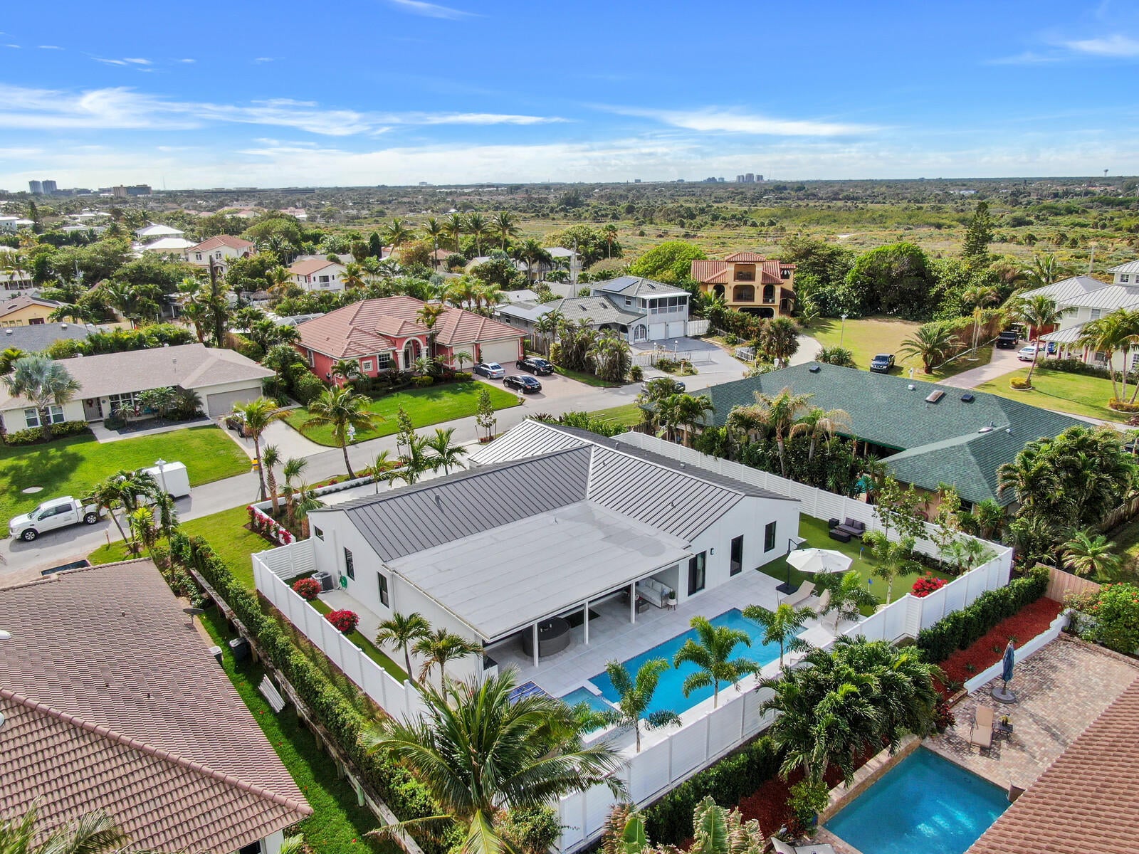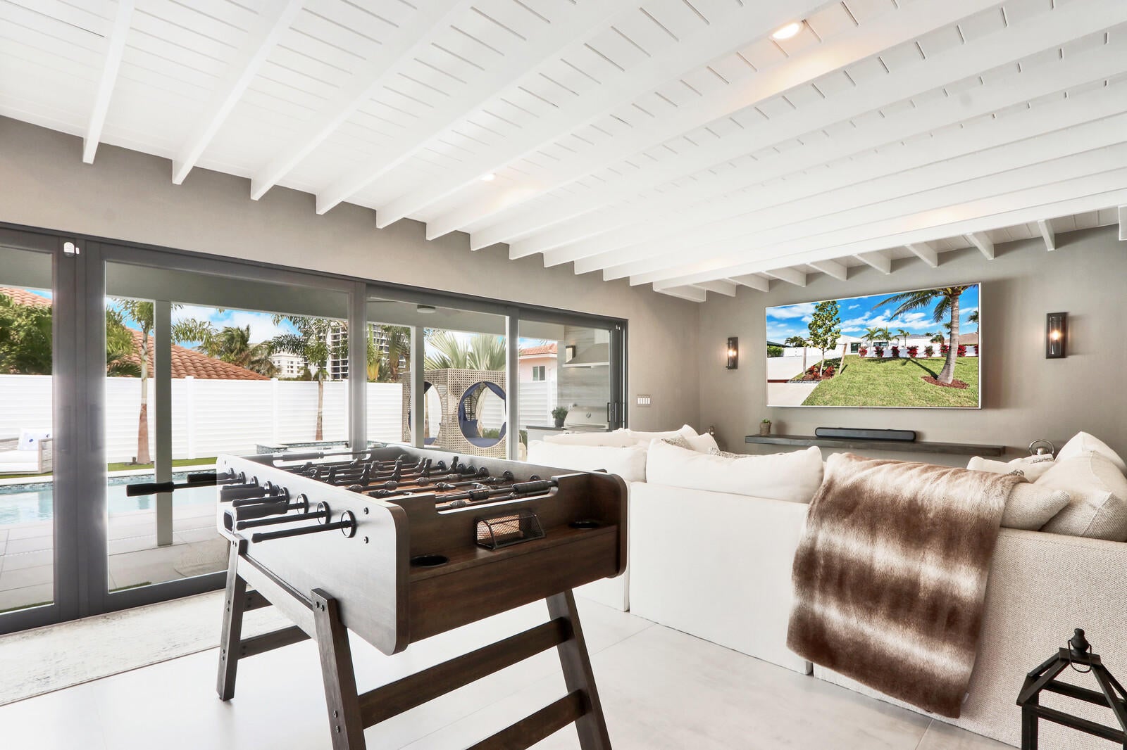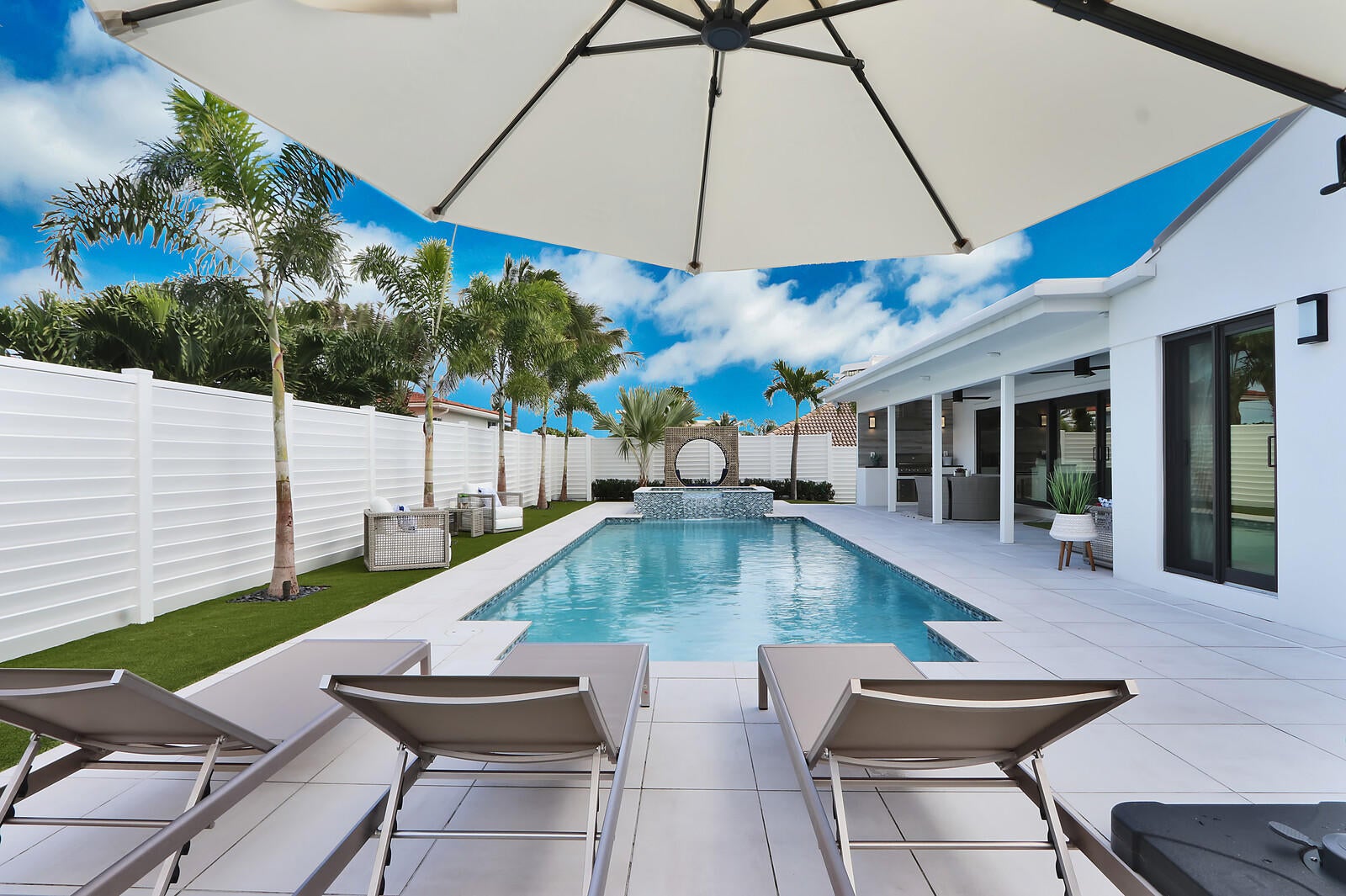 Welcome to your seaside retreat. Enjoy this professionally designed and decorated beachside paradise bringing the Northwest feel to the Juno seaside,.There is not a detail missed in this luxurious home.Sleeps 14, dining for 20. Restoration Hardware inspired decor throughout including furnishings, Italian imported porcelain concrete look flooring, and kitchen and bath appointments.The spacious and bright double living area is conducive to large gatherings featuring a double sided fireplace, entry wet bar and two separate bar top dining areas.. Entertainment room with 86'' tv and foosball table opens out into the fabulous covered outdoor living space. Kitchen features Thermadore Integrated appliances, quartz counter tops, ample custom cabinetry,printer/charger bar work station,built-in ovenand microwave and appliance pantry. Oversized master bedroom complete with walk in closet features black out window dressings for your perfect nights sleep and top of the line king size mattress with Premium W Hotel bedding. Awesome spa-like master bath has a glass enclosed wet room with soaking tub and rain shower with Kohler fixtures surrounded by special soft lighting. Enjoy the breezes off the Atlantic in your zen-like back yard with indoor/outdoor living areas complete with built in barbeque. Privacy is assured with clean white fencing surrounding palm tree lined tropically landscaped heated swimming pool and waterfall jacuzzi ,fire pit relaxation area and birds nest cabana, PUTTERS DREAM WITH 15X20 PUTTING GREEN DESIGNED WITH THE PROFESSIONAL GOLFER.IN MIND. You will be happy to come home to this hill top get away with an ocean view at your front door. Don't miss out! Reserve today. Six month minimum for 2025-2026 season. Off season and annual rates available.