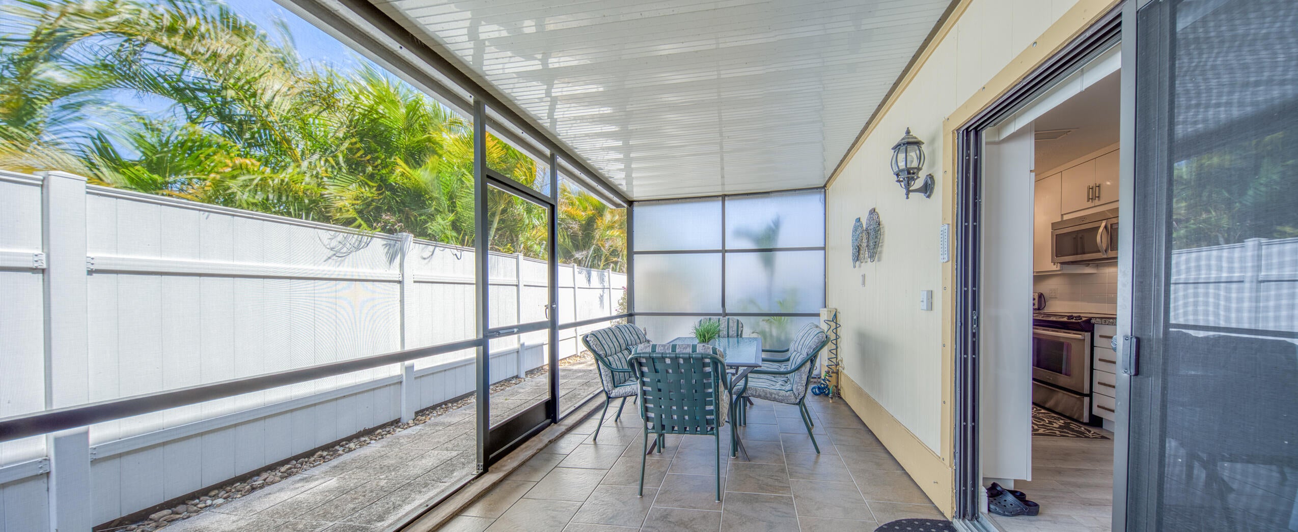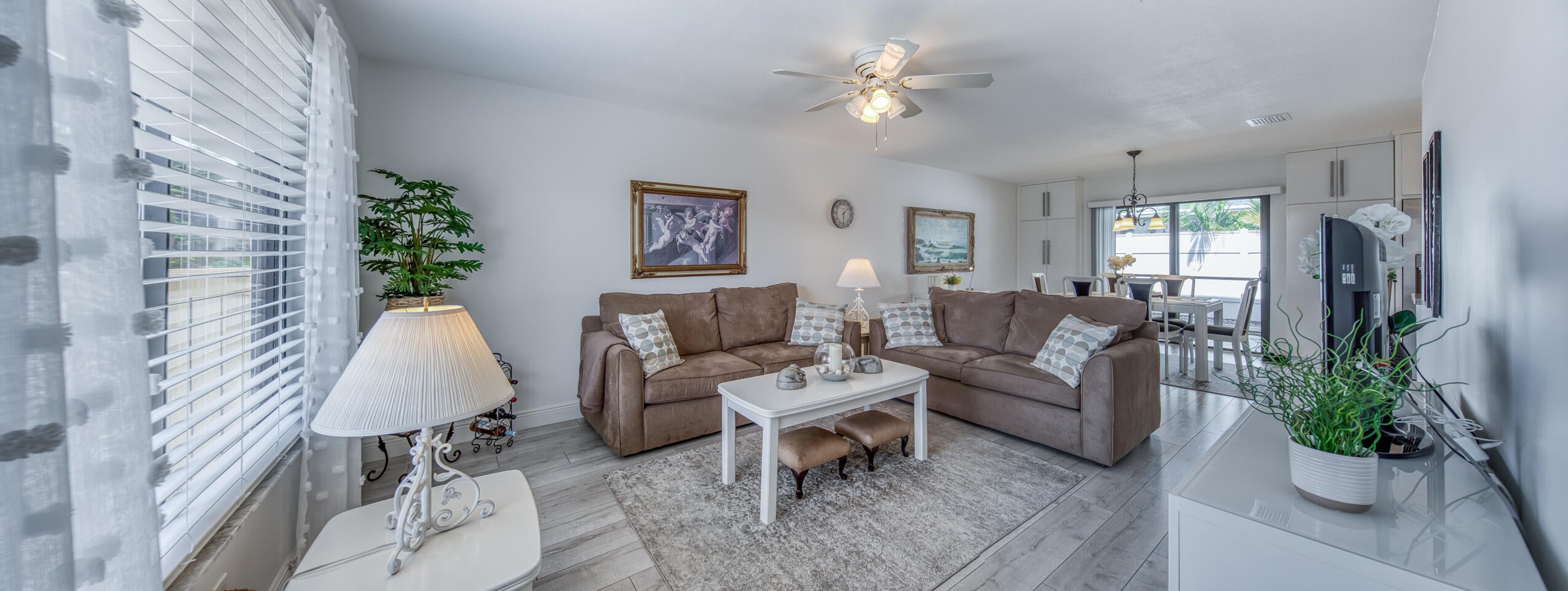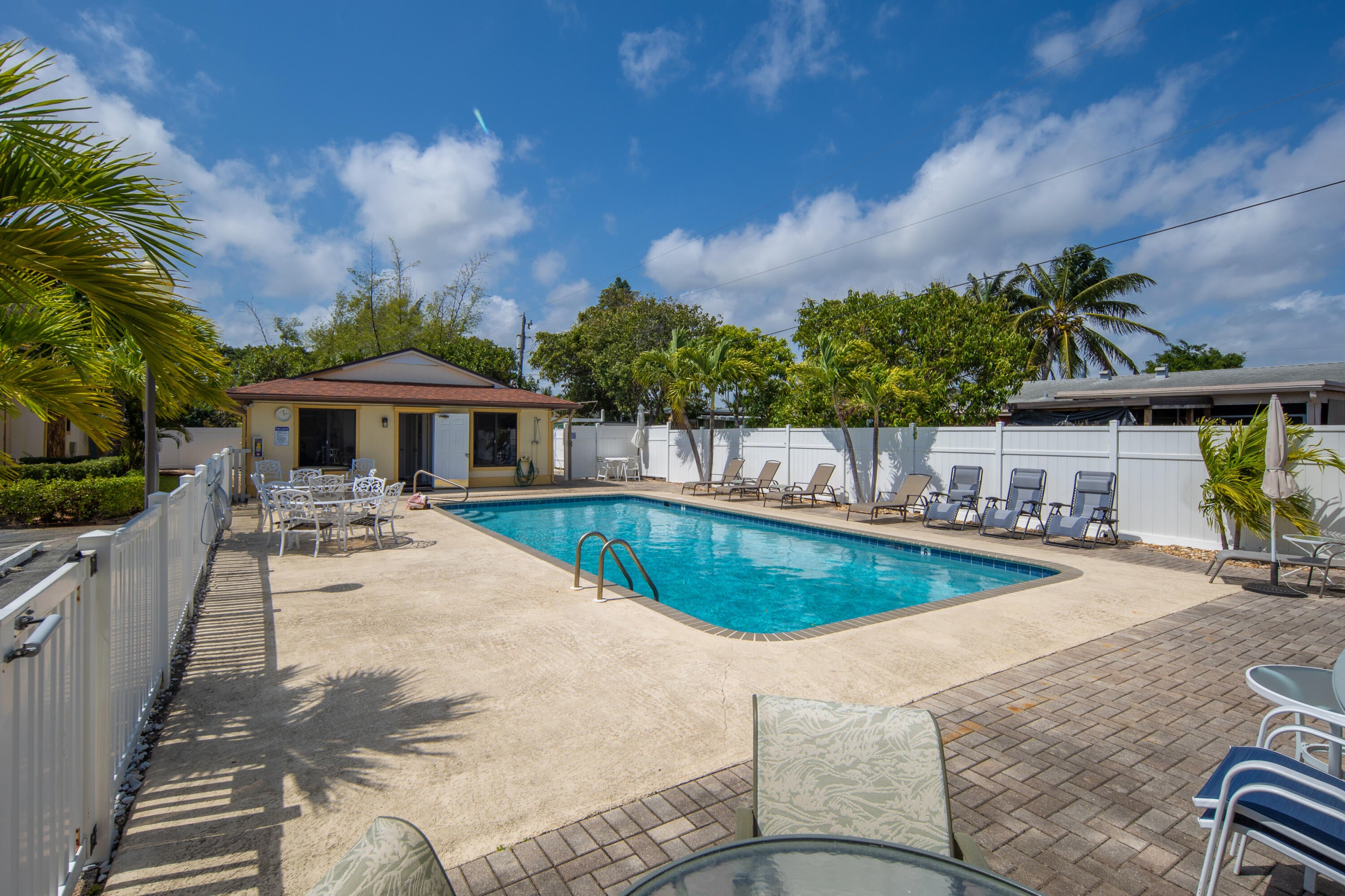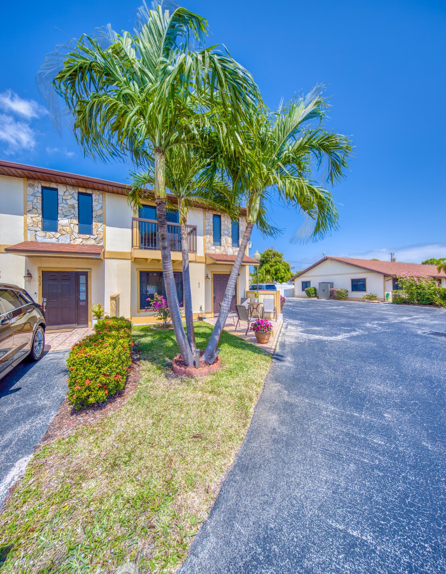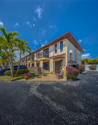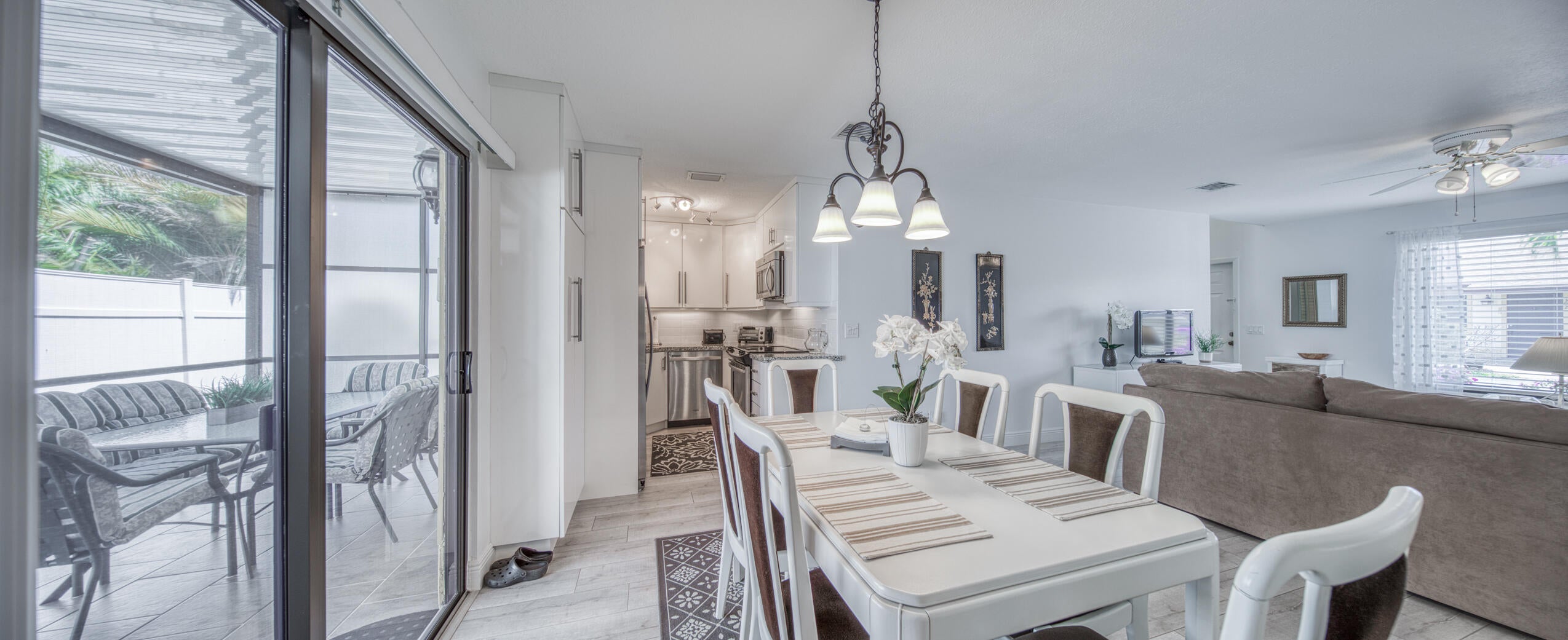 Your search is over! A rare opportunity to purchase a lovely home in this well-maintained and cozy townhouse complex. This end of building apartment has 2 BR and 1,5 BA and spacious living room and kitchen with sliding doors opening onto a good size covered patio. There is also a nice patio in front of the apartment. The ground floor was completely renovated in 2018 and upstairs master bathroom 2008. All impact windows. NEW ELECTRICAL PANEL 5/2025. Roof replaced 2024.AC unit about 3 years old. Nice swimming pool as well as community game room, laundry and small storage. Walking distance from Aldi and Publix. Close to the beaches. The apartment comes fully furnished. Welcome home!