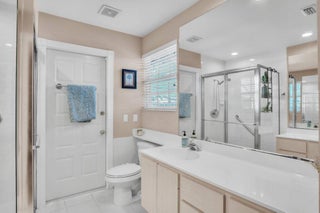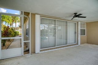 This 2 bedroom and 2 bath Divosta built villa w/private pool overlooks a water way with beautiful views. The kitchen possesses stainless appliances and granite countertops update 2016.The spacious Master bedroom has two closets with built in shelving, large bath, two vanities and a door leading to the screened in patio with pool access. The guest suite can be closed off providing extra privacy with a large walk-in closet and built in shelves. The sliding doors off the family room (with accordion hurricane shutters) leads you to your outdoor oasis with a covered patio area and pool. This home has updates that include: kitchen 2016, HVAC repl 2024 in/out, and uniform ceiling fans throughout, plumbing updated to PVC and Pex.