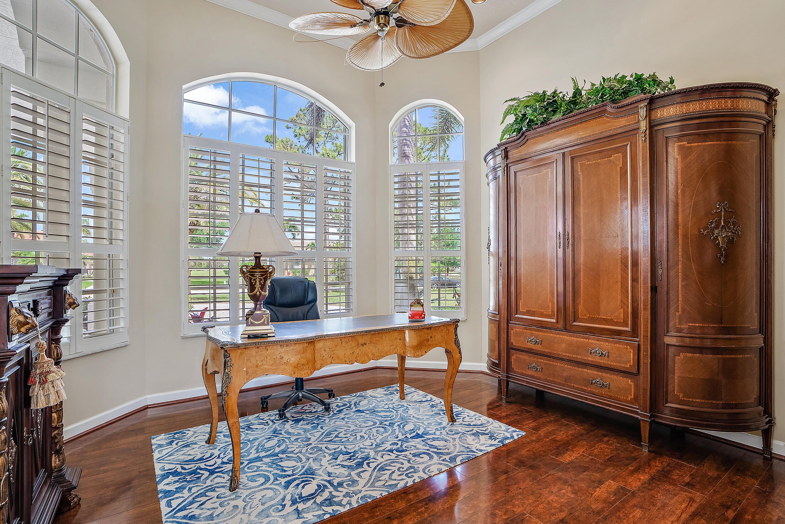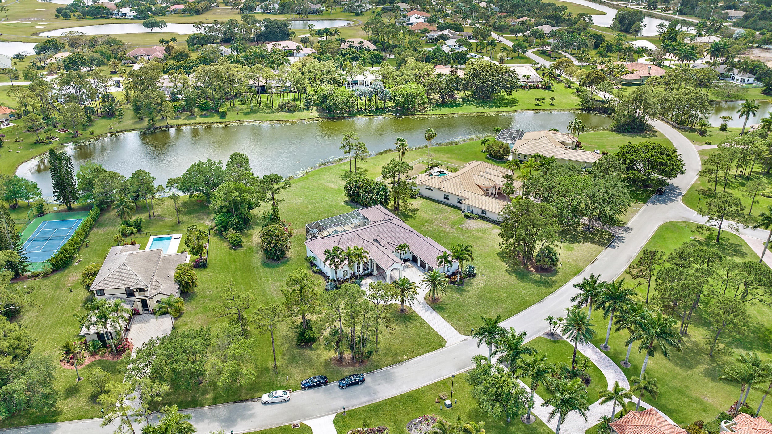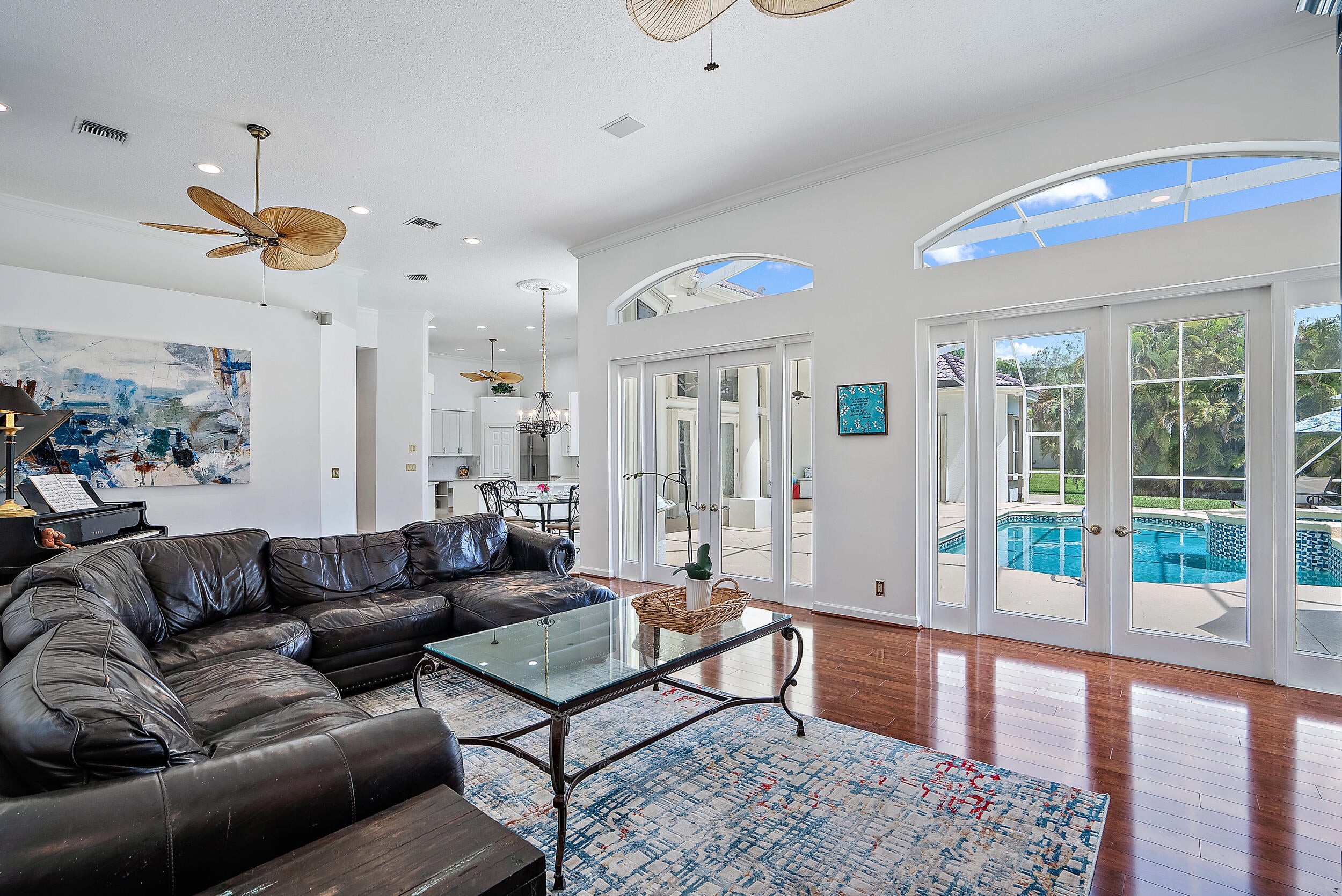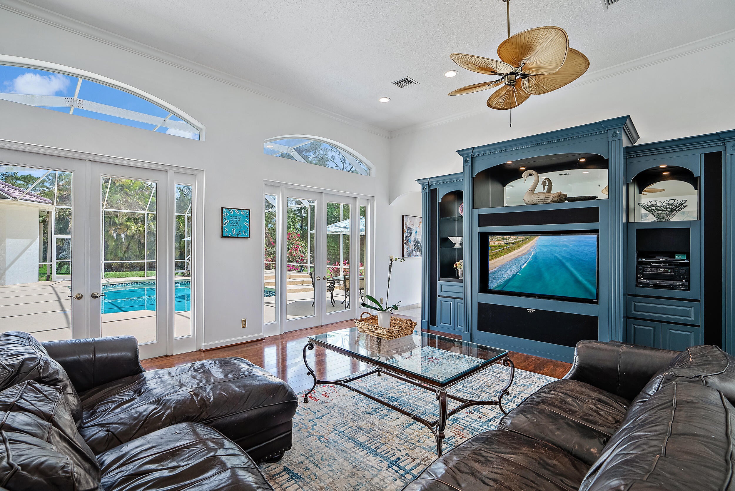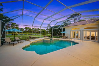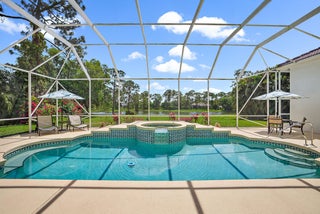 Welcome to your own 1.05 ACRE ESTATE located in the sought-after Bay Hill Estates neighborhood of Palm Beach Gardens. From the moment you approach the magnificent property, you'll be wowed by the dramatic circular driveway and regal Porte Cochere entry, flanked by lion statues. Perfect for entertaining and casual living, the open floor plan has expansive views of the lake from most of the windows in the home. Soaring 18-foot ceilings in the living room provide major architectural drama, while the outdoor pool and open patio draws one's eye outside to the tropically landscaped property. Enjoy immense privacy as you're secluded from neighbors. Three full bedrooms, including a spacious 15ft x 24ft Primary Bedroom, plus a convertible bedroom/den/office. Both secondary bedrooms are en suite.Enjoy new countertops, refinished cabinetry, and new backsplash in the fabulous kitchen. The primary bath boasts marble flooring, as well as new countertops, sinks and fixtures. New fixtures and vanities in the two powder baths. New flooring in guest bedrooms. The 5-ton HVAC was replaced in 2020 and the 3-ton HVAC was replaced in 2018. A golf membership is available, but not required, through PGA National. Bay Hill Estates is a gated community with proximity to the heart of Palm Beach Gardens' world-class shopping and restaurants.