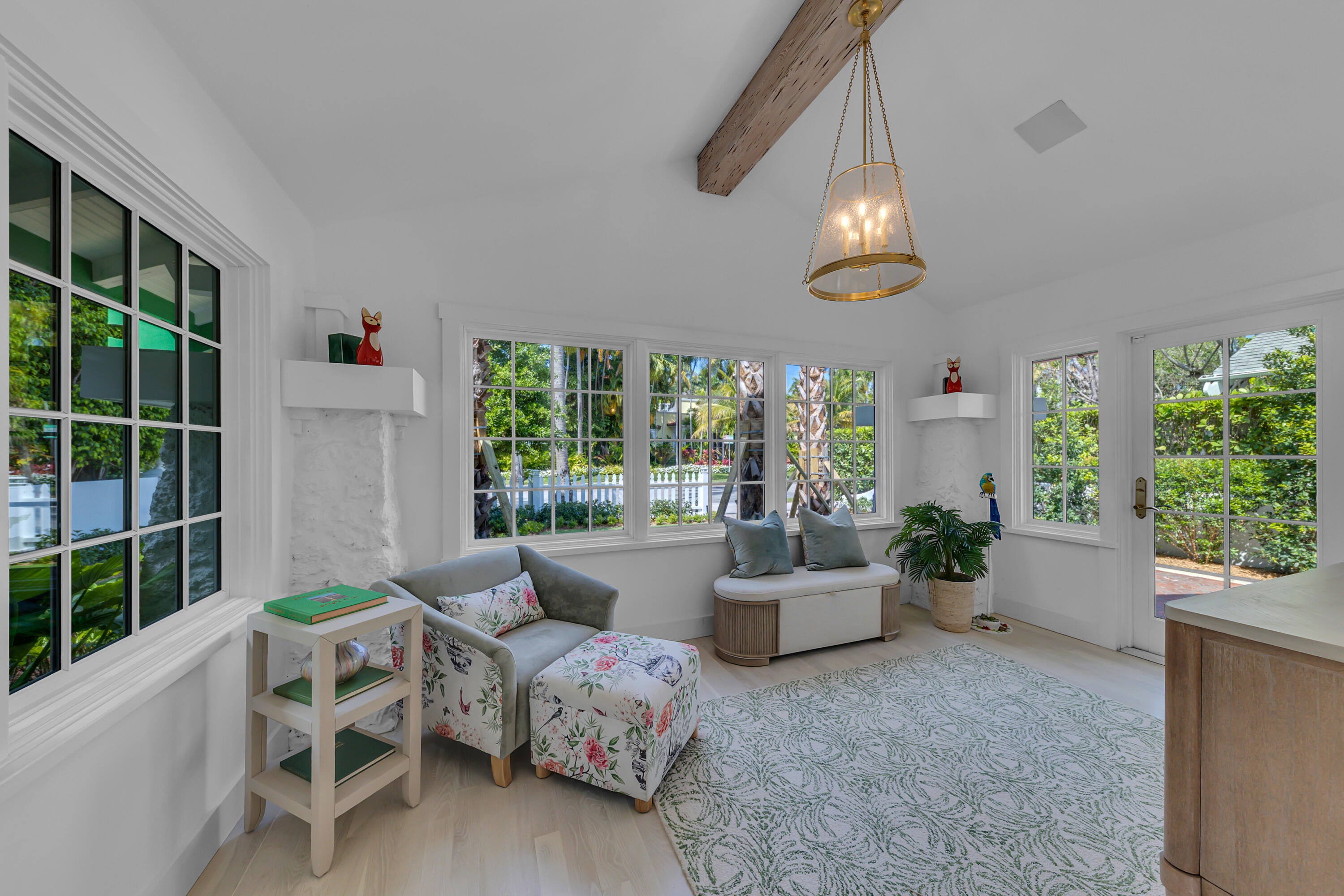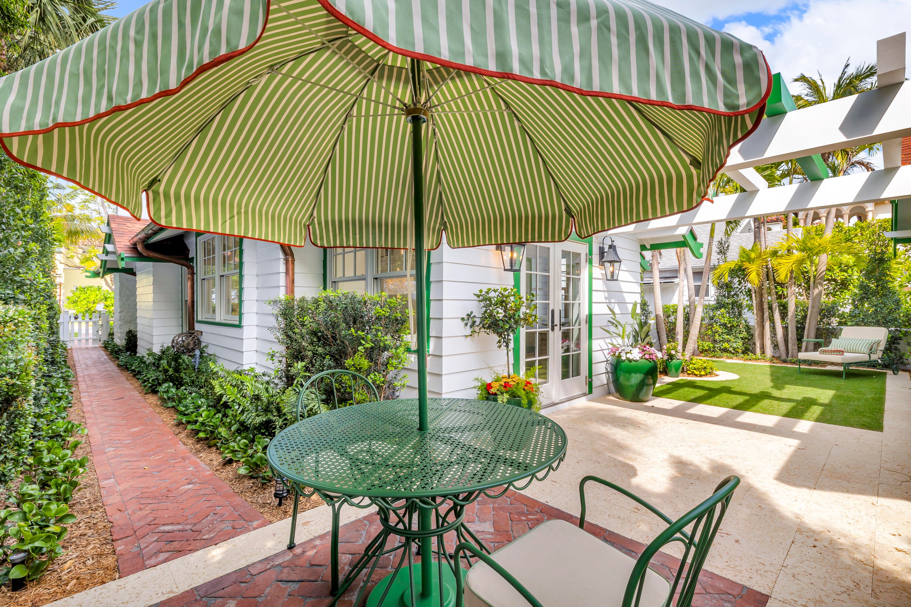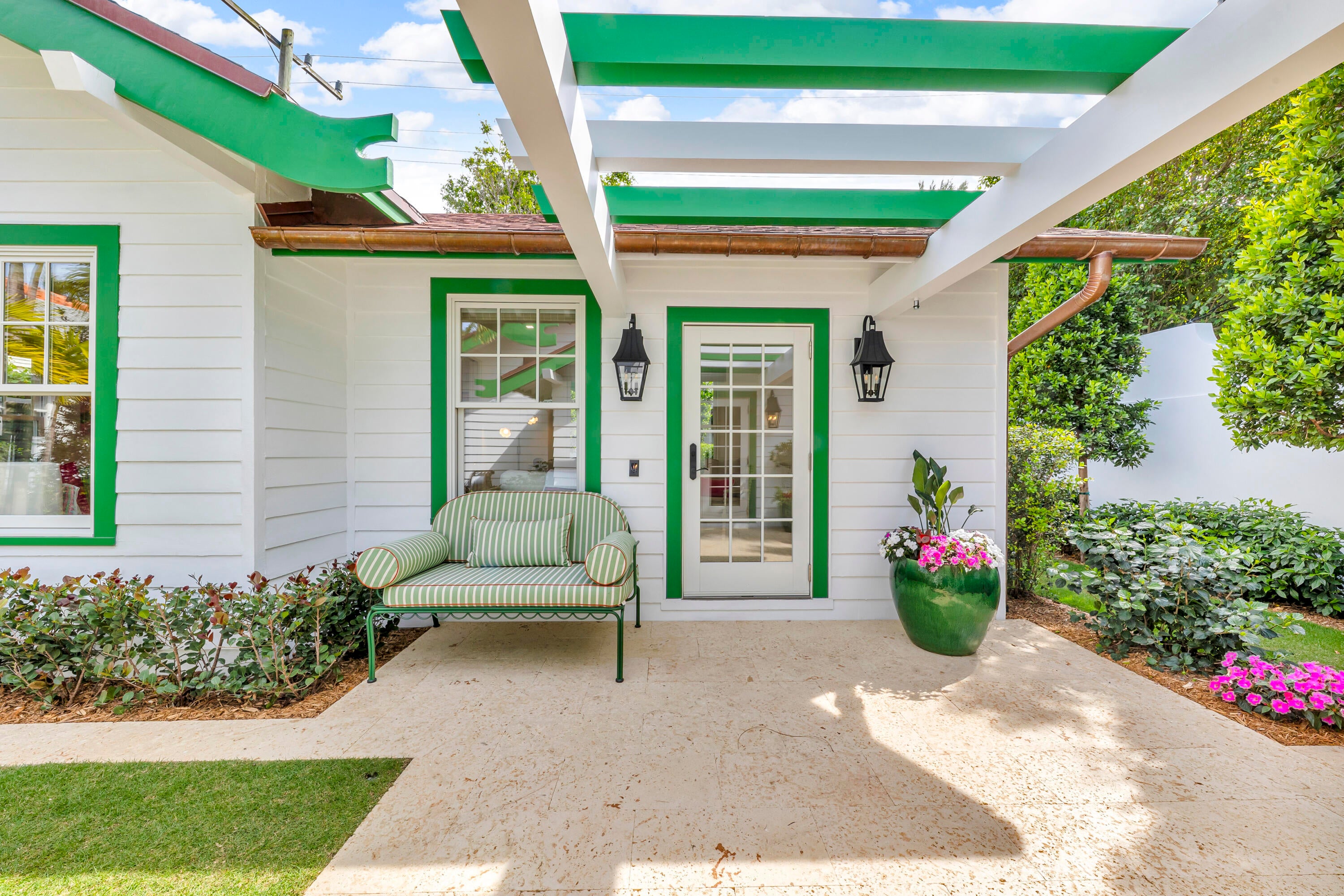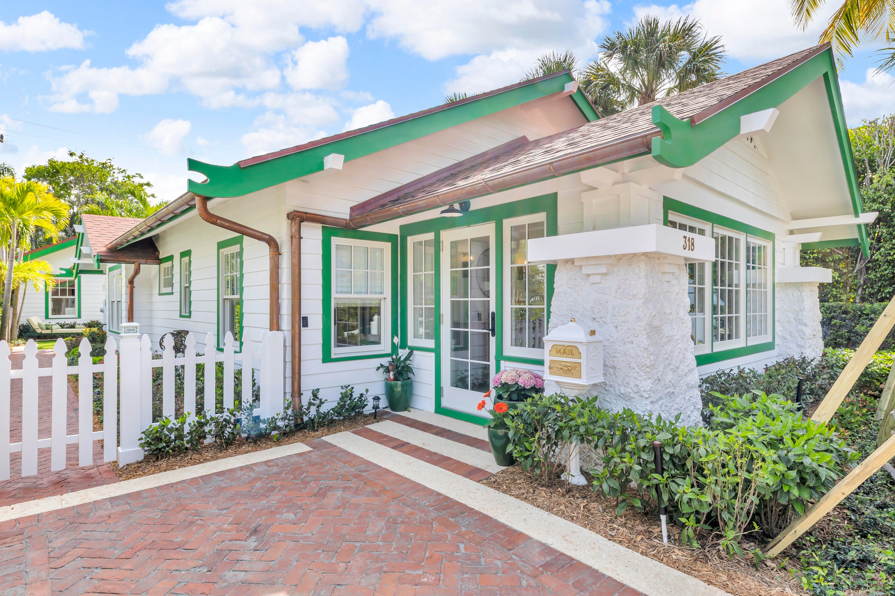 Rare Opportunity to Own a Piece of Palm Beach History. Step back in time when you enter this historic one-story Bungalow, originally built circa 1918. Landmarked by the current owner in November 2023, the home has been completely and lovingly renovated and preserved. This charming Bungalow features impact resistant, Double Hung Andersen windows, a new asphalt shingle roof, copper gutters, Detroit brick walkways, white picket fences and a delightful water fountain feature in the rear yard. Interiors boast original pecky cypress ceilings with matching built-in hutch, a gas fireplace, and an exceptional Jim Dove Design gourmet kitchen, featuring a handsome La Cornue gas stove and leaded glass in the cabinetry. Amazingly, this lot features not one, but two standalonehouses! The main house has two bedrooms and two marble baths. The rear cottage features one bedroom and one bath and a full kitchenette with Miele appliances. The two structures are excellent examples of the Bungalow style of architecture popular in the early twentieth century. Their distinguishing characteristics include the original cypress clapboard siding, low-pitched gable roofs with wide cave overhangs, and exposed rafter tails plus the original front porch Coral stone piers, which match the tall chimney constructed of the same. The landscaping is comprised entirely of Florida native plantings.