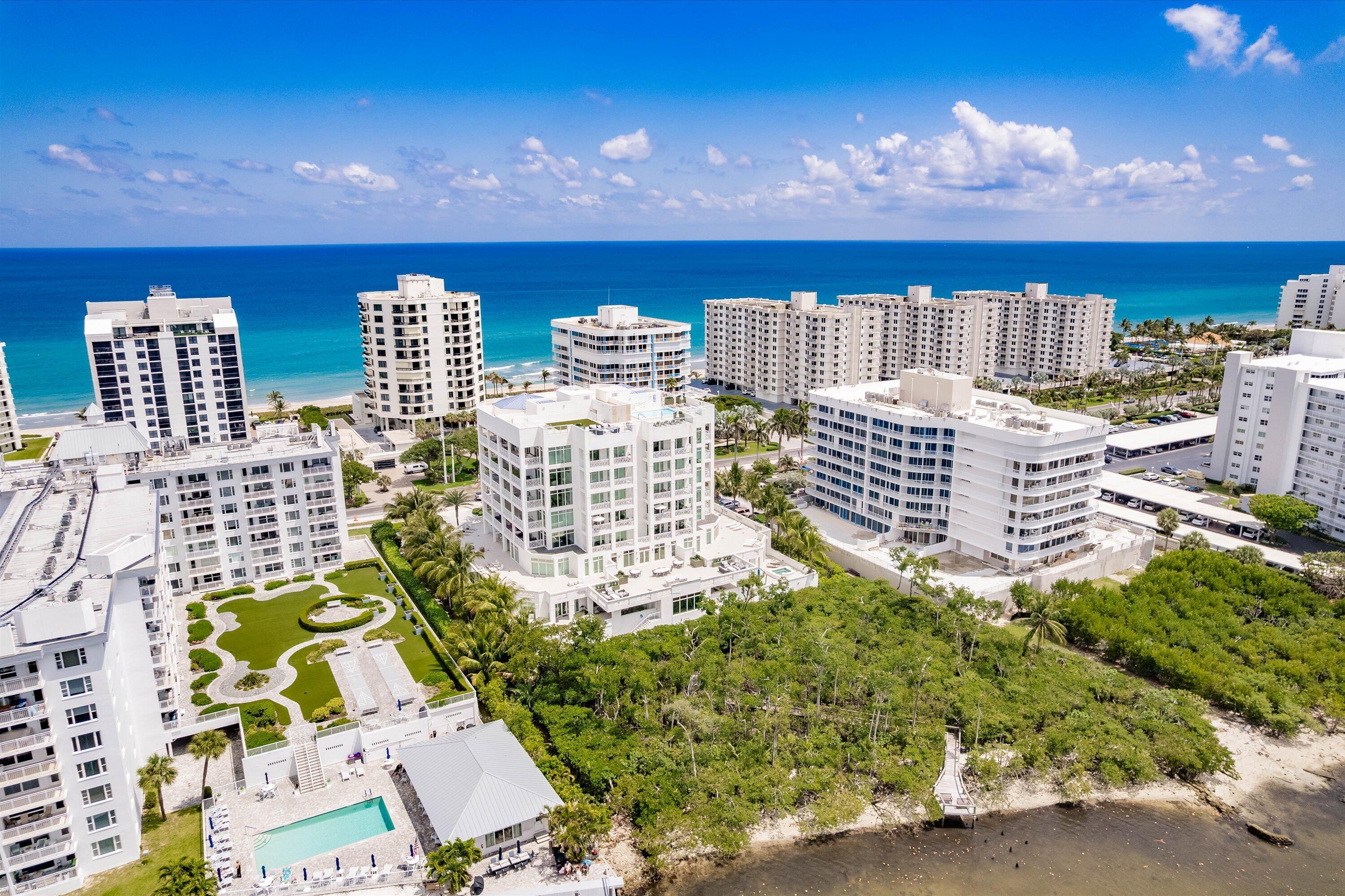 Step into a world of refined coastal luxury in this exceptional 3-bedroom, 3.5-bathroom residence, located on the second floor of an exclusive boutique building completed in 2016. With over 3,500 sq ft of impeccably designed interior space and an expansive 4,000+ sq ft wraparound terrace, this home redefines indoor-outdoor living with sweeping views of the Intracoastal and Atlantic Ocean. A private elevator opens directly into your residence, where clean architectural lines, curated finishes, and sun-drenched interiors set the tone. Two gracious primary suites offer spa-inspired baths and custom wardrobes, while the open-concept living and dining spaces are framed by floor-to-ceiling glass and seamless access to the terrace.