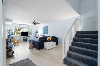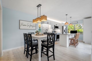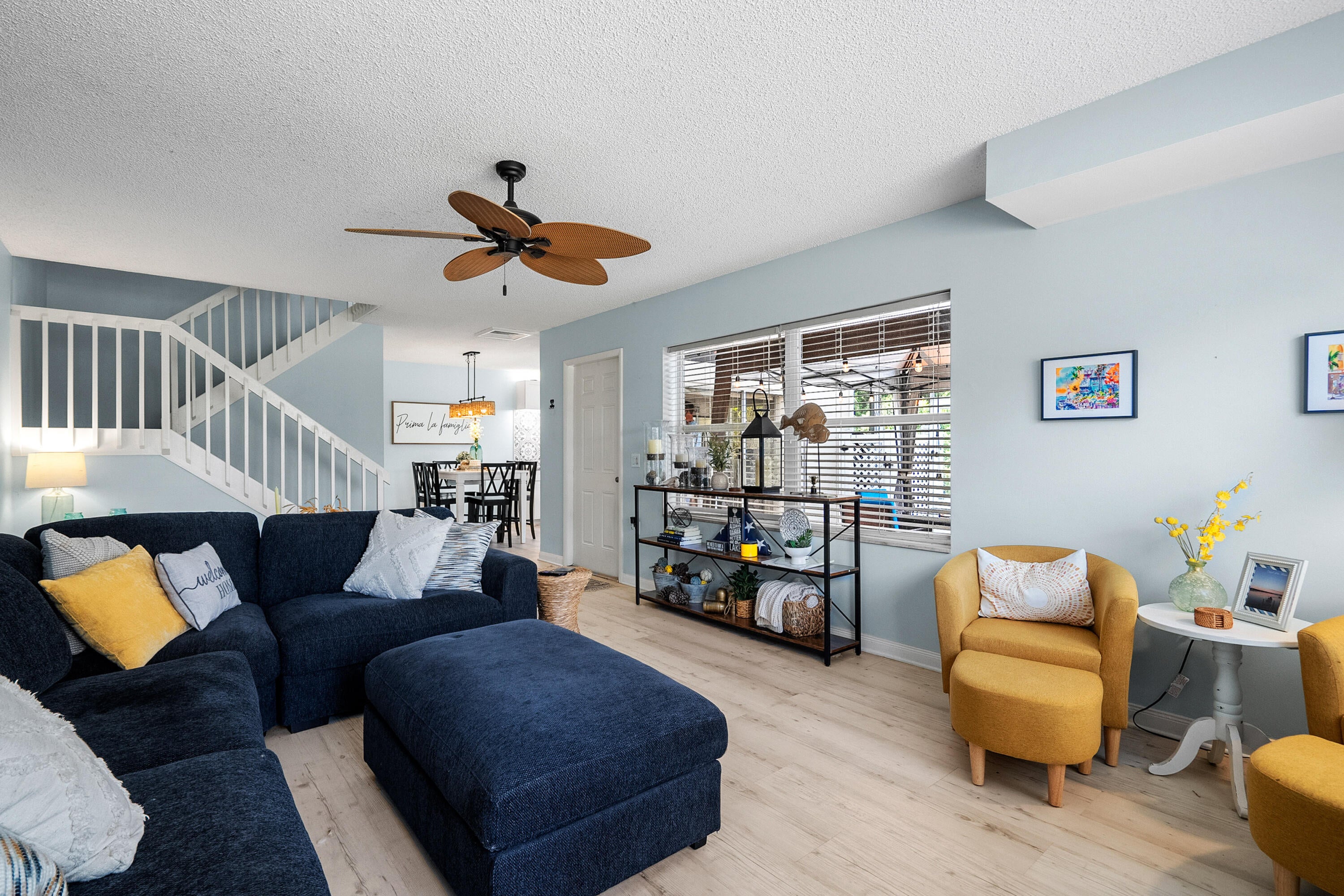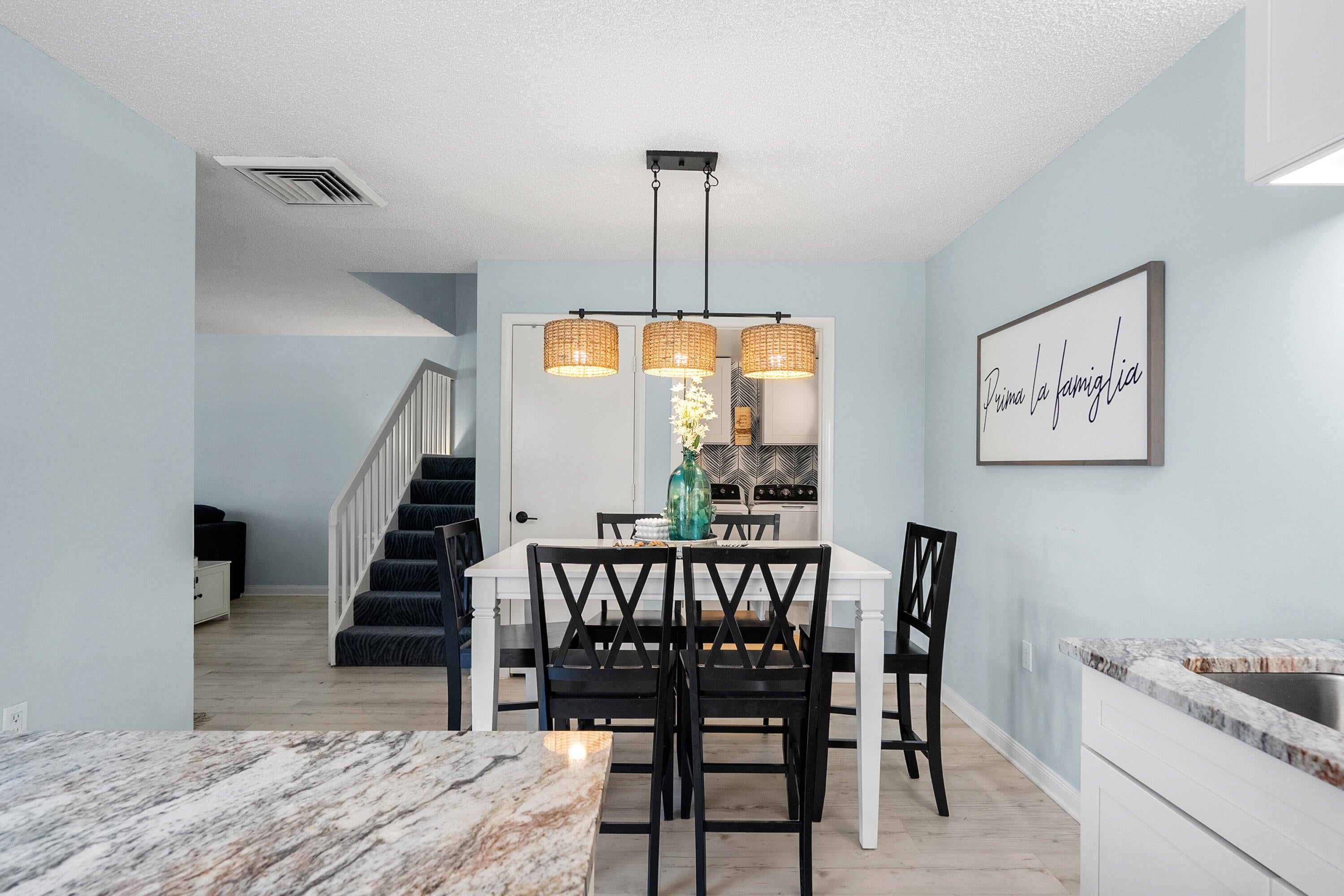 Fresh, stylish & move-in ready! This beautifully updated Stamford model in gated Sunset Trace offers granite countertops, a separate island, patterned backsplash, shiplap accent wall, upgraded lighting, and black hardware throughout. The downstairs features bold wallpaper, updated cabinetry, and a convenient half bath. Upstairs, enjoy a thoughtfully updated guest bath and beautiful pale blue paint. Step outside to a screened patio with serene lake views, an extra-large grassy side and backyard, and lush, professionally designed landscaping--a rare outdoor space perfect for relaxing or entertaining. This townhome stands out with its charm, details, and exceptional location.