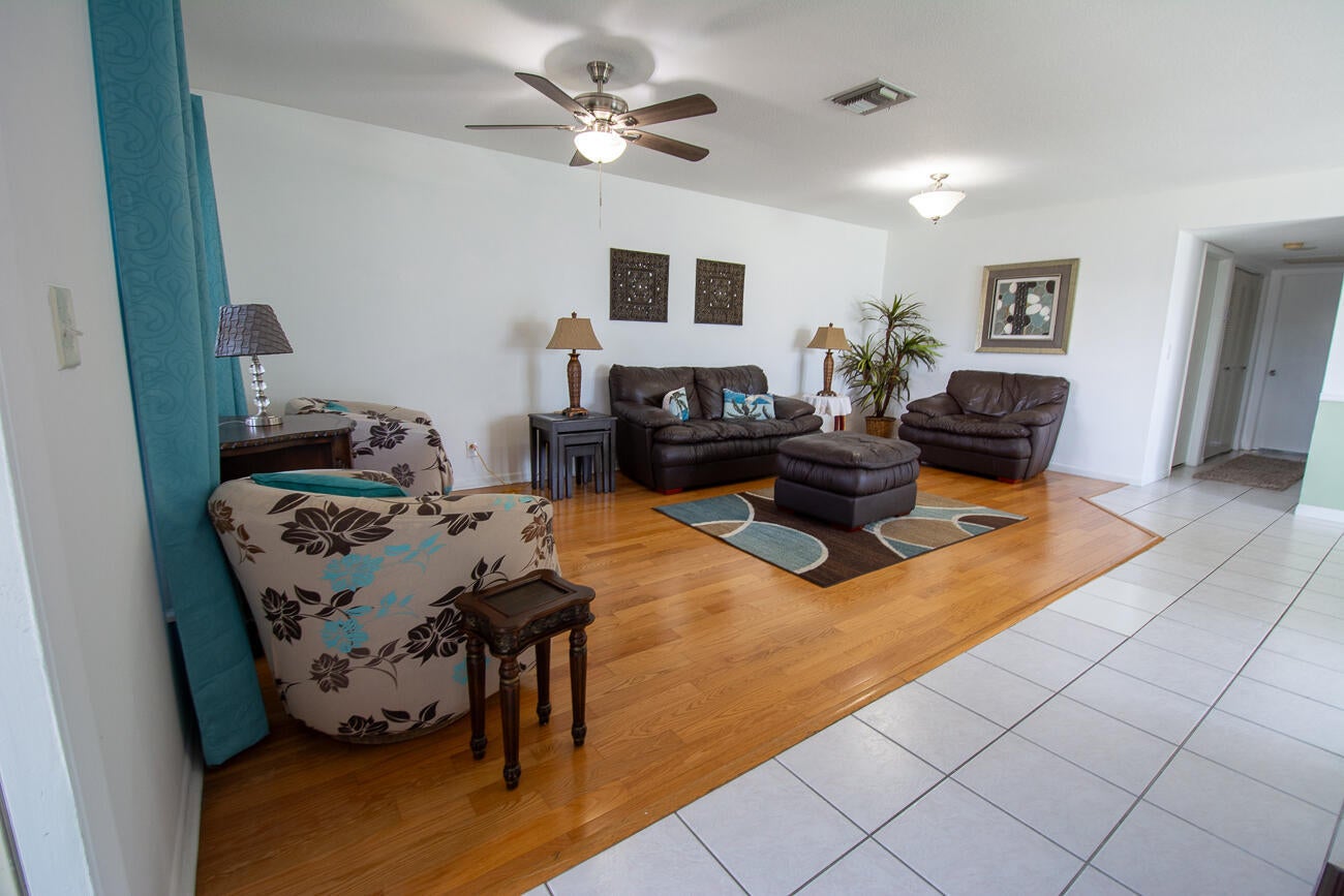Spacious 2 bedroom 2 bath with over 1400sq ft of living space, covered screened patio. Upgraded kitchen cabinets. Flooring is tile and wood laminate. The Community offers heated pool and tennis courts. All ages are welcome in this peaceful community located in the center of everything! 7 minutes to historic downtown Fort Pierce, 13 minutes to beaches, close to shopping, dining, and medical facilities.HOA fee includes exterior building insurance, exterior building maintenance (including roof), water, sewer, trash, cable & internet.Roof was replaced one year ago.
