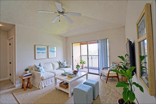 Discover this charming 2-bedroom, 2-bath condo located on the third floor, offering stunning views over the tranquil lake from the private balcony. The open layout provides a comfortable living space filled with natural light, perfect for relaxing or entertaining guests. The community is truly inviting, featuring a luxurious clubhouse and a beautifully large maintained pool, ideal for leisurely swims and social gatherings. Residents also enjoy access to a modern gym and racquetball courts, making it easy to stay active and healthy.Located just 10 to 15 minutes from the breathtaking beaches of Jensen Beach, this condo offers the perfect blend of peaceful lakeside living and convenient access to the area's natural beauty and attractions. Virtually staged photos have been added.