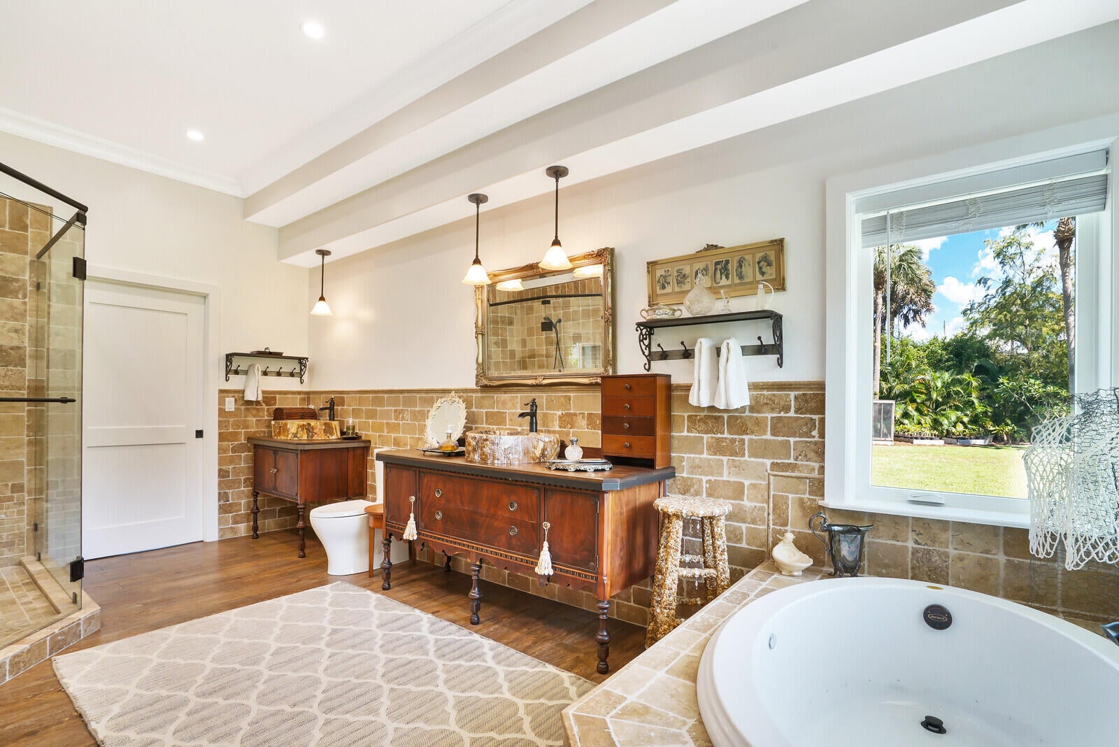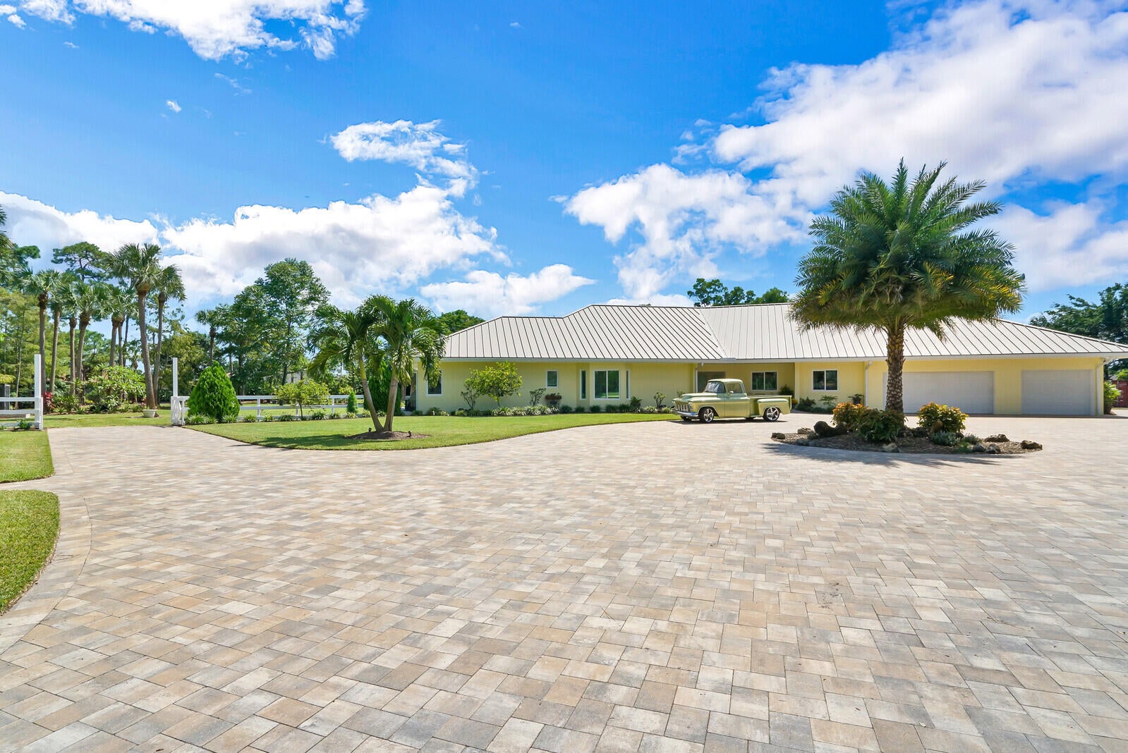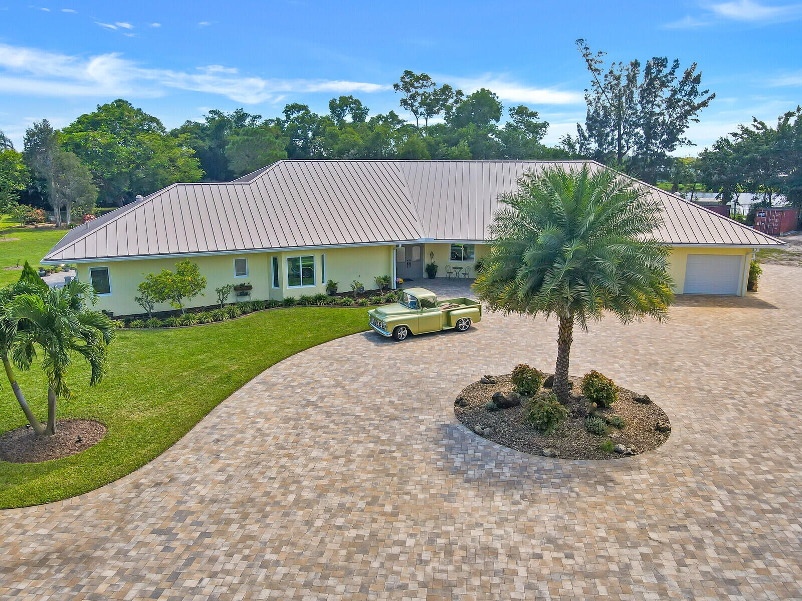 Needle in a Haystack! This Private One Story Oasis sits on 2.39 Acres. Masterfully Reimagined and Redesigned. Reconstructed with New Electrical, Plumbing, Kitchen, Bathrooms, Standing Seam Metal Roof and Custom Millwork. This Private Double Gated Compound is perfect for a Personal Compound, Equestrians, Home Based Business, Airbnb, or Retreat Center. Natural Light Pours into this CBS Built Home w/4 bedroom + Office, 10' High Ceilings throughout, 3 Car Garage with 8,000 sq ft of Brick Paver Circular Driveway. Custom Kitchen with SS Appliances, Granite Counters, Custom soft close Wood Cabinets & Pot Filler. Luxury Commercial Plank Vinyl Flooring throughout.Complete w/Impact Windows & Doors, RV Pad w/Water & Power, Pole Barn, Expansive Pond w/Party Deck, Private Gated Drive and Fully Fenced Yard. Entertainer's Dream with Huge Gathering Spaces pouring out on Covered Lanai with drop down TV & remote. New HWH, 2 zone AC (one new in 2022), LED Lighting. Master Bathroom has Separate Shower and Jacuzzi Tub., Dual Vanities and access to Lanai. Gorgeous landscaping w/Fruit and other Ornamental Trees. Close in and one of a kind! Non-HOA, Horses permitted, two 20' Storage containers convey. Incredible Location with Close Proximity to PBI Airport, I-95, FL Turnpike, Okeeheelee Park, Restaurants, Greenacres Green Market and Wellington Shopping and Entertainment.