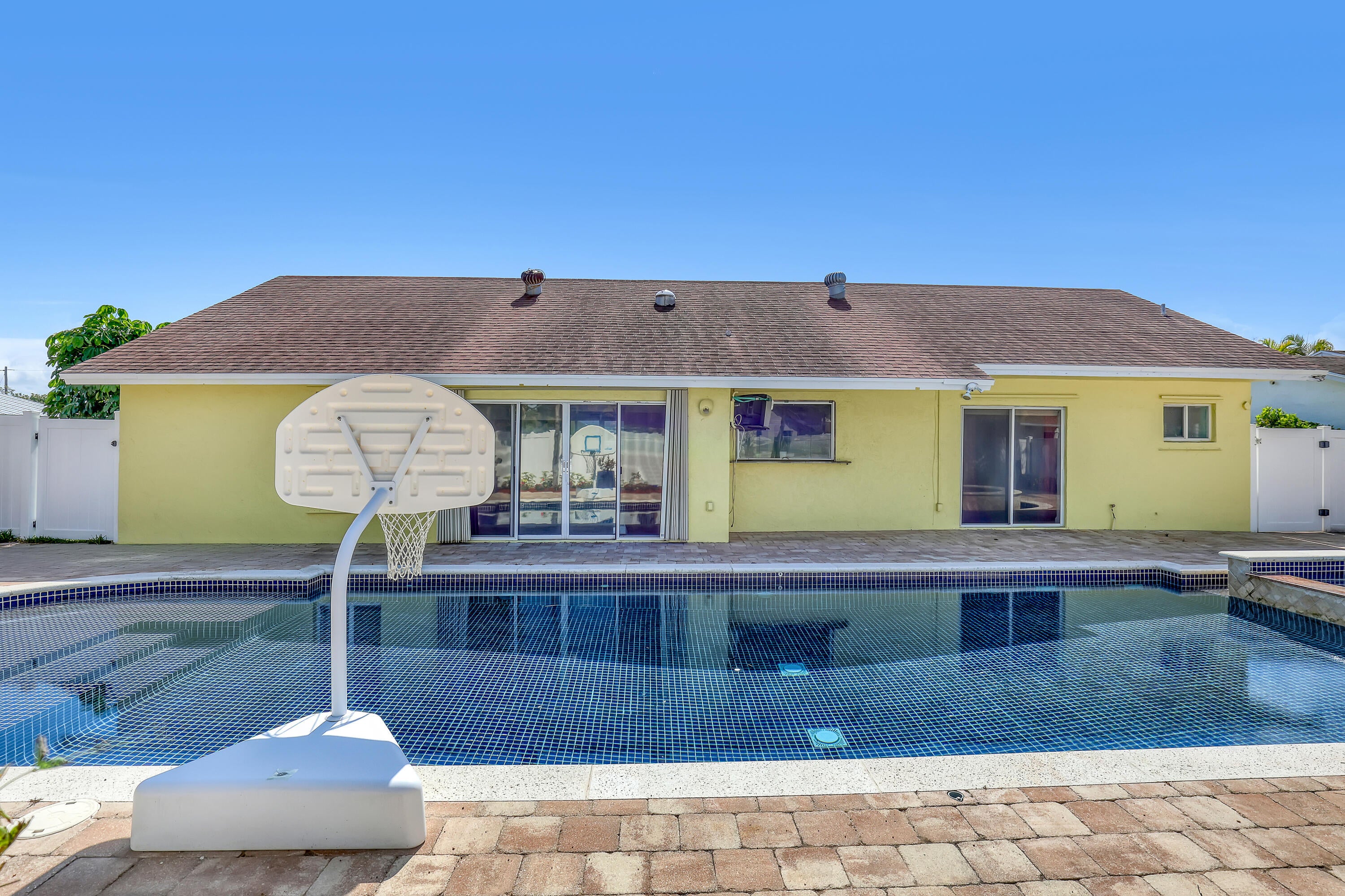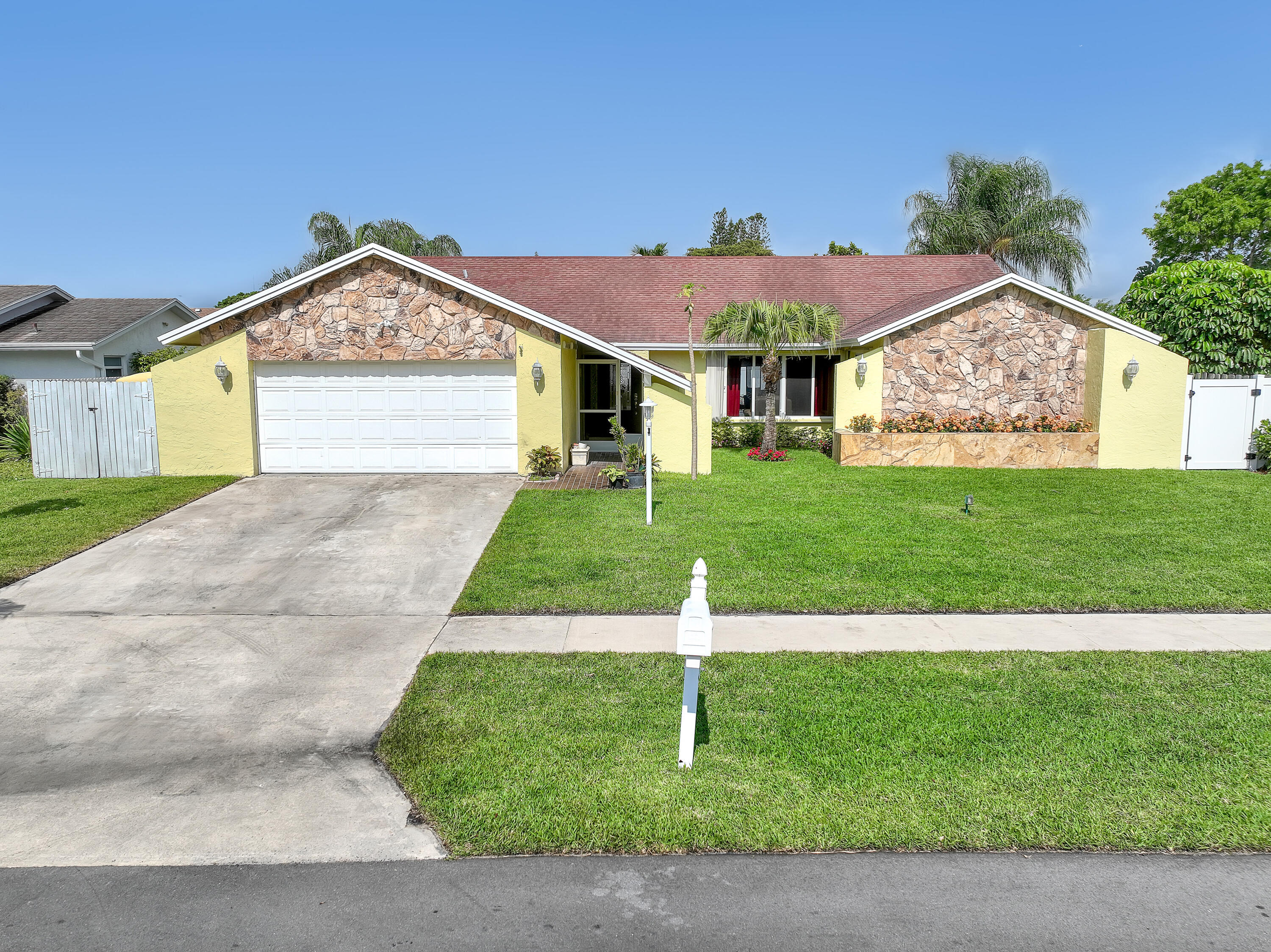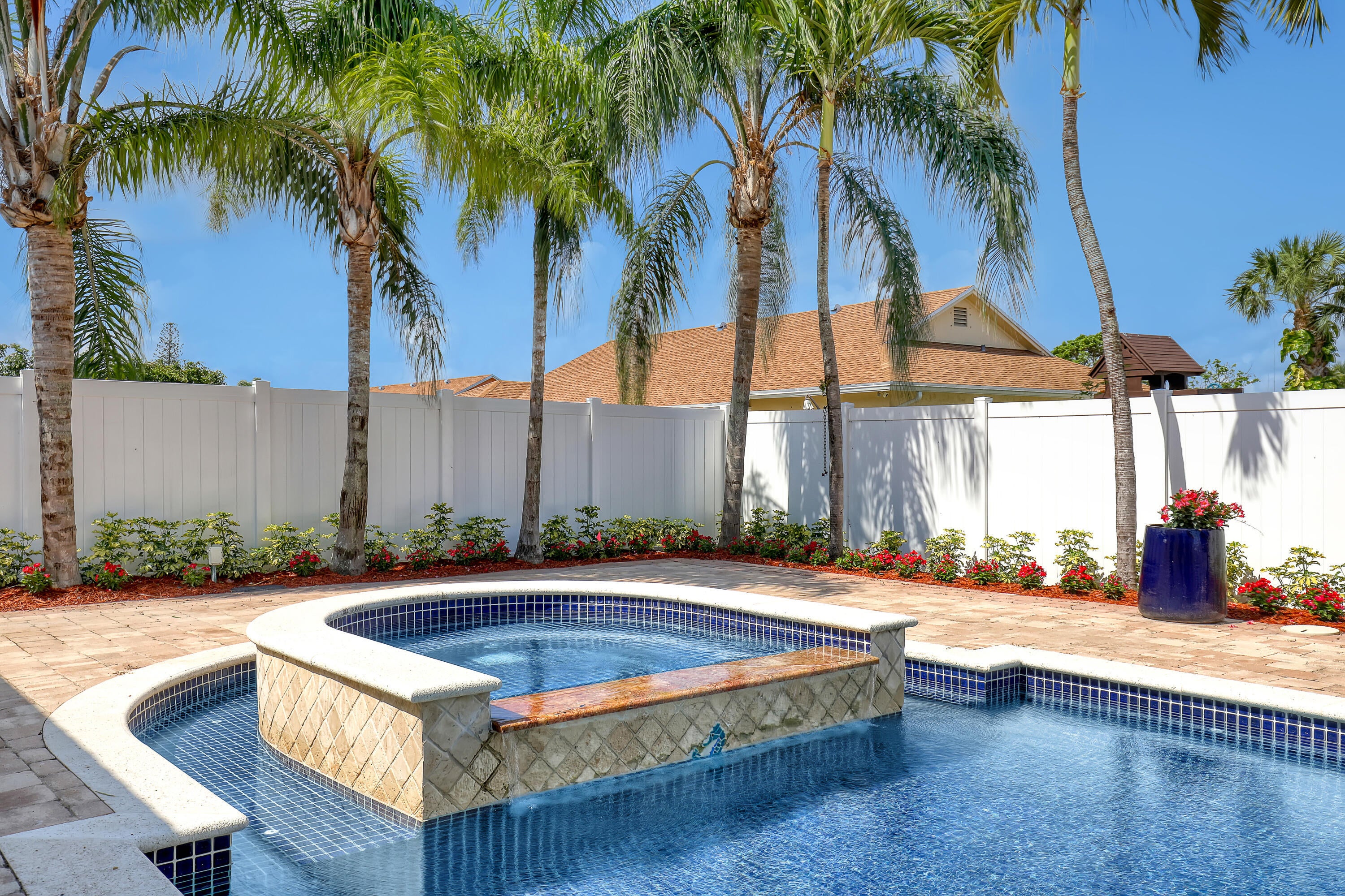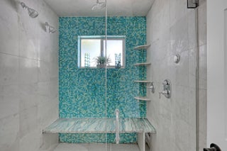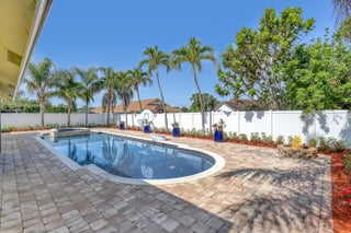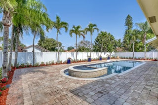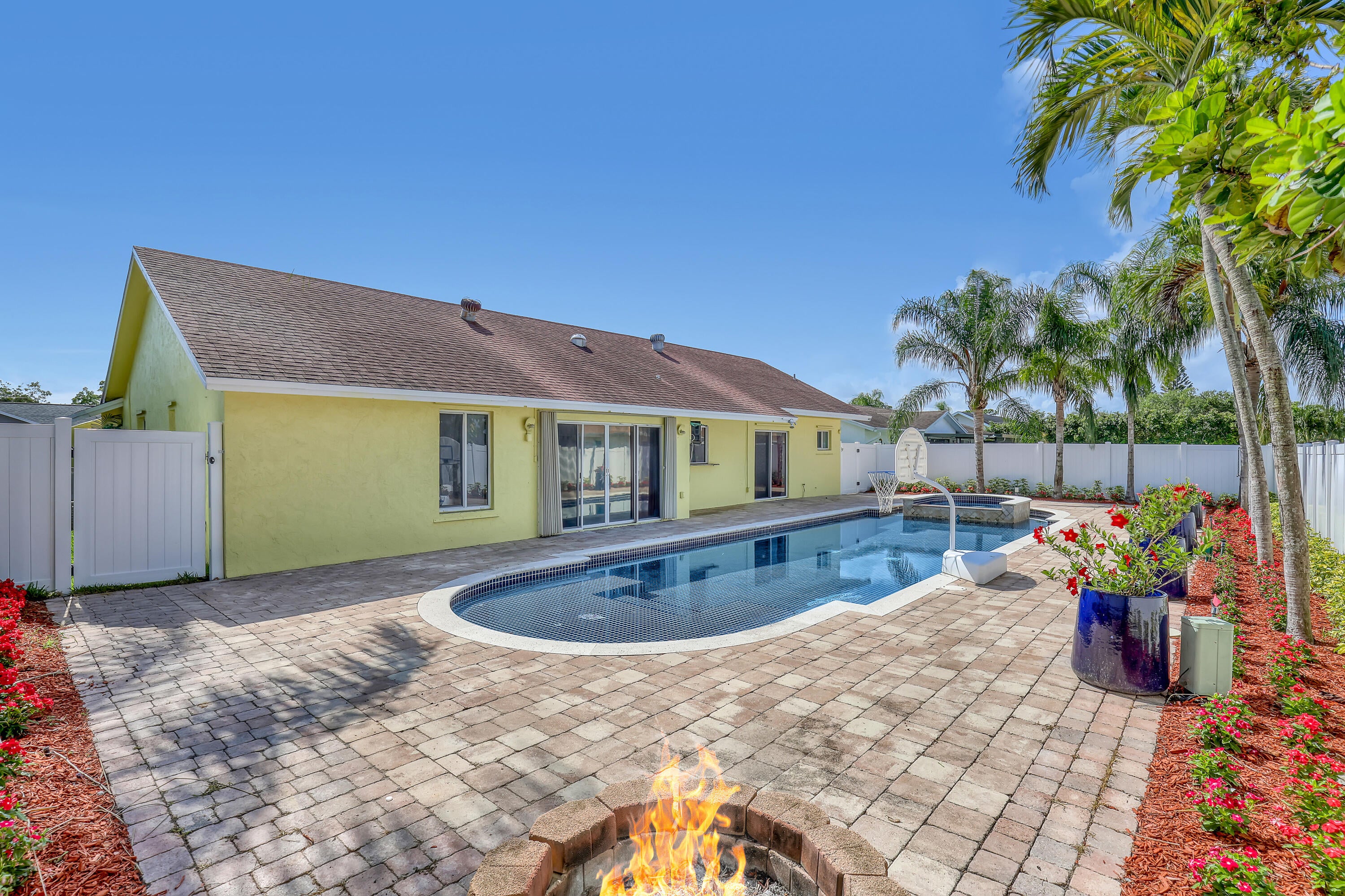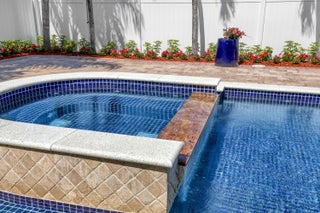 Lakes of Sherbrooke! CBS 3-bed, 2-bath home w/marble flooring, wood flooring, Crown molding, chair rail throughout. Beautiful marble countertops AND backsplash, SS appliances (brand new fridge), open kitchen with bar top allowing pool views. Abundant natural light, featured lighting inside and out! Guest bath: double vanity, custom floor-to-ceiling tiled walls w/walk in shower. Primary bath: Steam shower! w/bench and exquisite tile work. Pool access from primary and dining rooms. Entertain around the huge glass tile pool, 6 person spa, fire pit and lush landscaping surrounded by Palm Trees. Totally paved, outdoor shower, custom irrigation system, FULL HOME generator to convey. BRAND NEW ROOF! Great Schools, Unbeatable location. See document section to learn about your new lifestyle.