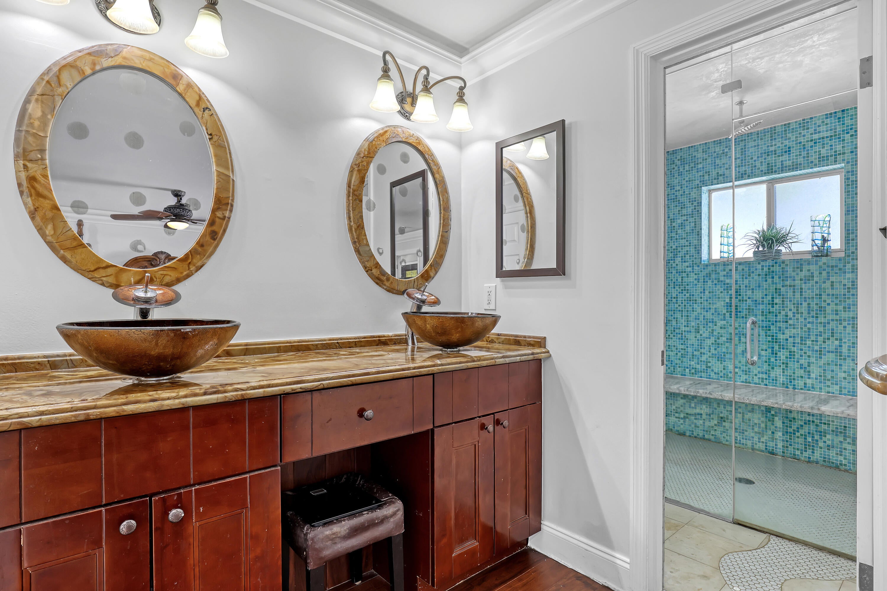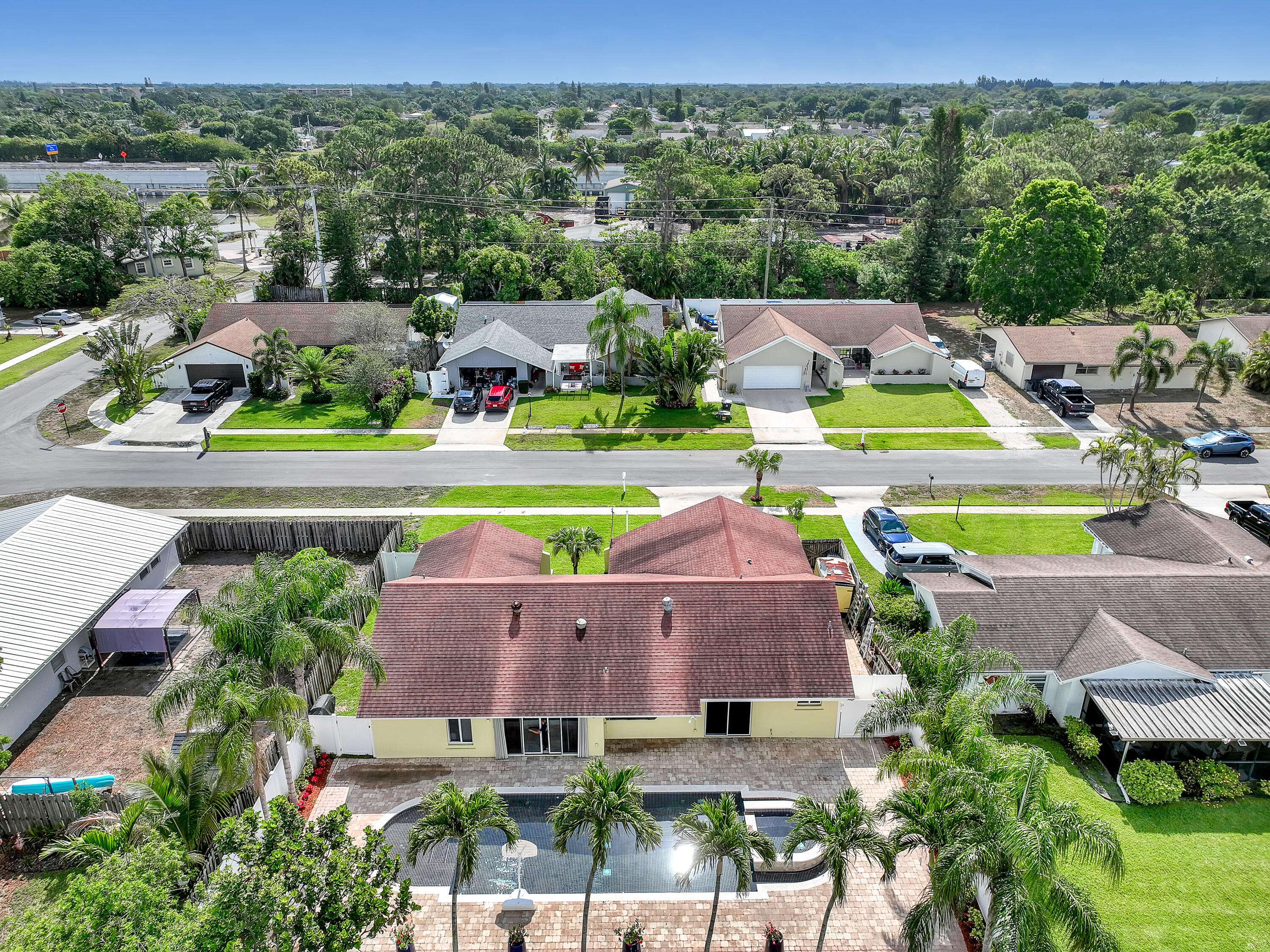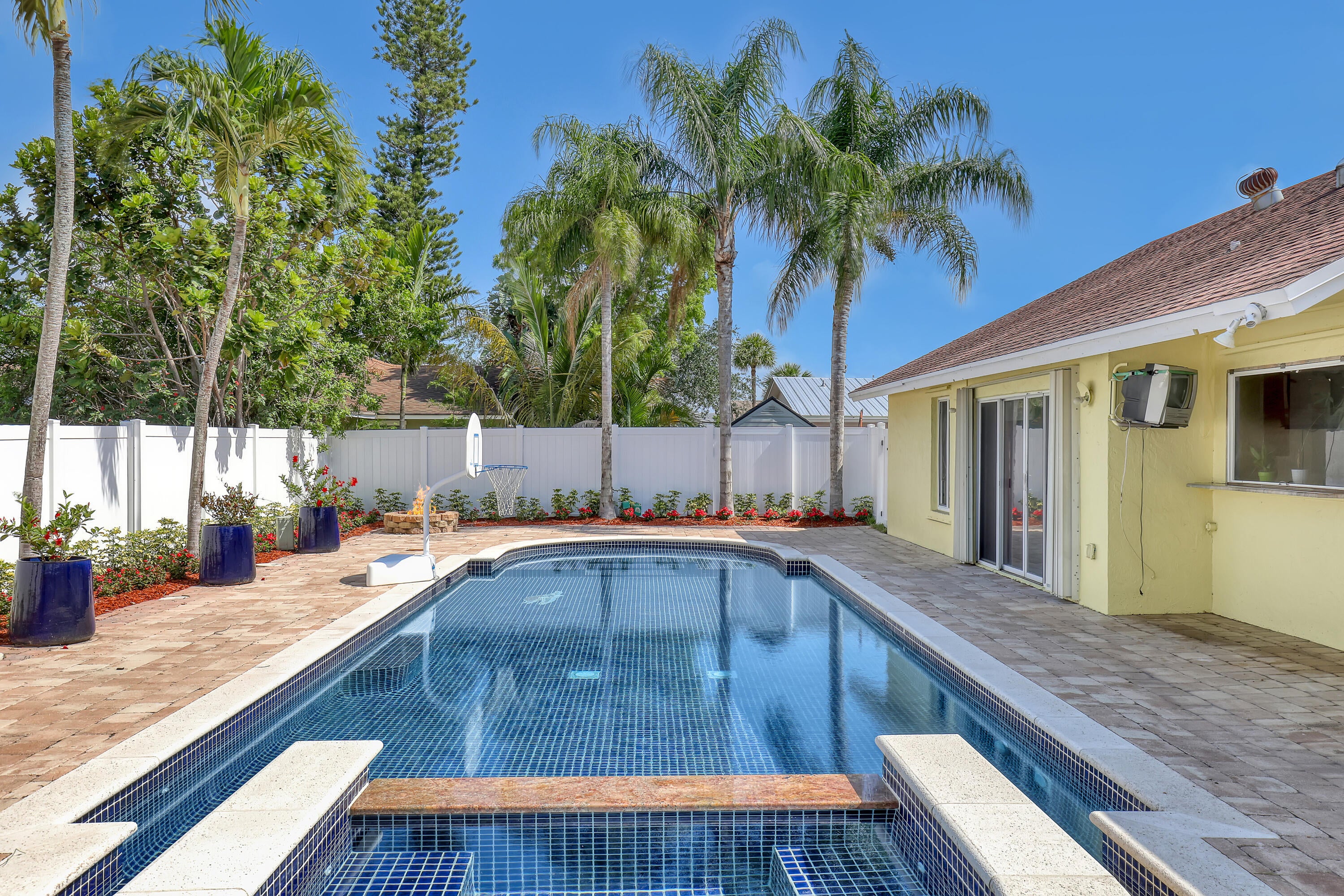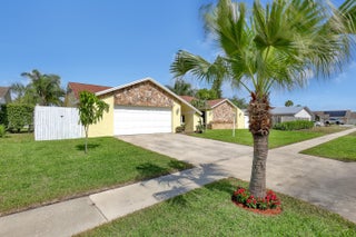 Lakes of Sherbrooke! CBS 3-bed, 2-bath home w/marble flooring, wood flooring, Crown molding, chair rail throughout. Beautiful marble countertops AND backsplash, SS appliances (brand new fridge), open kitchen with bar top allowing pool views. Abundant natural light, featured lighting inside and out! Guest bath: double vanity, custom floor-to-ceiling tiled walls w/walk in shower. Primary bath: Steam shower! w/bench and exquisite tile work. Pool access from primary and dining rooms. Entertain around the huge glass tile pool, 6 person spa, fire pit and lush landscaping surrounded by Palm Trees. Totally paved, outdoor shower, custom irrigation system, FULL HOME generator to convey. BRAND NEW ROOF! Great Schools, Unbeatable location. See document section to learn about your new lifestyle.