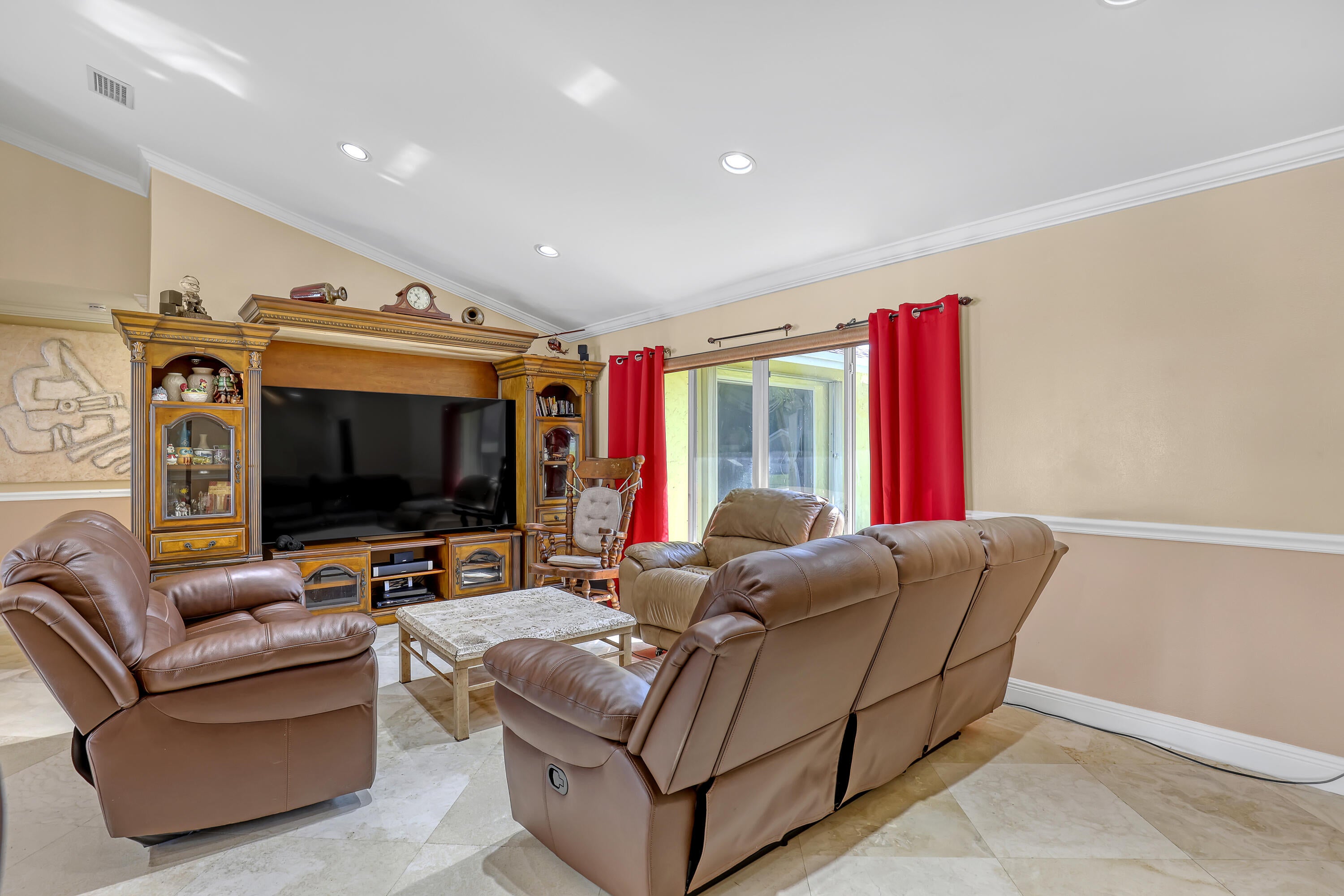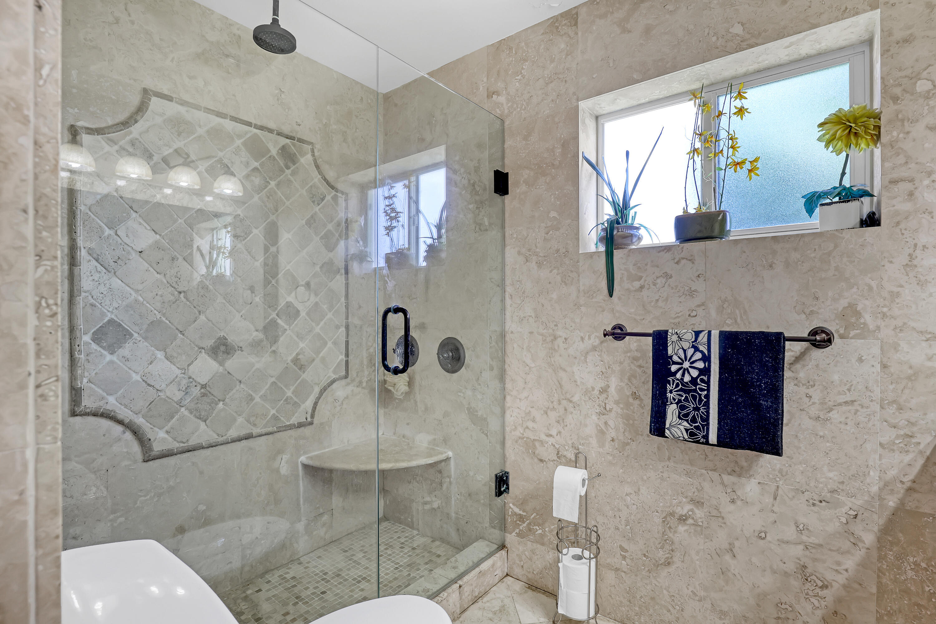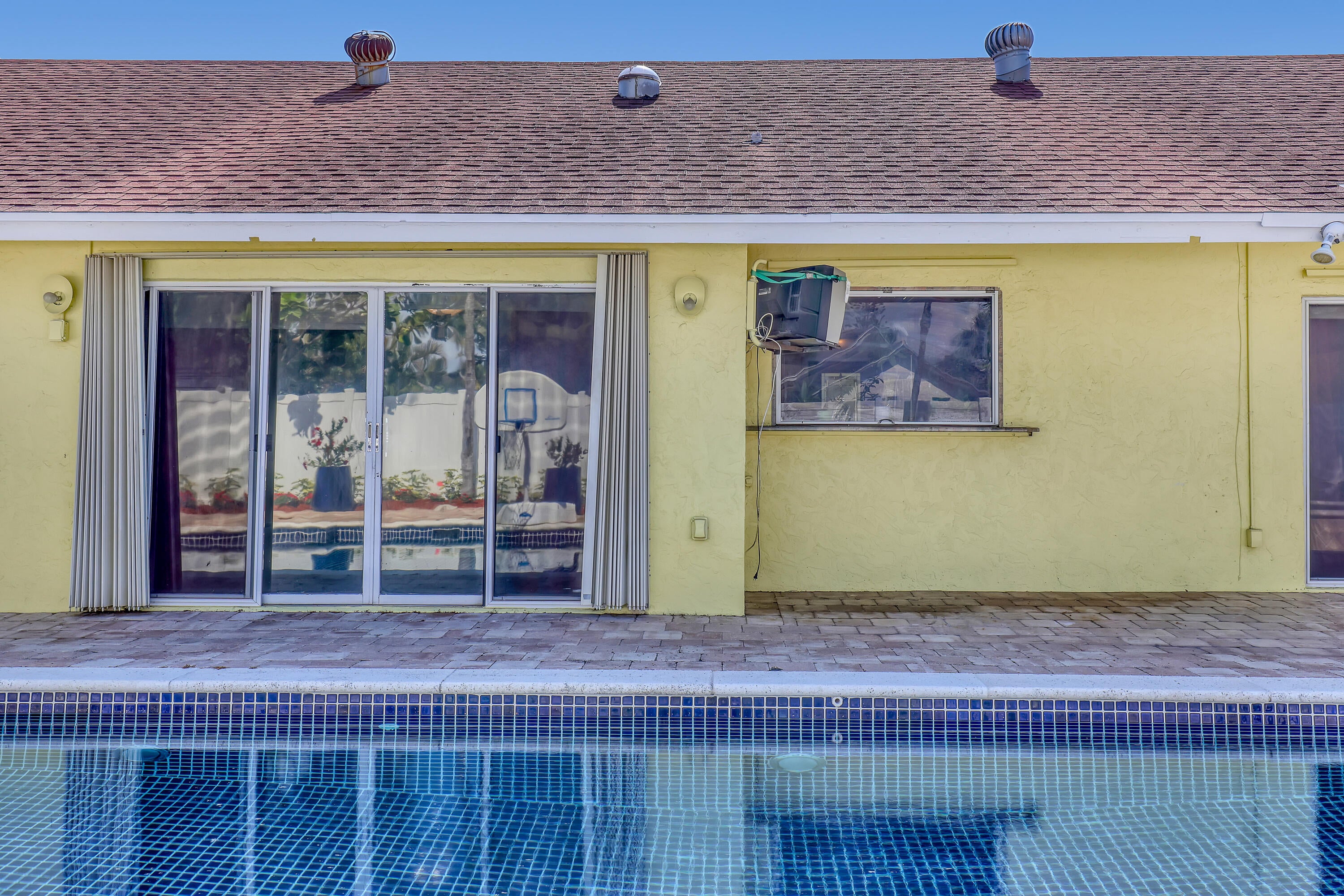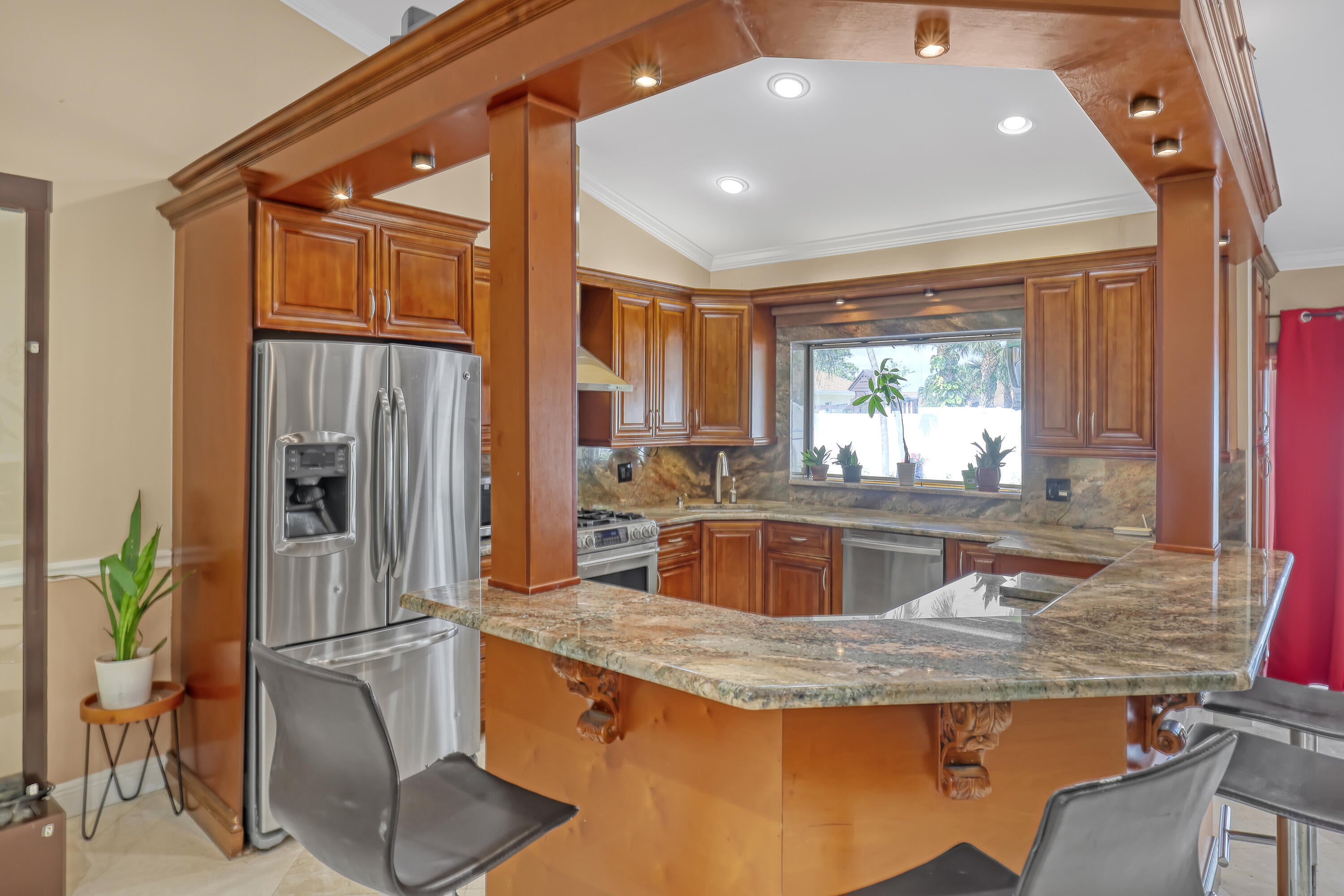 Lakes of Sherbrooke! CBS 3-bed, 2-bath home w/marble flooring, wood flooring, Crown molding, chair rail throughout. Beautiful marble countertops AND backsplash, SS appliances (brand new fridge), open kitchen with bar top allowing pool views. Abundant natural light, featured lighting inside and out! Guest bath: double vanity, custom floor-to-ceiling tiled walls w/walk in shower. Primary bath: Steam shower! w/bench and exquisite tile work. Pool access from primary and dining rooms. Entertain around the huge glass tile pool, 6 person spa, fire pit and lush landscaping surrounded by Palm Trees. Totally paved, outdoor shower, custom irrigation system, FULL HOME generator to convey. BRAND NEW ROOF! Great Schools, Unbeatable location. See document section to learn about your new lifestyle.