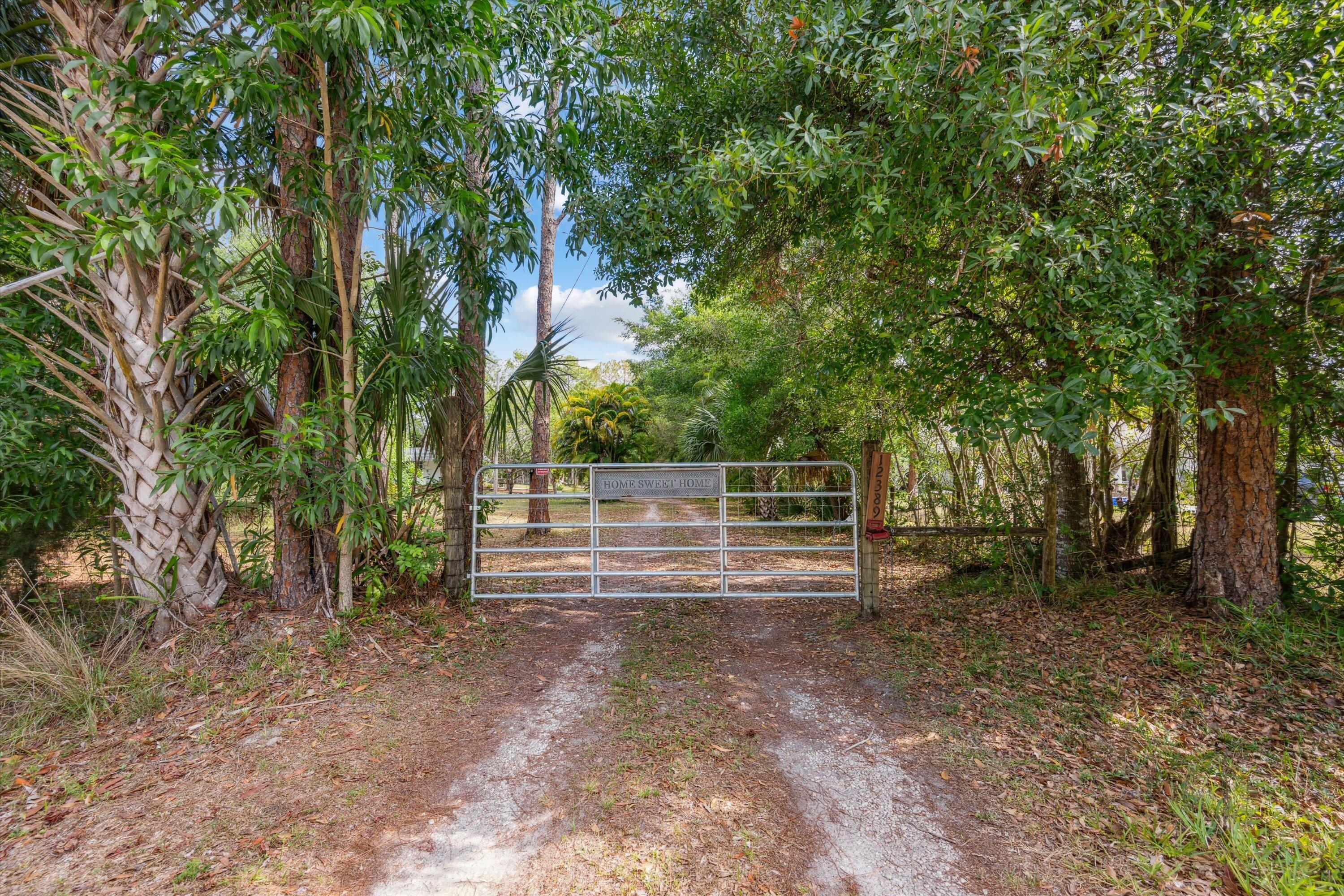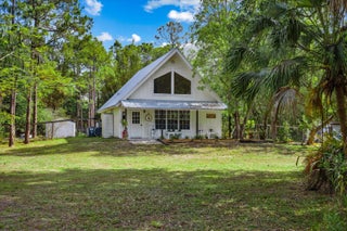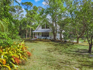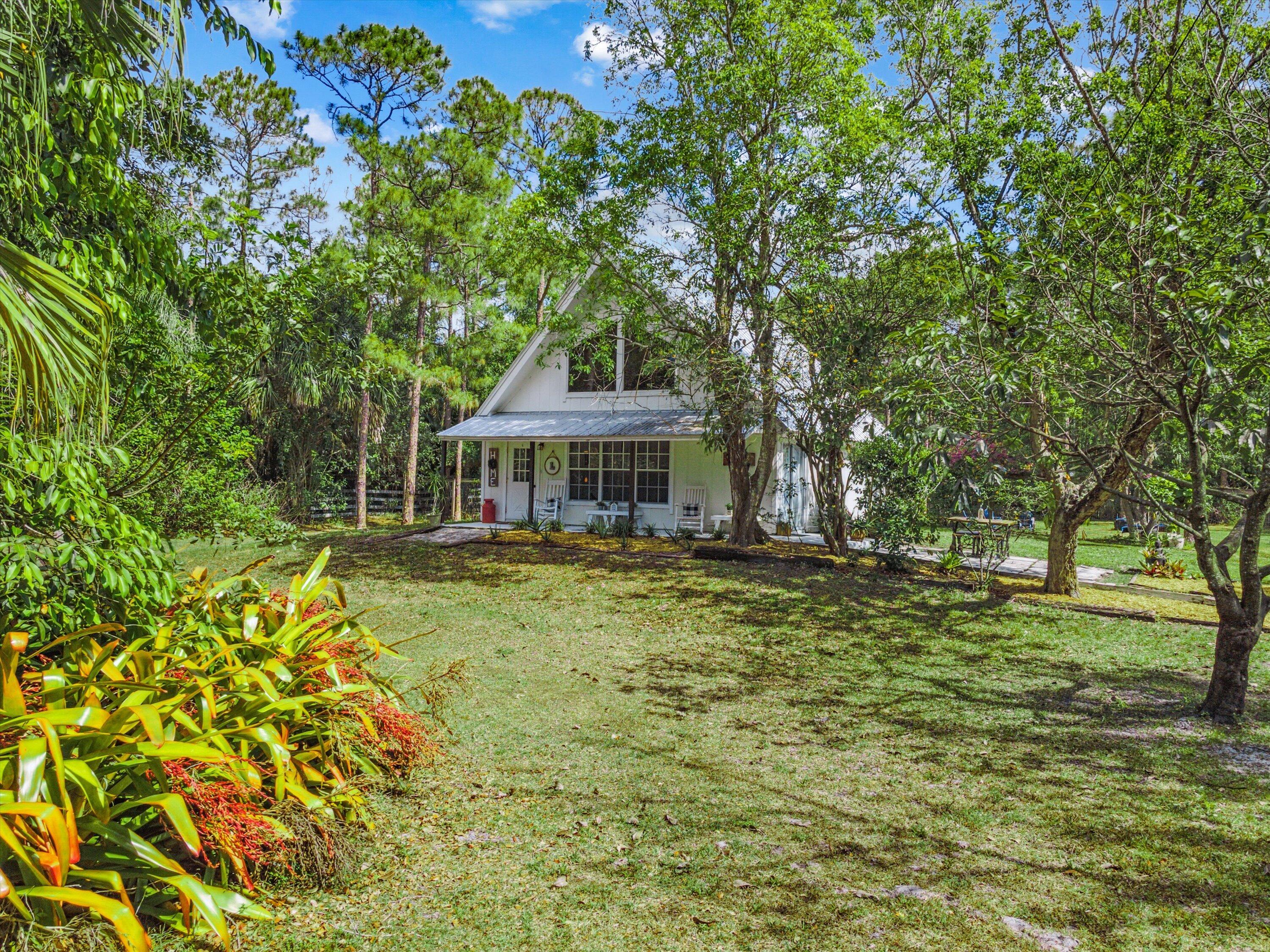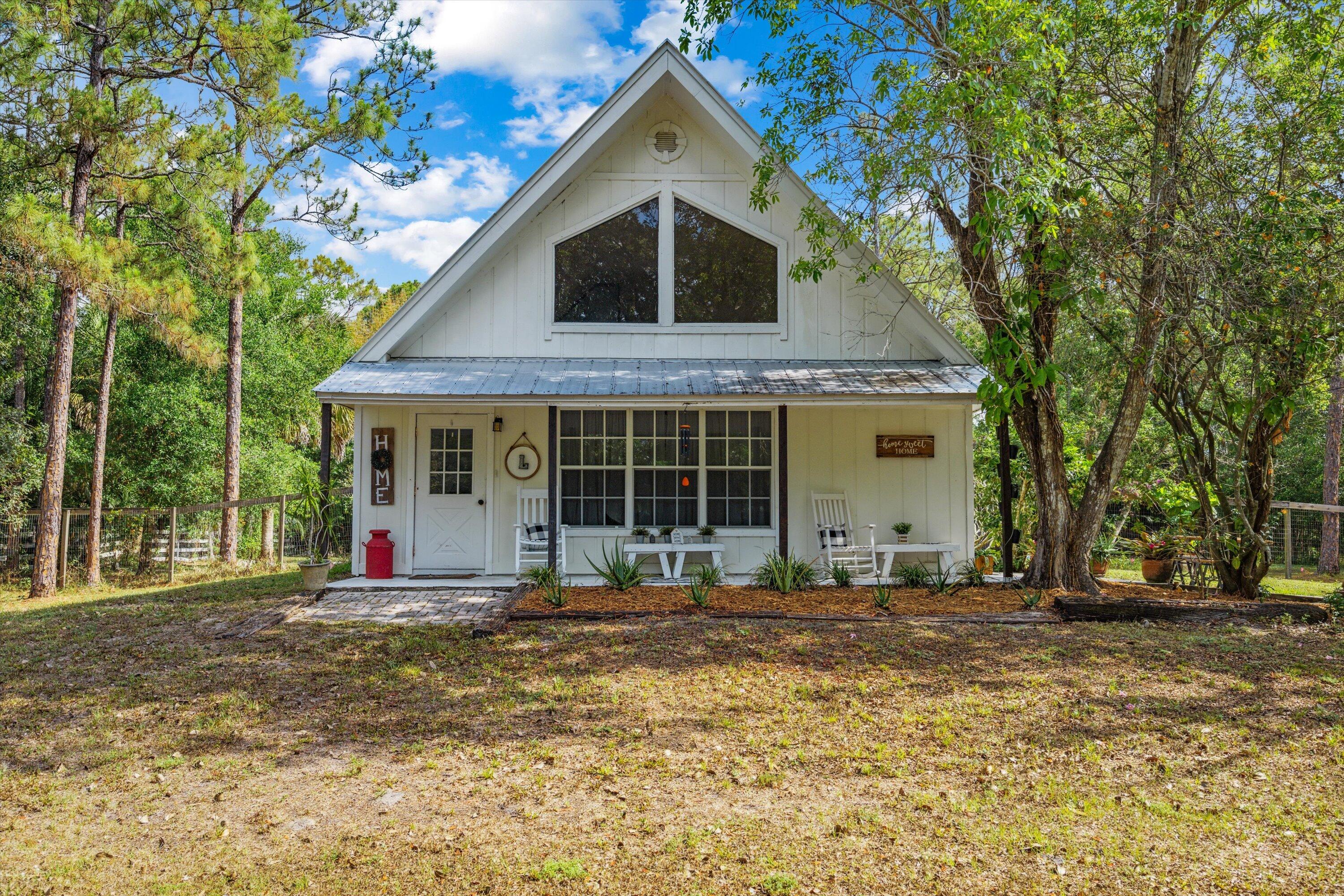 Tucked away on a quiet street in Jupiter Farms, this cozy A-frame home offers the perfect blend of natural beauty, functional updates, and laid-back Florida living. Surrounded by nature and set on 1.20 acres of fully fenced land, the property is ideal for those who appreciate space, privacy, and versatility.The interior features soaring vaulted ceilings and large windows that flood the home with natural light. The kitchen is modernly updated with white cabinets, stainless steel appliances, and an open layout that flows into the living area. A designated dining space and small island with a breakfast bar make it both functional and inviting. Wood-look tile flooring adds warmth and durability throughout the main level. The master bedroom is upstairs with updatedluxury vinyl plank flooring, a renovated bathroom, and custom barn doors on the closet. Step out onto the private master balcony and take in the peaceful views of your beautiful property Downstairs are two more bedrooms, a full updated bathroom, and a laundry closet with custom made barn doors. Recent improvements include: 2017 metal roof New A/C system (2022) New hot water heater (2021) New septic drain field (2020) Fresh interior and exterior paint New well tank with a 5-year warranty Outside, enjoy a tranquil front pond, mango and banana trees, a fire pit gathering area, and three backyard shedsone with power, A/C, and a concrete slab. There's also an additional slab ready for your RV, boat, or extra parking needs. A new front gate adds to the property's security and curb appeal. No HOA means endless possibilities - bring your chickens, horses, goats, or other farm animals. Zoned for A-rated schools and just minutes from the beach, I-95 and the Turnpike, local parks including Riverbend Park with 600+ acres of trails and kayaking, and all the conveniences of Indiantown Roads restaurants and shops. Whether you're looking for a quiet homestead, weekend escape, or space to grow, this Jupiter Farms gem delivers.