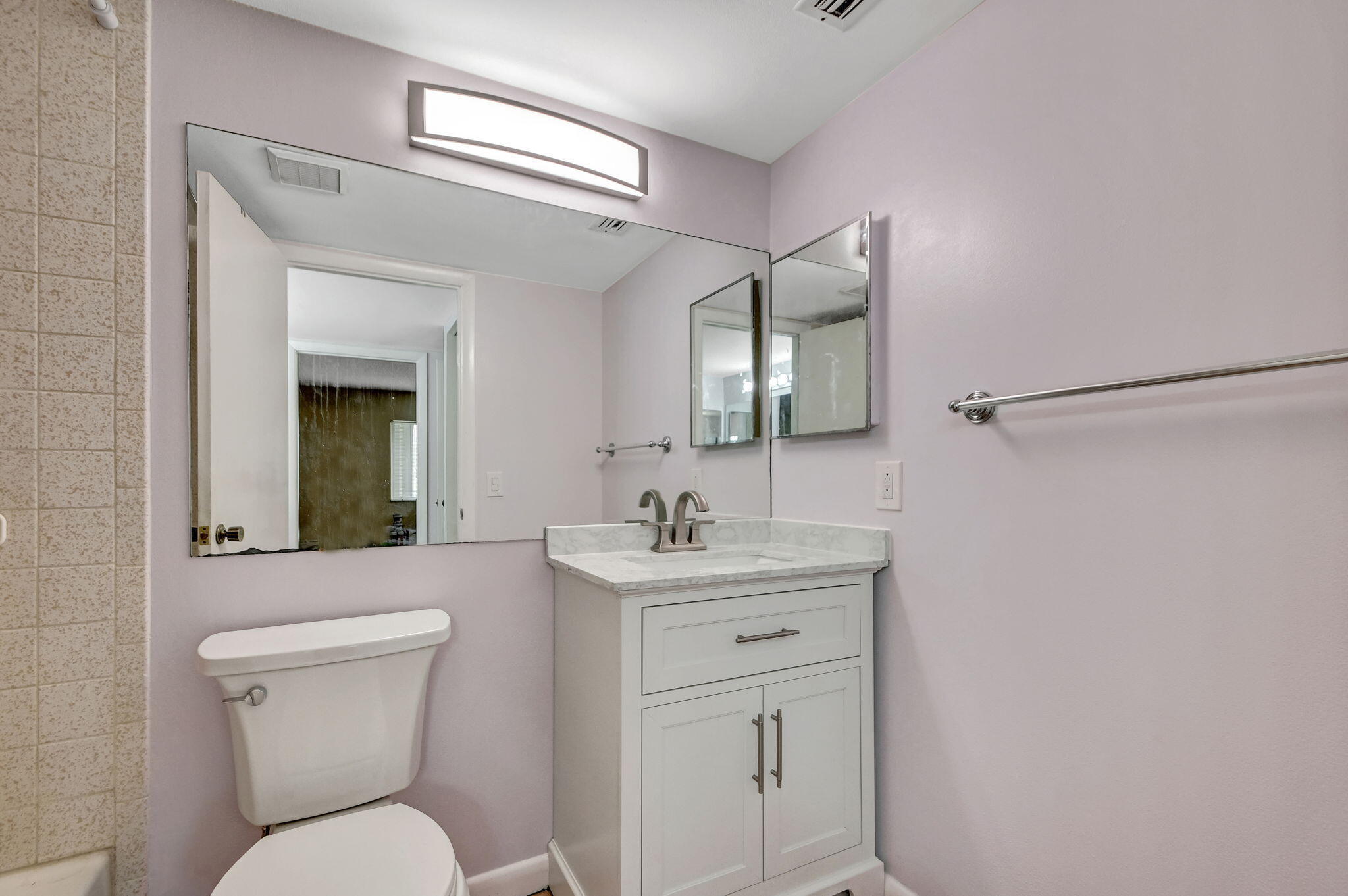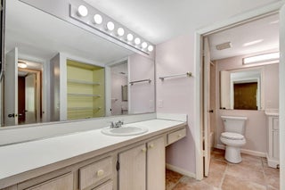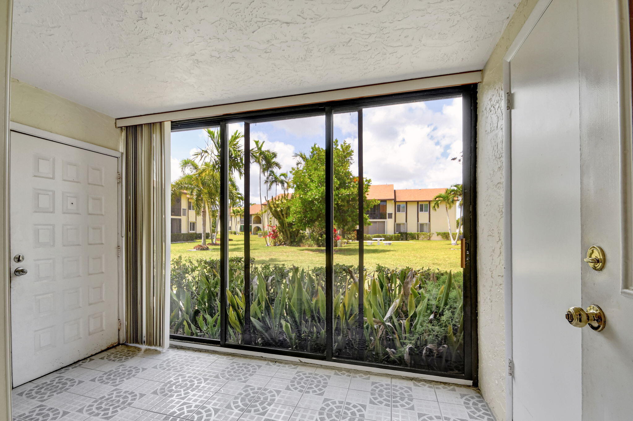 Desirable first floor 2-bedroom condo in a well-maintained 55+ community, just a short walk from the clubhouse and pool. Enclosed front patio with sliding glass doors offers year-round comfort and views of the large serene grass courtyard. Features include ceramic tile throughout, two-tone paint, and a large living/dining area. Renovated kitchen (2023) with white shaker cabinets and slow close doors, granite counters, stainless sink, new plumbing, LED lighting, flat-top range, microwave, dishwasher. Utility room with washer/dryer. Updated full bath (2023) with modern vanity, Kohler fixtures, LED lighting, and high-efficiency toilet.Additional powder room perfect for guests. Walk-in closets in both bedrooms. Accordion hurricane shutters installed. One full-time resident must be 55+, additional occupants 35+.