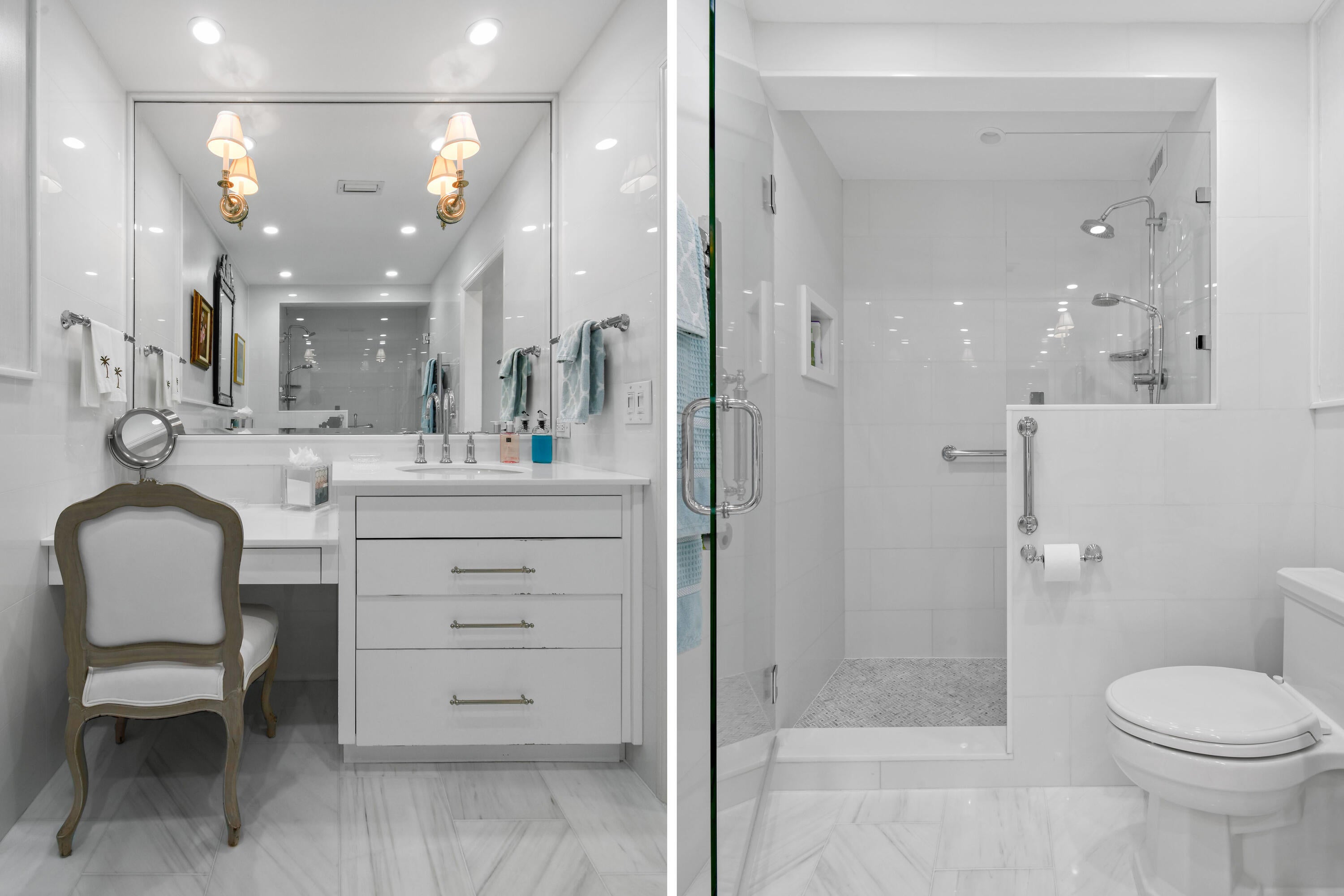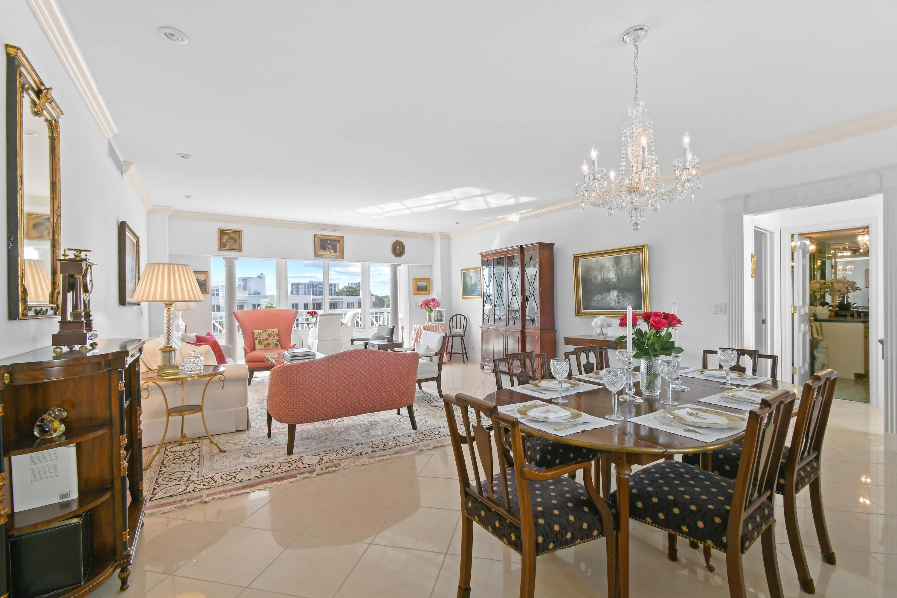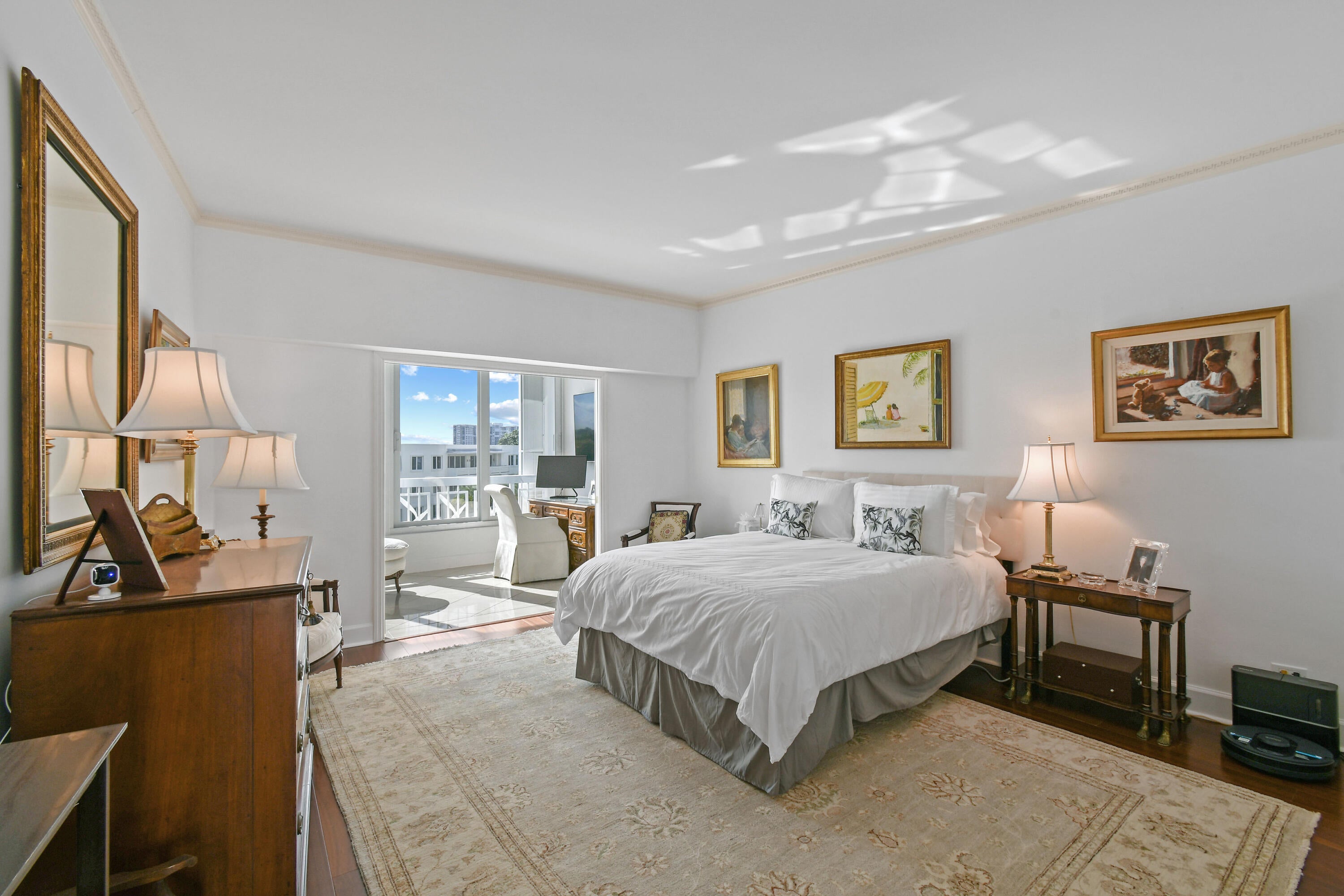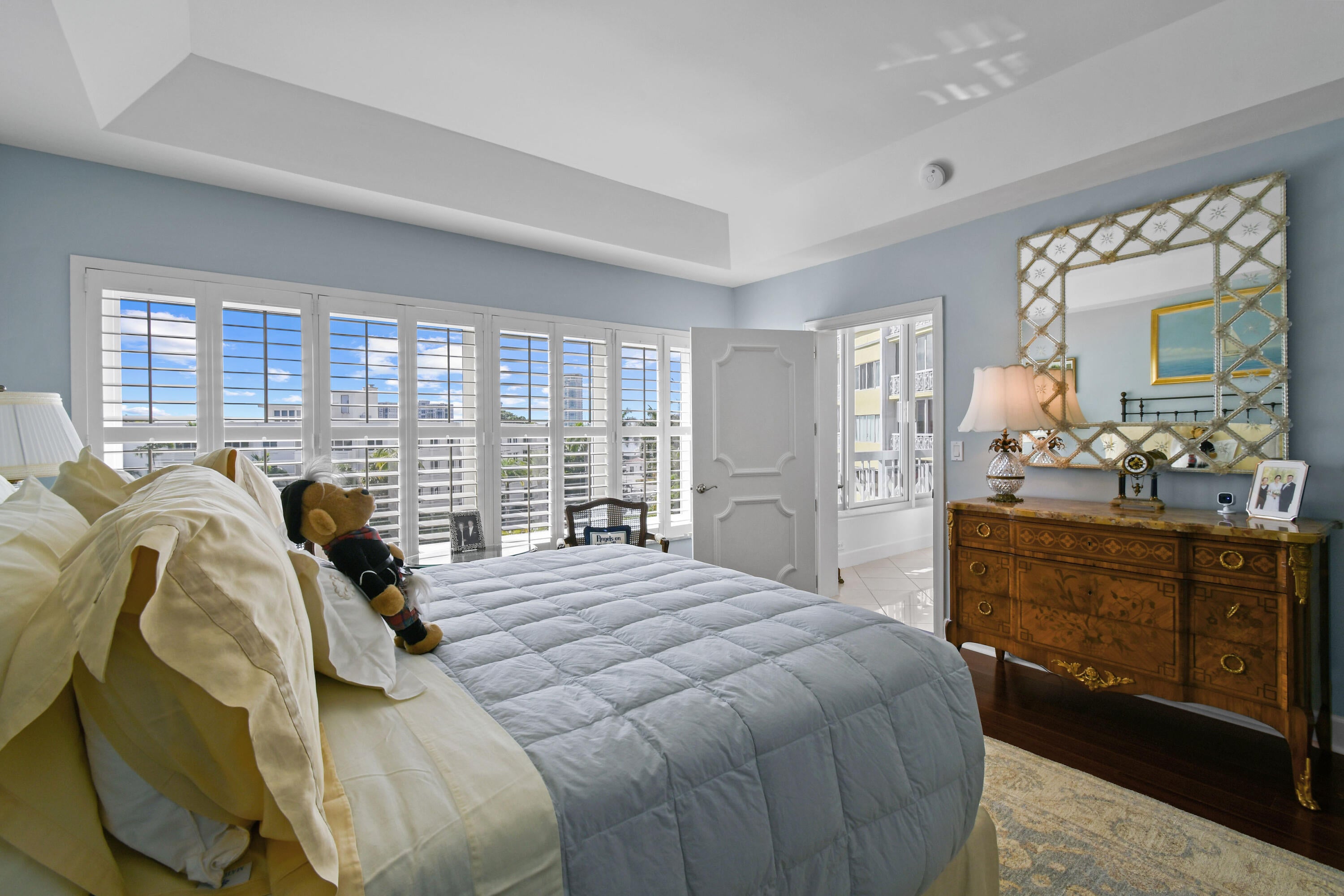 Corner fourth floor residence at 389 S Lake with water views! Pristine and renovated with high ceilings, gracious living spaces. Beautiful light filled condo with essentially 2 primary bedrooms. A full service, pet friendly building with full time manager, pool, 24 hour door person. This residence comes with the best covered parking space in the building.
