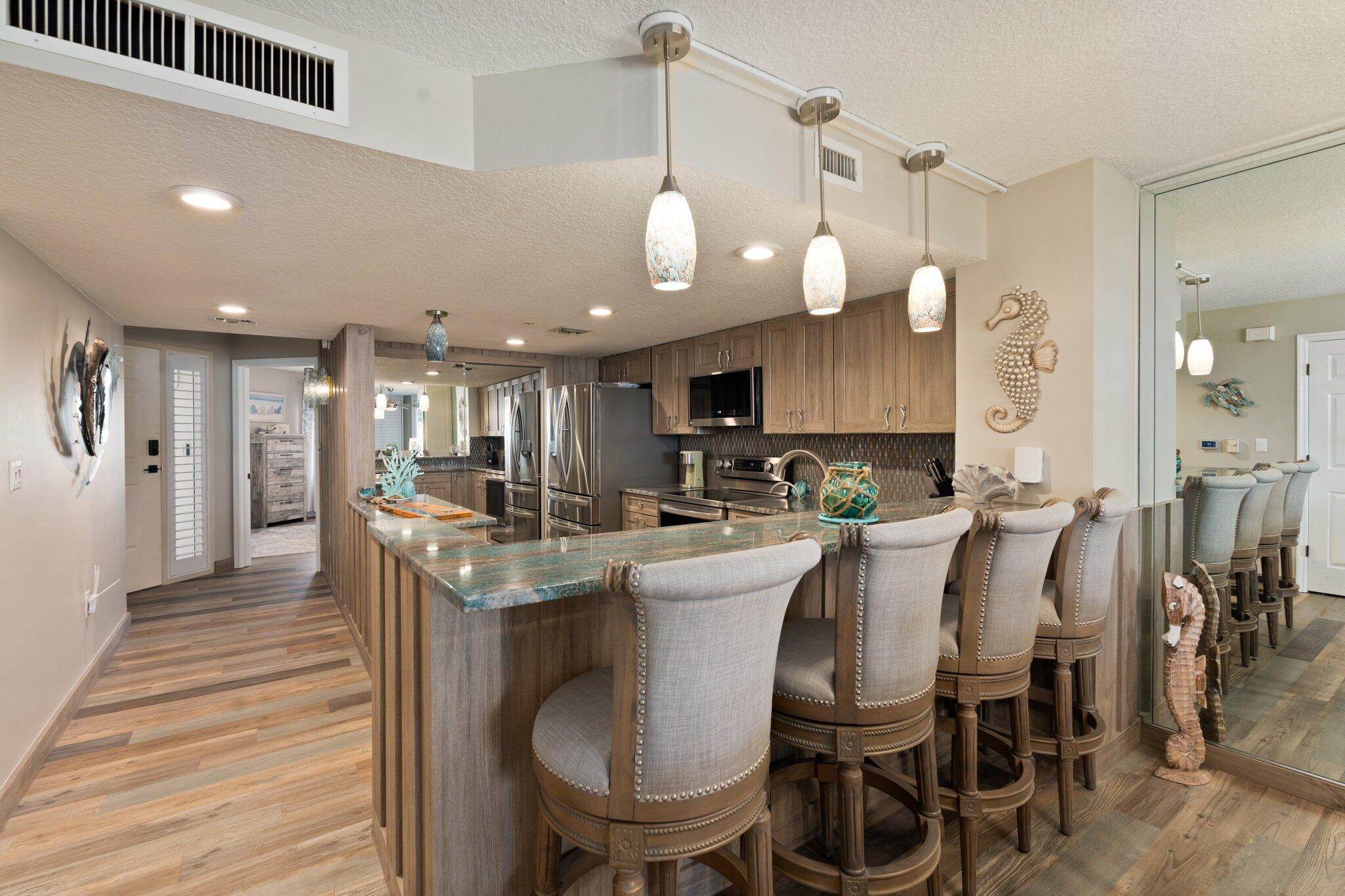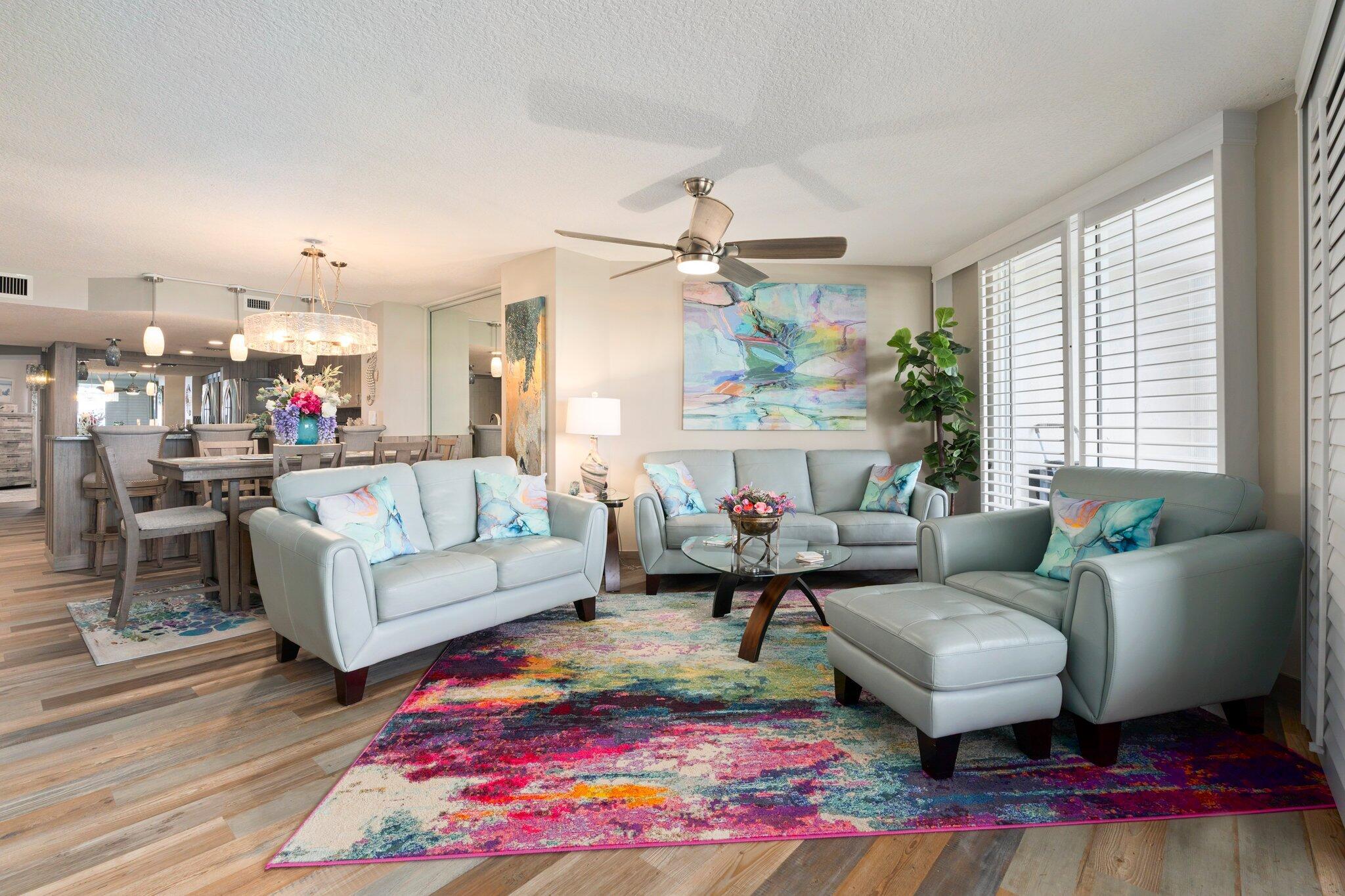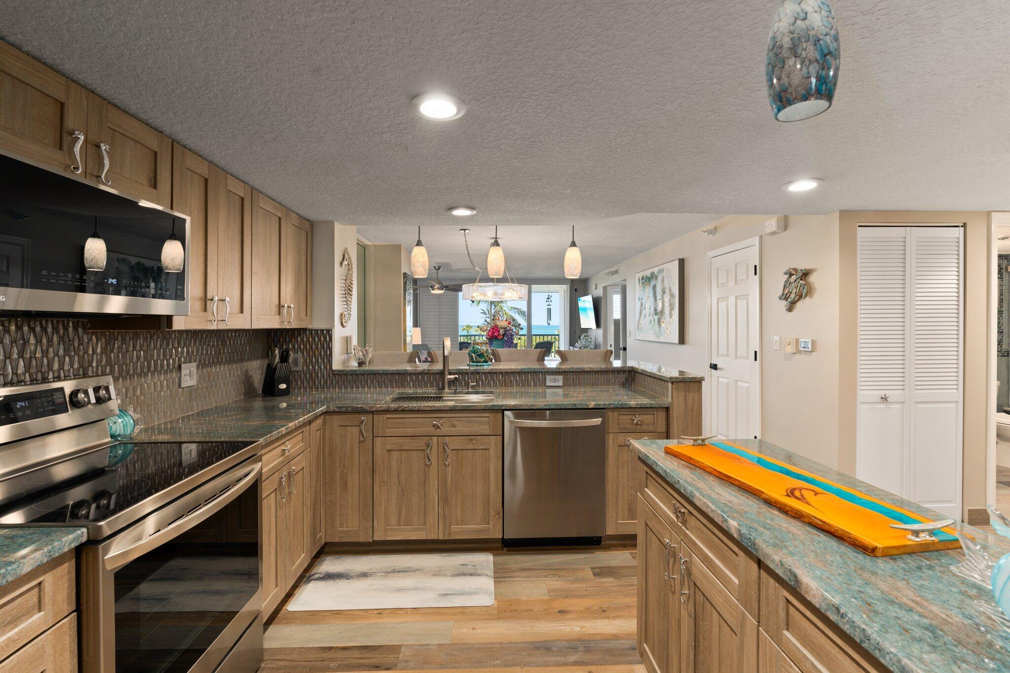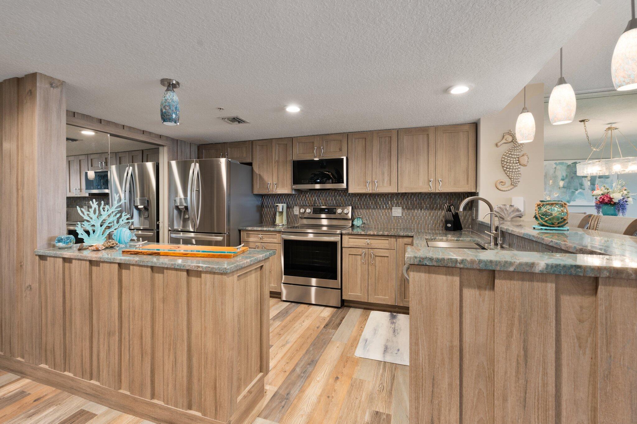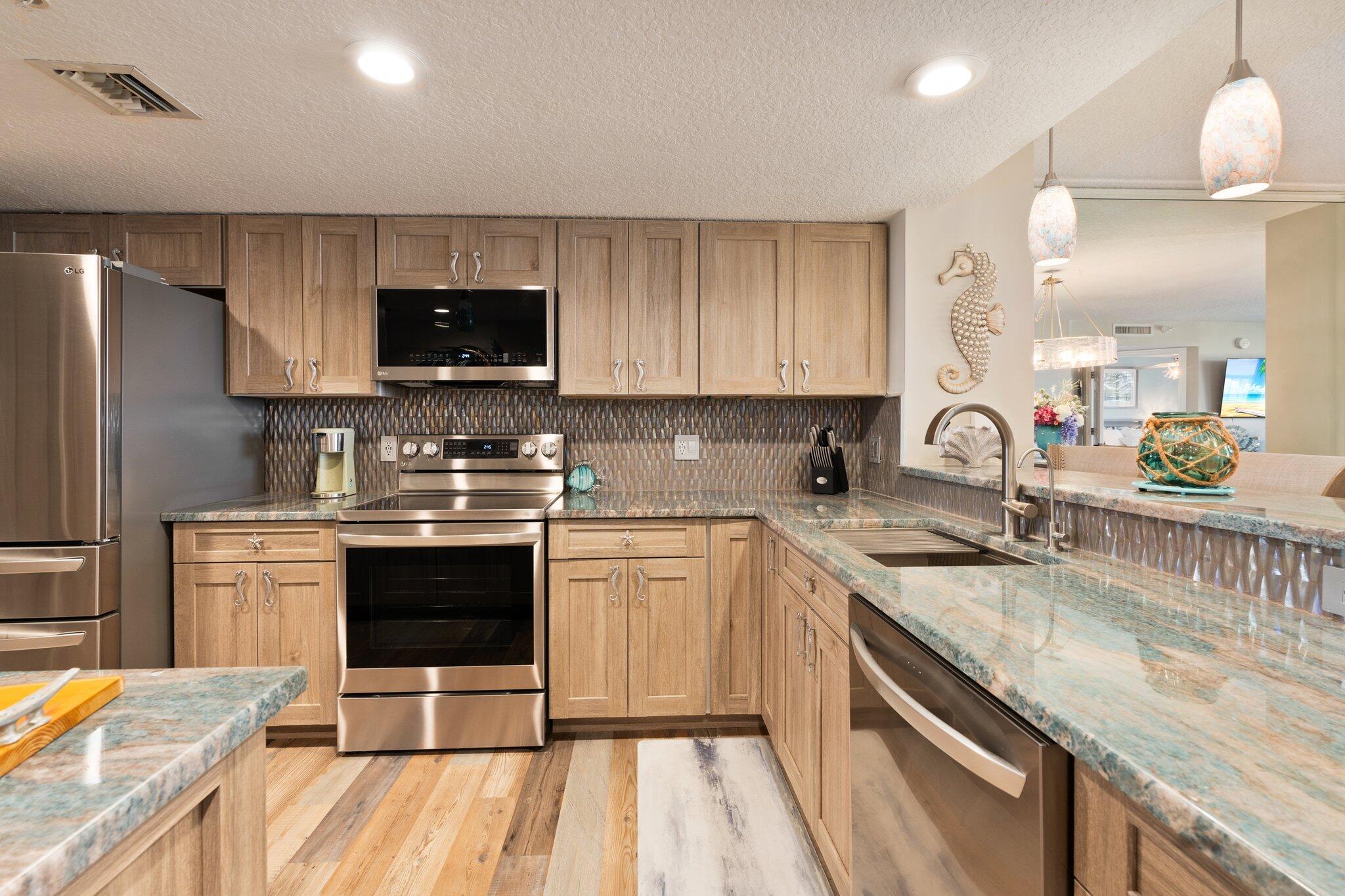 No surface has been left untouched, no detail left undone. Custom woodwork & a remarkable kitchen w/ Kraftmade cabinetry, stunning Brazilian quartzite w/ complimentary glass tile backsplash topped off w/ Seahorse pulls. The appliances are all new. Primary bathroom has breathtaking Aurora blue marble along w/ floor to ceiling porcelain tile adorned w/ marble trim. Floors have been replaced w/ a dry core luxury vinyl. Plantation shutters have been added throughout. Lighting & fans updated w/ high quality fixtures. The furnishings are the icing on the cake, so well appointed there is nothing for you to do but slip into this paradise. Covered carport incl. Seaward offers a clubhouse, resort pool, private beach access, tennis, pickle ball, shuffleboard, gym, sauna, billiards & kayak launch.